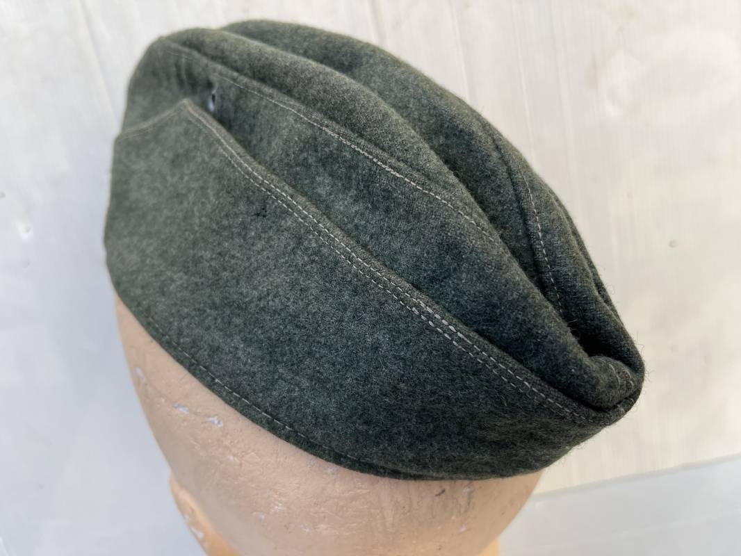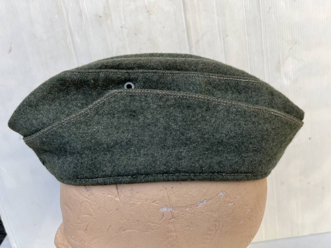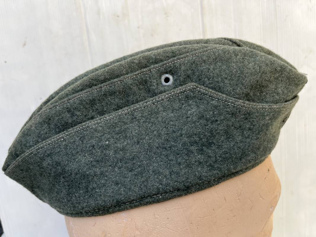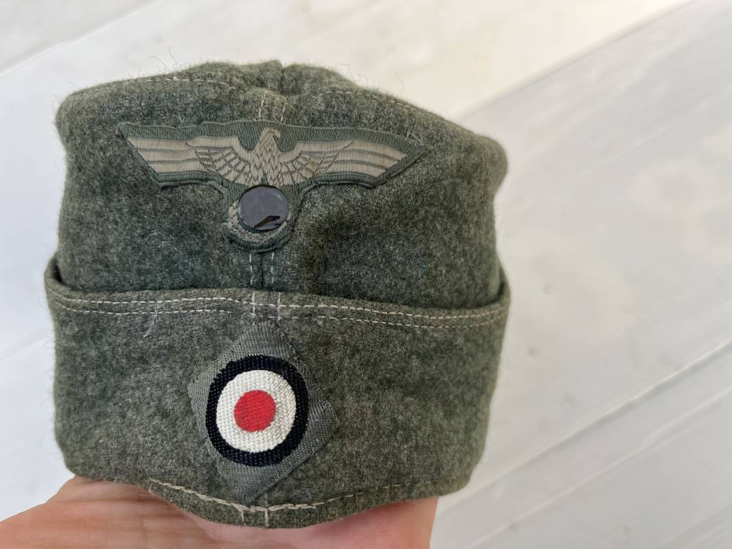 Trés beau calot troupe modéle 1934 de la Heer . Calot toute arme sans soutache de dotation en drap feldgrau . Ce calot est en superbe état et monté d'origine . Rabat en drap . Oeillets de ventilation en zinc . Insignes tissés bevo cousus sur le devant ; aigle et cocarde modéle 1940 .Intérieur entièrement doublé en coton gris . Marquage fabricant daté 1941 . Taille 56 . Calot trés légérement porté en superbe état . 1940/42 REF 21606