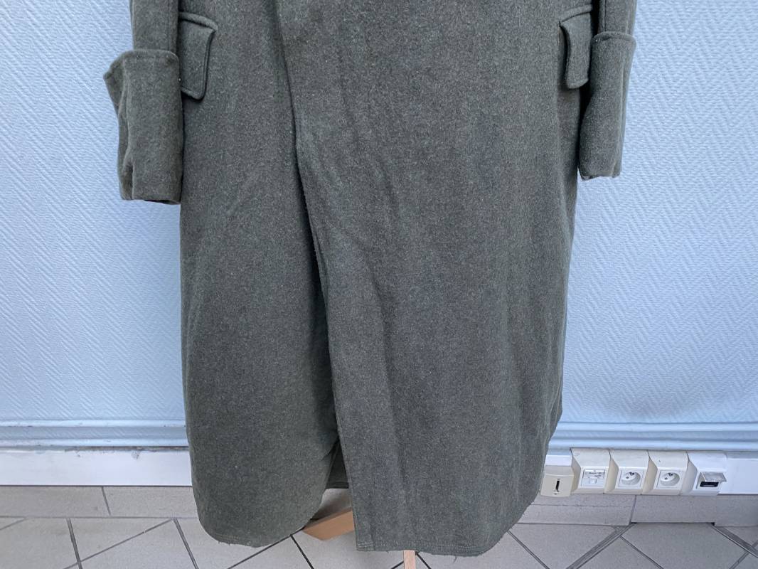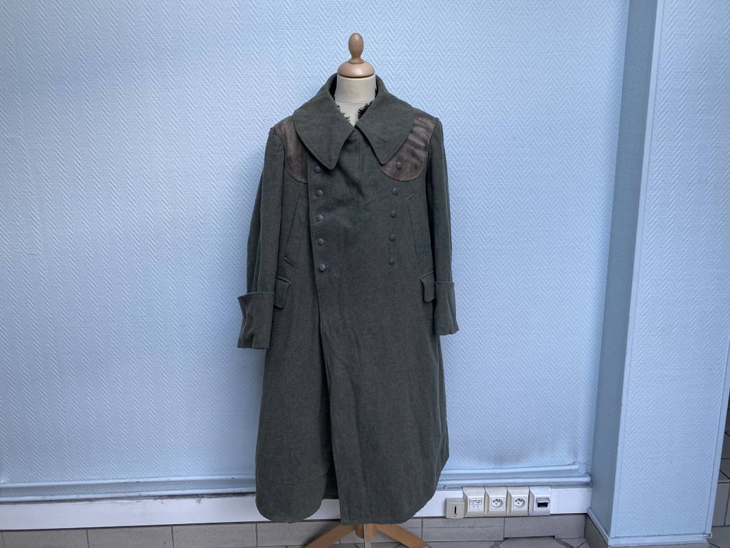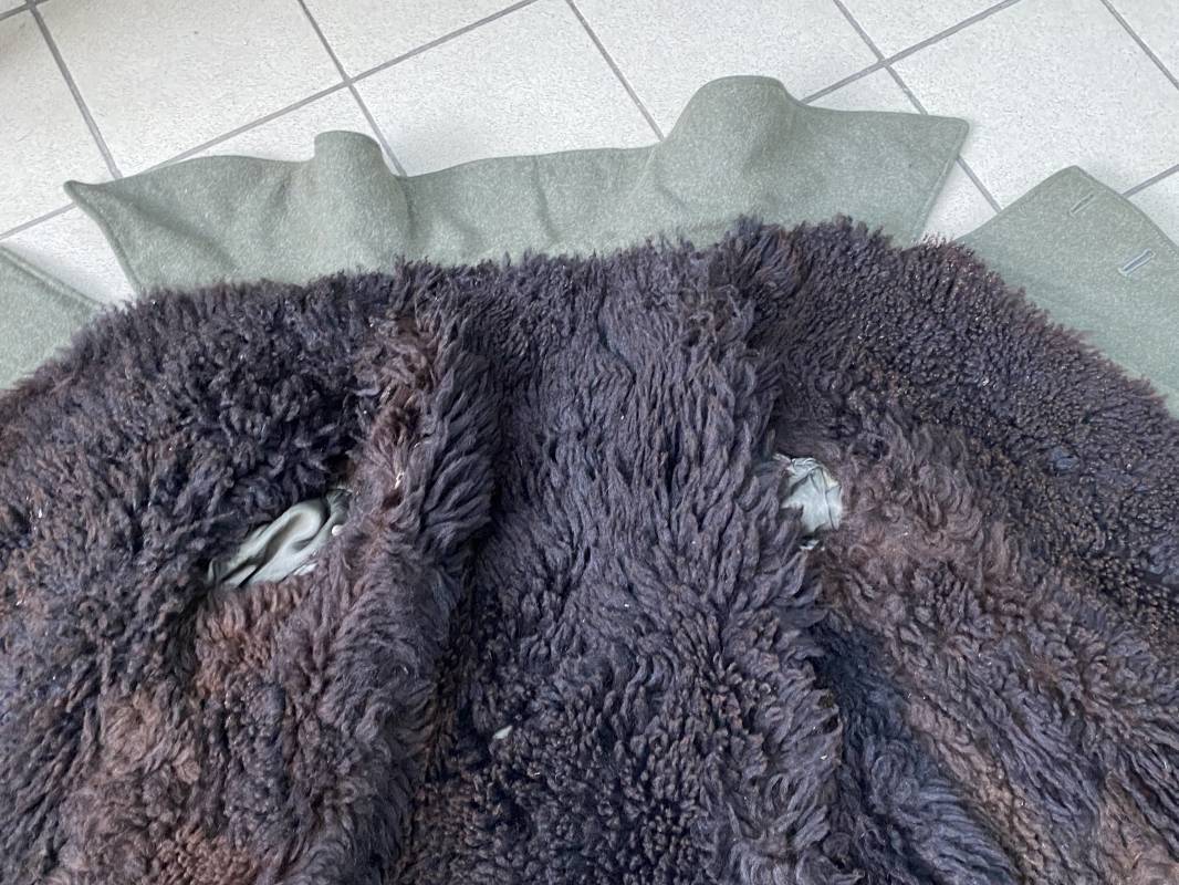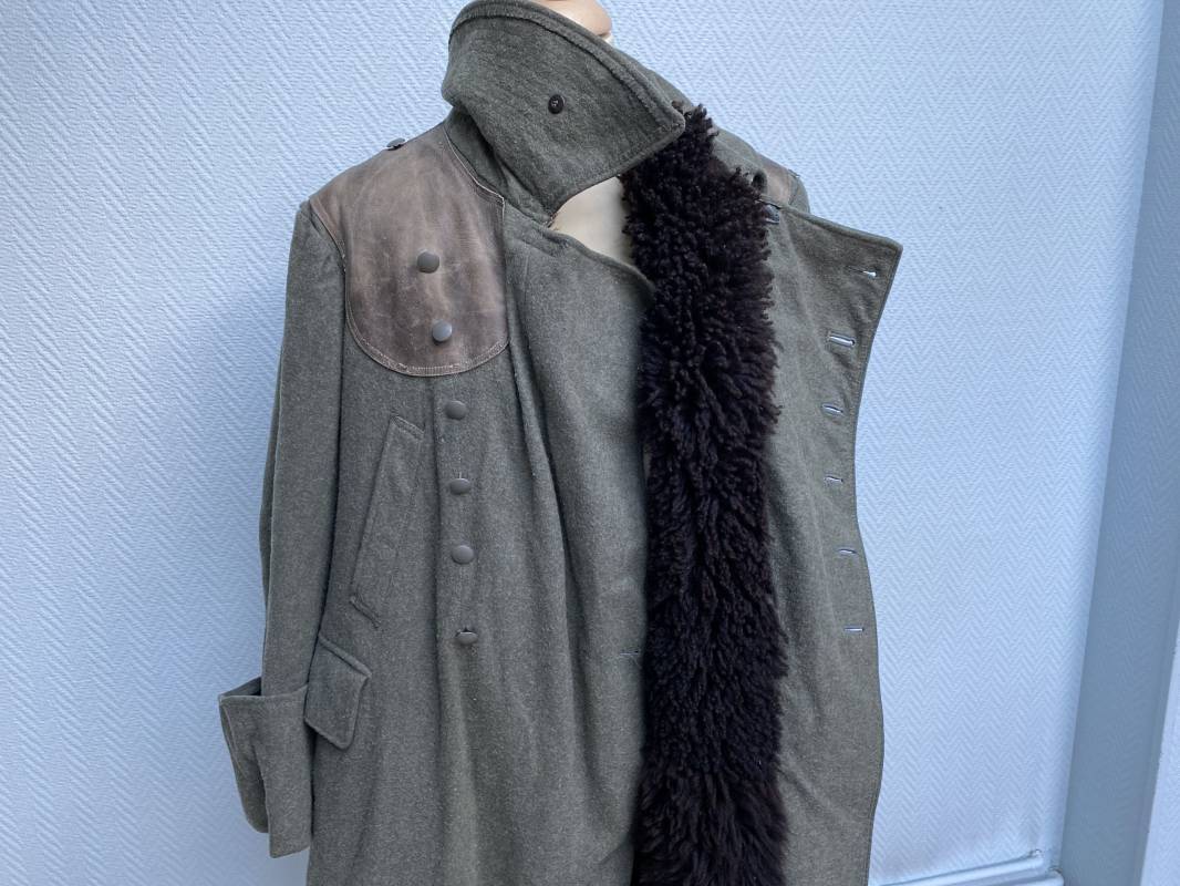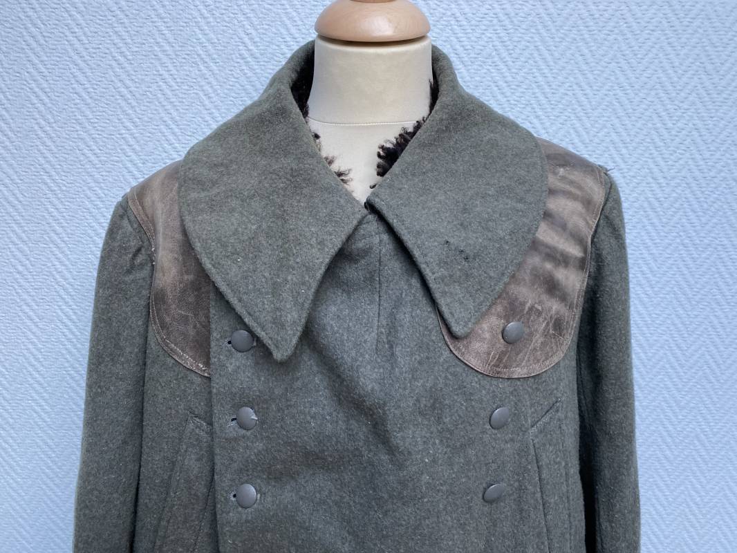 Très belle capote troupe de dotation modèle 1943 de la Heer fourrée en mouton noir. Capote toute arme. Large col en drap feldgrau. Double boutonnages sur le devant. Boutons en fer grenelé cousus d'origine. Deux poches de poitrine grand froid en biais. Deux poches basses à rabats. Bouts des manches à rabats. Passants drap et boutons pour le port des pattes d'épaules. Martingale en drap. Renforts d'épaules et passants latéraux de ceinturon en cuir gris glacé . Intèrieur entièrement doublé en épaisse fourrure de mouton noir. Capote légèrement portée en parfait état. Largeur d'épaules 50cm. Longueur 120cm. Manches 65cm. Belle capote typique Hivers 1943/44. Ref 18260