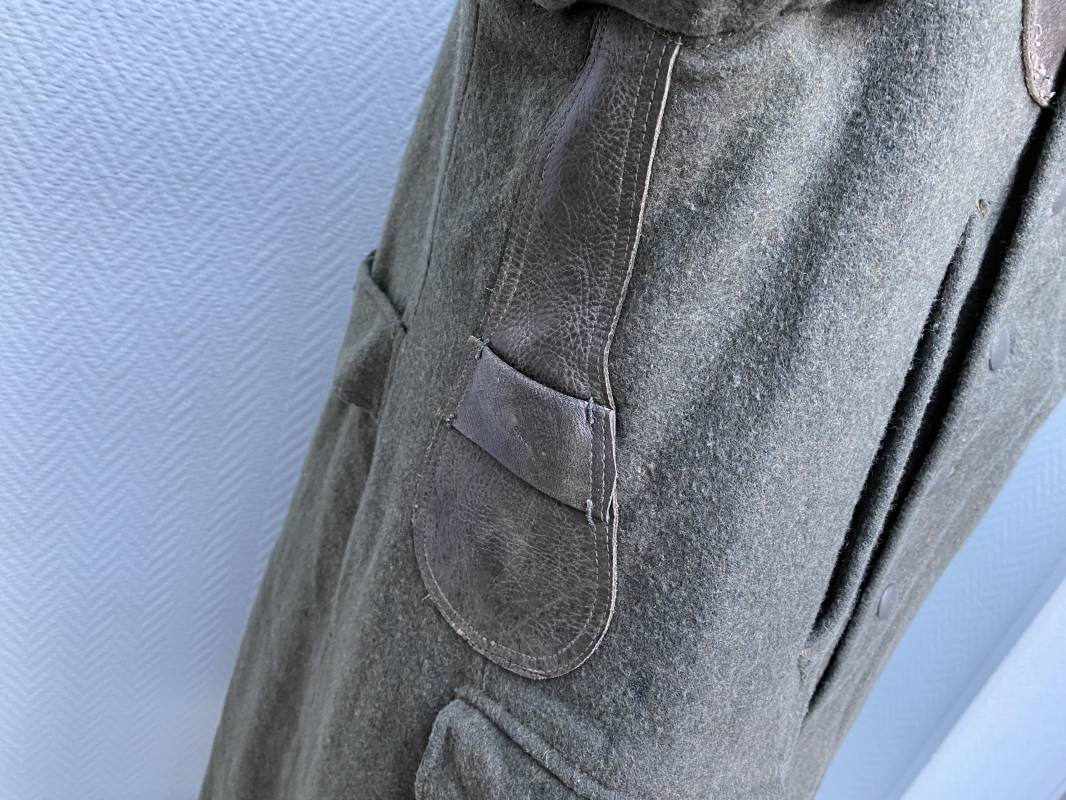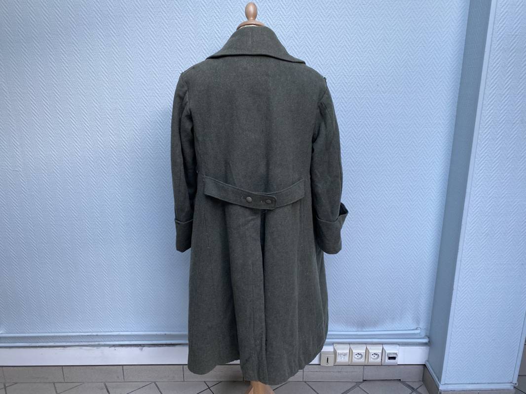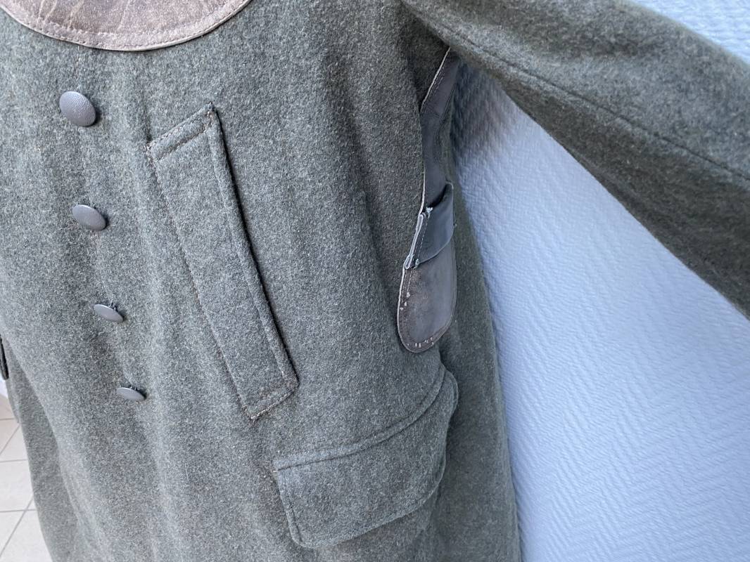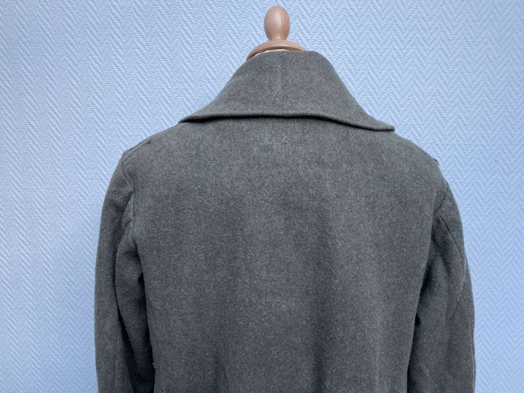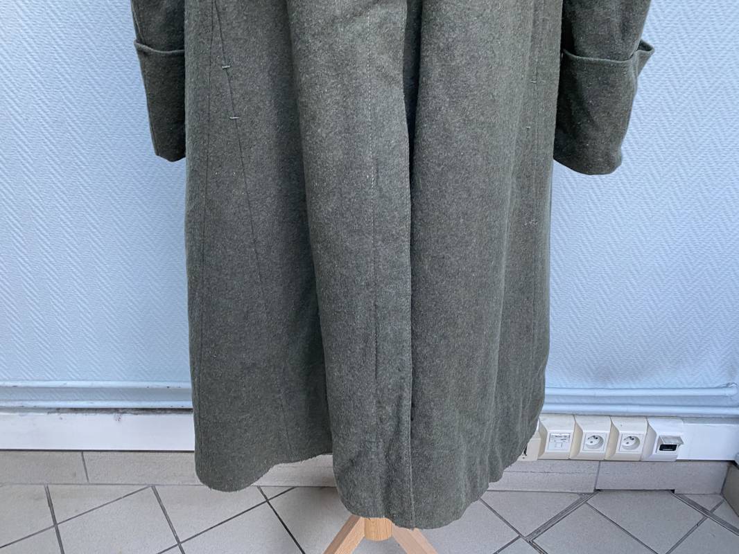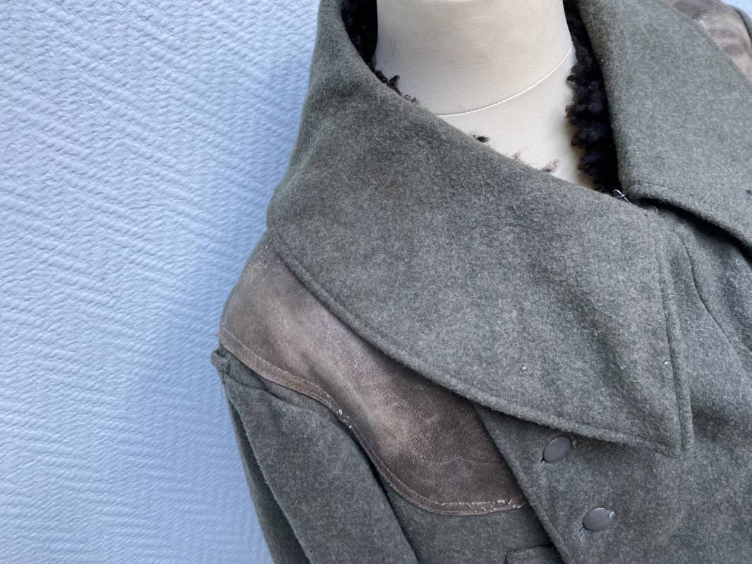 Très belle capote troupe de dotation modèle 1943 de la Heer fourrée en mouton noir. Capote toute arme. Large col en drap feldgrau. Double boutonnages sur le devant. Boutons en fer grenelé cousus d'origine. Deux poches de poitrine grand froid en biais. Deux poches basses à rabats. Bouts des manches à rabats. Passants drap et boutons pour le port des pattes d'épaules. Martingale en drap. Renforts d'épaules et passants latéraux de ceinturon en cuir gris glacé . Intèrieur entièrement doublé en épaisse fourrure de mouton noir. Capote légèrement portée en parfait état. Largeur d'épaules 50cm. Longueur 120cm. Manches 65cm. Belle capote typique Hivers 1943/44. Ref 18260