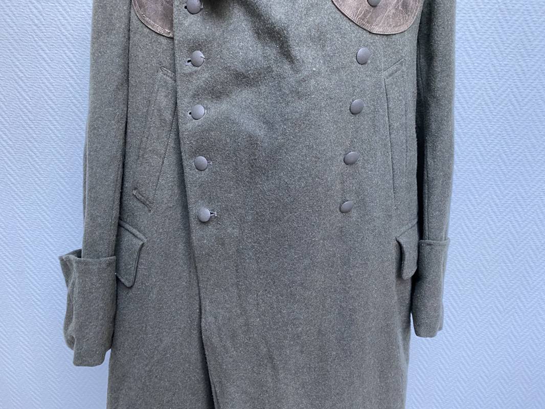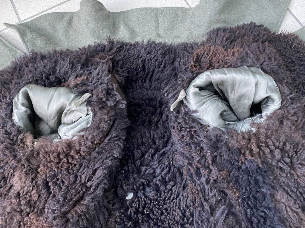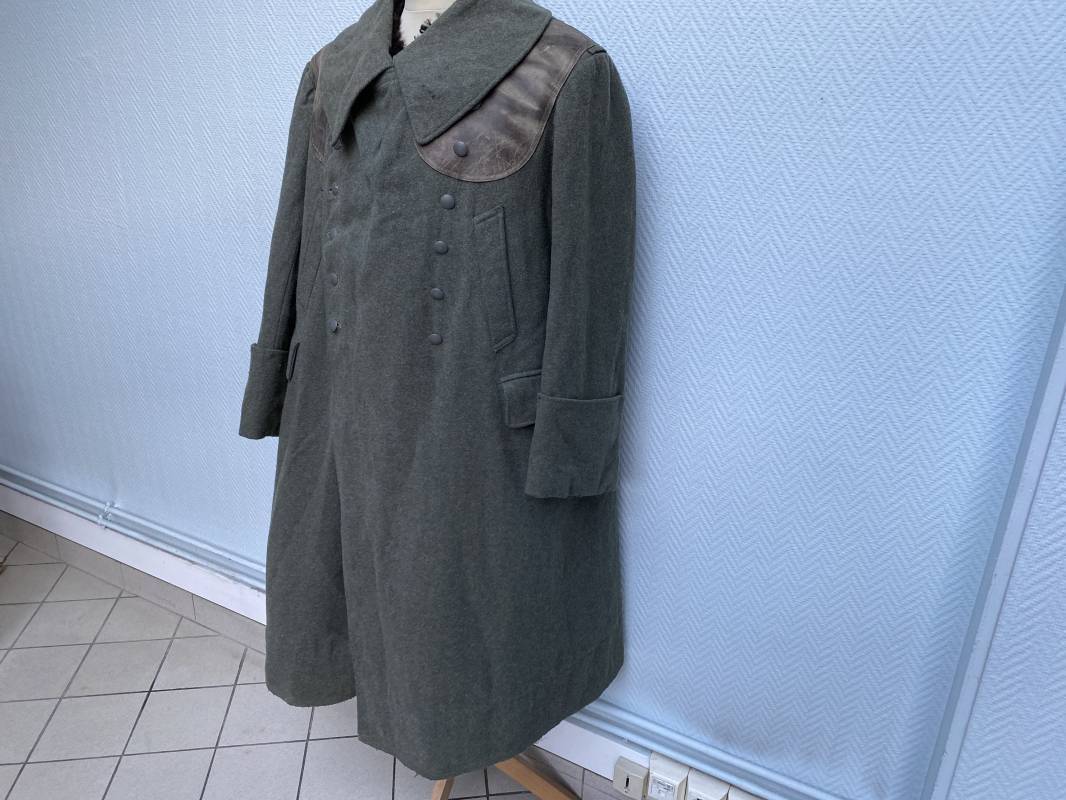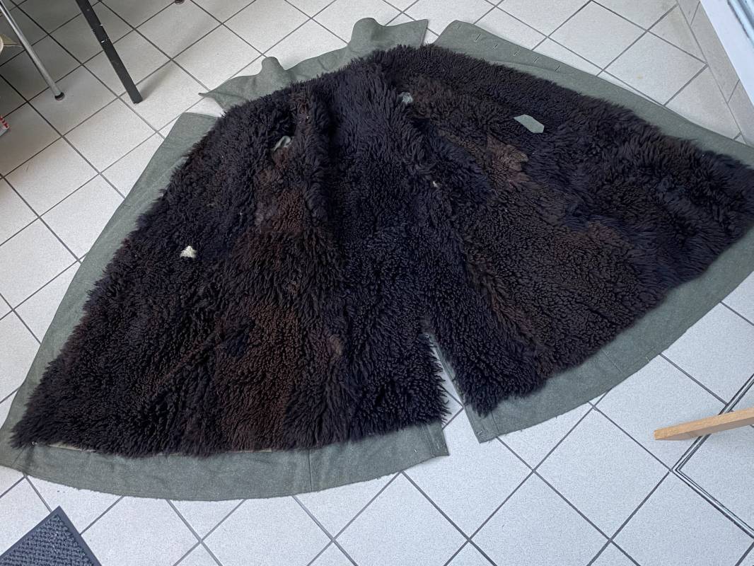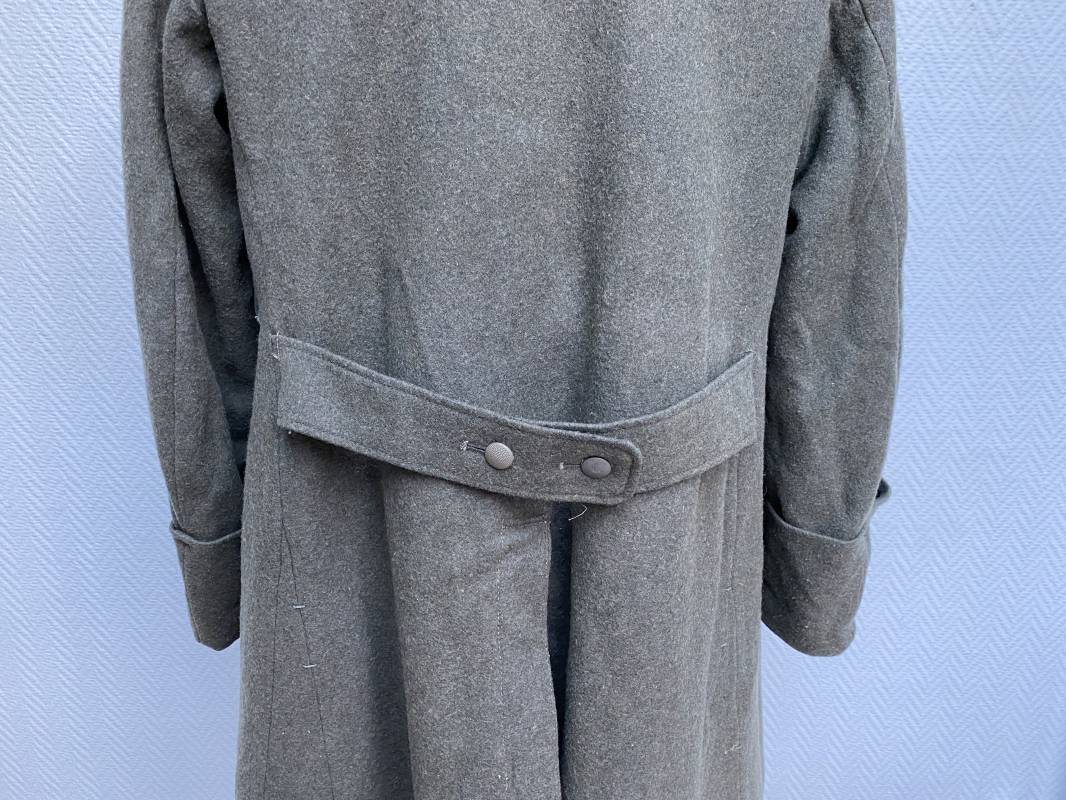 Très belle capote troupe de dotation modèle 1943 de la Heer fourrée en mouton noir. Capote toute arme. Large col en drap feldgrau. Double boutonnages sur le devant. Boutons en fer grenelé cousus d'origine. Deux poches de poitrine grand froid en biais. Deux poches basses à rabats. Bouts des manches à rabats. Passants drap et boutons pour le port des pattes d'épaules. Martingale en drap. Renforts d'épaules et passants latéraux de ceinturon en cuir gris glacé . Intèrieur entièrement doublé en épaisse fourrure de mouton noir. Capote légèrement portée en parfait état. Largeur d'épaules 50cm. Longueur 120cm. Manches 65cm. Belle capote typique Hivers 1943/44. Ref 18260