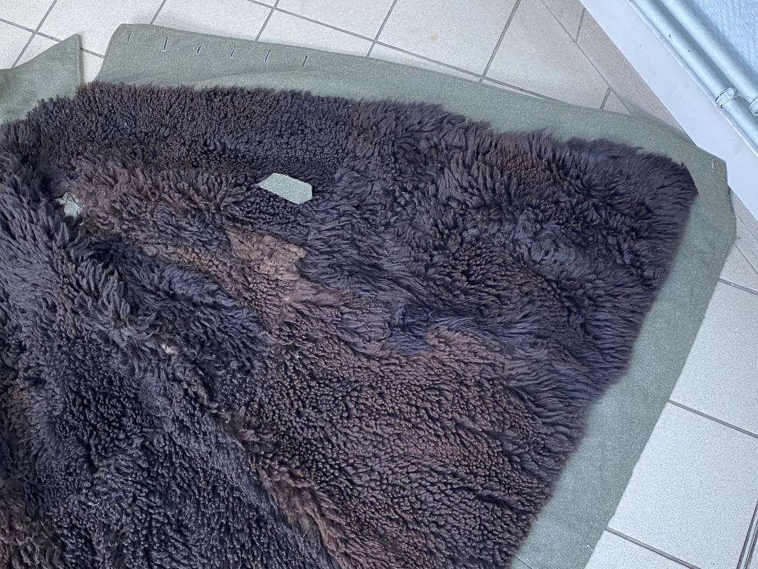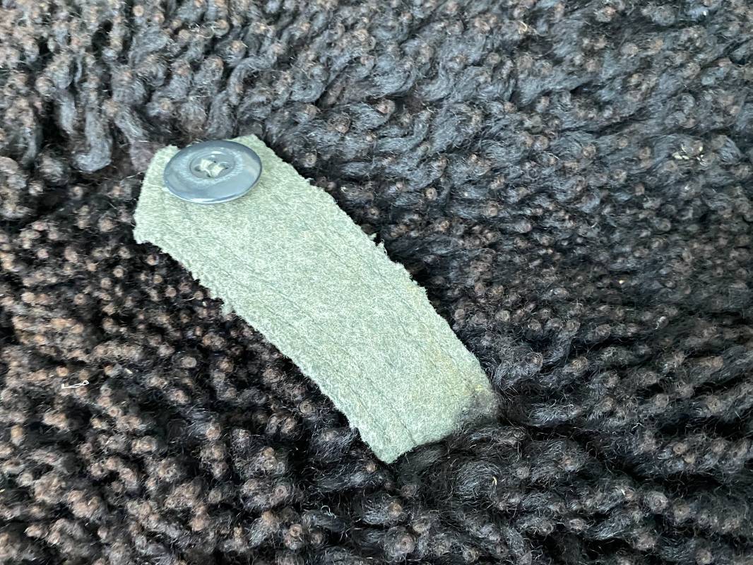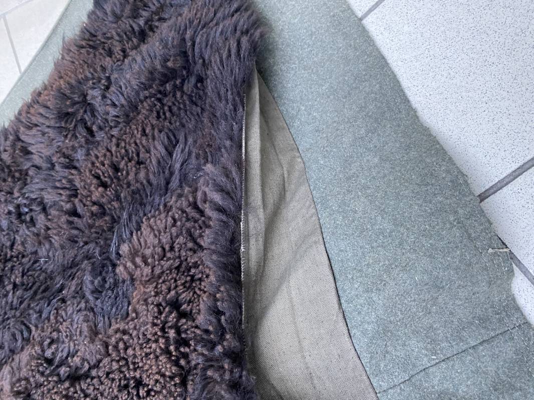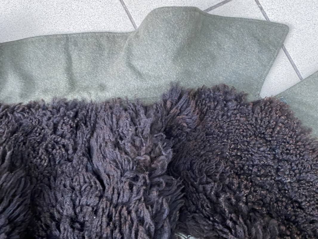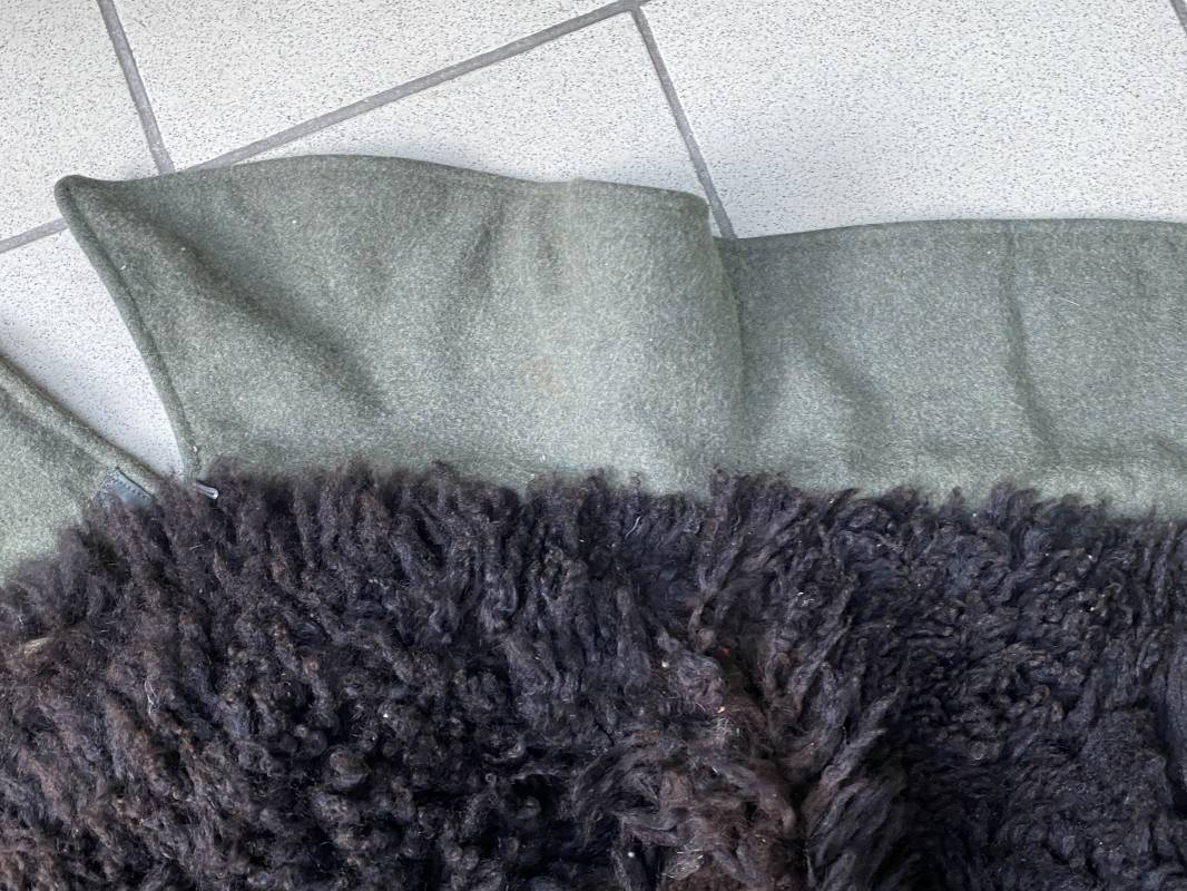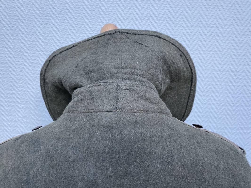 Très belle capote troupe de dotation modèle 1943 de la Heer fourrée en mouton noir. Capote toute arme. Large col en drap feldgrau. Double boutonnages sur le devant. Boutons en fer grenelé cousus d'origine. Deux poches de poitrine grand froid en biais. Deux poches basses à rabats. Bouts des manches à rabats. Passants drap et boutons pour le port des pattes d'épaules. Martingale en drap. Renforts d'épaules et passants latéraux de ceinturon en cuir gris glacé . Intèrieur entièrement doublé en épaisse fourrure de mouton noir. Capote légèrement portée en parfait état. Largeur d'épaules 50cm. Longueur 120cm. Manches 65cm. Belle capote typique Hivers 1943/44. Ref 18260