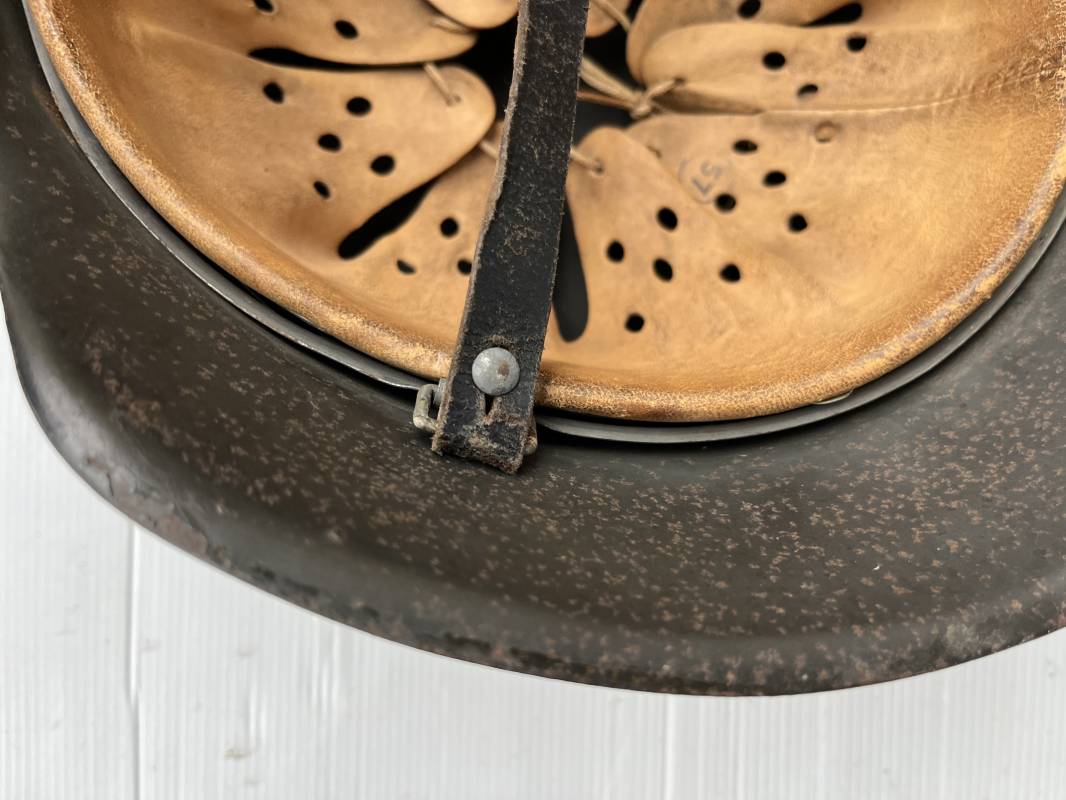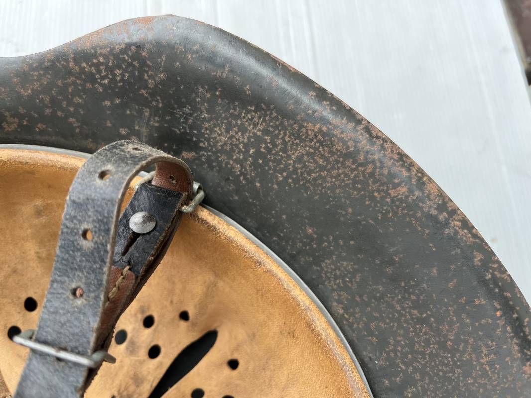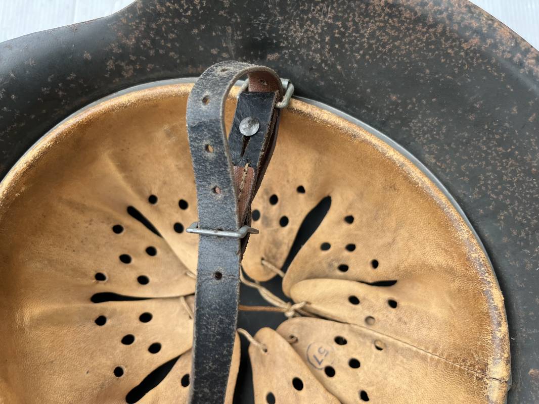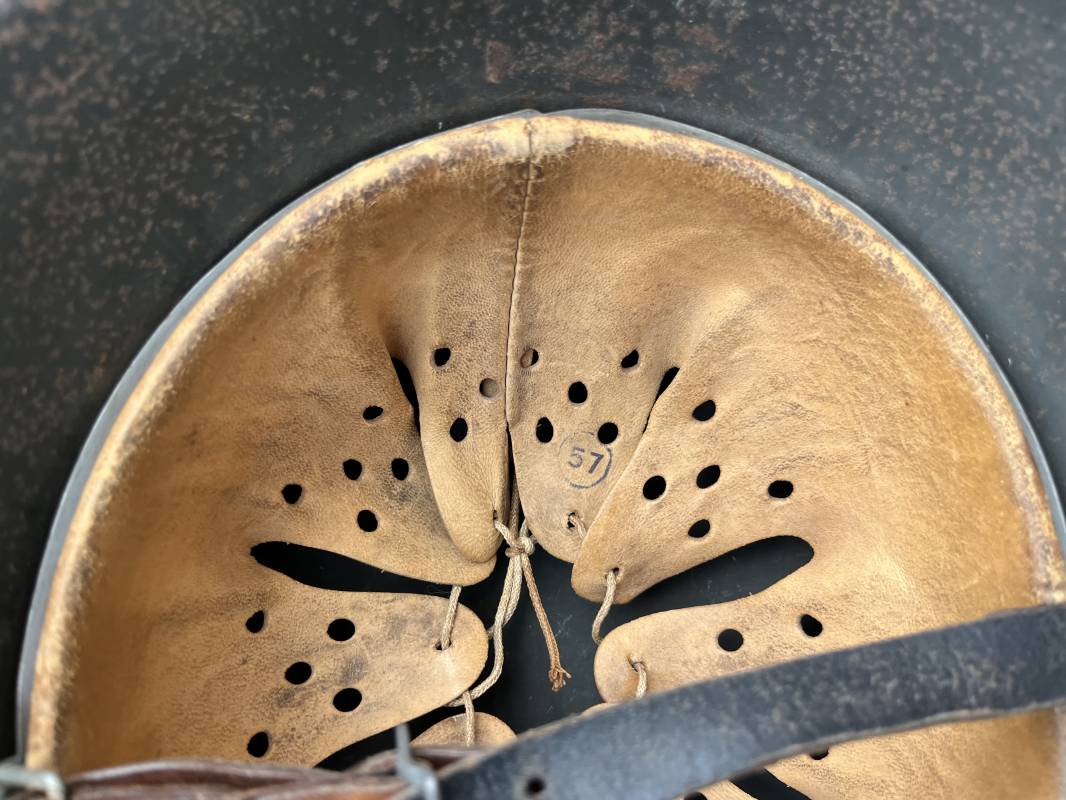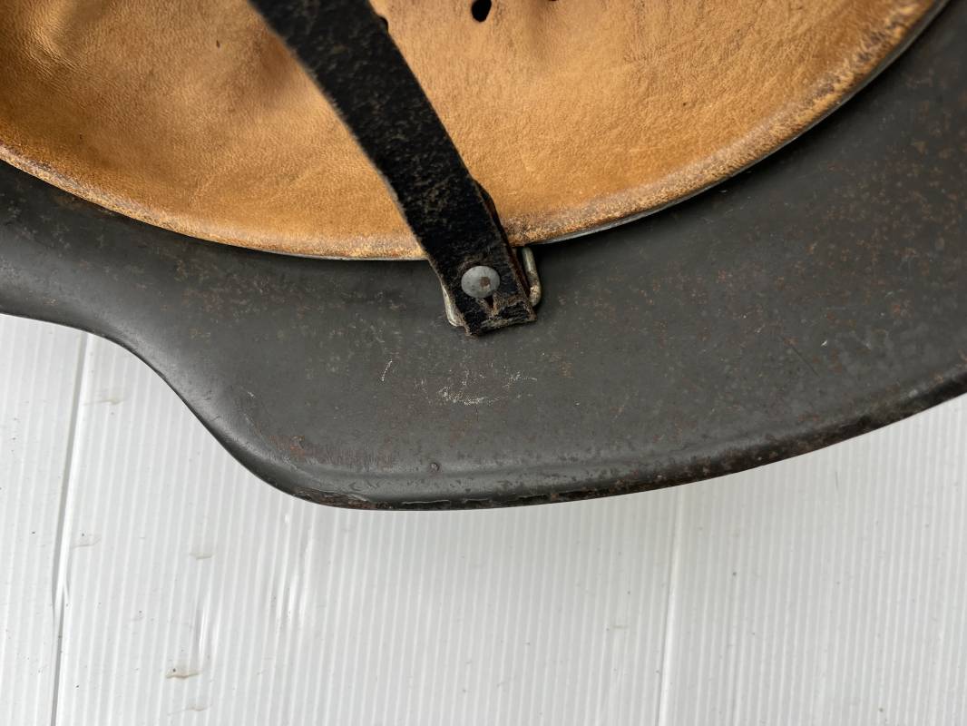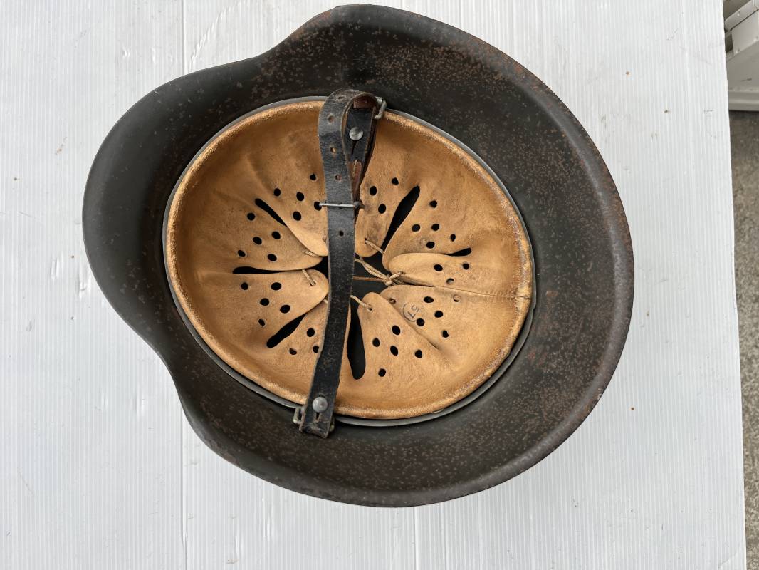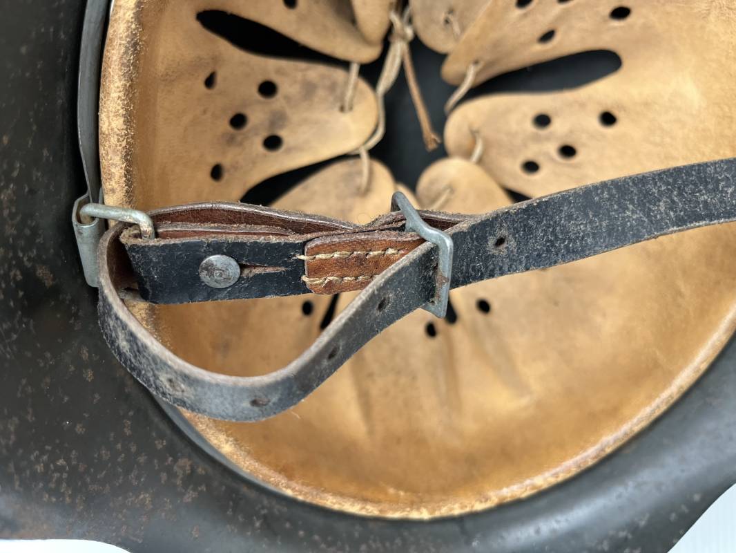 Trés beau casque modéle 1942 de la Heer . Casque avec insigne a 95 % . Belle peinture grise d'usinage . Marquage fabricant NS64 Nuquière L 290 . Trés belle peinture non frottée . Casque non nettoyé ni démonté . Coiffe intérieure en cuir fauve non ciré . Cuir souple . Lacet en coton d'origine . Taille 57 . Cerclage en zinc . Rivets fixés d'origine . Jugulaire en cuir noir retourné , boucle fer . Marquage code fabricant Rbnr Treize trous . Trés beau casque trouvé a Pont l évèque ( 14 ) il y a 40 ans . Piéce définitive dans une collection . 1943/44 Ref 21593
