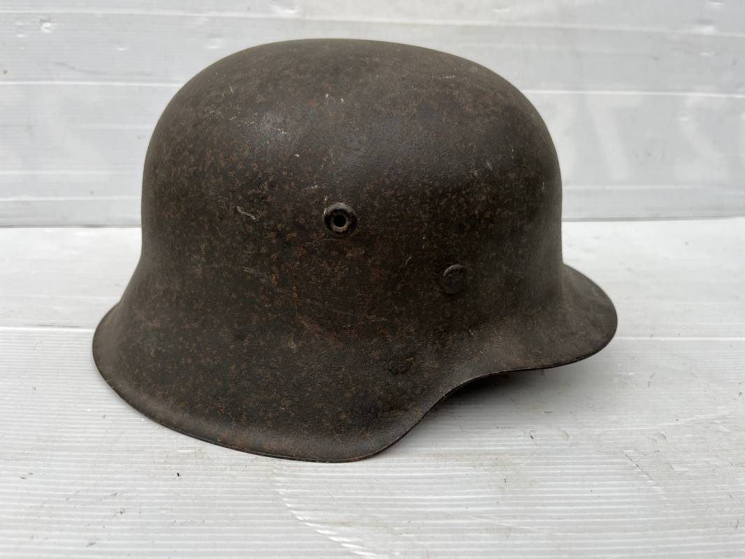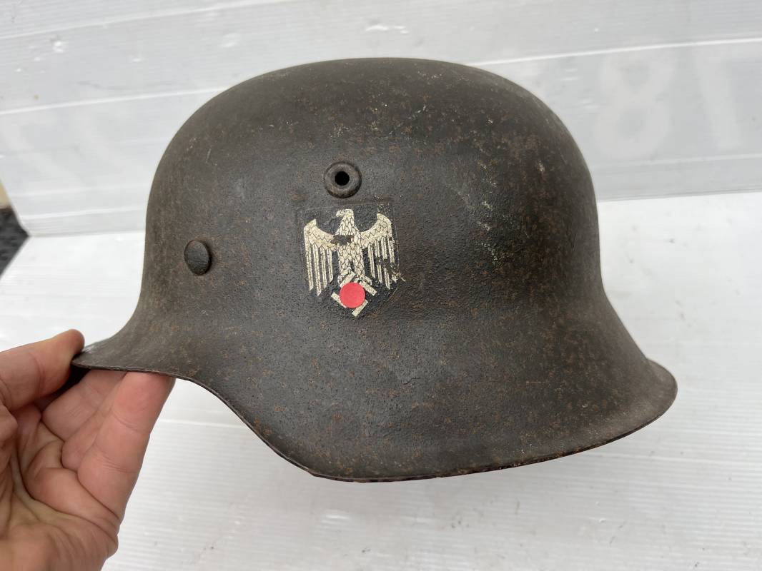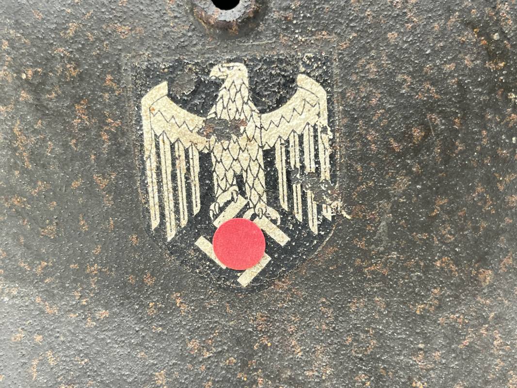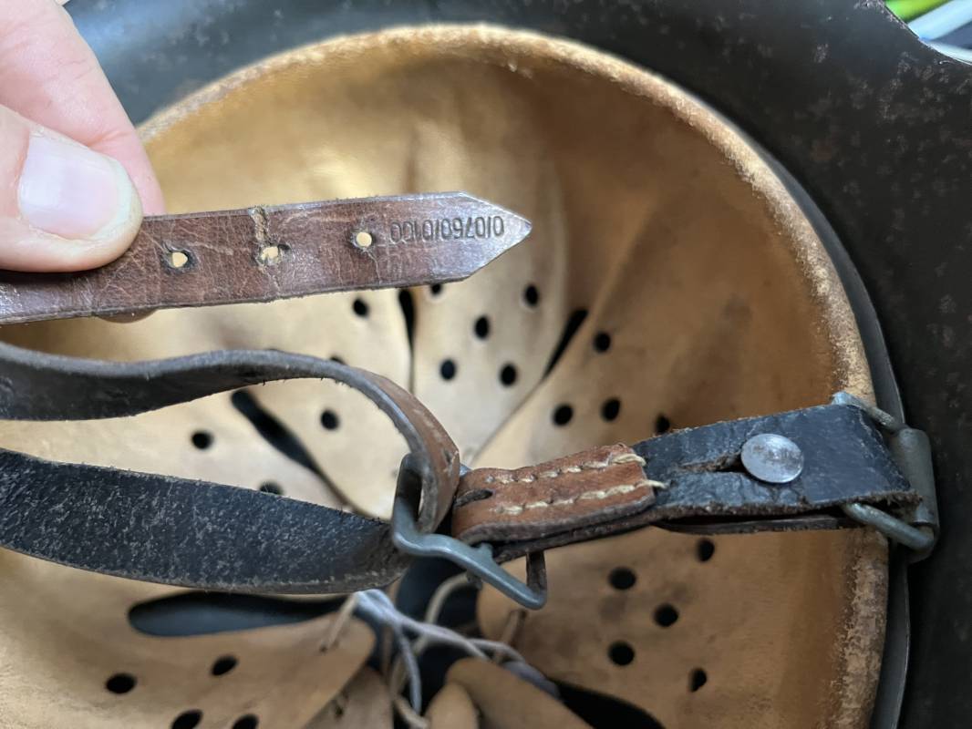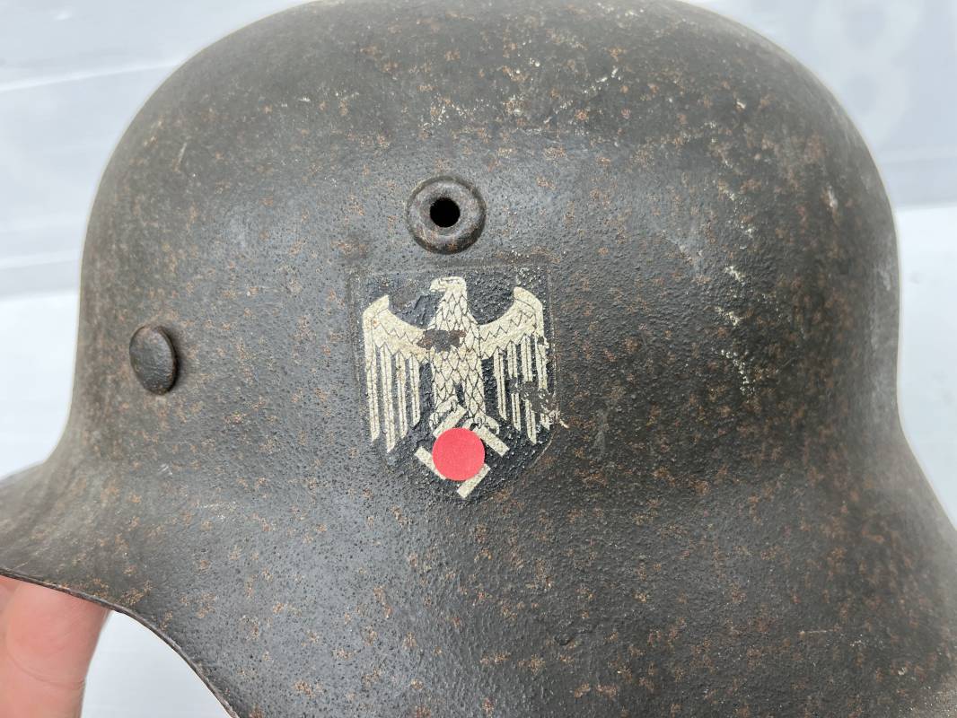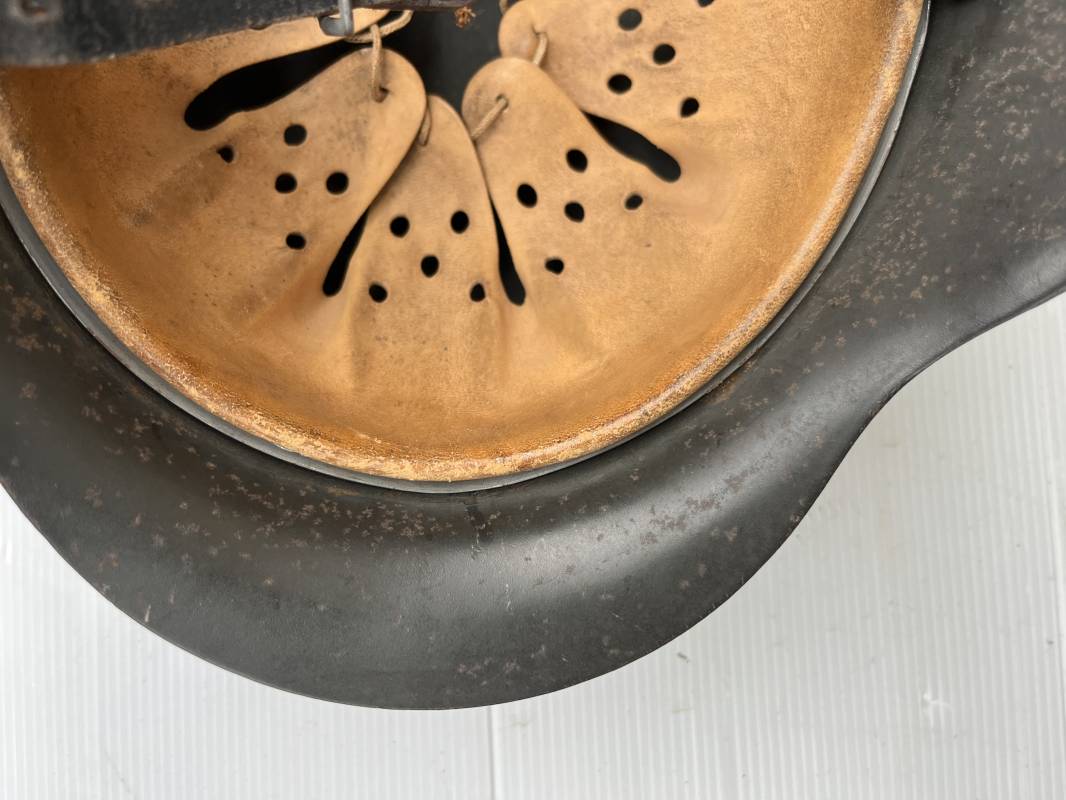 Trés beau casque modéle 1942 de la Heer . Casque avec insigne a 95 % . Belle peinture grise d'usinage . Marquage fabricant NS64 Nuquière L 290 . Trés belle peinture non frottée . Casque non nettoyé ni démonté . Coiffe intérieure en cuir fauve non ciré . Cuir souple . Lacet en coton d'origine . Taille 57 . Cerclage en zinc . Rivets fixés d'origine . Jugulaire en cuir noir retourné , boucle fer . Marquage code fabricant Rbnr Treize trous . Trés beau casque trouvé a Pont l évèque ( 14 ) il y a 40 ans . Piéce définitive dans une collection . 1943/44 Ref 21593
