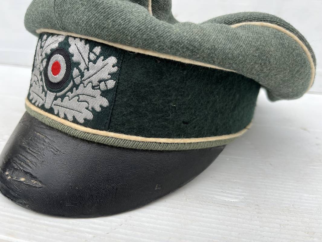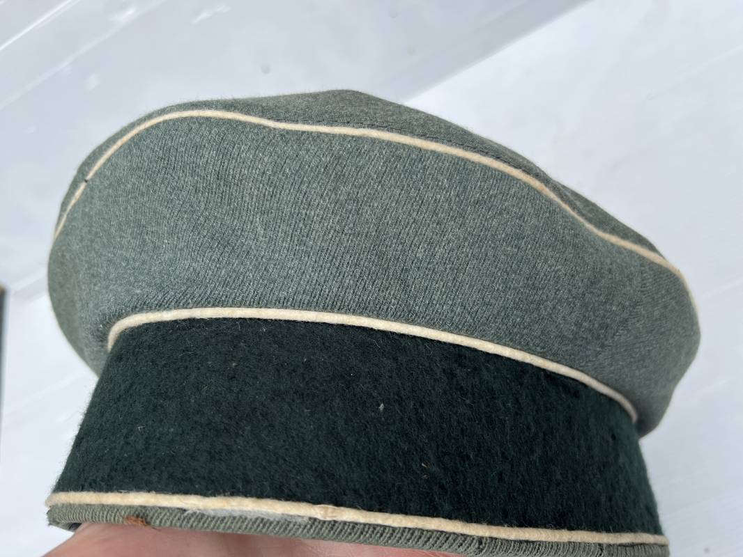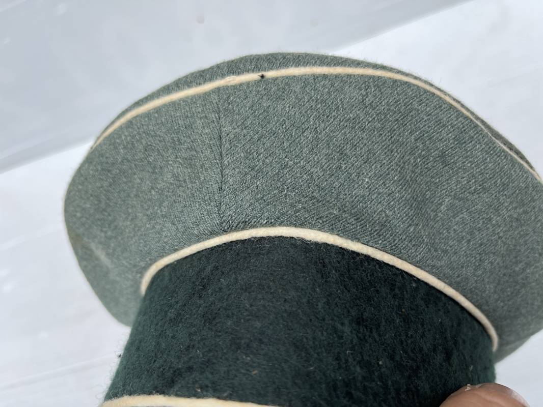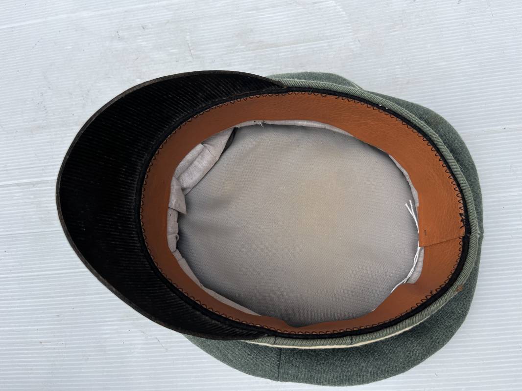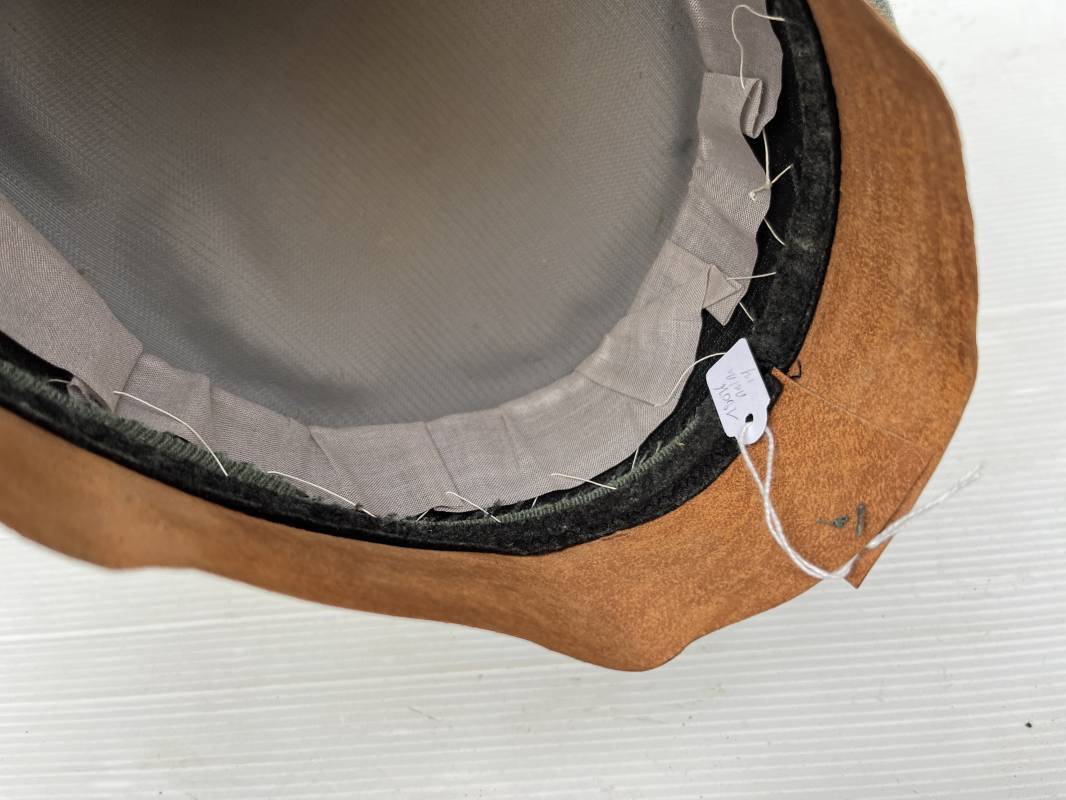 Rare casquette d'un officier de l'infanterie en tenue de campagne . Casquette du modèle 'Alter Art' . Casquette en tricotine fine feldgrau , liseré blanc de l'infanterie . Bandeau de coiffe extérieur souple en drap vert foncé . Belle forme cassée . Insignes montés d'origine a la machine du modéle tissés bevo pour officier . Aigle et cocarde tissés en fil d'aluminium . Cocarde montée machine , aigle monté machine zig zag . Visière souple en cuir noir . Casquette doublée en satinette grise , Bandeau de coiffe intérieur en cuir marron clair et petit velours noir sur le pourtour typique de chez 'Pekuro s ' Taille 57 . Casquette légèrement portée en parfait état . Trés belle coiffure de combat d'un officier de l'infanterie . Trés belle coiffure , définitive en collection . 1939/45 Ref 18076