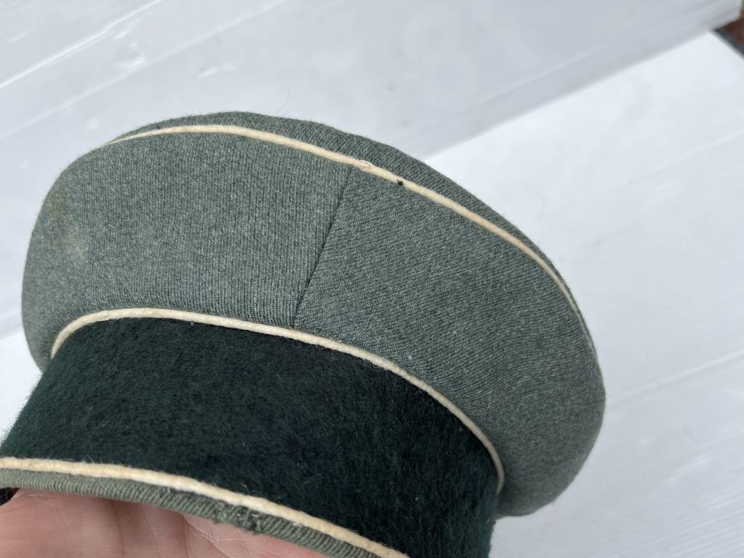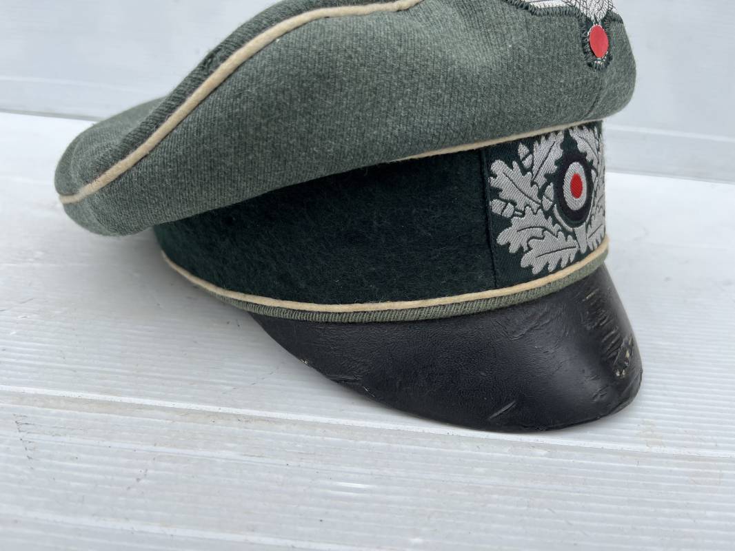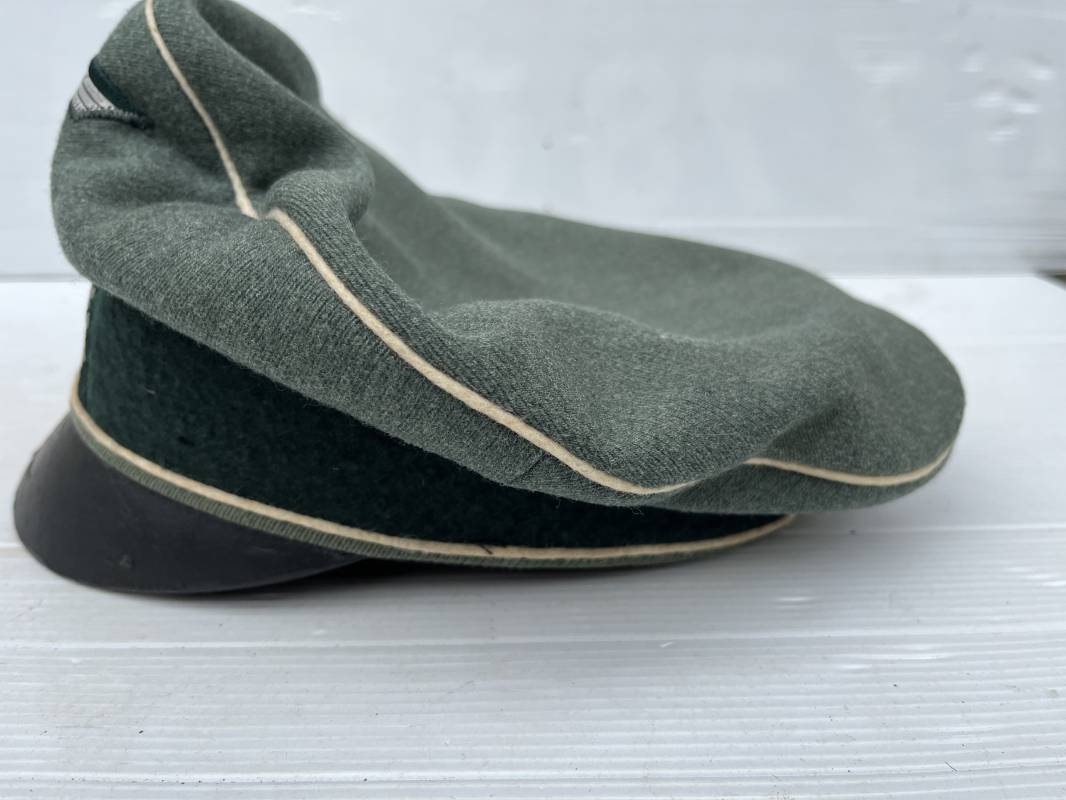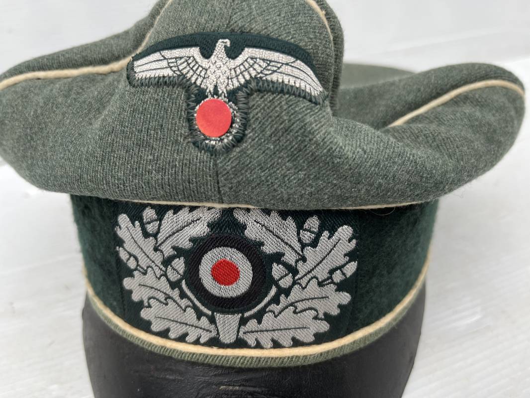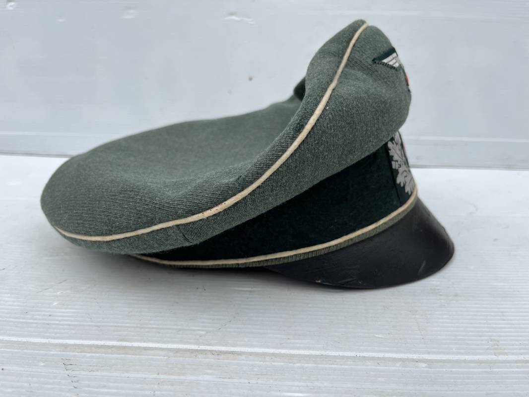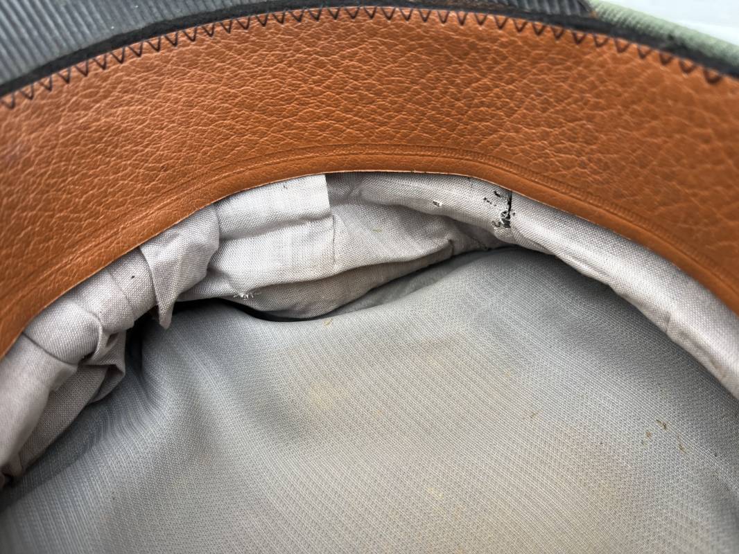 Rare casquette d'un officier de l'infanterie en tenue de campagne . Casquette du modèle 'Alter Art' . Casquette en tricotine fine feldgrau , liseré blanc de l'infanterie . Bandeau de coiffe extérieur souple en drap vert foncé . Belle forme cassée . Insignes montés d'origine a la machine du modéle tissés bevo pour officier . Aigle et cocarde tissés en fil d'aluminium . Cocarde montée machine , aigle monté machine zig zag . Visière souple en cuir noir . Casquette doublée en satinette grise , Bandeau de coiffe intérieur en cuir marron clair et petit velours noir sur le pourtour typique de chez 'Pekuro s ' Taille 57 . Casquette légèrement portée en parfait état . Trés belle coiffure de combat d'un officier de l'infanterie . Trés belle coiffure , définitive en collection . 1939/45 Ref 18076