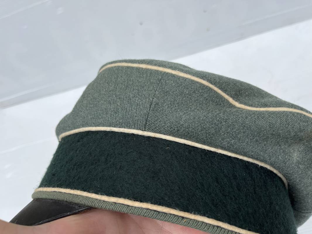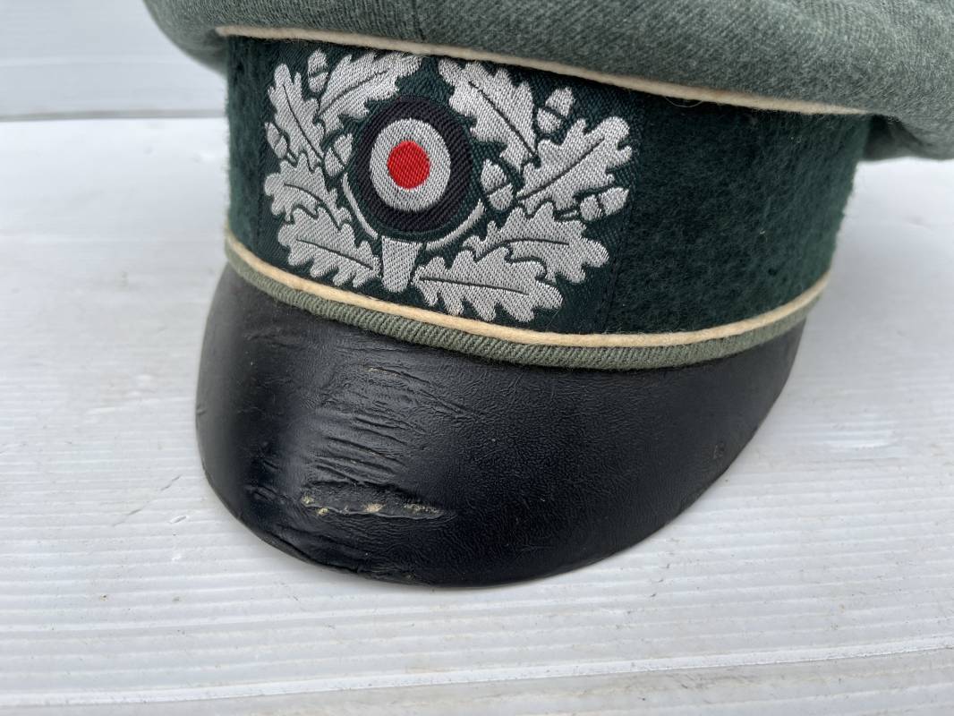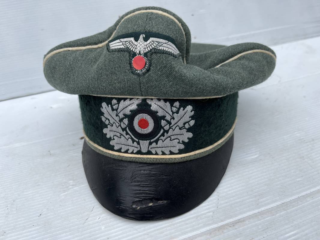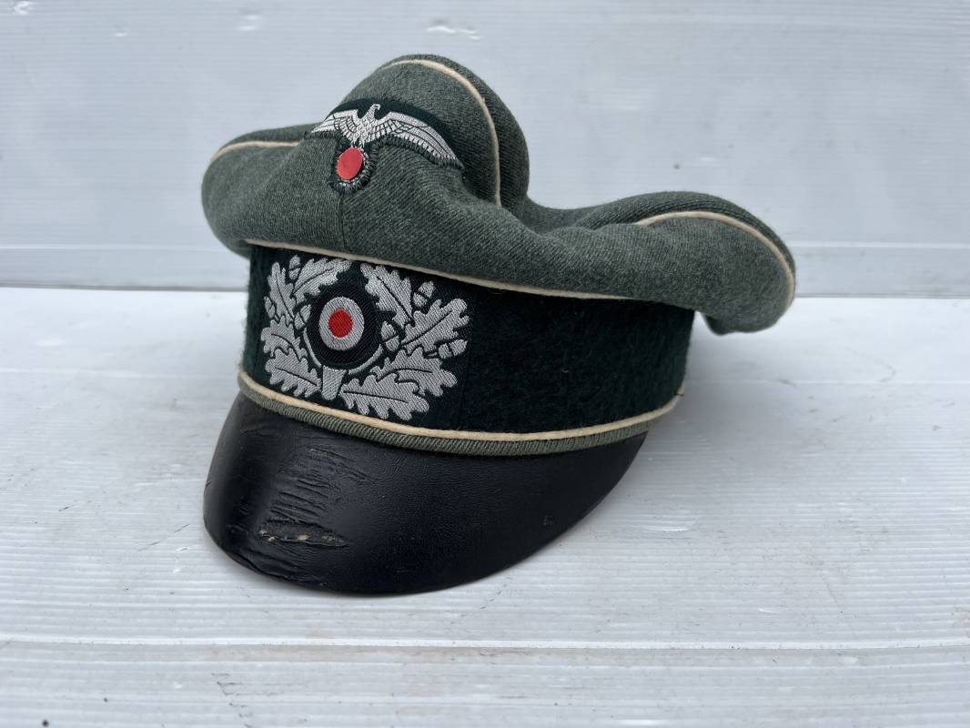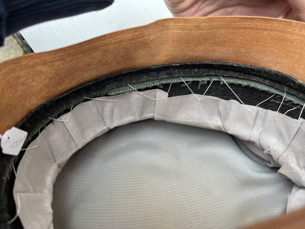 Rare casquette d'un officier de l'infanterie en tenue de campagne . Casquette du modèle 'Alter Art' . Casquette en tricotine fine feldgrau , liseré blanc de l'infanterie . Bandeau de coiffe extérieur souple en drap vert foncé . Belle forme cassée . Insignes montés d'origine a la machine du modéle tissés bevo pour officier . Aigle et cocarde tissés en fil d'aluminium . Cocarde montée machine , aigle monté machine zig zag . Visière souple en cuir noir . Casquette doublée en satinette grise , Bandeau de coiffe intérieur en cuir marron clair et petit velours noir sur le pourtour typique de chez 'Pekuro s ' Taille 57 . Casquette légèrement portée en parfait état . Trés belle coiffure de combat d'un officier de l'infanterie . Trés belle coiffure , définitive en collection . 1939/45 Ref 18076