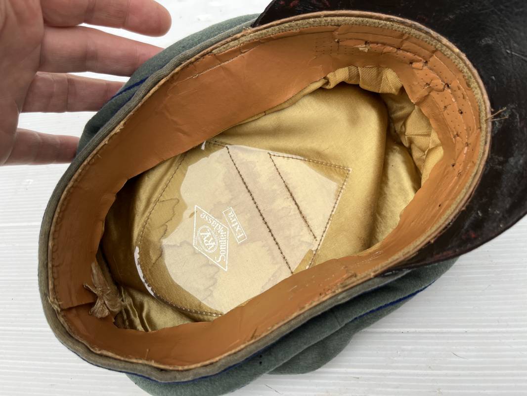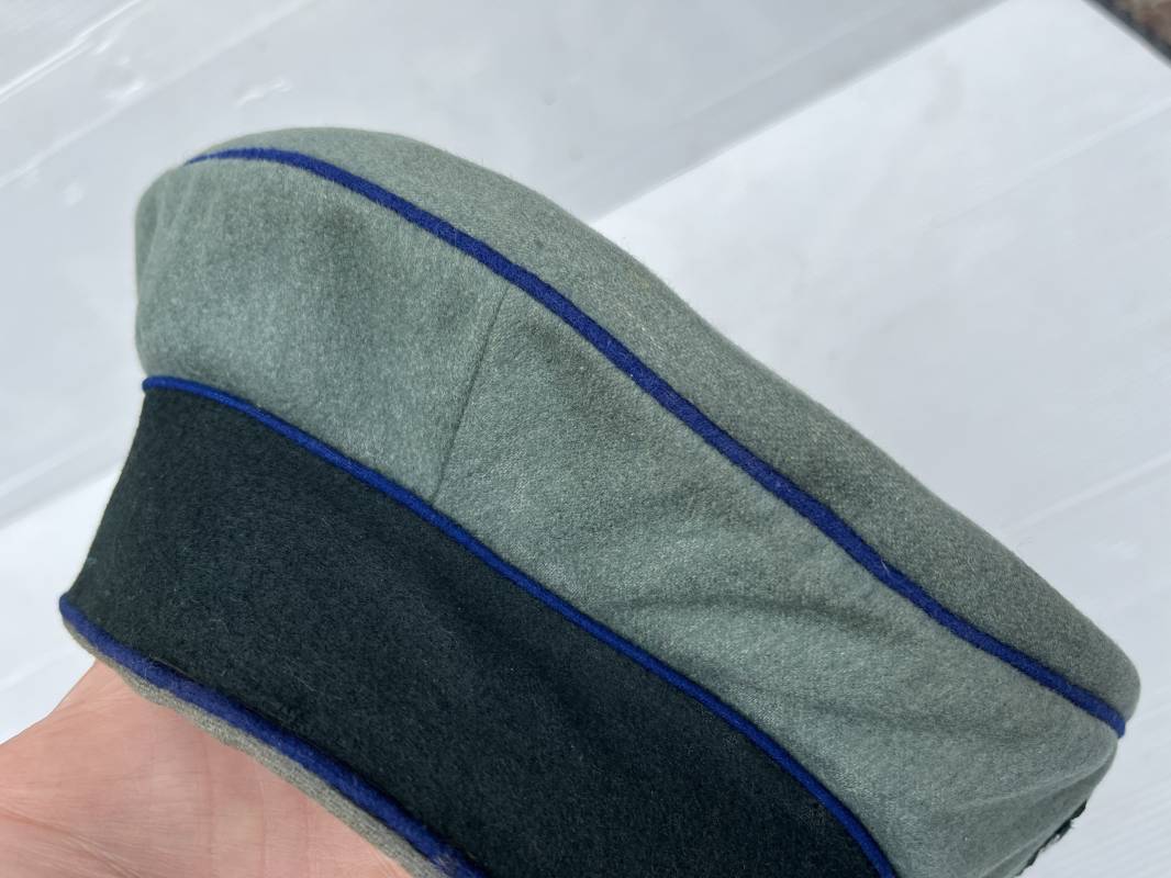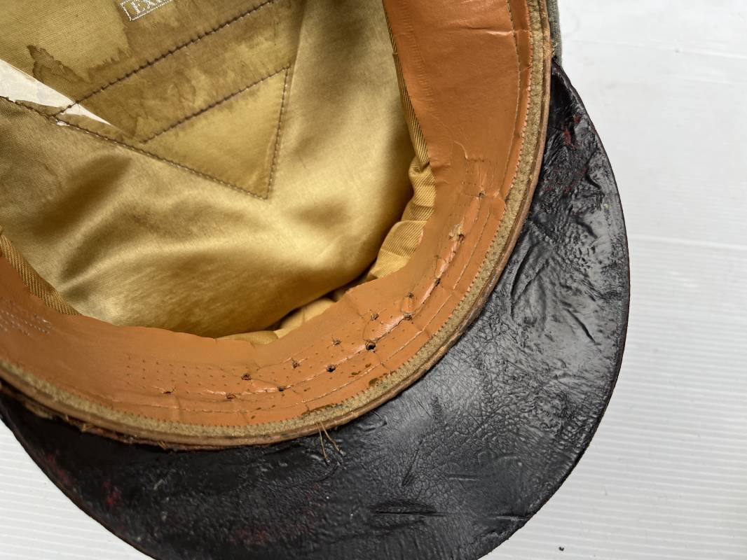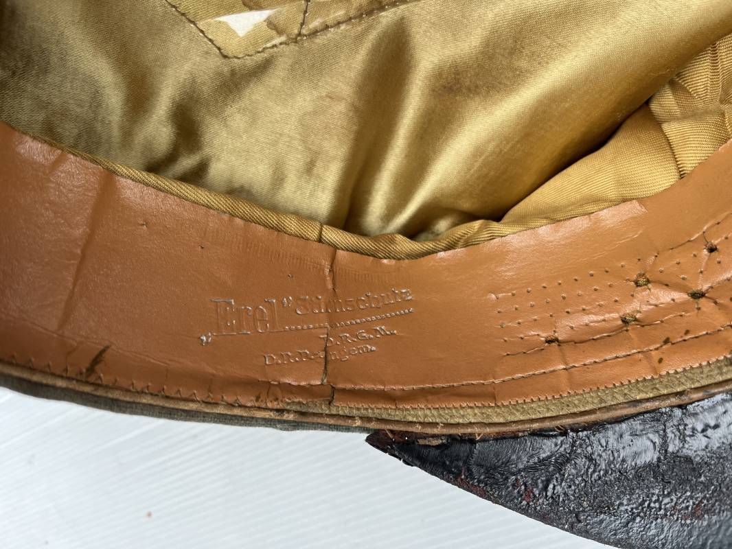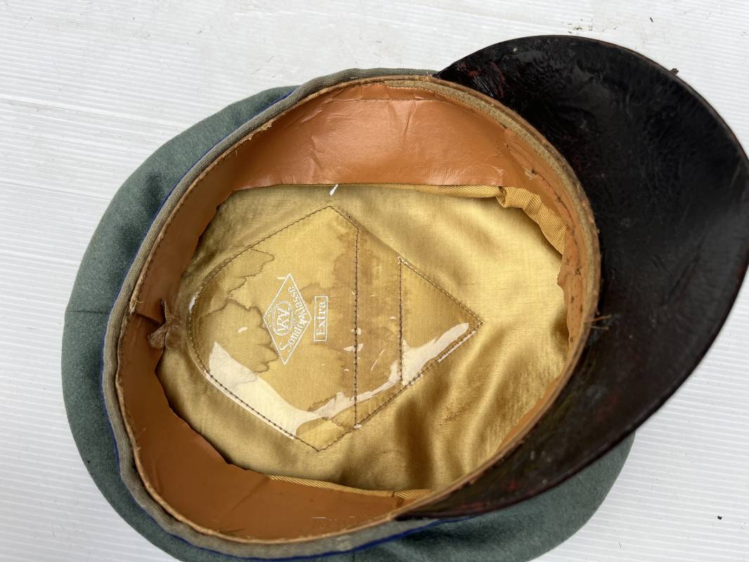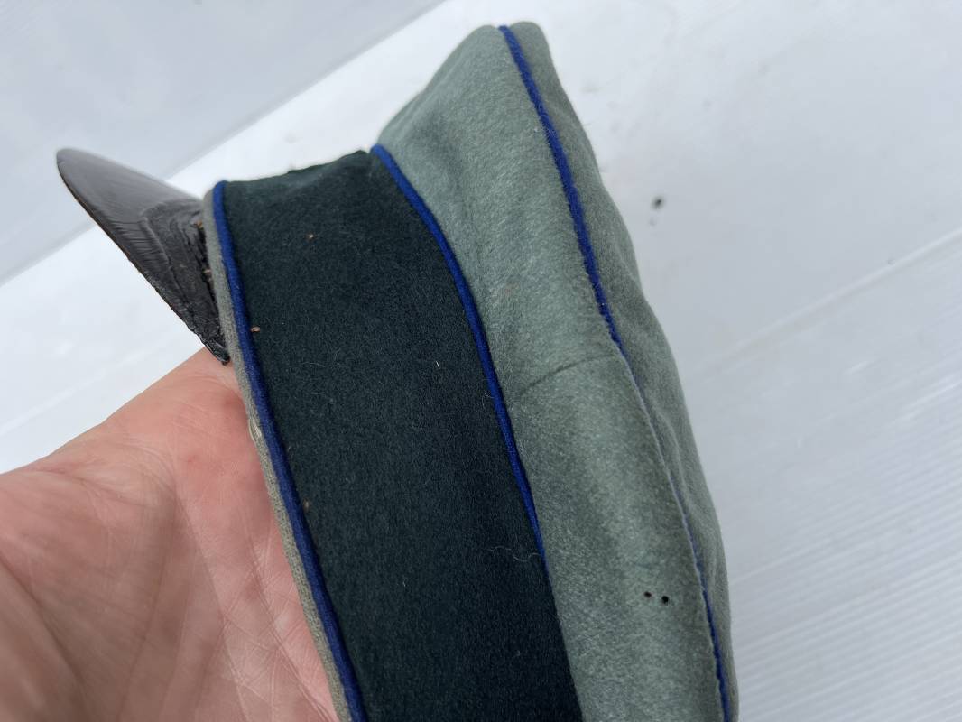 Rare casquette d'un officier du service de santé en tenue de campagne . Casquette du modèle 'Alter Art' . Casquette en drap fin feldgrau , liseré bleu nuit du service de santé . Bandeau de coiffe extérieur souple en drap vert foncé . Belle forme cassée . Insignes montés d'origine tissés bevo pour officier . Aigle et cocarde tissés en fil d'aluminium . Cocarde et aigle montés mains . Visière souple en cuir noir . Casquette doublée en satinette dorée Rhodoid avec marquage fabricant 'Erel Sonderklasse ' , Bandeau de coiffe intérieur en carton cuir marron clair , petit noeud en soie , taille 58 , marquage fabricant Erel Stirnschutz DRGM DRP . Casquette légèrement portée en parfait état . Trés belle coiffure de combat d'un officier médecin 1939/45 Ref 18720