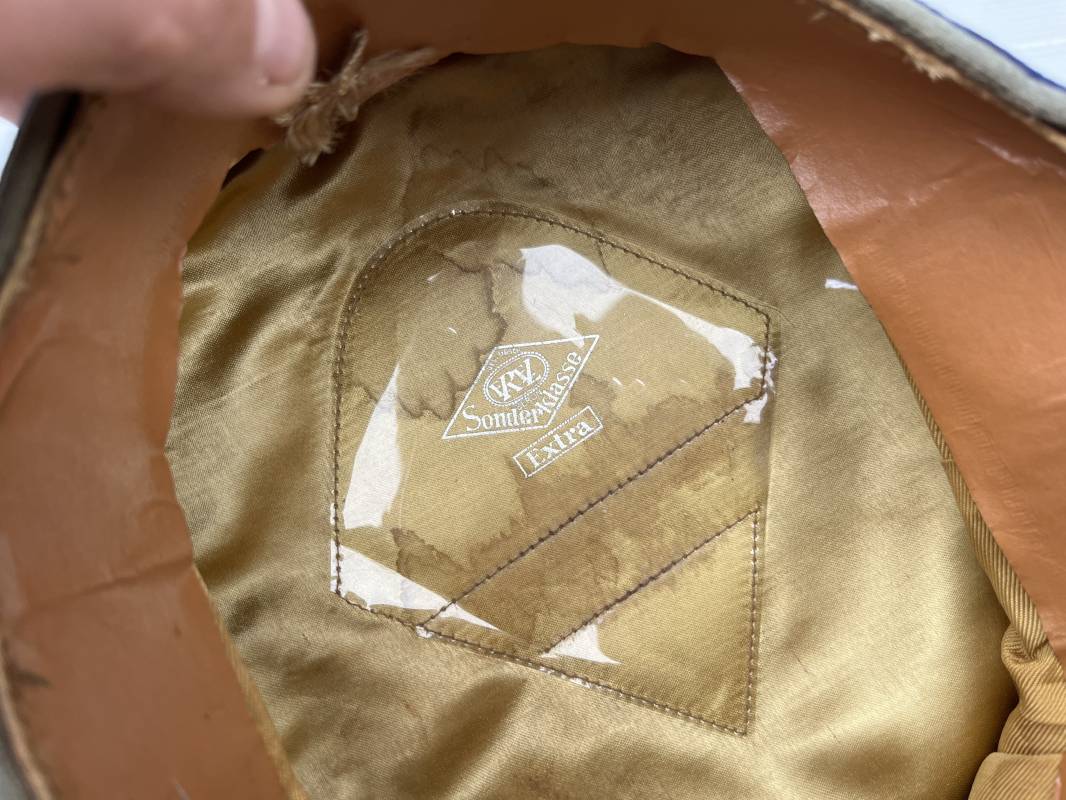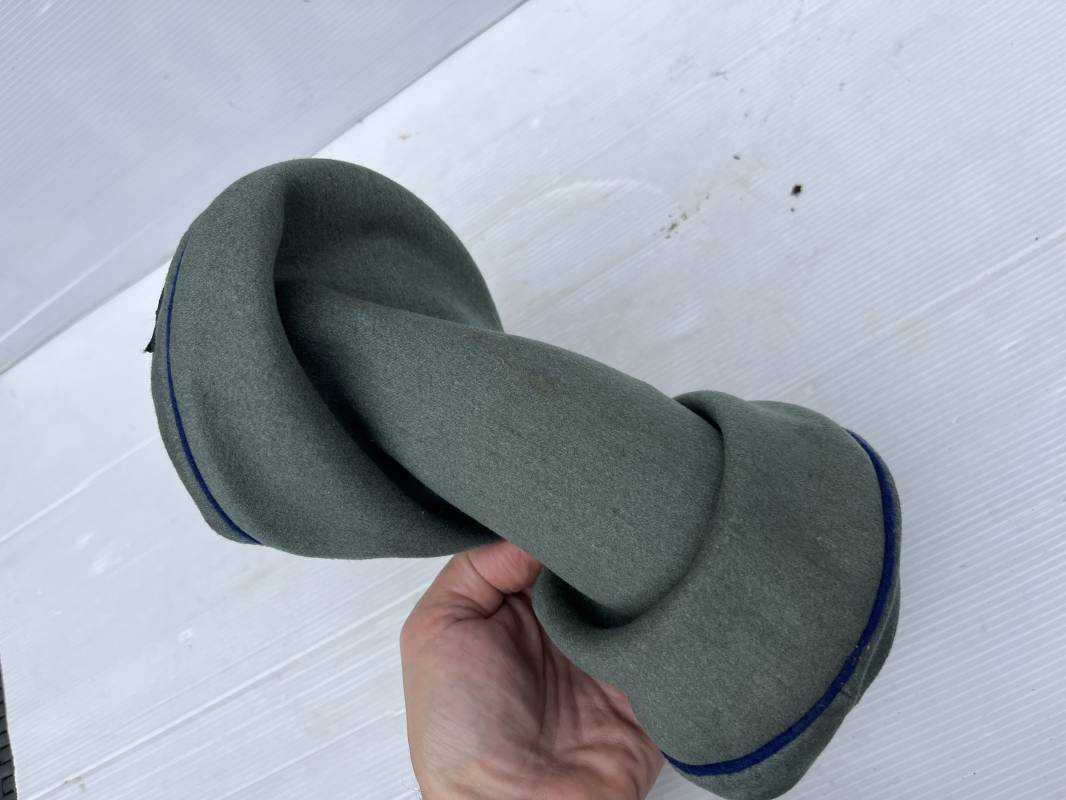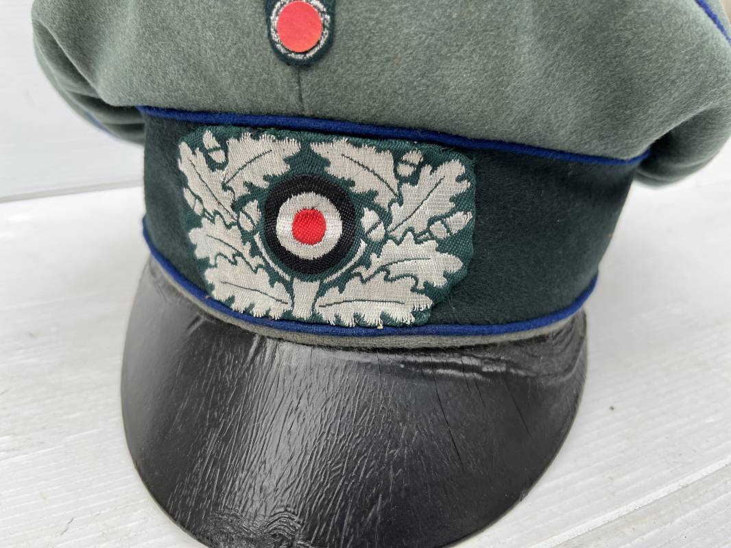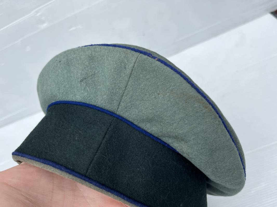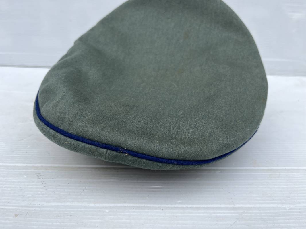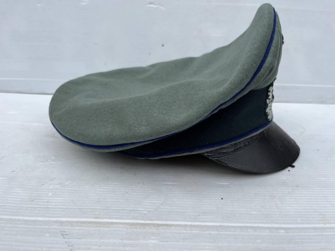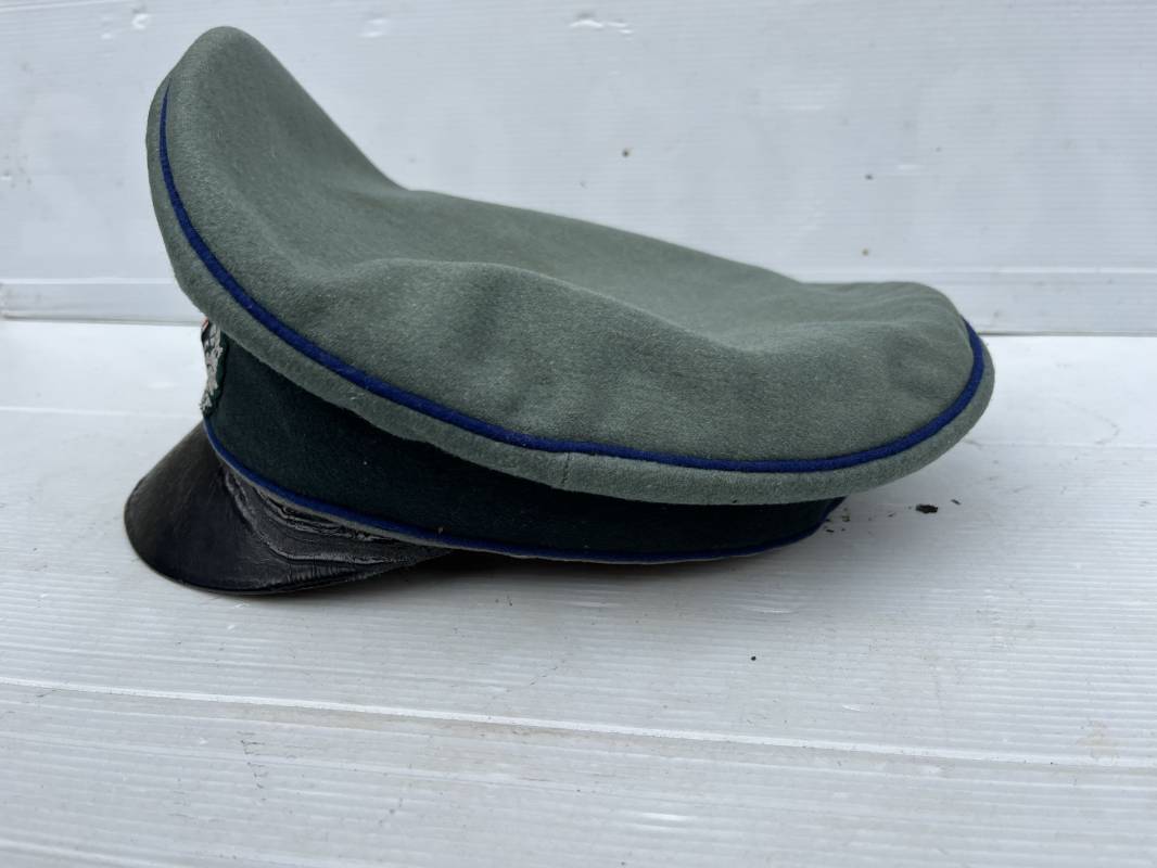 Rare casquette d'un officier du service de santé en tenue de campagne . Casquette du modèle 'Alter Art' . Casquette en drap fin feldgrau , liseré bleu nuit du service de santé . Bandeau de coiffe extérieur souple en drap vert foncé . Belle forme cassée . Insignes montés d'origine tissés bevo pour officier . Aigle et cocarde tissés en fil d'aluminium . Cocarde et aigle montés mains . Visière souple en cuir noir . Casquette doublée en satinette dorée Rhodoid avec marquage fabricant 'Erel Sonderklasse ' , Bandeau de coiffe intérieur en carton cuir marron clair , petit noeud en soie , taille 58 , marquage fabricant Erel Stirnschutz DRGM DRP . Casquette légèrement portée en parfait état . Trés belle coiffure de combat d'un officier médecin 1939/45 Ref 18720