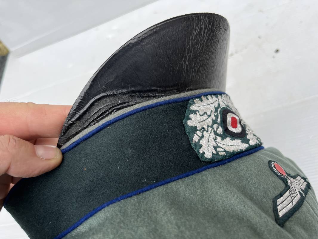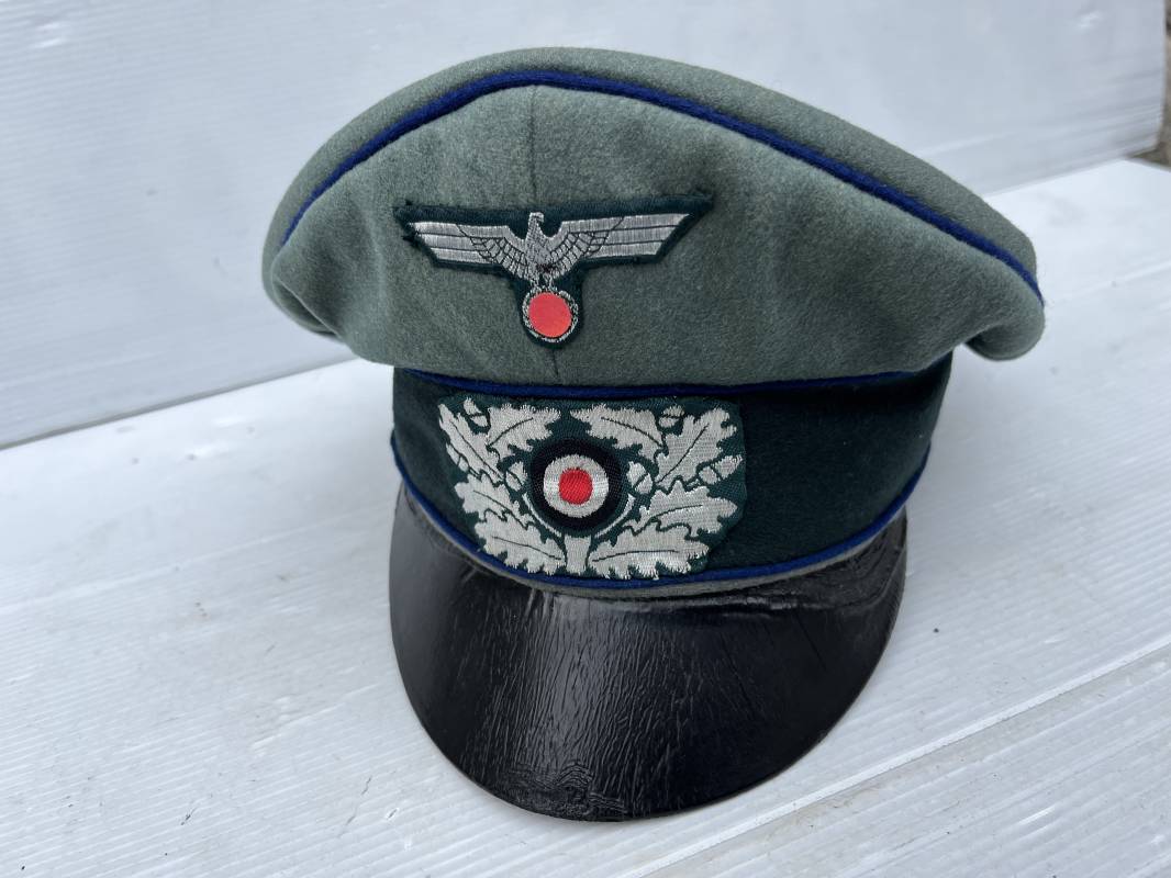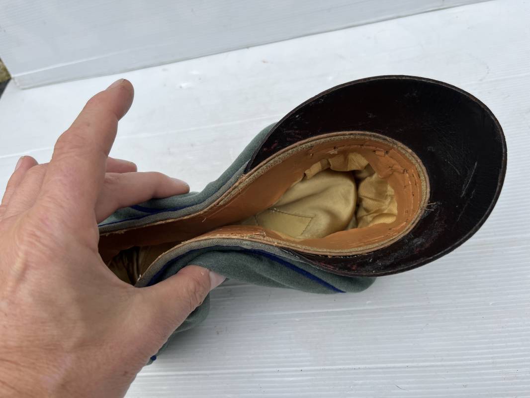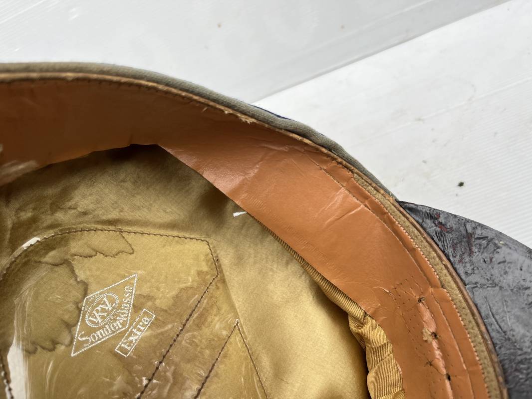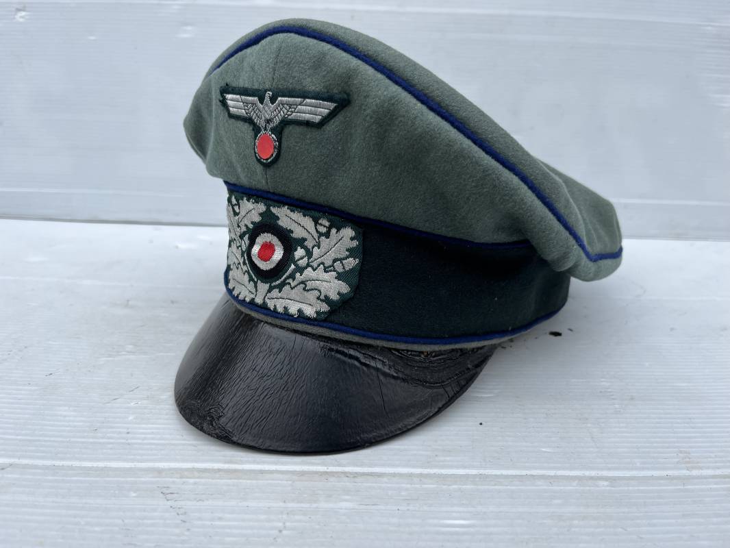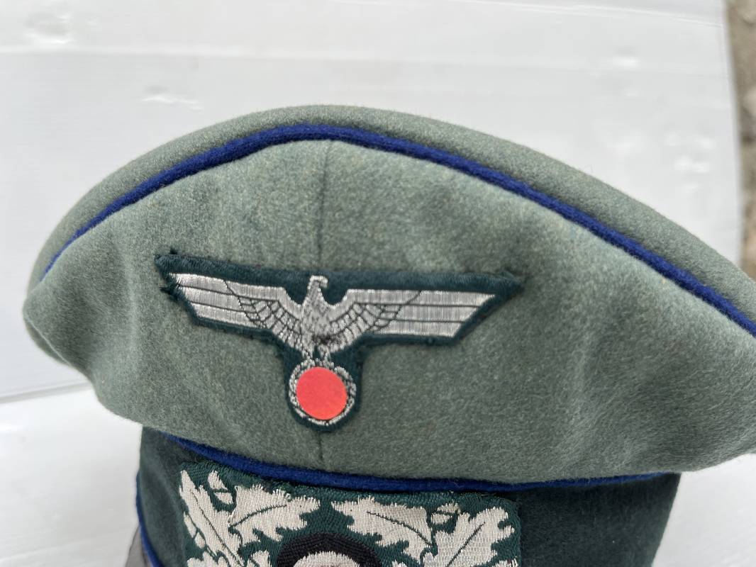 Rare casquette d'un officier du service de santé en tenue de campagne . Casquette du modèle 'Alter Art' . Casquette en drap fin feldgrau , liseré bleu nuit du service de santé . Bandeau de coiffe extérieur souple en drap vert foncé . Belle forme cassée . Insignes montés d'origine tissés bevo pour officier . Aigle et cocarde tissés en fil d'aluminium . Cocarde et aigle montés mains . Visière souple en cuir noir . Casquette doublée en satinette dorée Rhodoid avec marquage fabricant 'Erel Sonderklasse ' , Bandeau de coiffe intérieur en carton cuir marron clair , petit noeud en soie , taille 58 , marquage fabricant Erel Stirnschutz DRGM DRP . Casquette légèrement portée en parfait état . Trés belle coiffure de combat d'un officier médecin 1939/45 Ref 18720