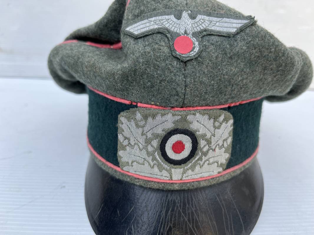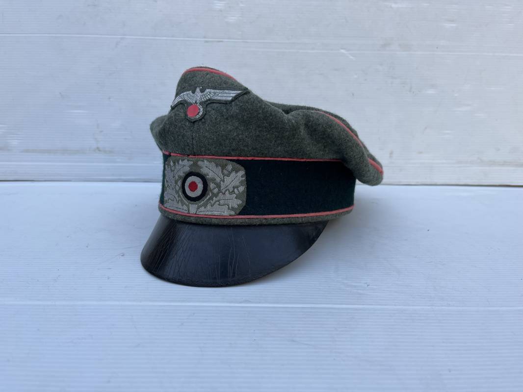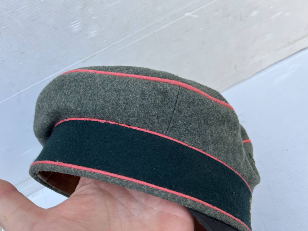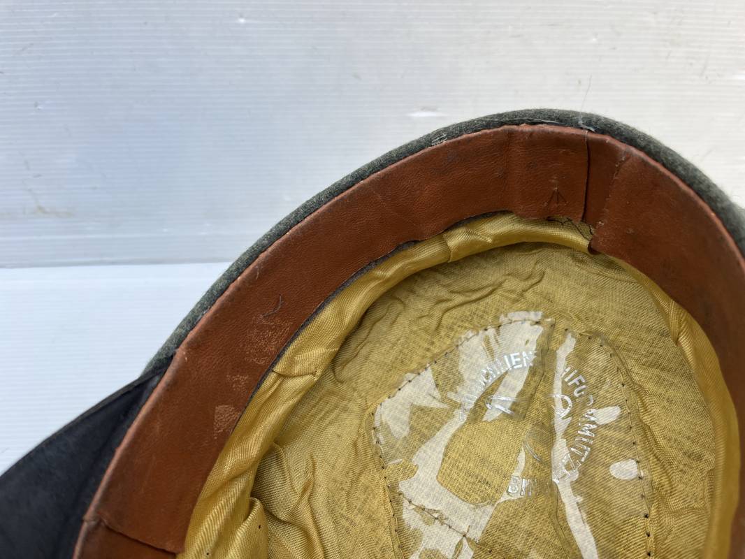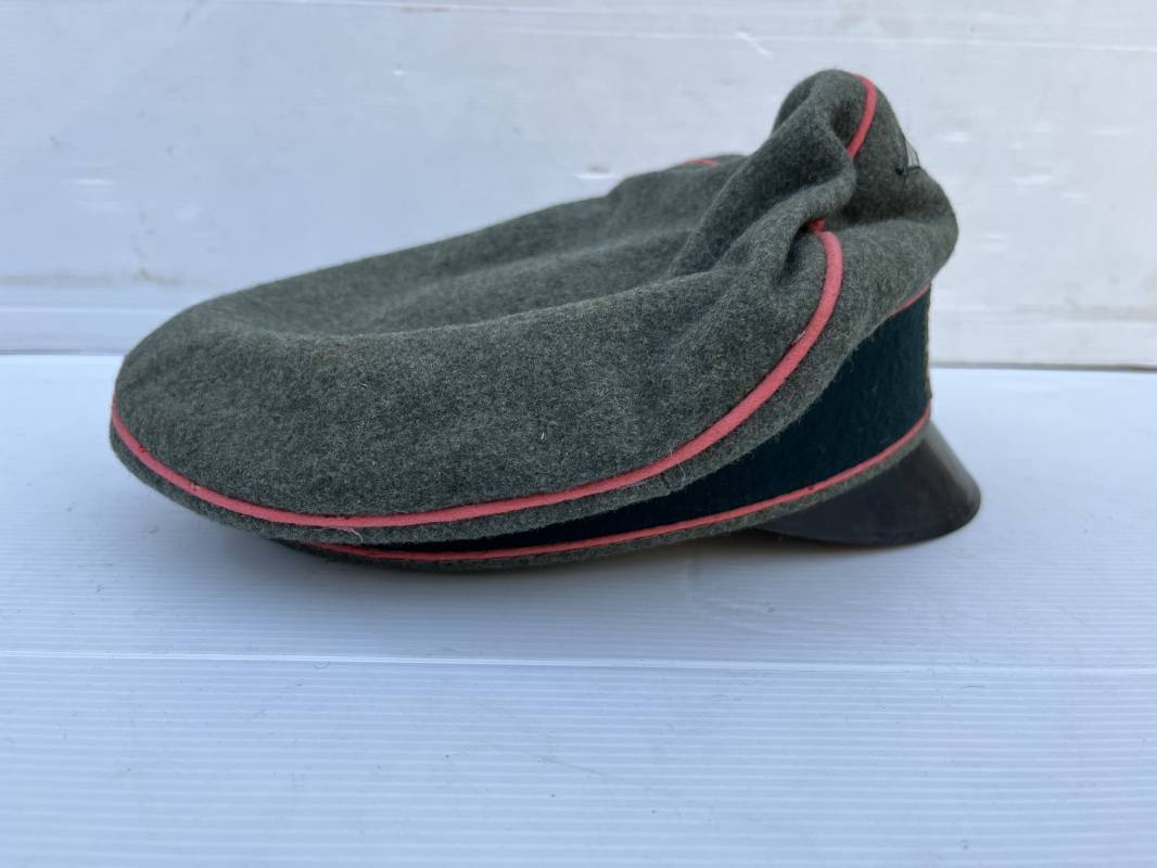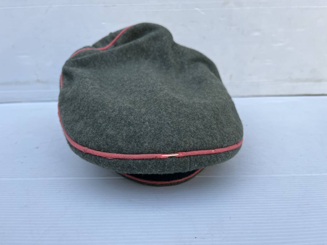 Trés rare casquette d'un officier Panzer de la heer en tenue de campagne . Casquette du modèle 'Alter Art' . Casquette en drap rude feldgrau , liseré rose des panzer truppen . Bandeau de coiffe extérieur souple et mou en drap vert foncé . Belle forme cassée . Insignes montés d'origine du modéle tissés bevo pour officier , premier type sur fond clair . Aigle et cocarde tissés en fil d'aluminium . Visière souple en cuir noir . Casquette doublée en satinette dorée , rhodoid et marquage et logo fabricant , a noté rhodoid cassé avec petit manque ( voir photos ) , Bandeau de coiffe intérieur en cuir marron clair Taille 56 1/2 . Casquette légèrement portée en parfait état . Trés rare coiffure de combat d'un officier panzer de la Heer . Trés belle coiffure , définitive en collection . 1939/45 Ref 21526