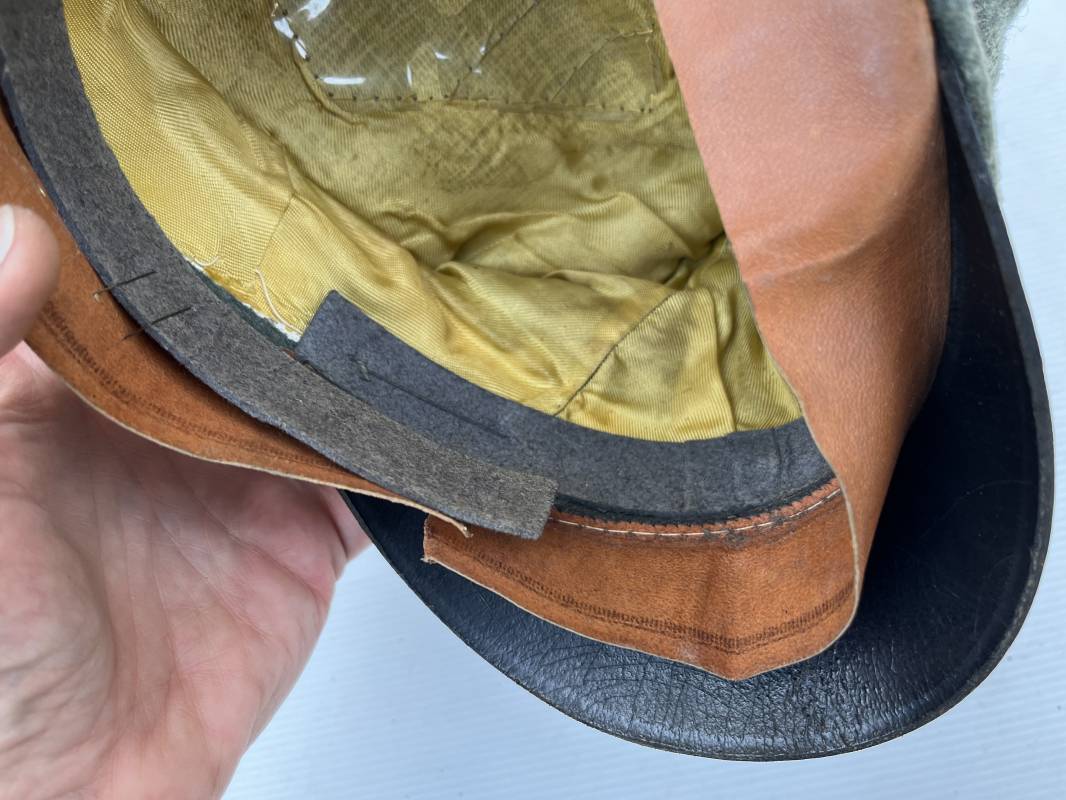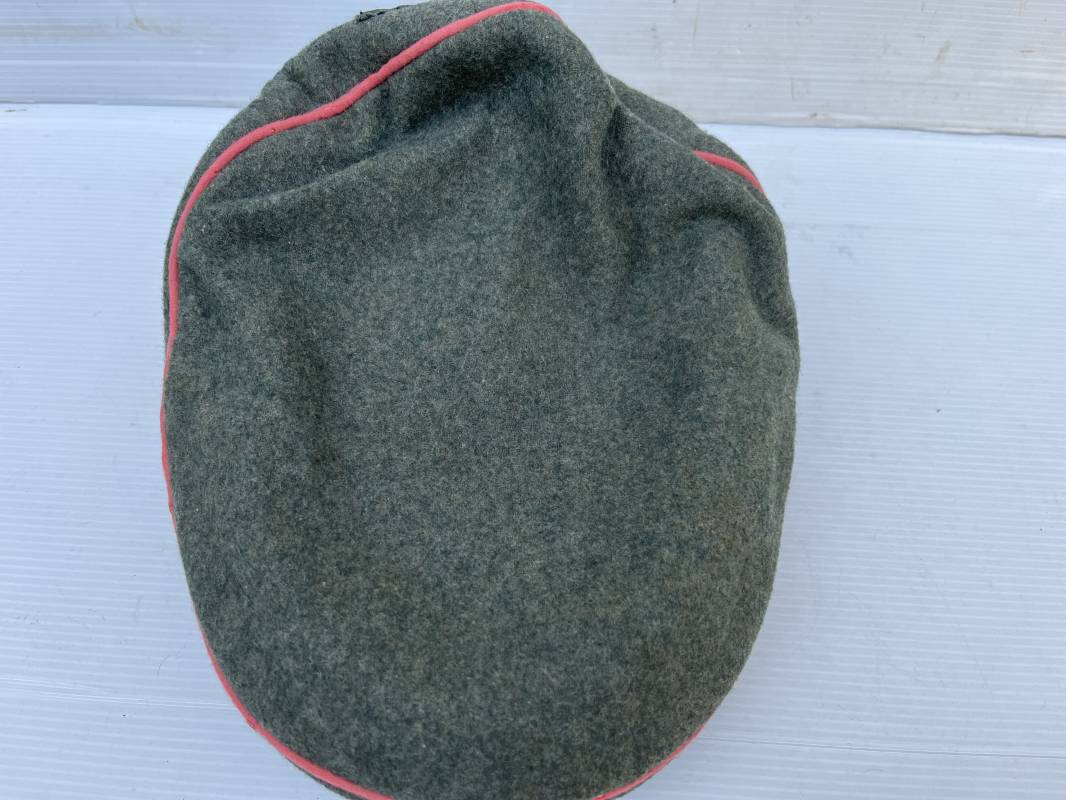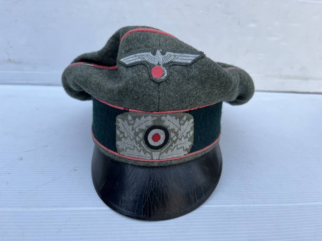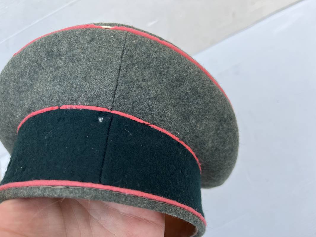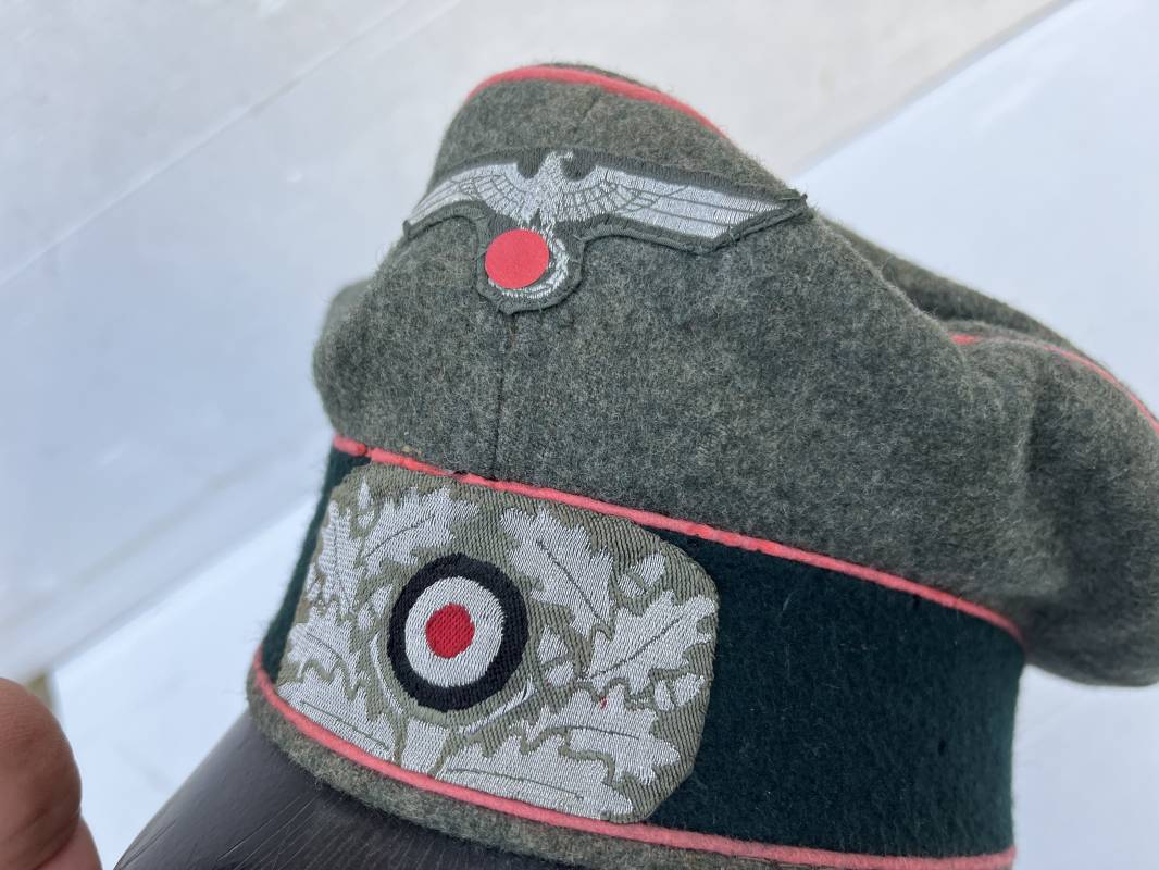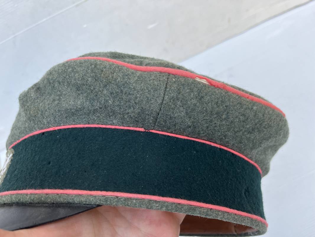Trés rare casquette d'un officier Panzer de la heer en tenue de campagne . Casquette du modèle 'Alter Art' . Casquette en drap rude feldgrau , liseré rose des panzer truppen . Bandeau de coiffe extérieur souple et mou en drap vert foncé . Belle forme cassée . Insignes montés d'origine du modéle tissés bevo pour officier , premier type sur fond clair . Aigle et cocarde tissés en fil d'aluminium . Visière souple en cuir noir . Casquette doublée en satinette dorée , rhodoid et marquage et logo fabricant , a noté rhodoid cassé avec petit manque ( voir photos ) , Bandeau de coiffe intérieur en cuir marron clair Taille 56 1/2 . Casquette légèrement portée en parfait état . Trés rare coiffure de combat d'un officier panzer de la Heer . Trés belle coiffure , définitive en collection . 1939/45 Ref 21526