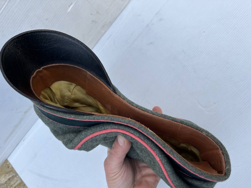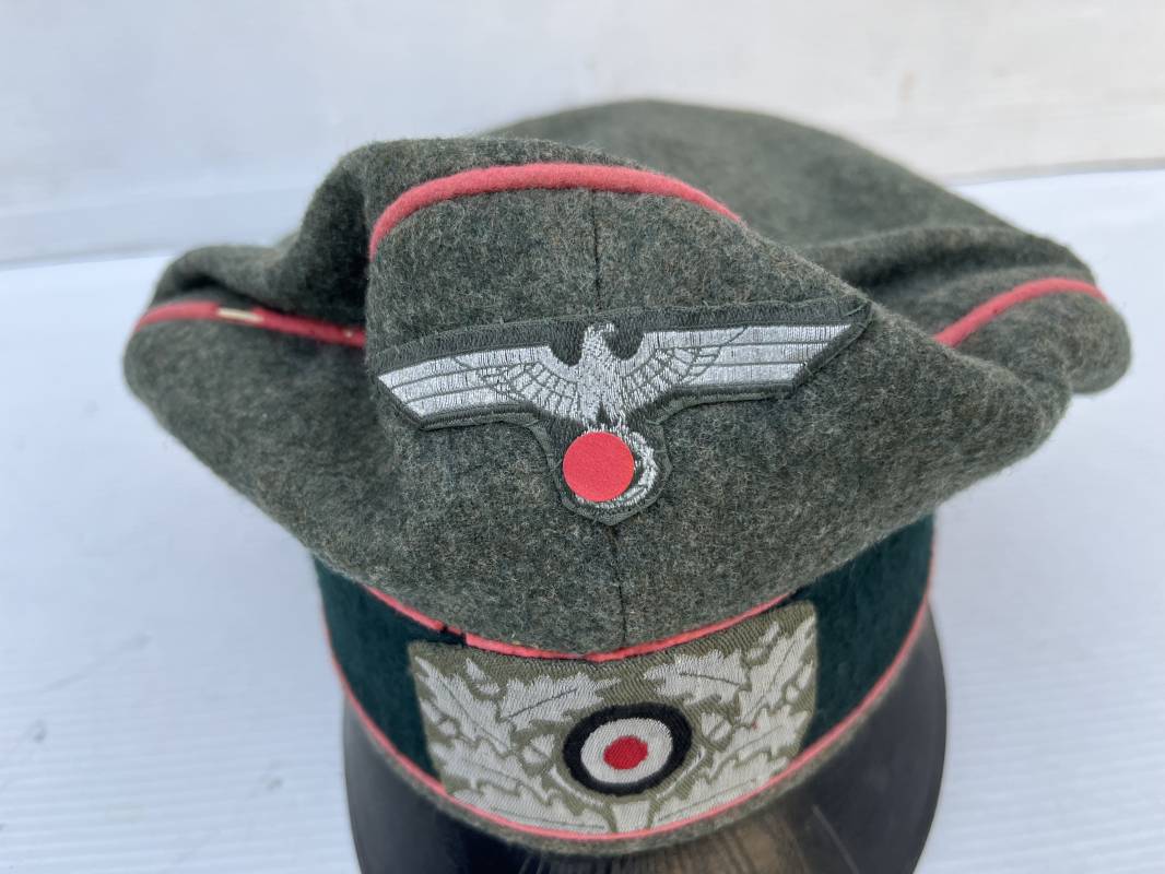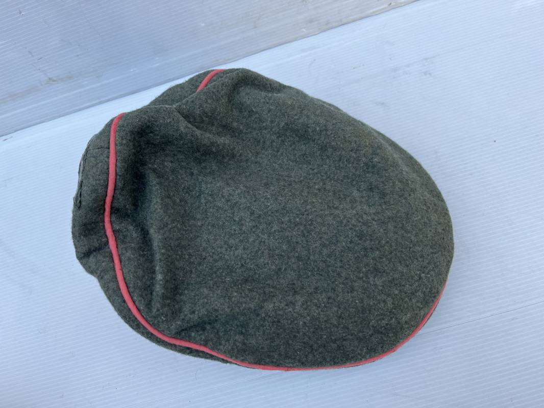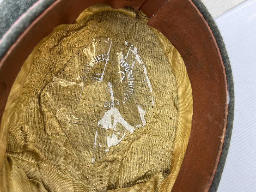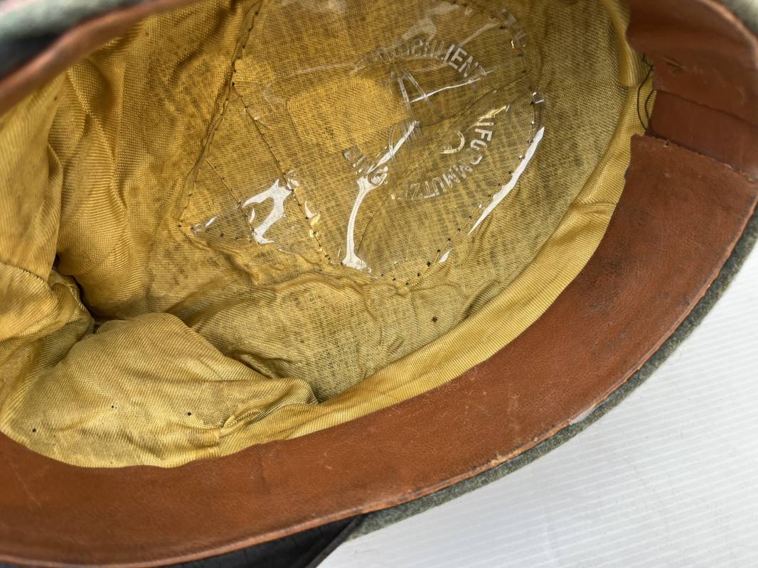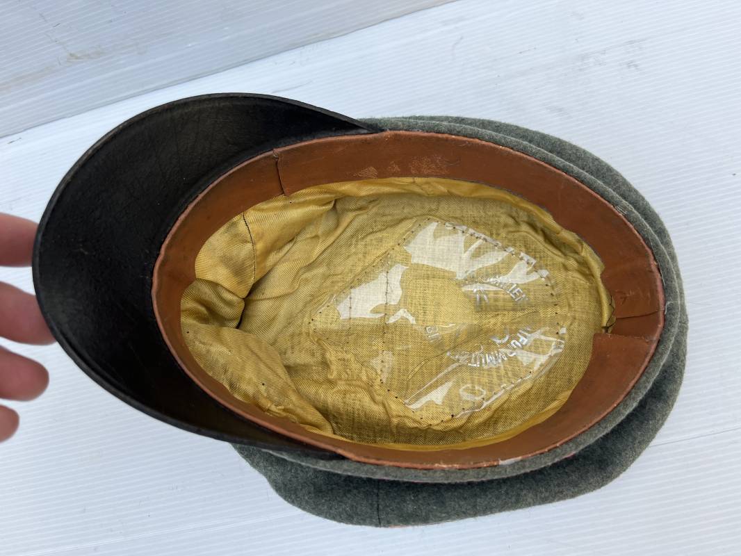 Trés rare casquette d'un officier Panzer de la heer en tenue de campagne . Casquette du modèle 'Alter Art' . Casquette en drap rude feldgrau , liseré rose des panzer truppen . Bandeau de coiffe extérieur souple et mou en drap vert foncé . Belle forme cassée . Insignes montés d'origine du modéle tissés bevo pour officier , premier type sur fond clair . Aigle et cocarde tissés en fil d'aluminium . Visière souple en cuir noir . Casquette doublée en satinette dorée , rhodoid et marquage et logo fabricant , a noté rhodoid cassé avec petit manque ( voir photos ) , Bandeau de coiffe intérieur en cuir marron clair Taille 56 1/2 . Casquette légèrement portée en parfait état . Trés rare coiffure de combat d'un officier panzer de la Heer . Trés belle coiffure , définitive en collection . 1939/45 Ref 21526