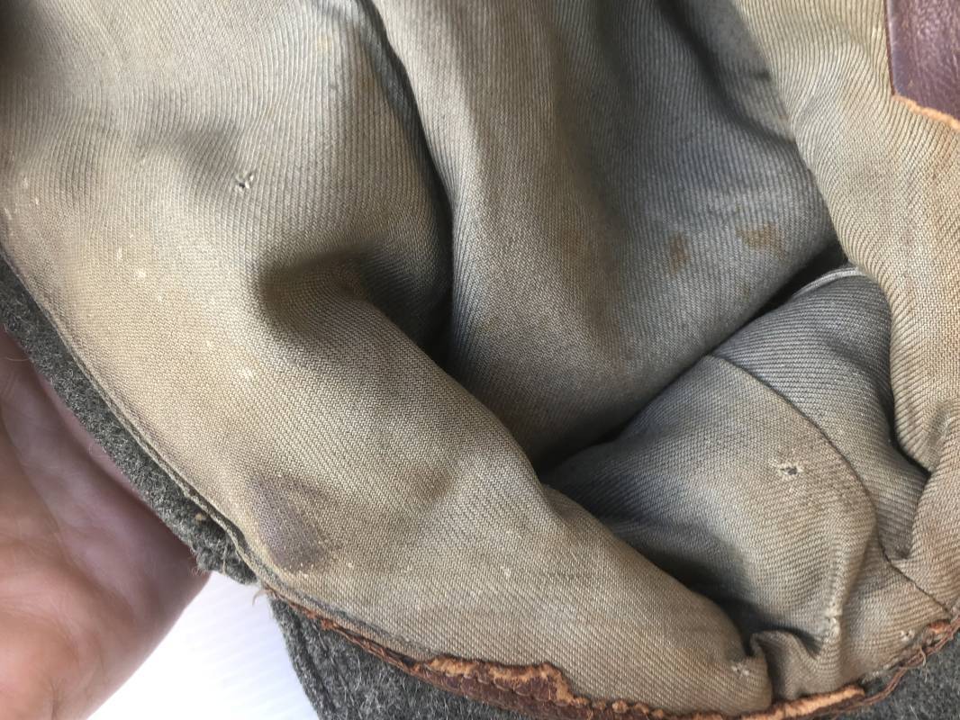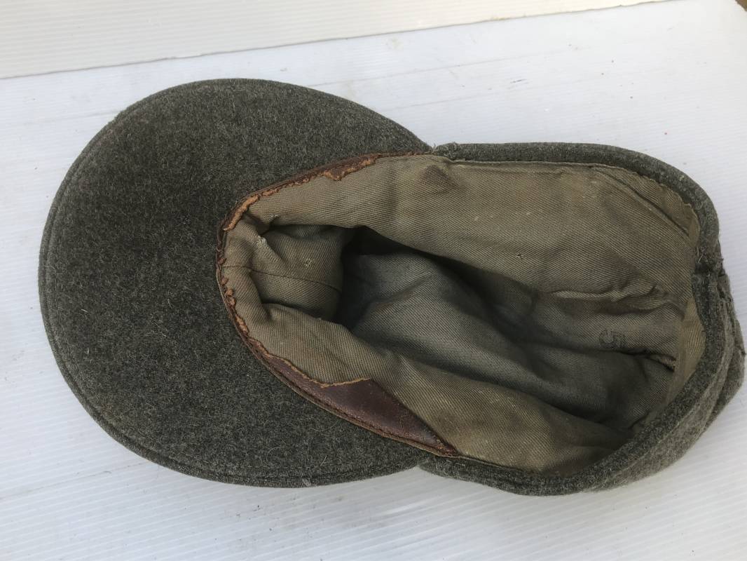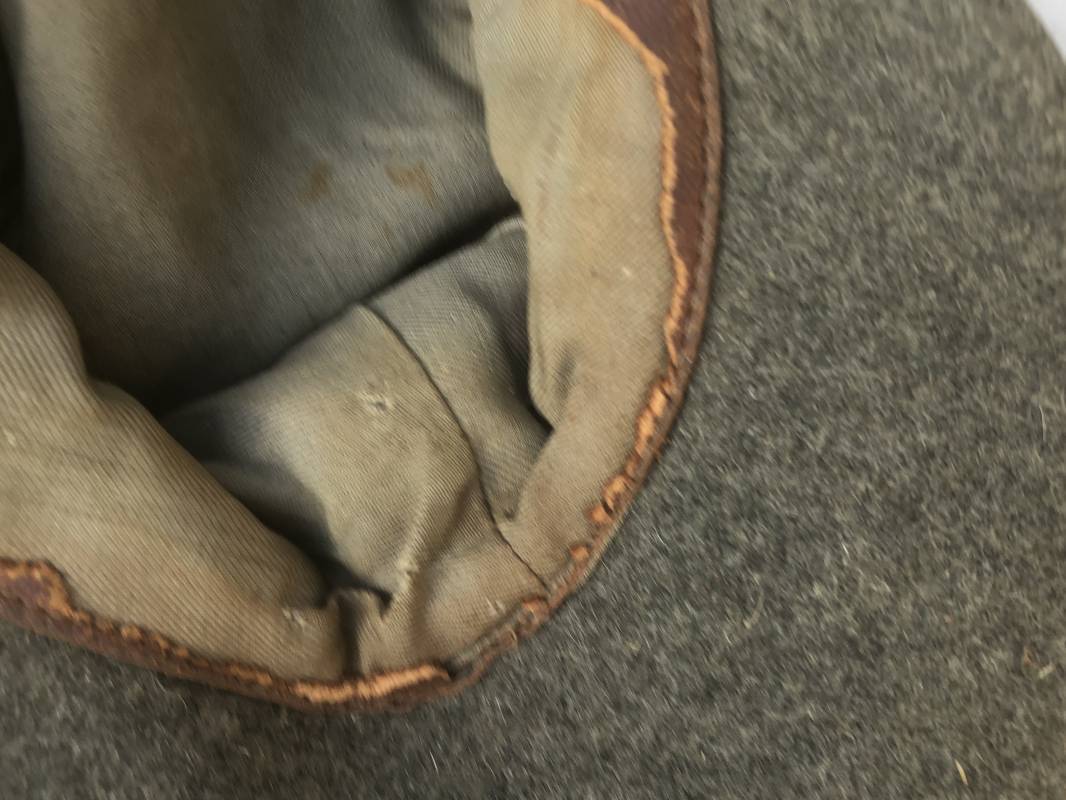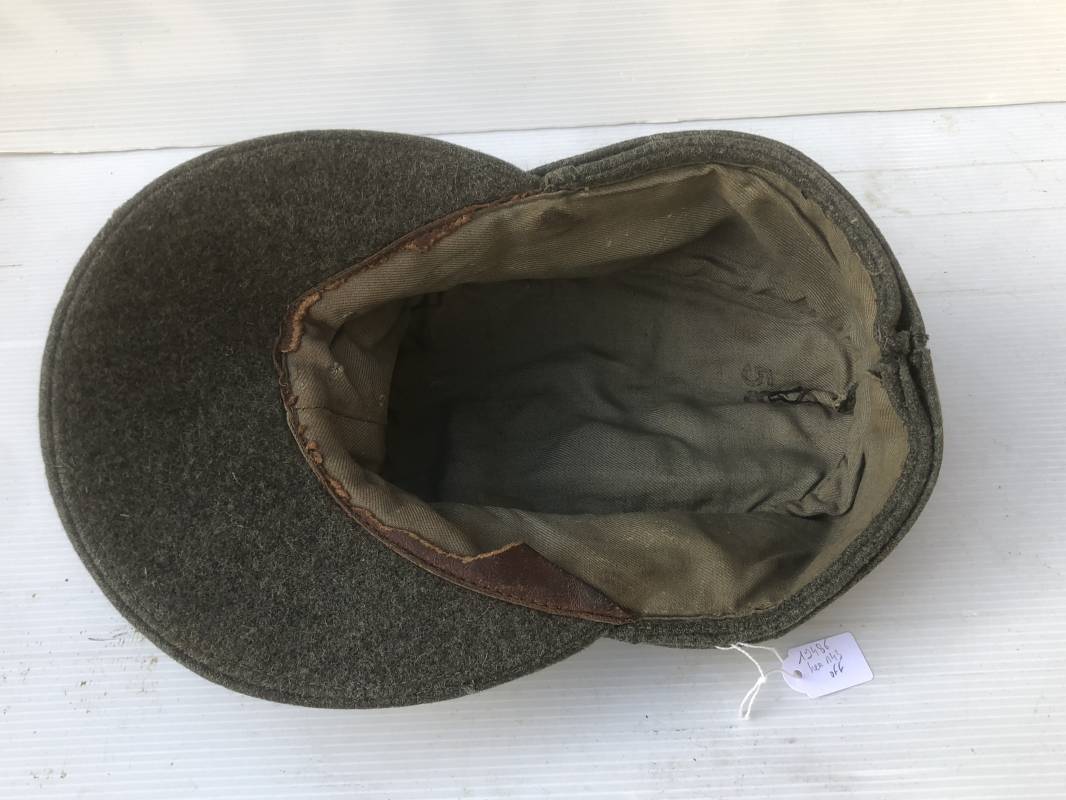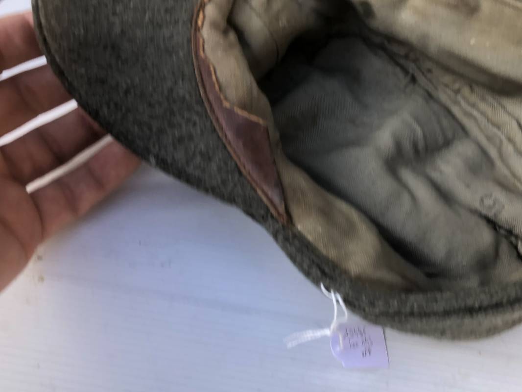 Rare casquette de dotation modéle 1943 d'un officier de la Heer . Casquette à visière réglementaire en drap feldgrau . Rabats en drap et deux boutons grenelés cousus sur le devant . Renforts en satinette dans les bordures du rabat . Insigne triangulaire modele 1943 du modéle officier avec aigle et cocarde tissés en fil d'aluminium , . Liseré argent sur le pourtour du modéle toute arme pour officier . Intérieur entièrement doublé en coton gris . Marquage encre noir Taille 58 . , bandeau intérieur en cuir glacé marron demi lune cousu sur le devant mais dont une grande partie est manquante ( voir photos ) Casquette légérement portée en parfait état . Rare casquette trouvée dans une famille en Allemagne 100% nature et totalement intouchée . Rare coiffure modéle 1943 d'un officier de la Heer . Ref 19486