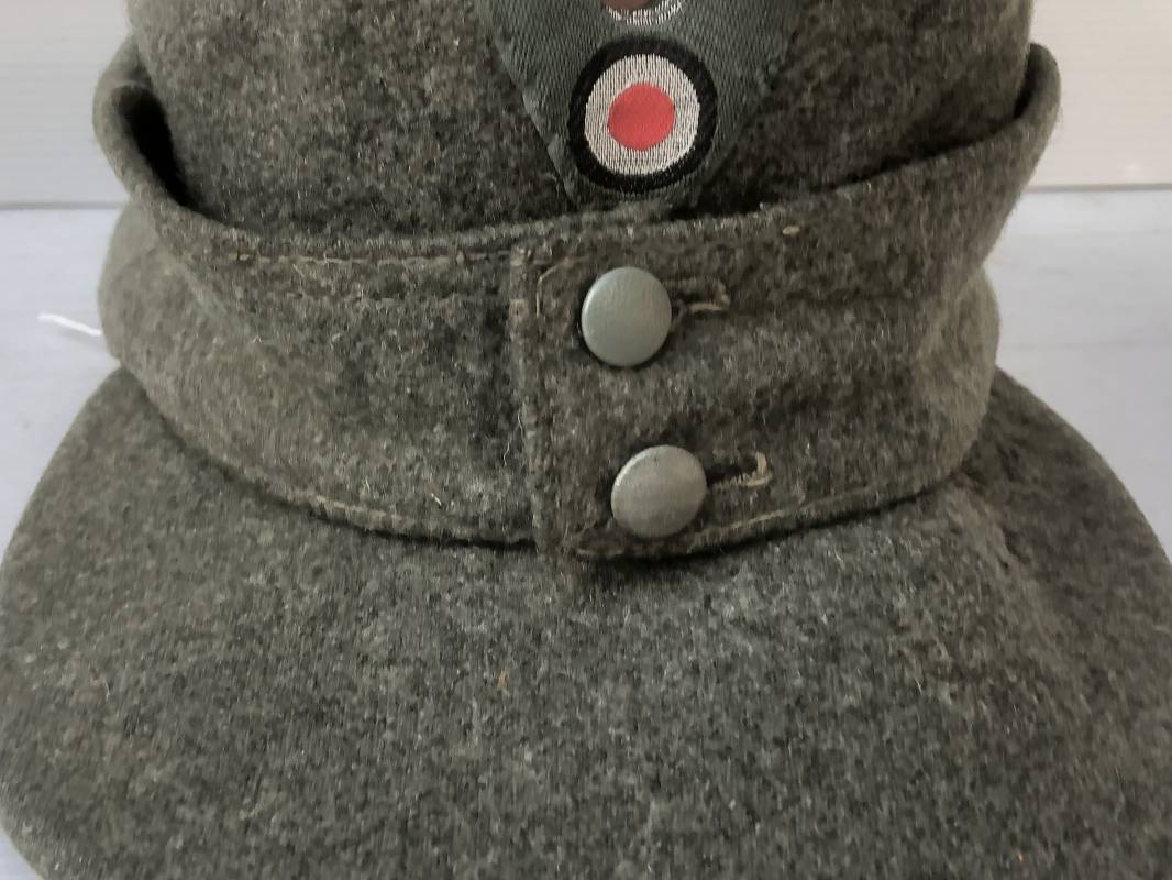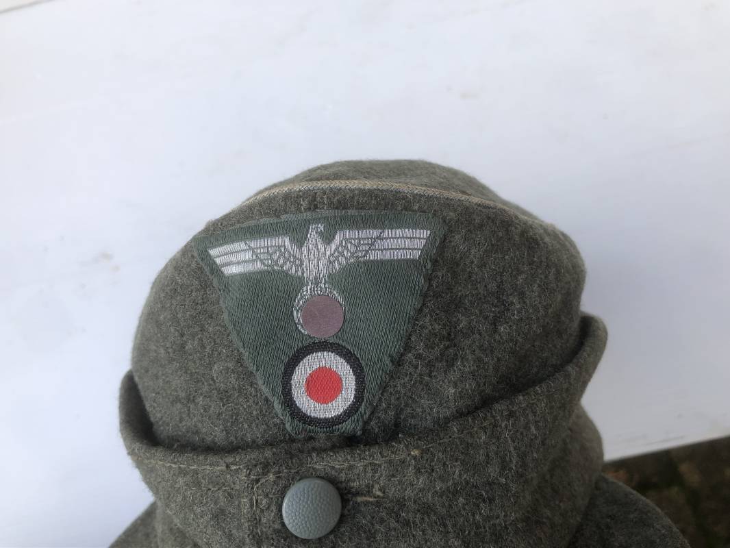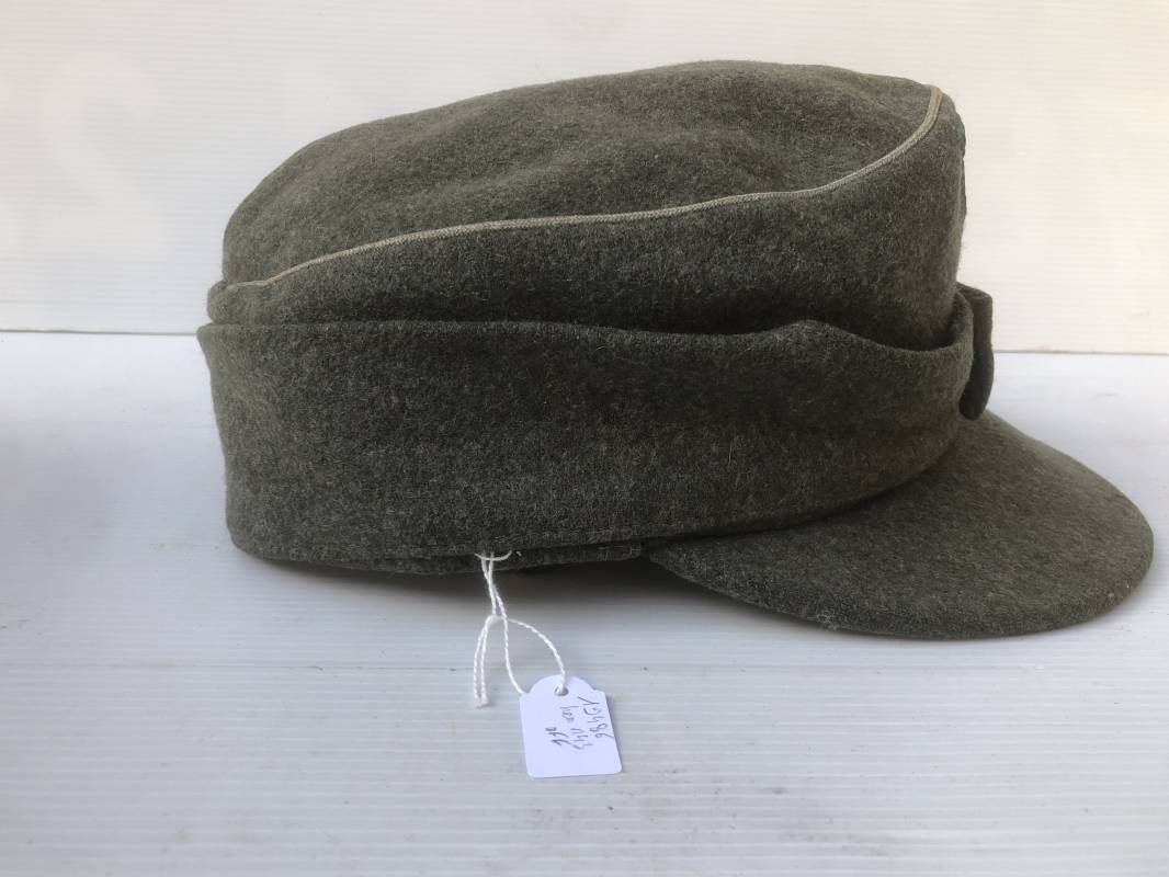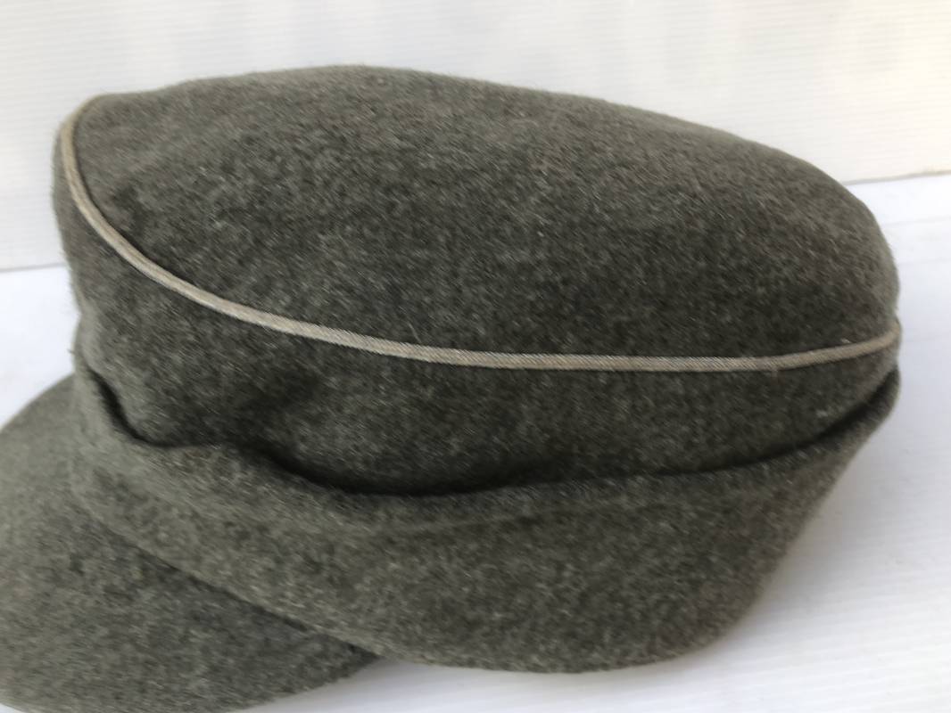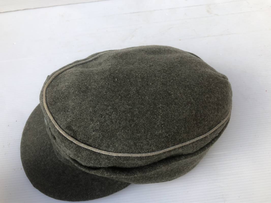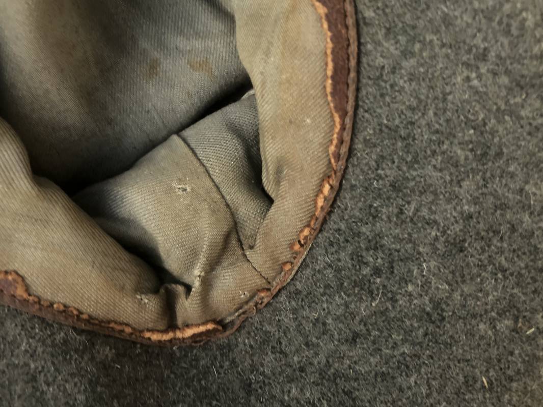 Rare casquette de dotation modéle 1943 d'un officier de la Heer . Casquette à visière réglementaire en drap feldgrau . Rabats en drap et deux boutons grenelés cousus sur le devant . Renforts en satinette dans les bordures du rabat . Insigne triangulaire modele 1943 du modéle officier avec aigle et cocarde tissés en fil d'aluminium , . Liseré argent sur le pourtour du modéle toute arme pour officier . Intérieur entièrement doublé en coton gris . Marquage encre noir Taille 58 . , bandeau intérieur en cuir glacé marron demi lune cousu sur le devant mais dont une grande partie est manquante ( voir photos ) Casquette légérement portée en parfait état . Rare casquette trouvée dans une famille en Allemagne 100% nature et totalement intouchée . Rare coiffure modéle 1943 d'un officier de la Heer . Ref 19486