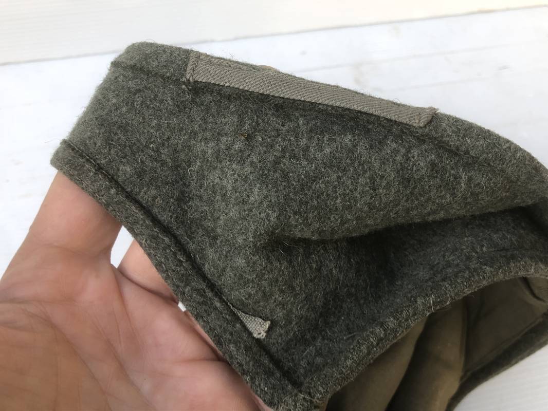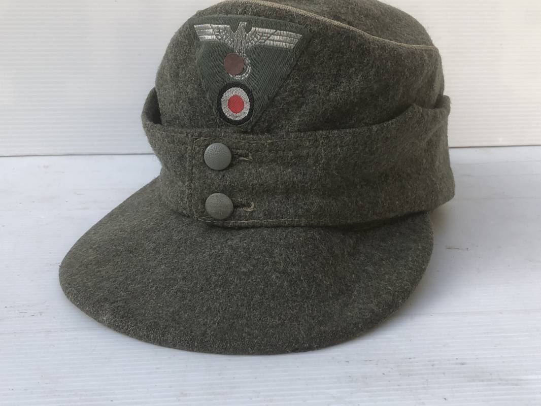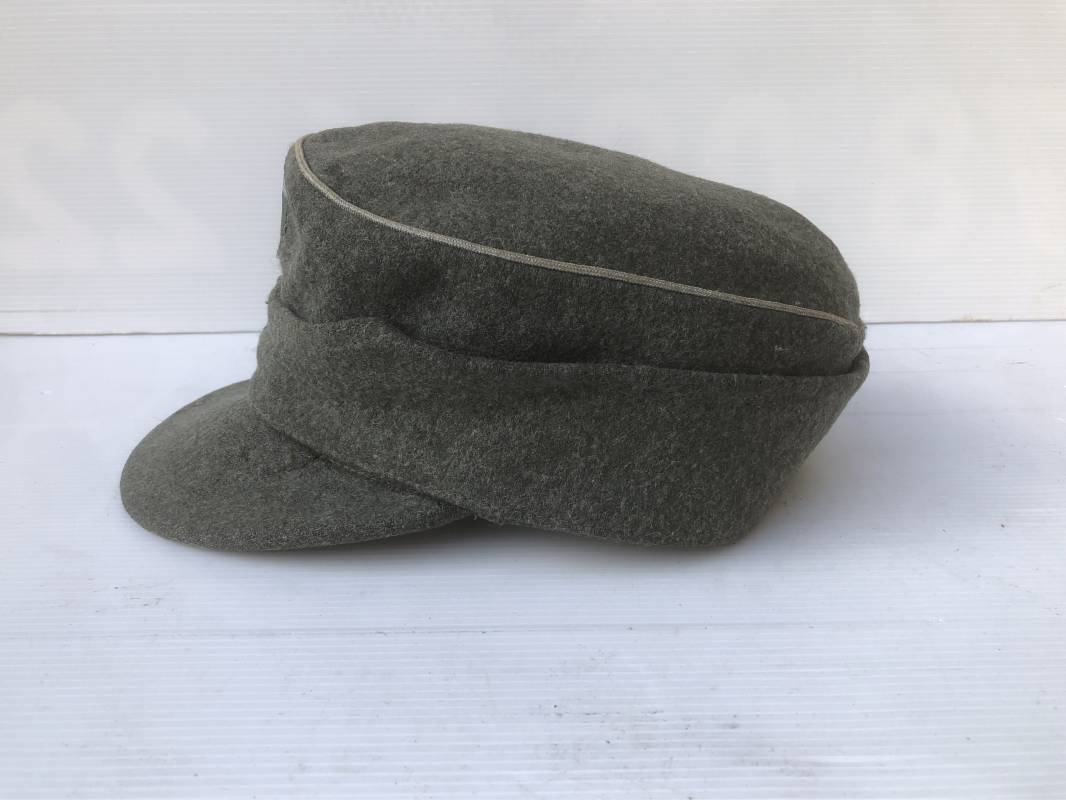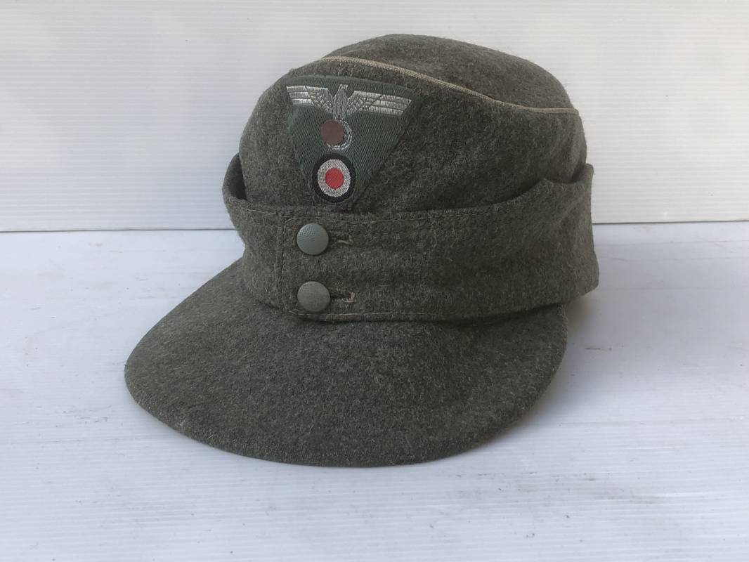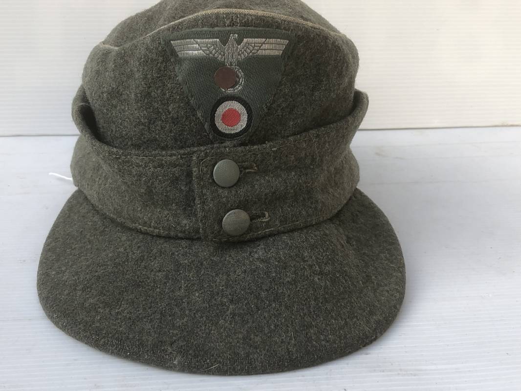 Rare casquette de dotation modéle 1943 d'un officier de la Heer . Casquette à visière réglementaire en drap feldgrau . Rabats en drap et deux boutons grenelés cousus sur le devant . Renforts en satinette dans les bordures du rabat . Insigne triangulaire modele 1943 du modéle officier avec aigle et cocarde tissés en fil d'aluminium , . Liseré argent sur le pourtour du modéle toute arme pour officier . Intérieur entièrement doublé en coton gris . Marquage encre noir Taille 58 . , bandeau intérieur en cuir glacé marron demi lune cousu sur le devant mais dont une grande partie est manquante ( voir photos ) Casquette légérement portée en parfait état . Rare casquette trouvée dans une famille en Allemagne 100% nature et totalement intouchée . Rare coiffure modéle 1943 d'un officier de la Heer . Ref 19486
