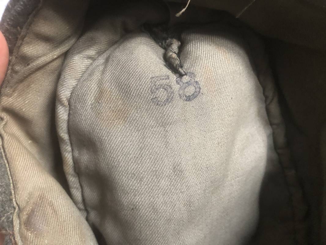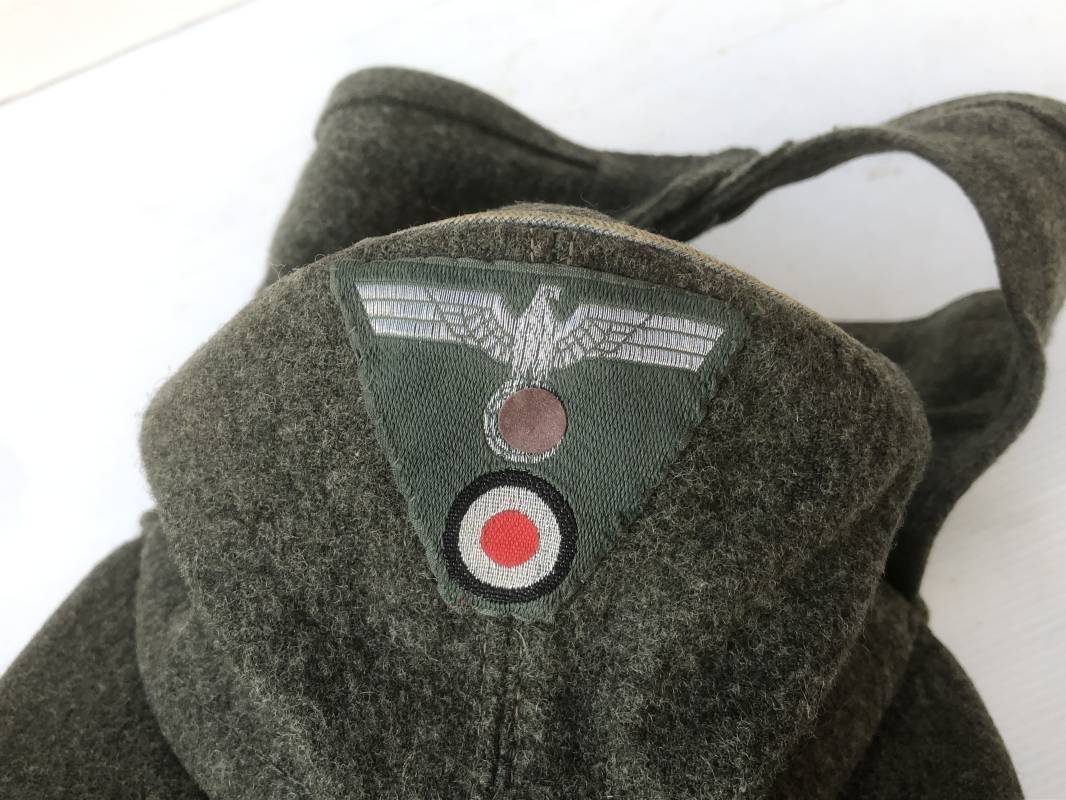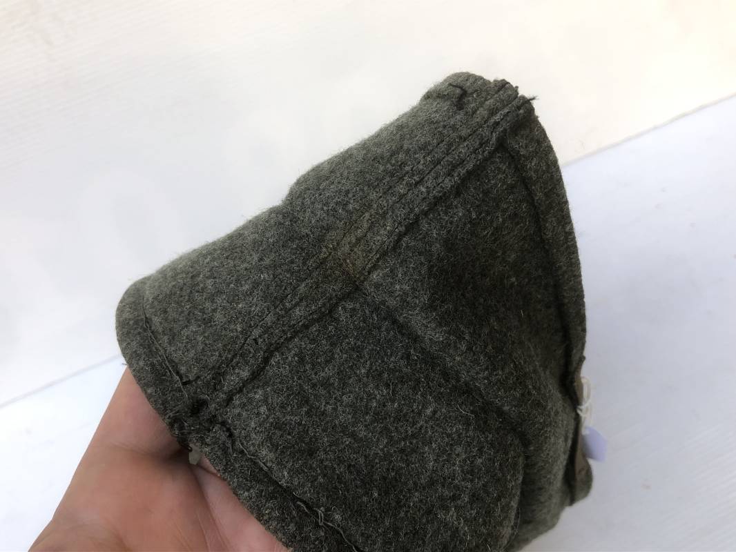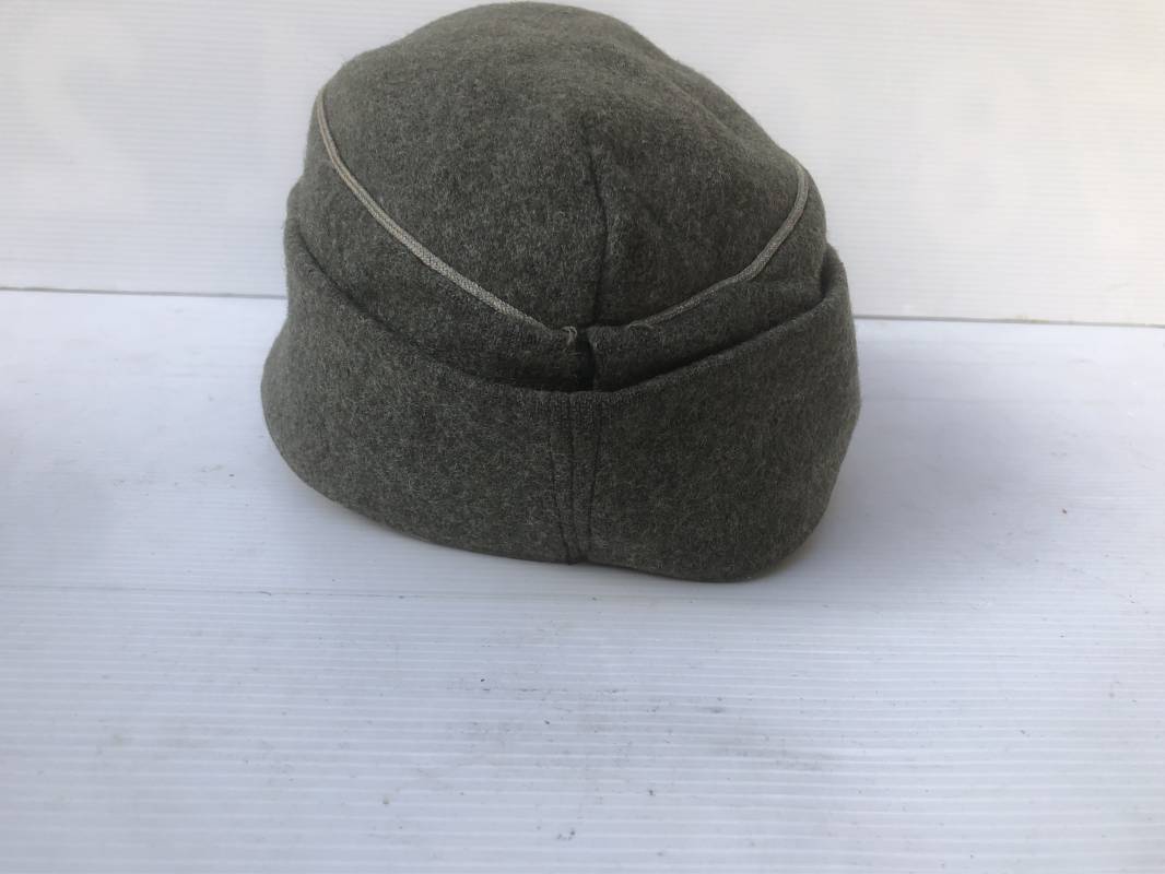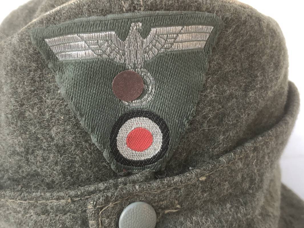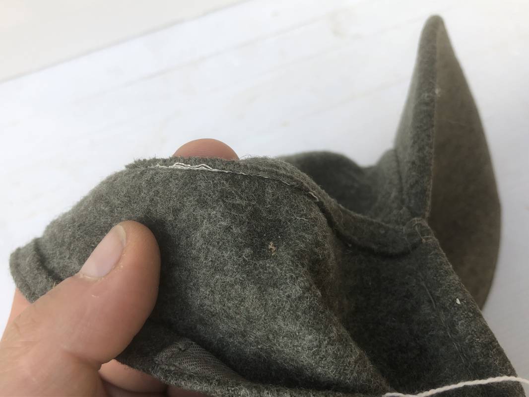 Rare casquette de dotation modéle 1943 d'un officier de la Heer . Casquette à visière réglementaire en drap feldgrau . Rabats en drap et deux boutons grenelés cousus sur le devant . Renforts en satinette dans les bordures du rabat . Insigne triangulaire modele 1943 du modéle officier avec aigle et cocarde tissés en fil d'aluminium , . Liseré argent sur le pourtour du modéle toute arme pour officier . Intérieur entièrement doublé en coton gris . Marquage encre noir Taille 58 . , bandeau intérieur en cuir glacé marron demi lune cousu sur le devant mais dont une grande partie est manquante ( voir photos ) Casquette légérement portée en parfait état . Rare casquette trouvée dans une famille en Allemagne 100% nature et totalement intouchée . Rare coiffure modéle 1943 d'un officier de la Heer . Ref 19486