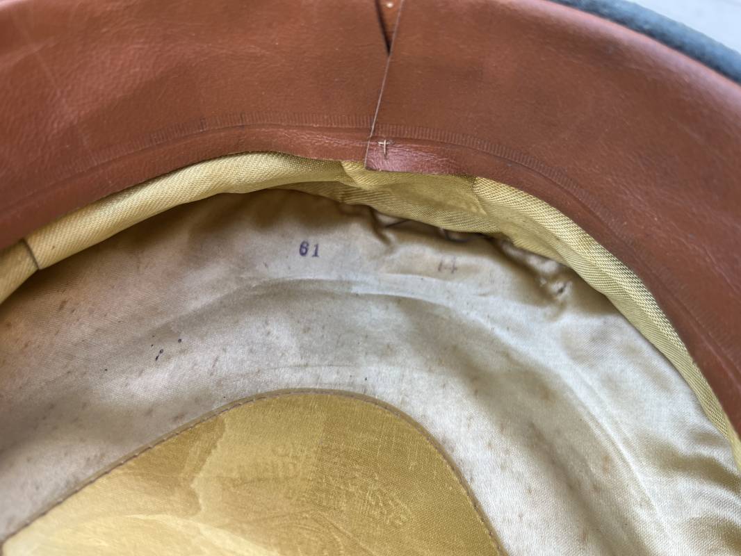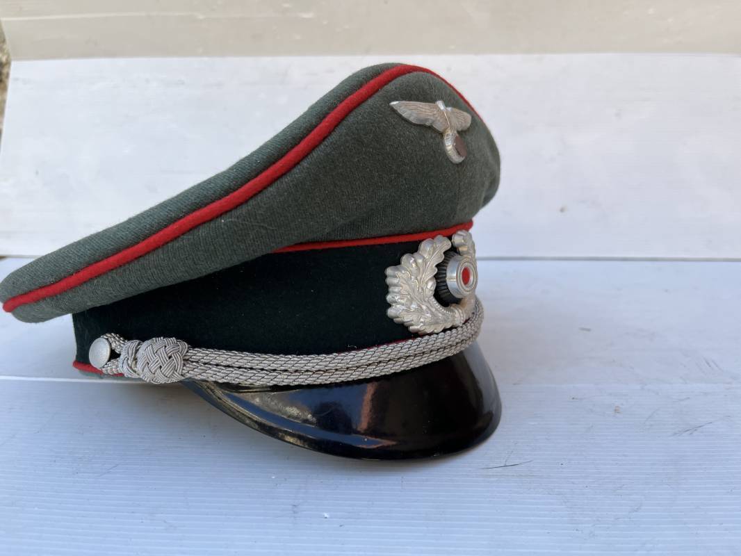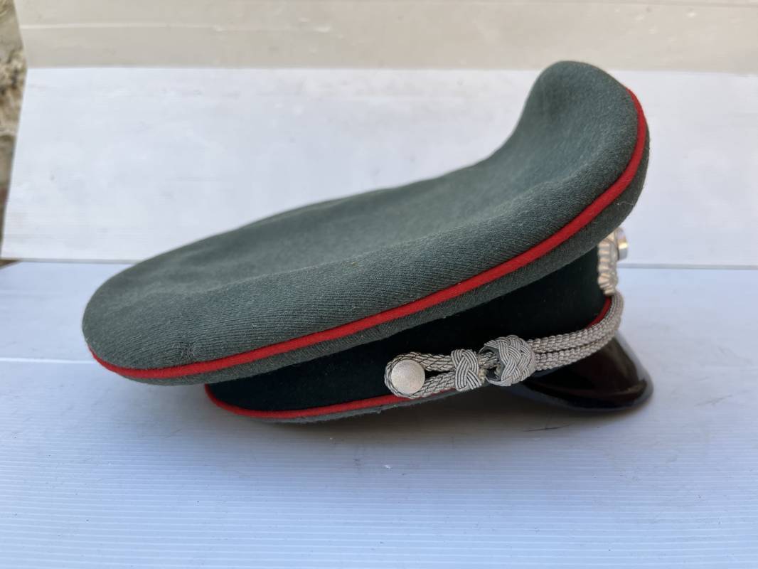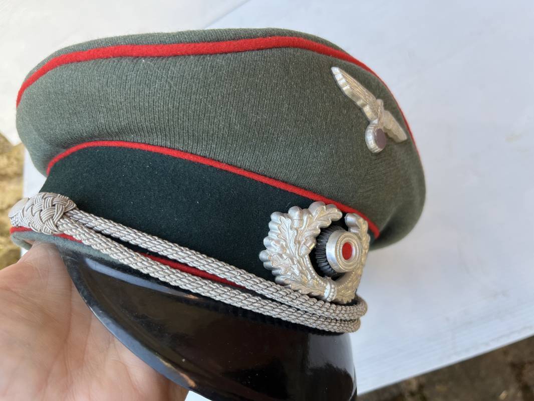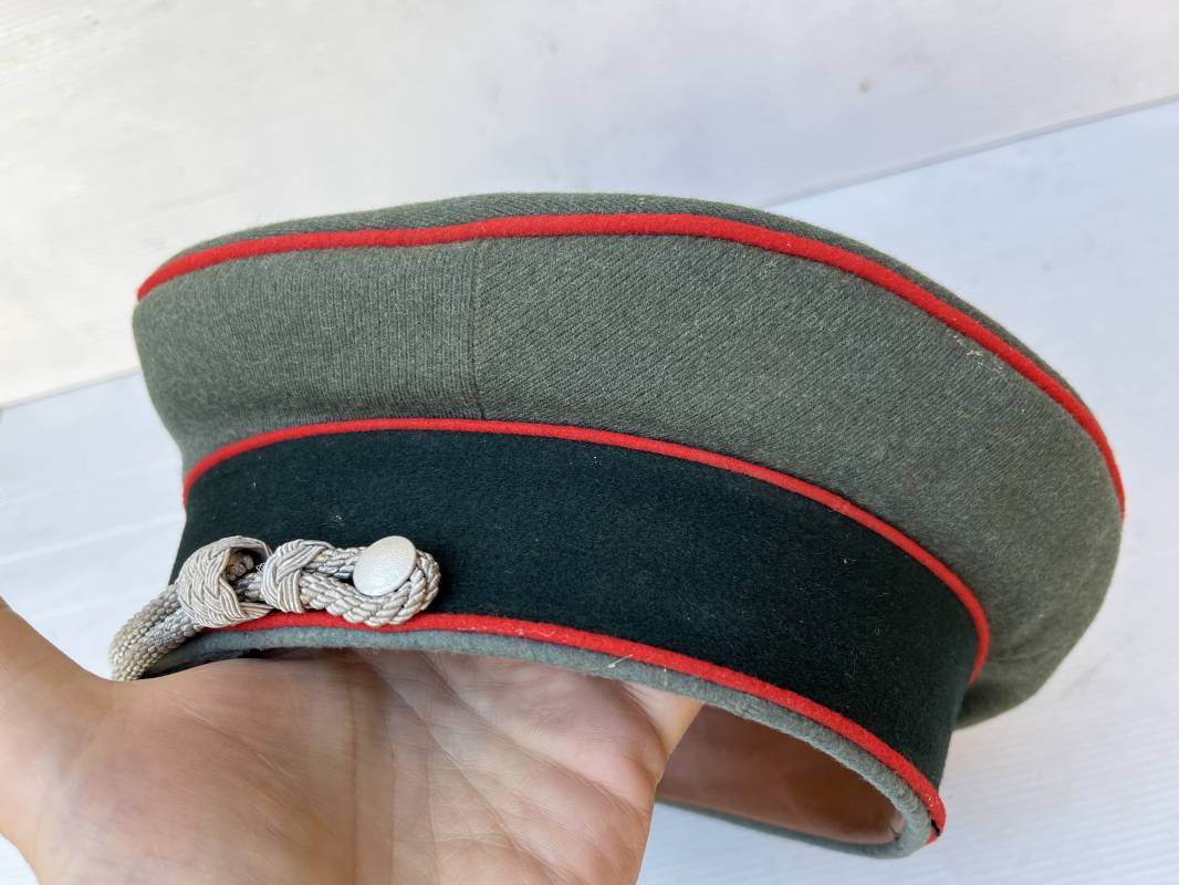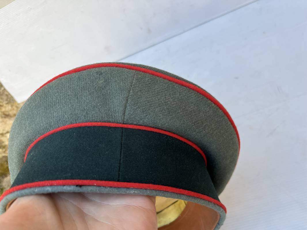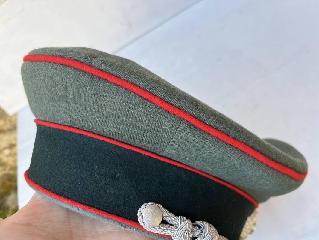 Trés belle casquette d'un officier de l'artillerie de la Heer , fabricant Erel 1943/44 . Casquette en gabardine fine feldgrau. Bandeau de coiffe en drap vert foncé. Insignes aigle et cocarde en alu . Liseré rouge de l'artillerie . Jugulaire torsadée d'officier en canetille argent . Visière en fibre vulcanisée noire, revers lisse noire . Belle forme ' Sattel Form' . Parfait état. Intèrieur doublé en satinette dorée. Rhodoid avec marquage fabricant Erel ' Offizier Kleiderklasse Erel Berlin Sonderklasse Extra ' .. Bandeau de coiffe intèrieur en cuir fauve. Taille 60 . Casquette du célébre fabricant Erel confectIon 1943/44 en superbe état Casquette définitive en collection . Ref 19855