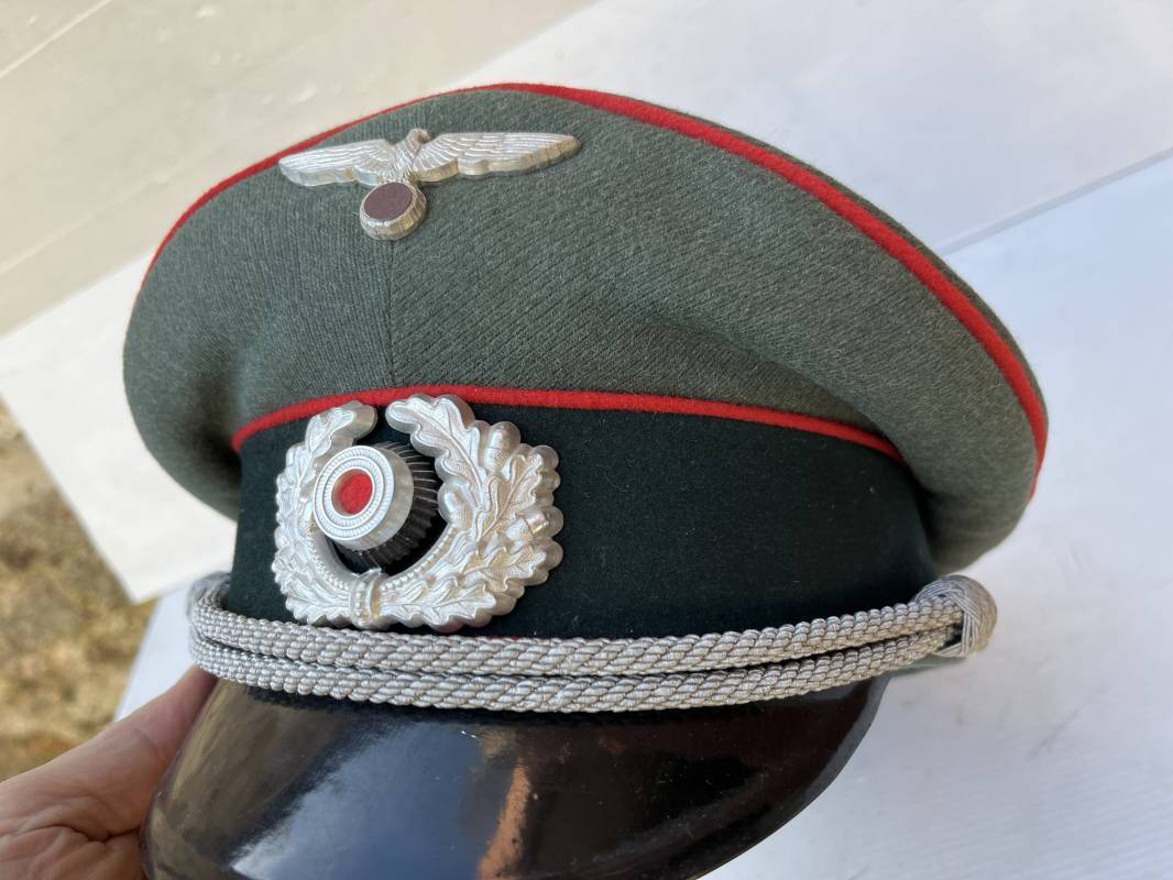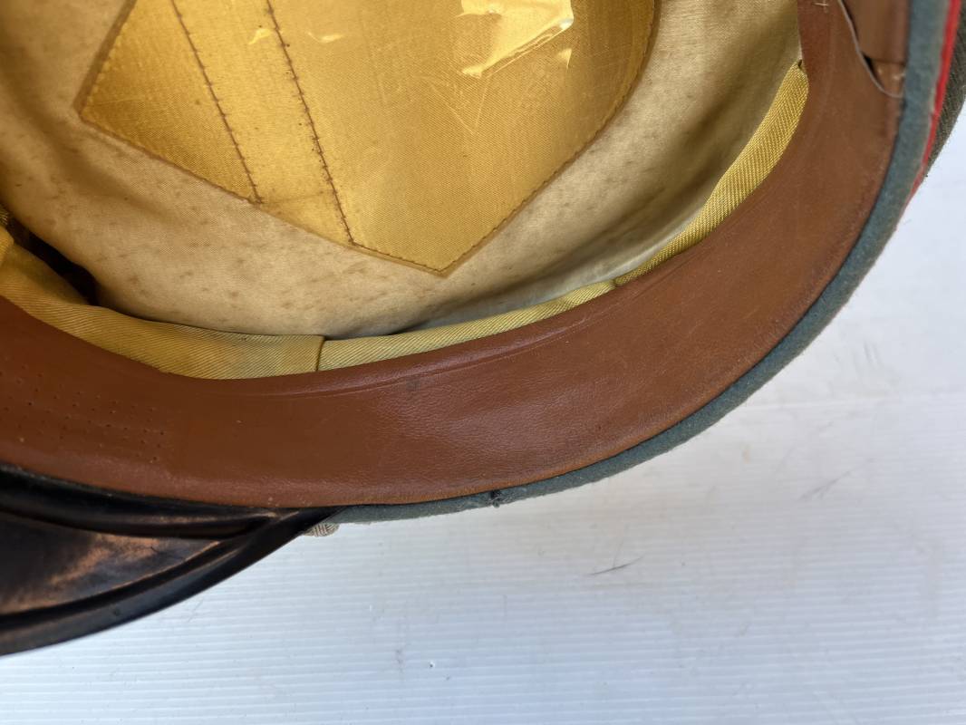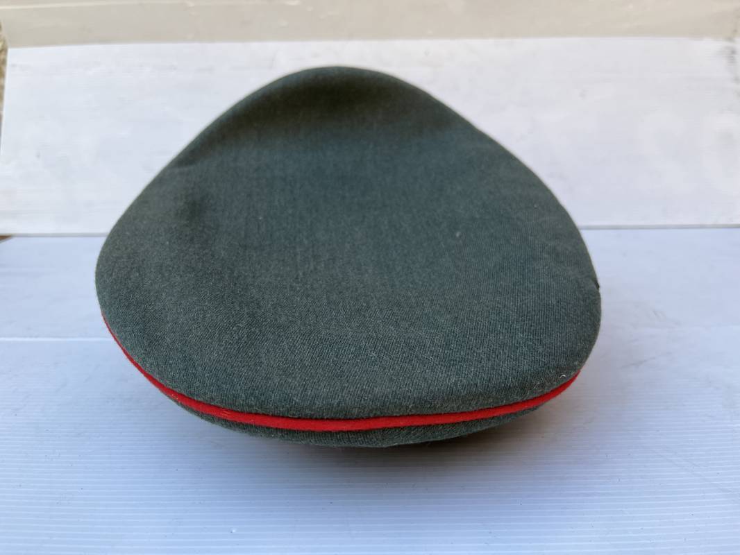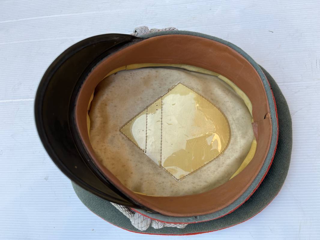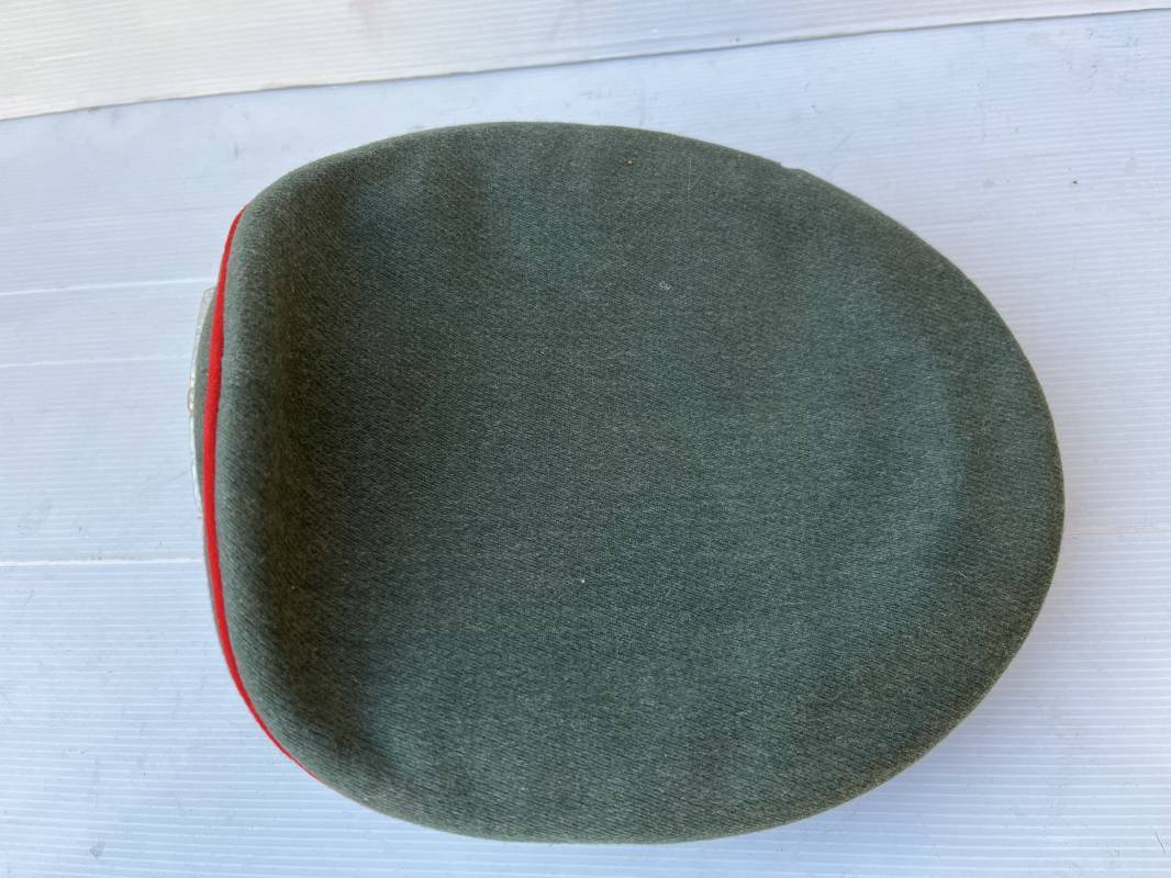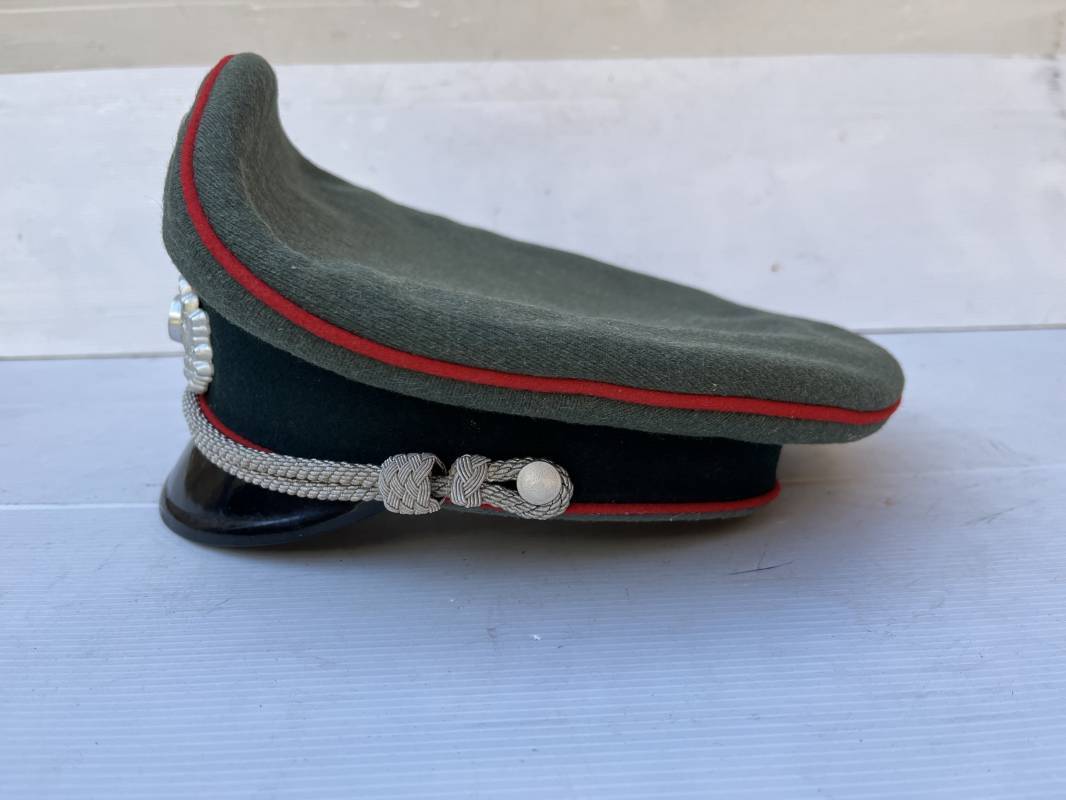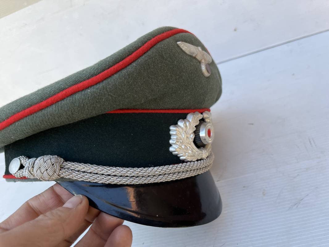 Trés belle casquette d'un officier de l'artillerie de la Heer , fabricant Erel 1943/44 . Casquette en gabardine fine feldgrau. Bandeau de coiffe en drap vert foncé. Insignes aigle et cocarde en alu . Liseré rouge de l'artillerie . Jugulaire torsadée d'officier en canetille argent . Visière en fibre vulcanisée noire, revers lisse noire . Belle forme ' Sattel Form' . Parfait état. Intèrieur doublé en satinette dorée. Rhodoid avec marquage fabricant Erel ' Offizier Kleiderklasse Erel Berlin Sonderklasse Extra ' .. Bandeau de coiffe intèrieur en cuir fauve. Taille 60 . Casquette du célébre fabricant Erel confectIon 1943/44 en superbe état Casquette définitive en collection . Ref 19855