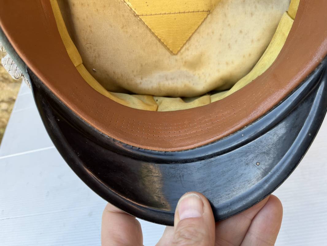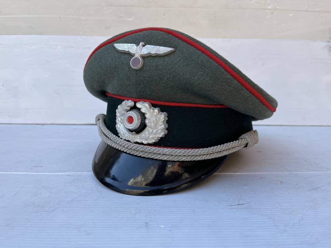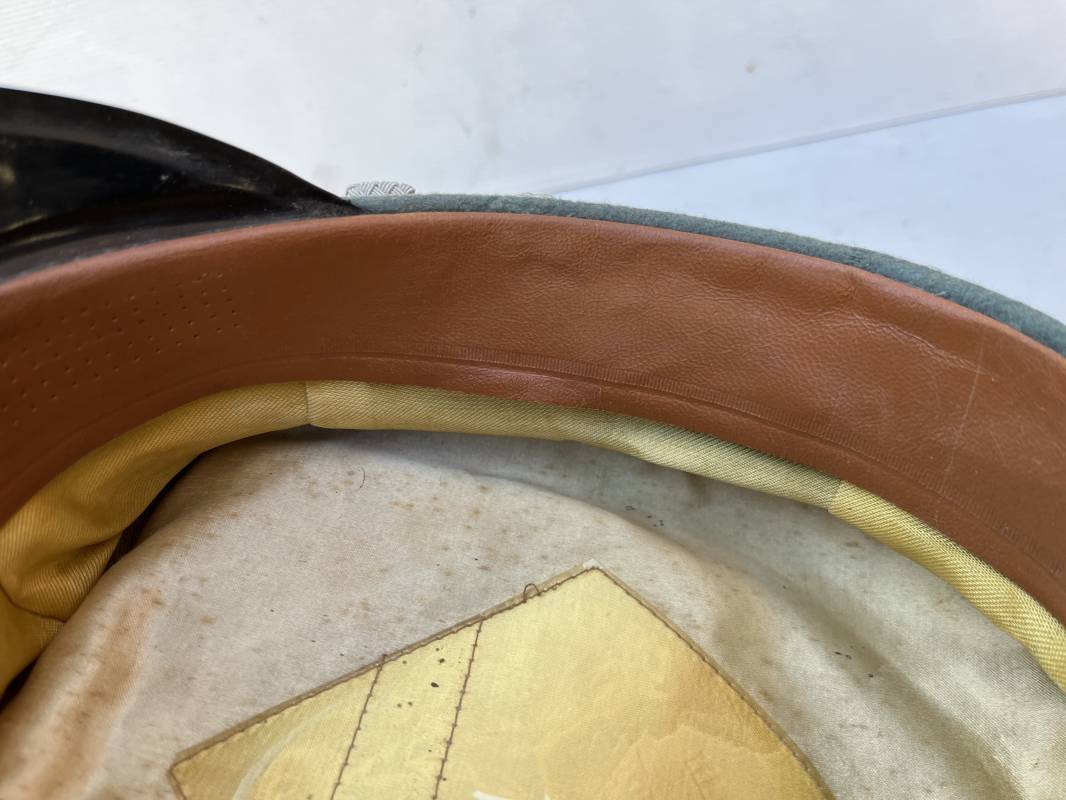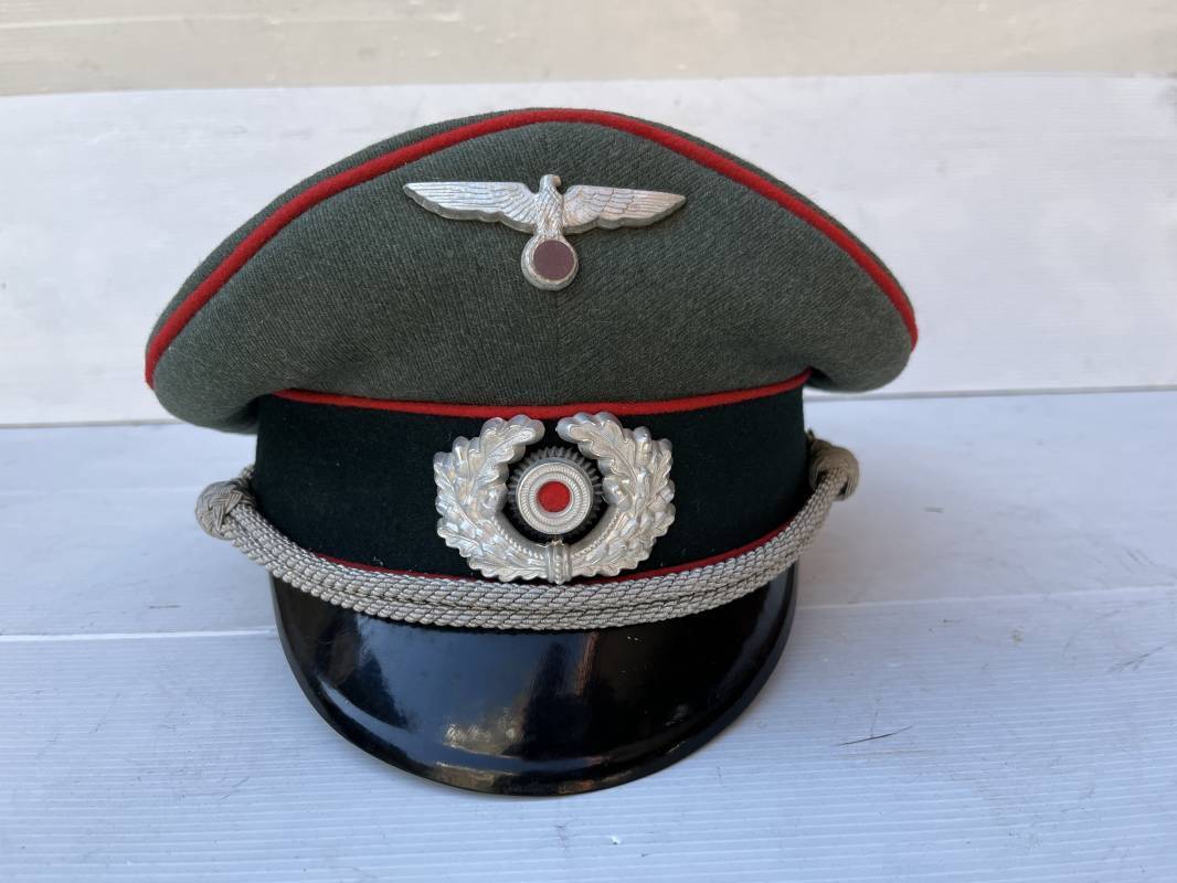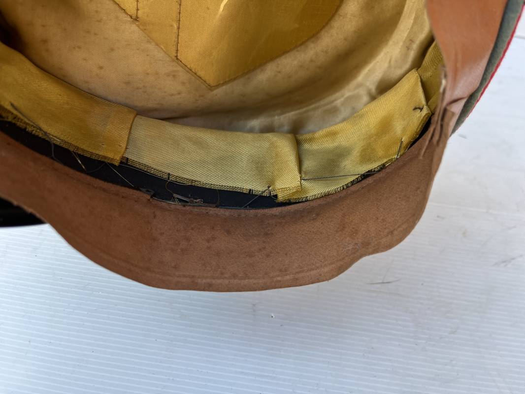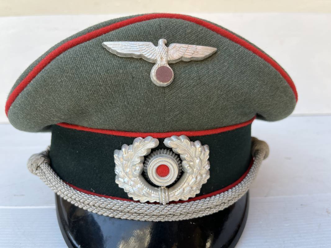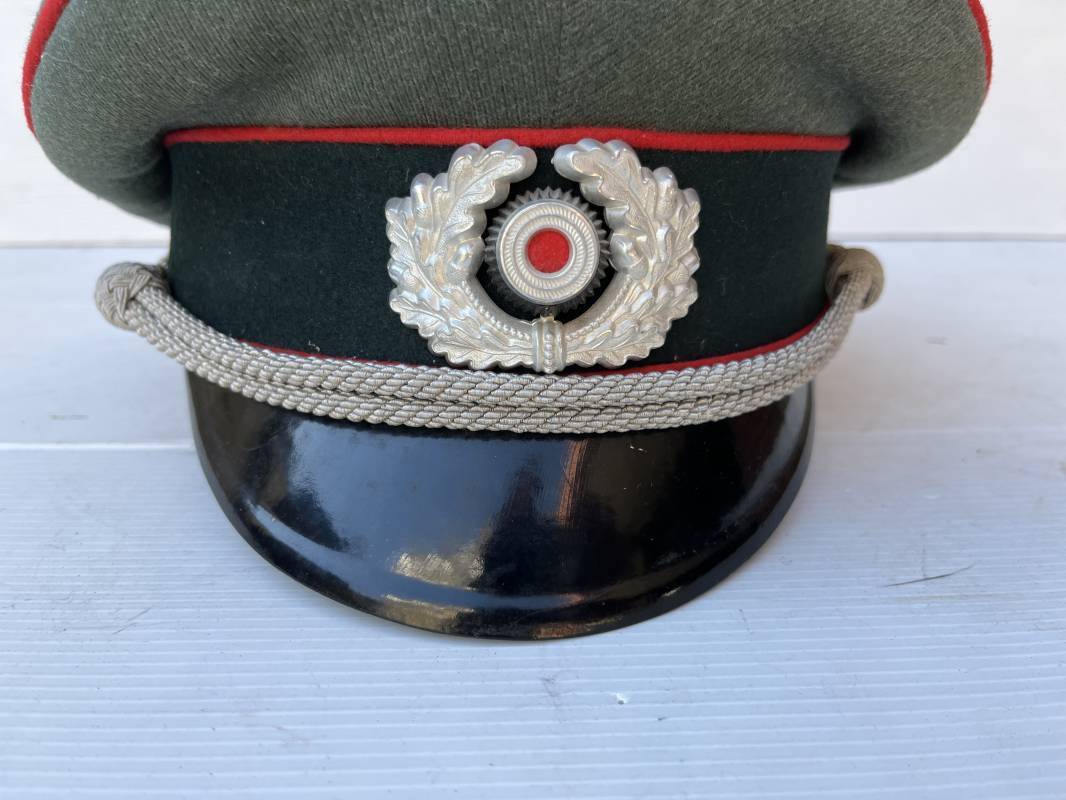 Trés belle casquette d'un officier de l'artillerie de la Heer , fabricant Erel 1943/44 . Casquette en gabardine fine feldgrau. Bandeau de coiffe en drap vert foncé. Insignes aigle et cocarde en alu . Liseré rouge de l'artillerie . Jugulaire torsadée d'officier en canetille argent . Visière en fibre vulcanisée noire, revers lisse noire . Belle forme ' Sattel Form' . Parfait état. Intèrieur doublé en satinette dorée. Rhodoid avec marquage fabricant Erel ' Offizier Kleiderklasse Erel Berlin Sonderklasse Extra ' .. Bandeau de coiffe intèrieur en cuir fauve. Taille 60 . Casquette du célébre fabricant Erel confectIon 1943/44 en superbe état Casquette définitive en collection . Ref 19855