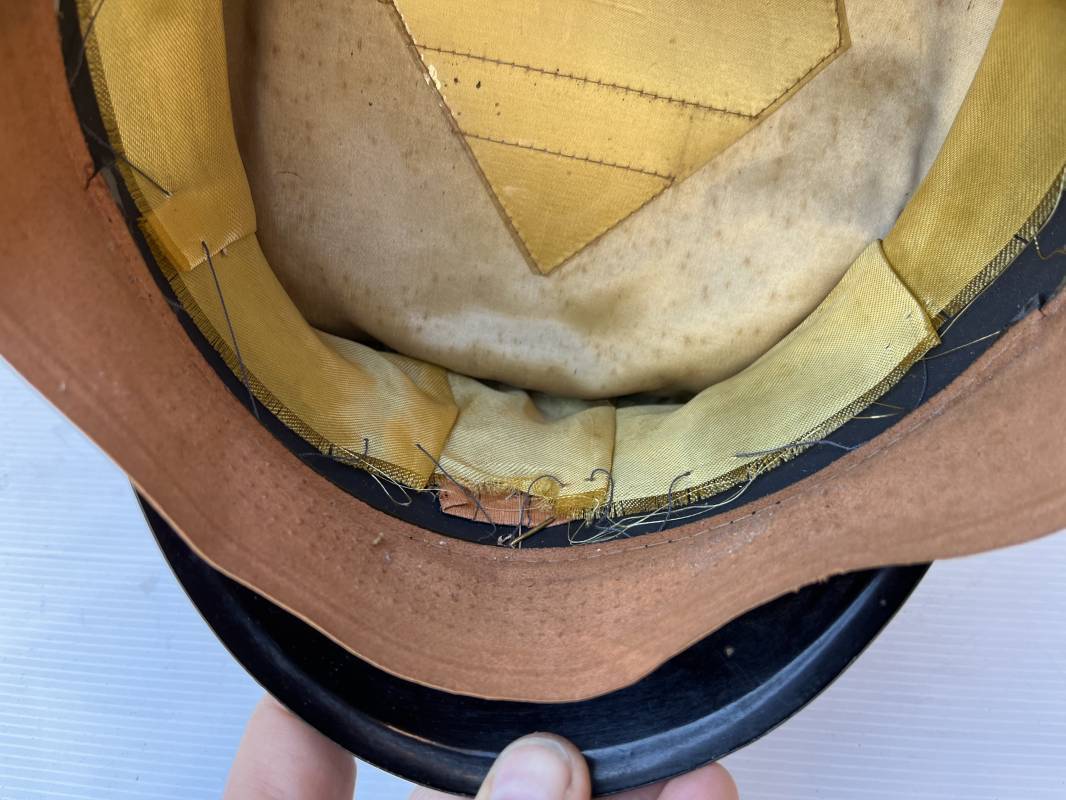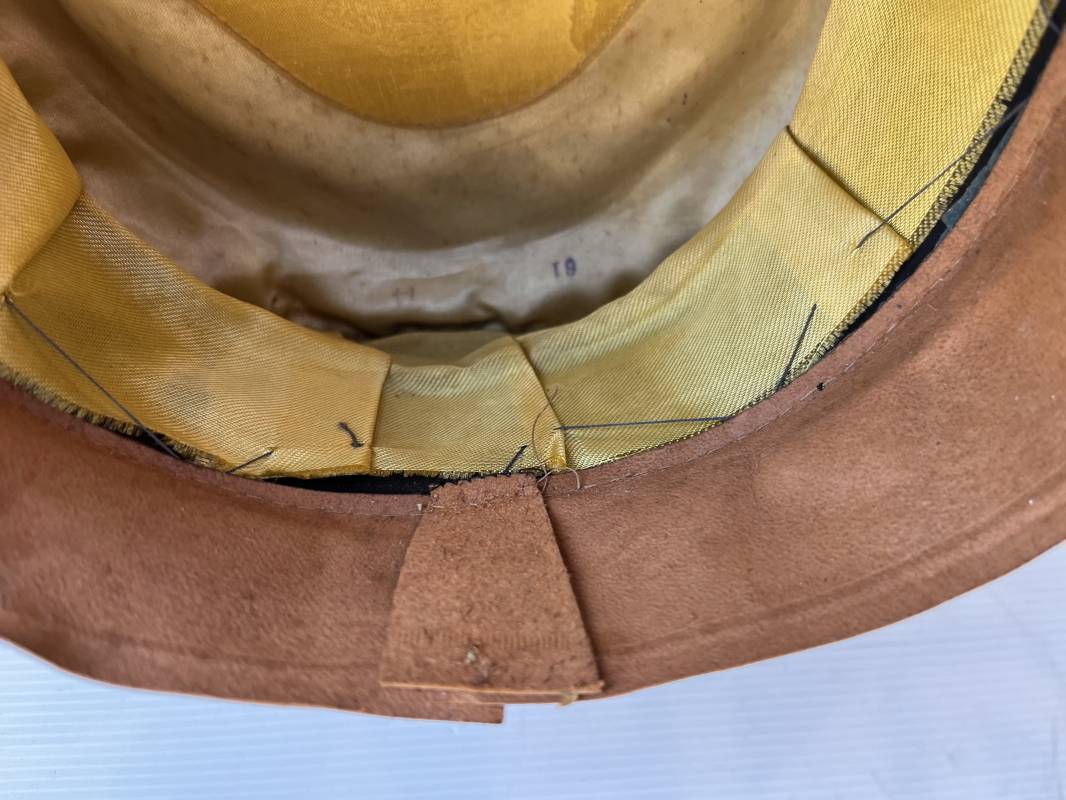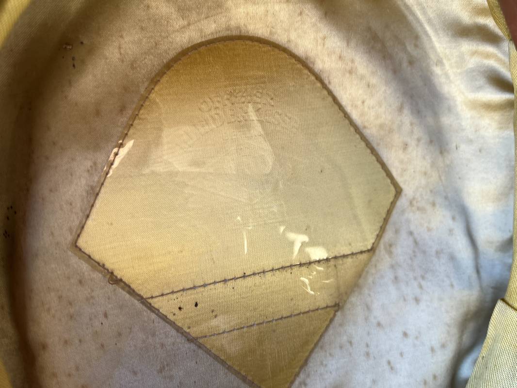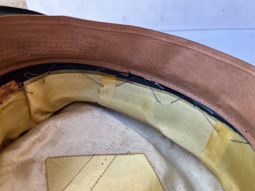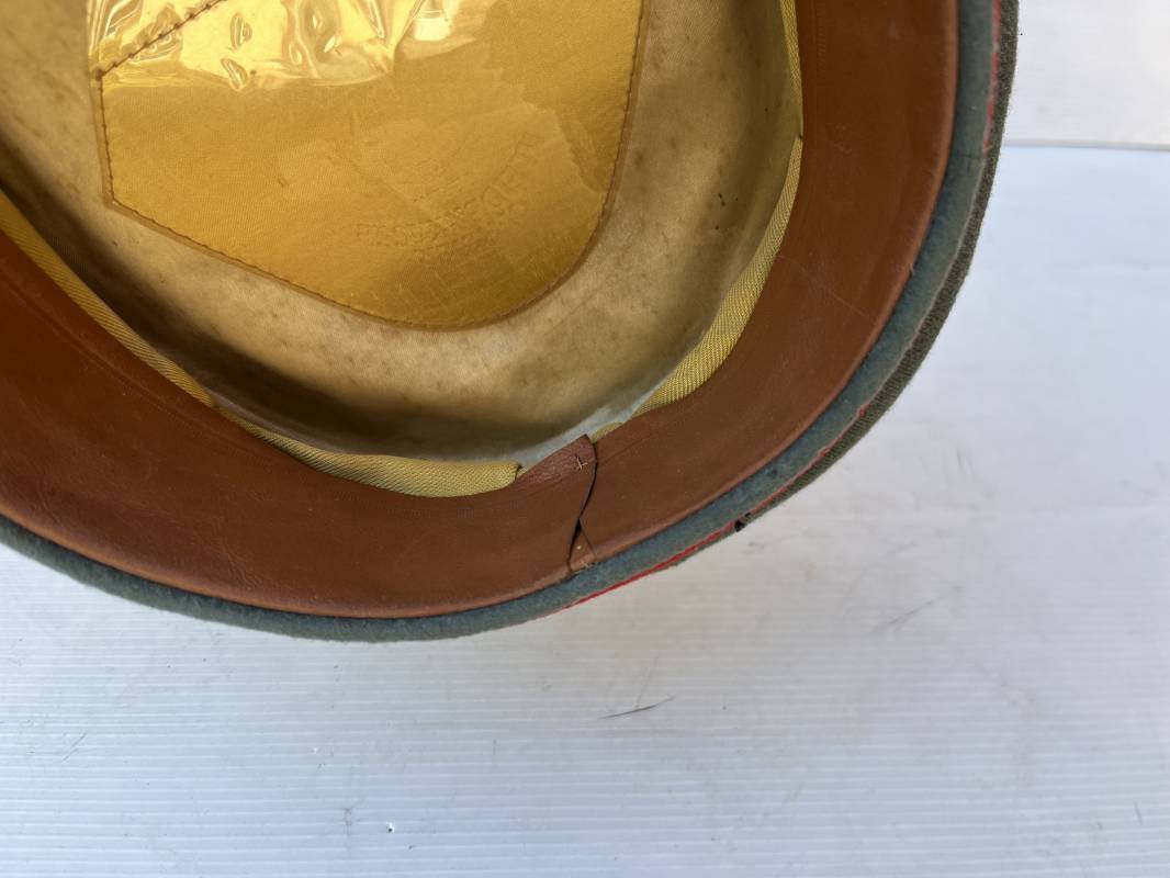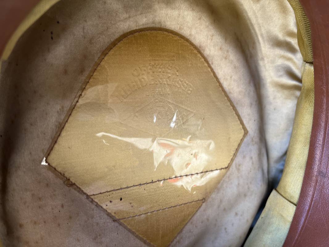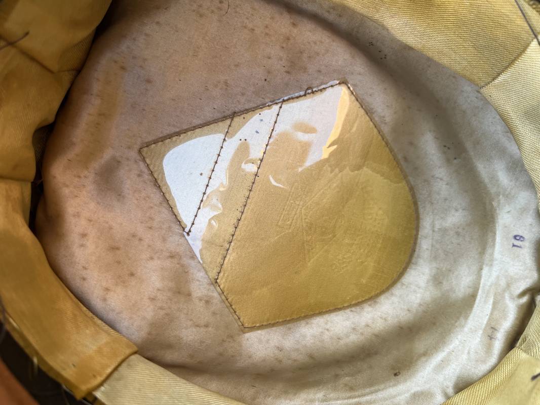 Trés belle casquette d'un officier de l'artillerie de la Heer , fabricant Erel 1943/44 . Casquette en gabardine fine feldgrau. Bandeau de coiffe en drap vert foncé. Insignes aigle et cocarde en alu . Liseré rouge de l'artillerie . Jugulaire torsadée d'officier en canetille argent . Visière en fibre vulcanisée noire, revers lisse noire . Belle forme ' Sattel Form' . Parfait état. Intèrieur doublé en satinette dorée. Rhodoid avec marquage fabricant Erel ' Offizier Kleiderklasse Erel Berlin Sonderklasse Extra ' .. Bandeau de coiffe intèrieur en cuir fauve. Taille 60 . Casquette du célébre fabricant Erel confectIon 1943/44 en superbe état Casquette définitive en collection . Ref 19855