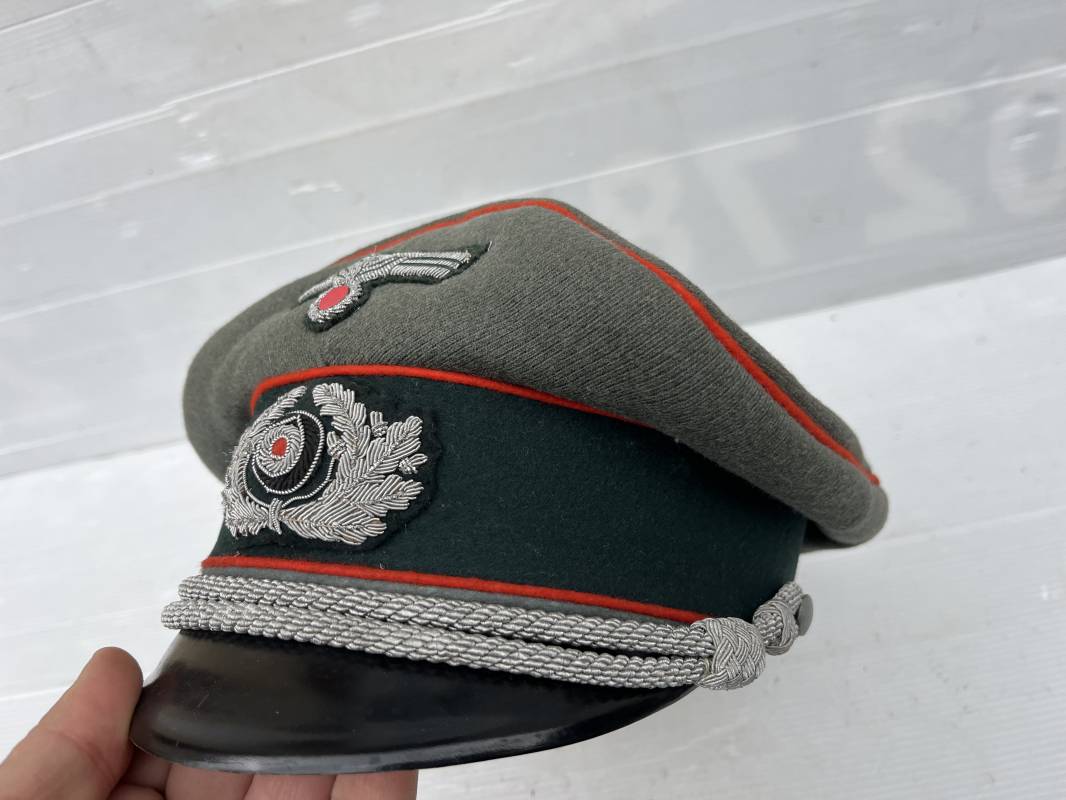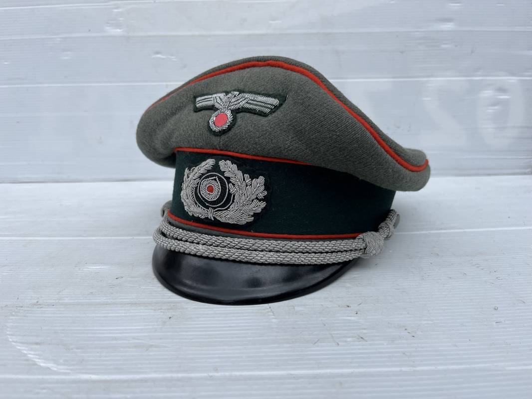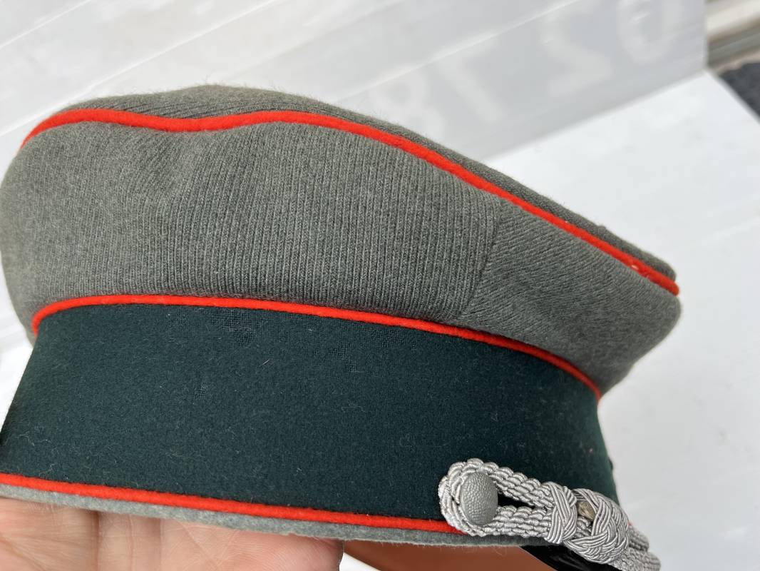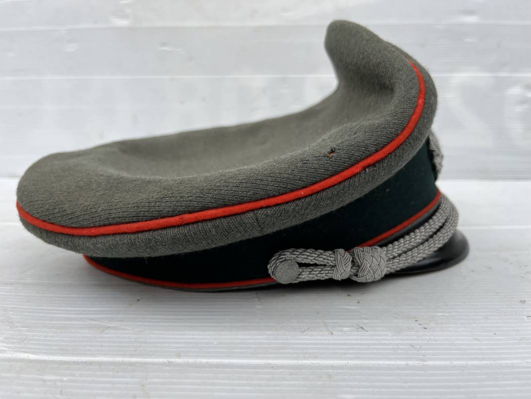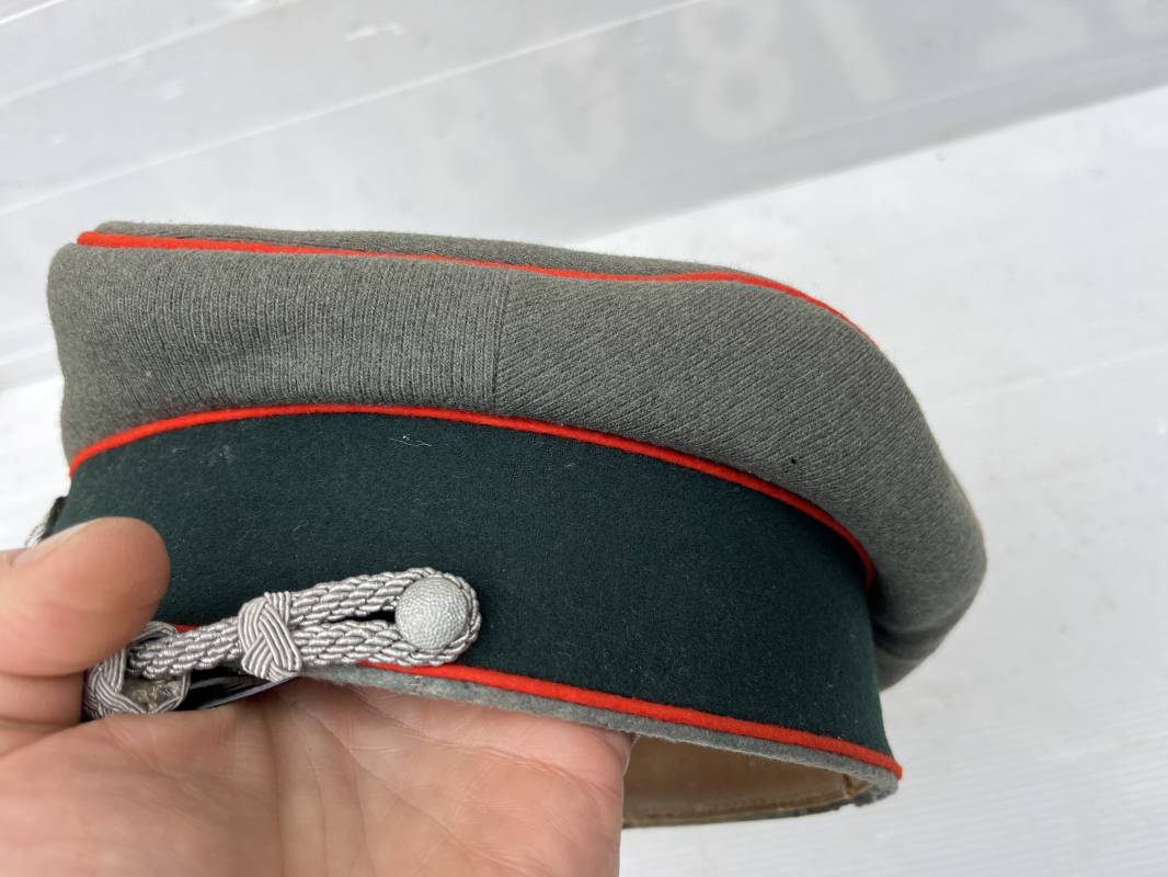 Trés belle casquette d'un officier de l artillerie de la Heer , fabricant Erel . Casquette en gabardine feldgrau. Bandeau de coiffe en drap vert foncé. Insignes aigle et cocarde brodés cannetille argent . Liseré rouge de l artillerie . Jugulaire torsadée d'officier en cannetille argent . Visière en fibre vulcanisée noire, revers guilloché brun . Belle forme fortement cassée ' Sattel Form' . Parfait état. Intèrieur doublé en satinette dorée. Large rhodoid avec marquage fabricant Erel Berlin Extra . Bandeau de coiffe intèrieur en cuir marron foncé marquage sur le bandeau intérieur Erel Patent , demi lune en drap sur le devant de la coiffe intérieure typique d echez Erel . Taille 58 . Casquette légèrement portée en tres bel état . Coiffure peu courante avec les insignes brodés cannetille .18628