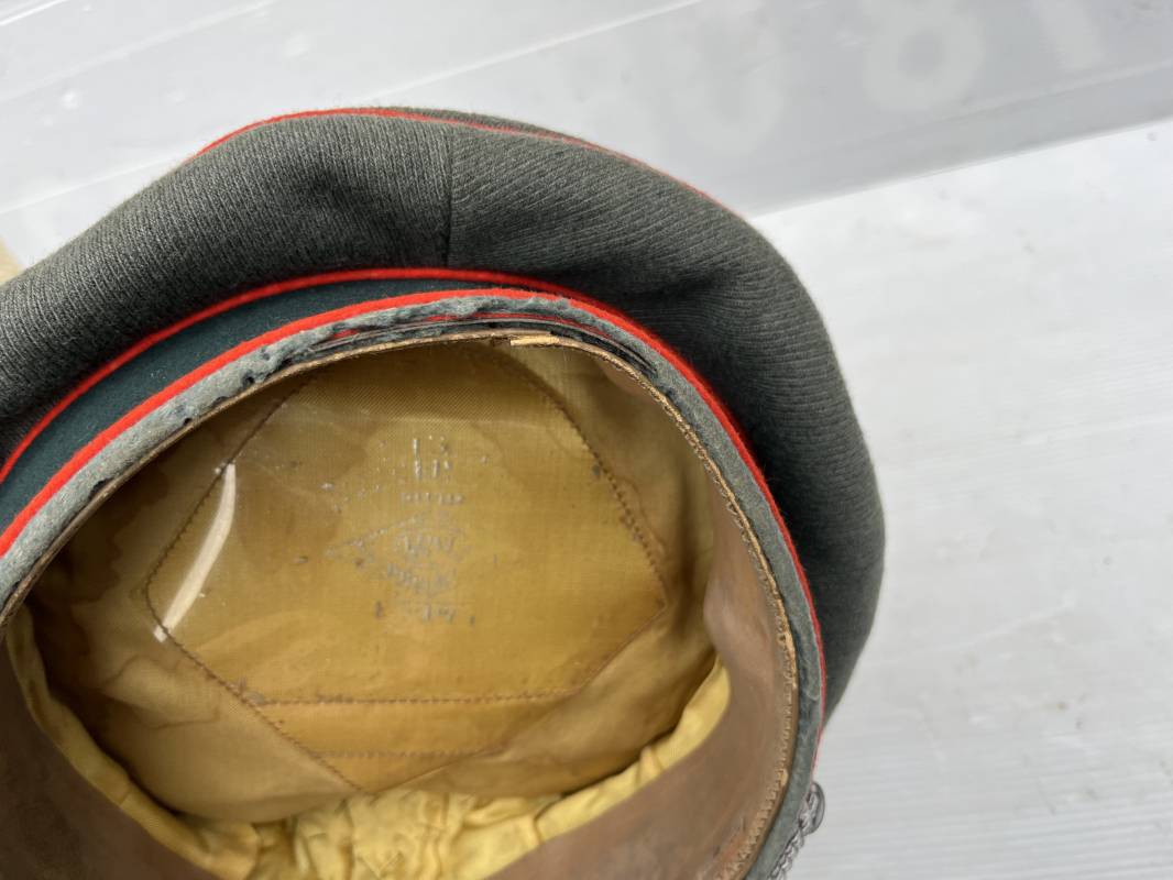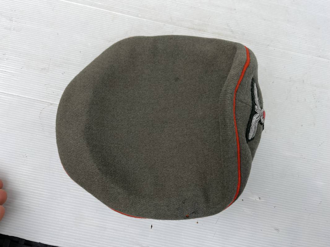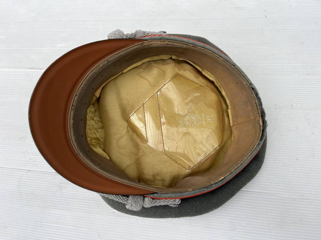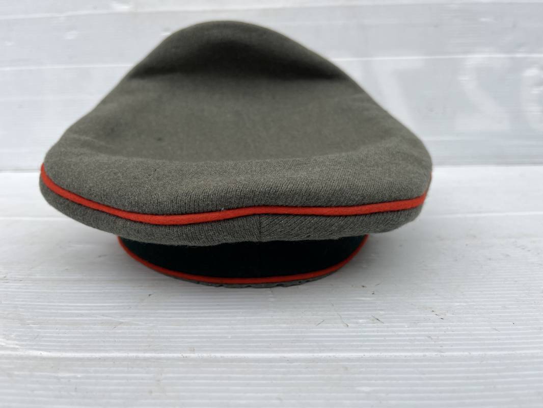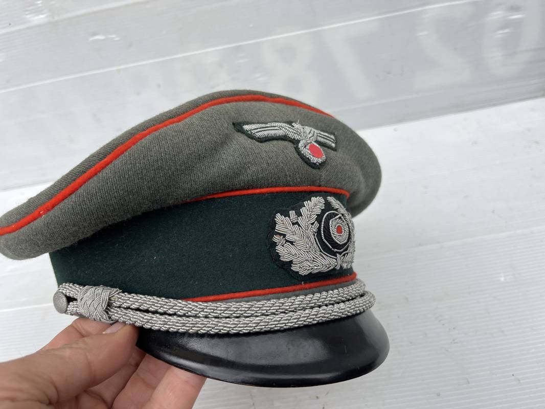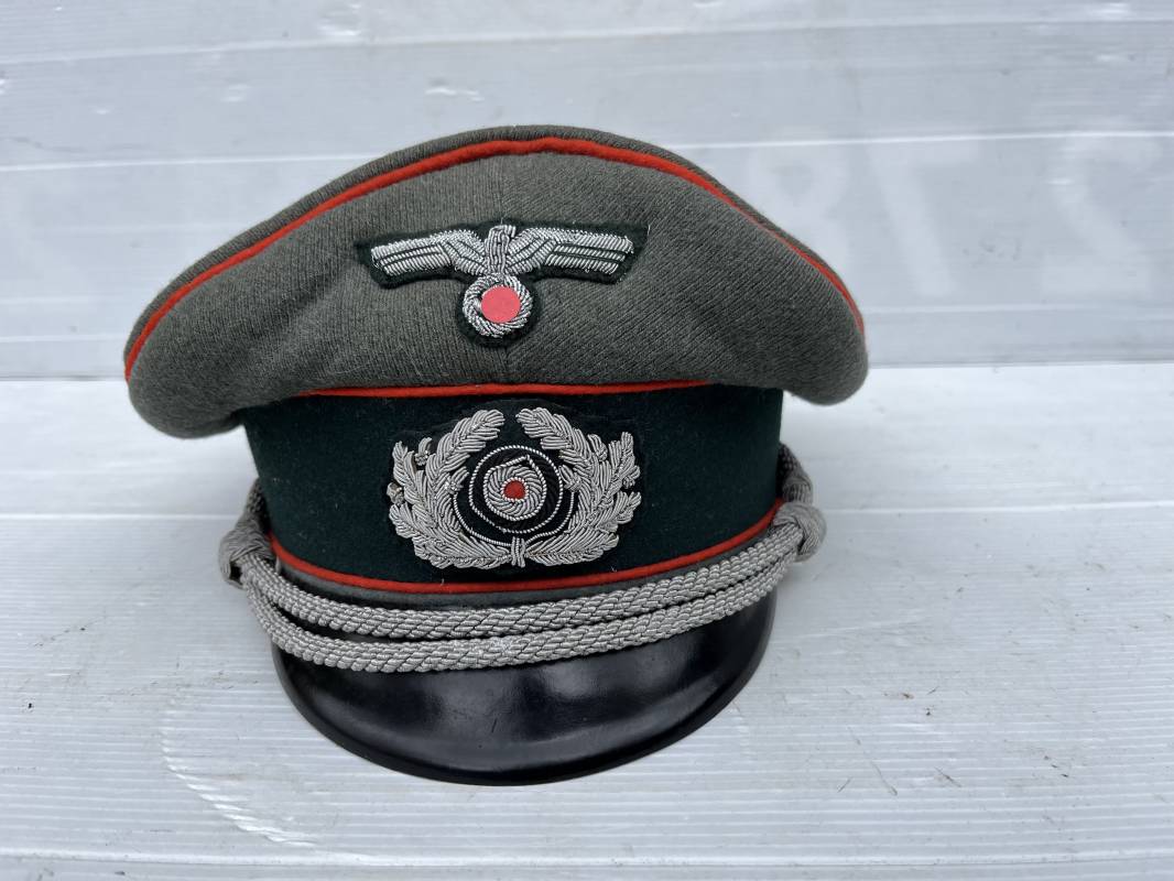 Trés belle casquette d'un officier de l artillerie de la Heer , fabricant Erel . Casquette en gabardine feldgrau. Bandeau de coiffe en drap vert foncé. Insignes aigle et cocarde brodés cannetille argent . Liseré rouge de l artillerie . Jugulaire torsadée d'officier en cannetille argent . Visière en fibre vulcanisée noire, revers guilloché brun . Belle forme fortement cassée ' Sattel Form' . Parfait état. Intèrieur doublé en satinette dorée. Large rhodoid avec marquage fabricant Erel Berlin Extra . Bandeau de coiffe intèrieur en cuir marron foncé marquage sur le bandeau intérieur Erel Patent , demi lune en drap sur le devant de la coiffe intérieure typique d echez Erel . Taille 58 . Casquette légèrement portée en tres bel état . Coiffure peu courante avec les insignes brodés cannetille .18628