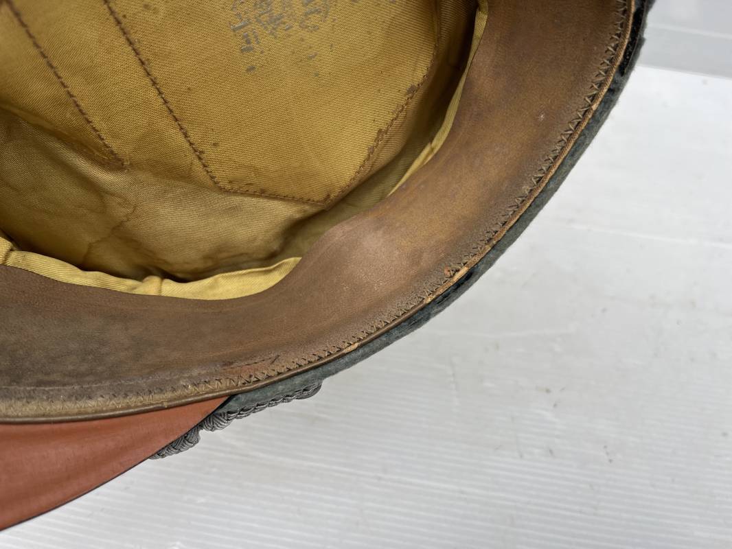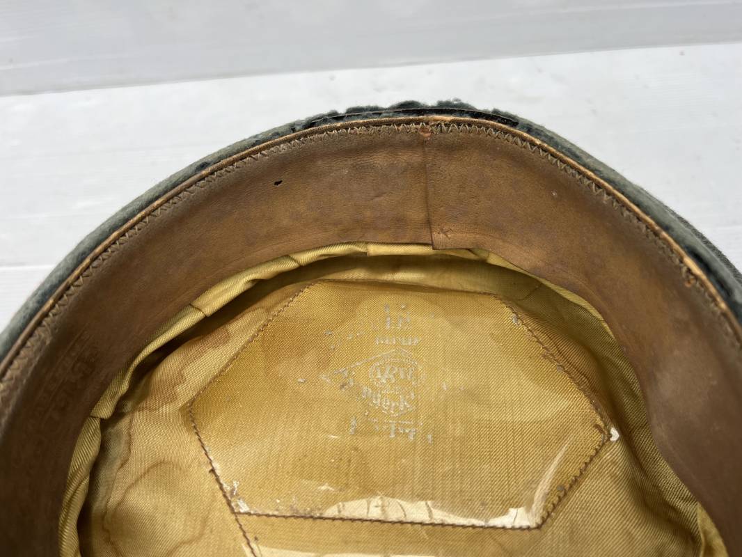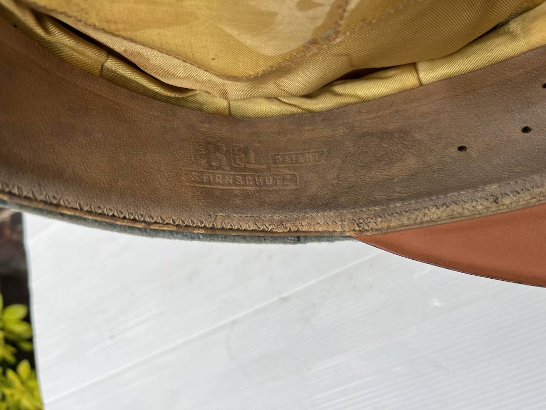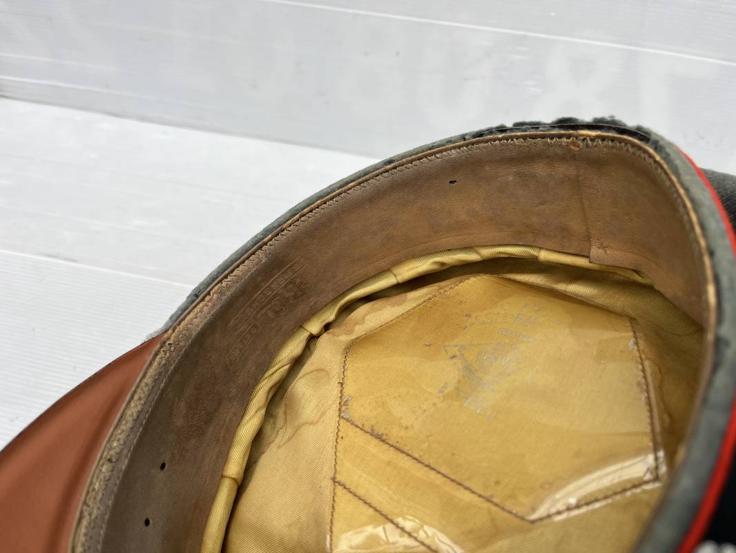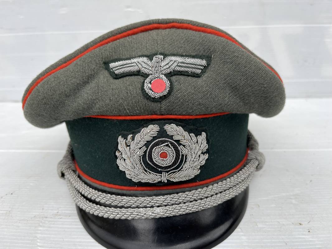Trés belle casquette d'un officier de l artillerie de la Heer , fabricant Erel . Casquette en gabardine feldgrau. Bandeau de coiffe en drap vert foncé. Insignes aigle et cocarde brodés cannetille argent . Liseré rouge de l artillerie . Jugulaire torsadée d'officier en cannetille argent . Visière en fibre vulcanisée noire, revers guilloché brun . Belle forme fortement cassée ' Sattel Form' . Parfait état. Intèrieur doublé en satinette dorée. Large rhodoid avec marquage fabricant Erel Berlin Extra . Bandeau de coiffe intèrieur en cuir marron foncé marquage sur le bandeau intérieur Erel Patent , demi lune en drap sur le devant de la coiffe intérieure typique d echez Erel . Taille 58 . Casquette légèrement portée en tres bel état . Coiffure peu courante avec les insignes brodés cannetille .18628