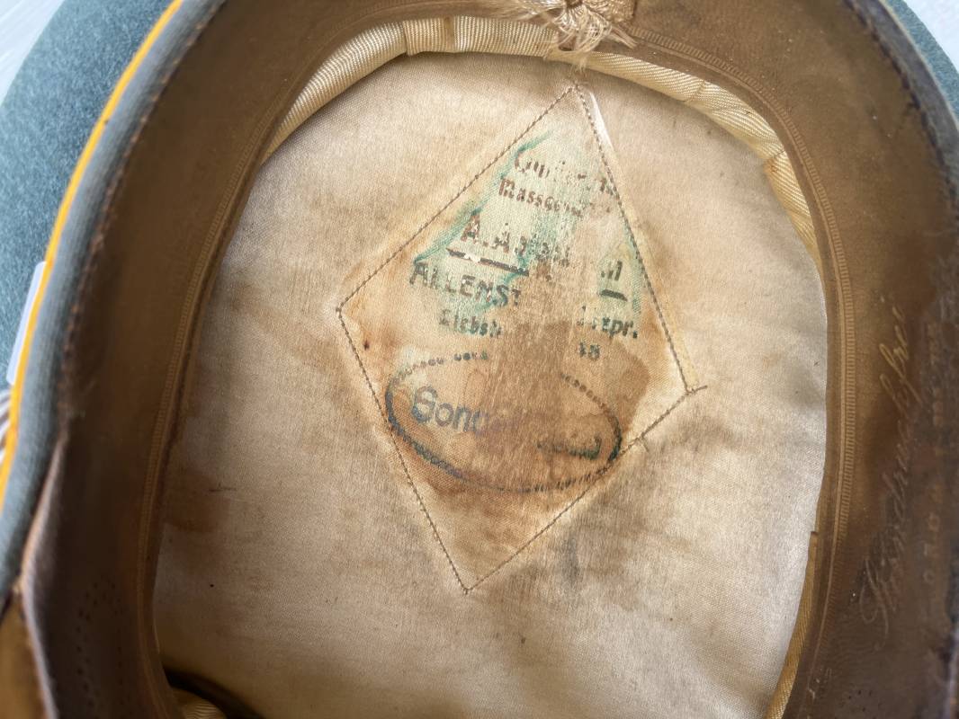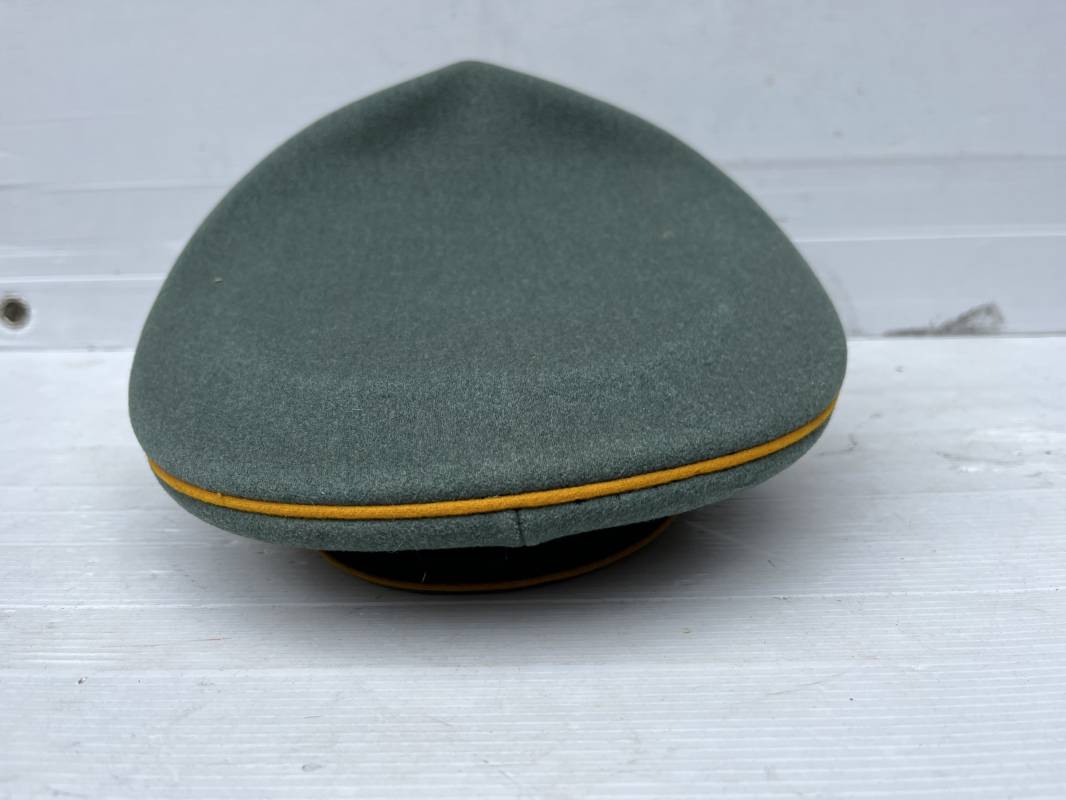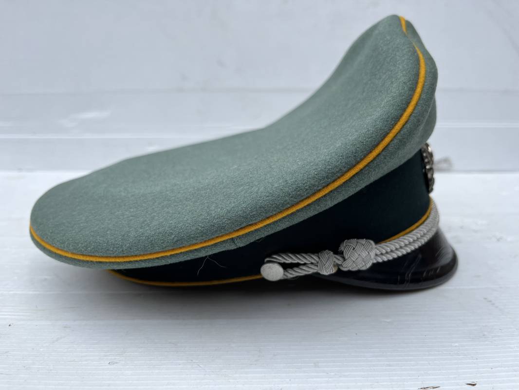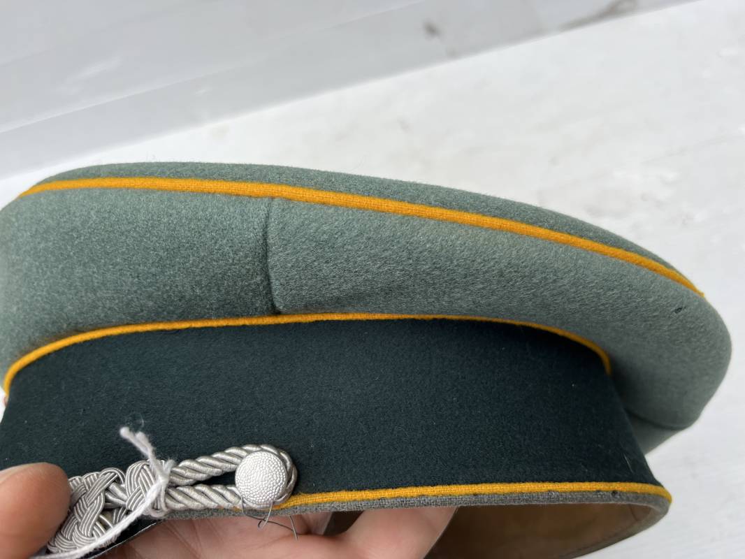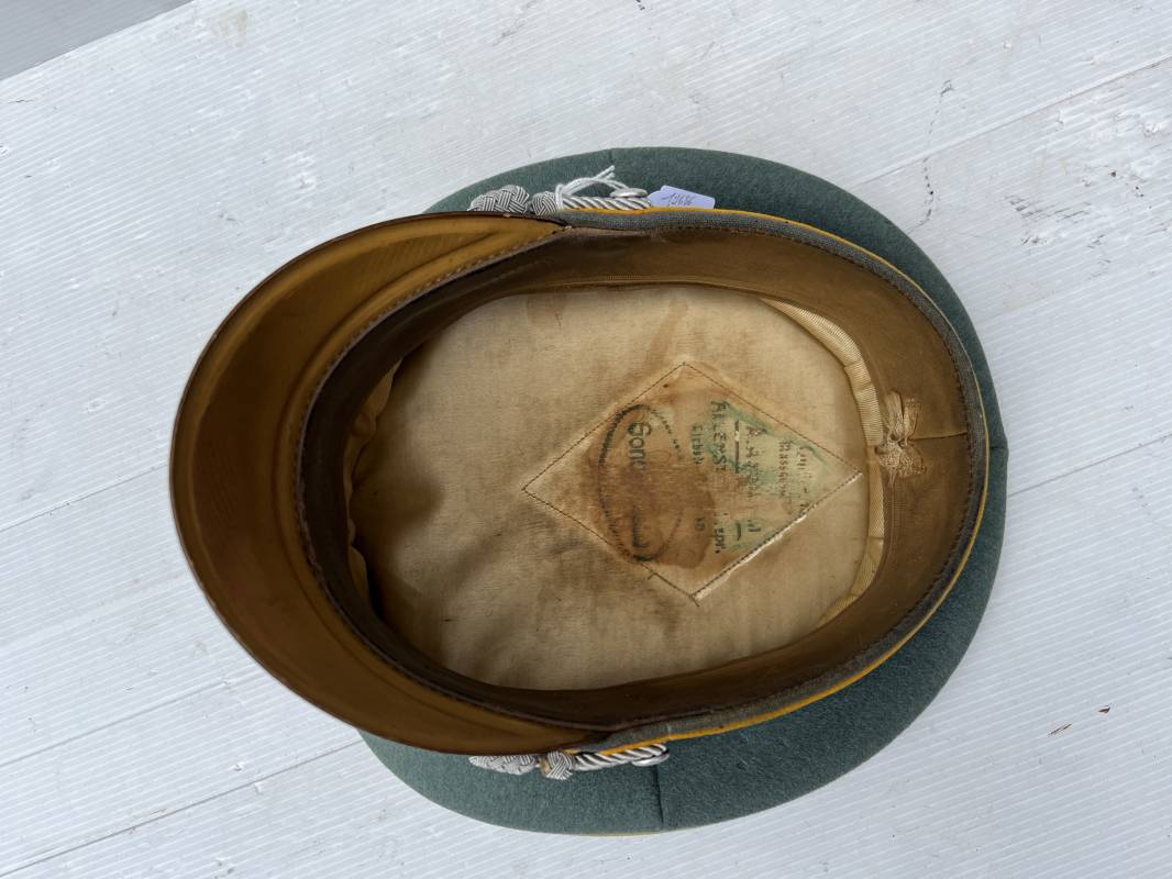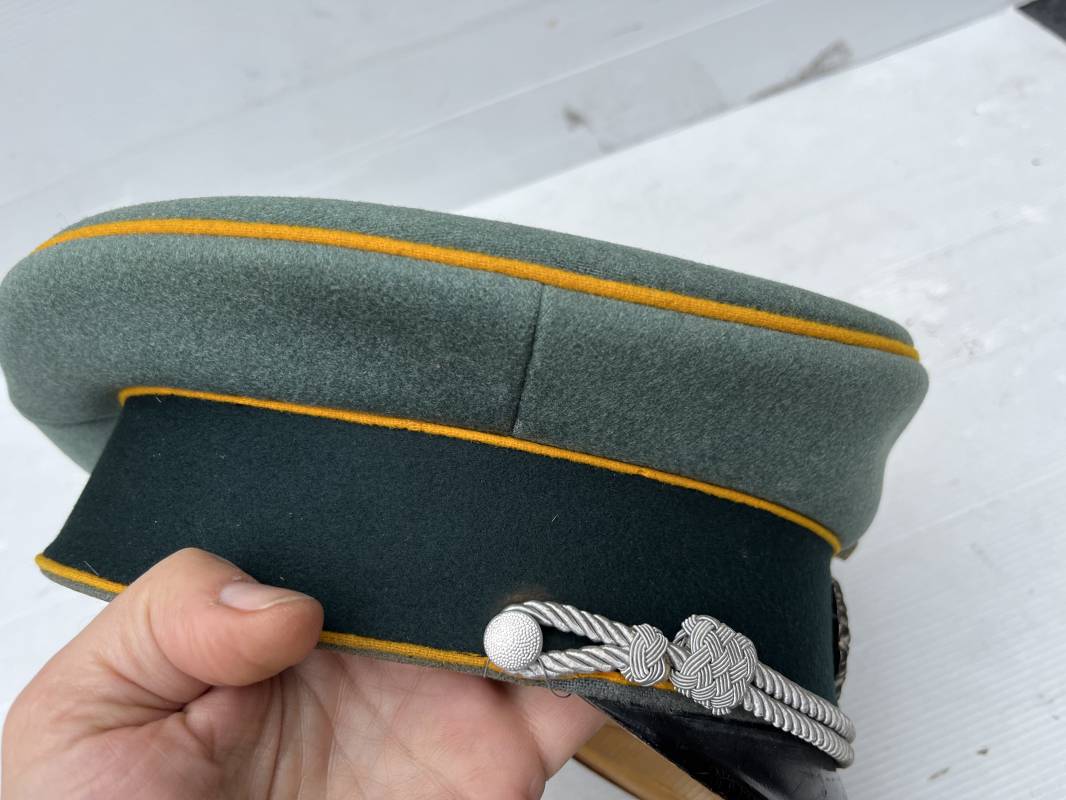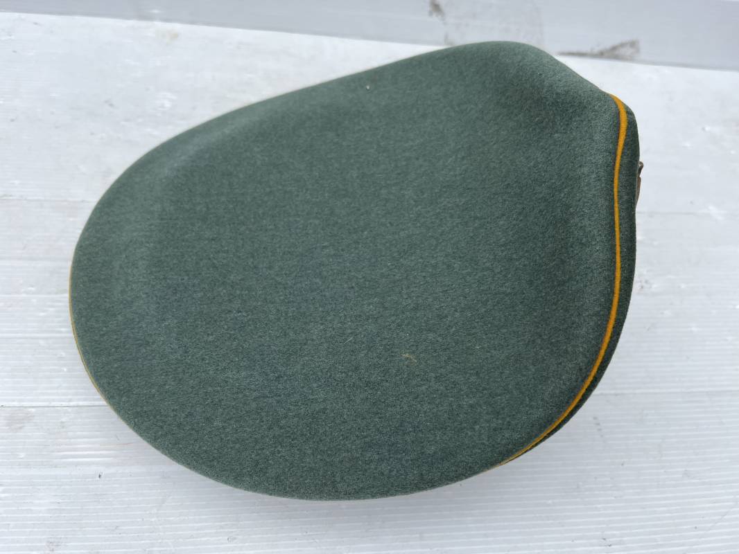Rare casquette d'un officier de la Heer , liseré jaune d'or de la cavalerie ou unité de reconnaissance blindée Casquette en drap fin feldgrau , bandeau de coiffe en drap vert foncé , jugulaire d'officier , visière en fibre noire vulcanisée , revers guilloché brun .Rares Insignes métallique patine vieille argent aigle et cocarde . Belle forme ( sattel form ) . Inérieur doublé en satinette dorée, rhodoid manquant marquage fabricant en fond de coiffe ' SonderKlasse ' , bandeau de coiffe intérieur en cuir marron , marquage ' Stirndruckfrei DRGM' . Taille 561/2 Marquage d'affectation régimentaire sous le bandeau Geprutt 2/Kav Rgt 4 ( 2éme Escadron du 4éme régiment de cavalerie ) Casquette portée en bel état . Trés belle patine générale . Ref 19686