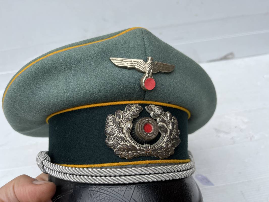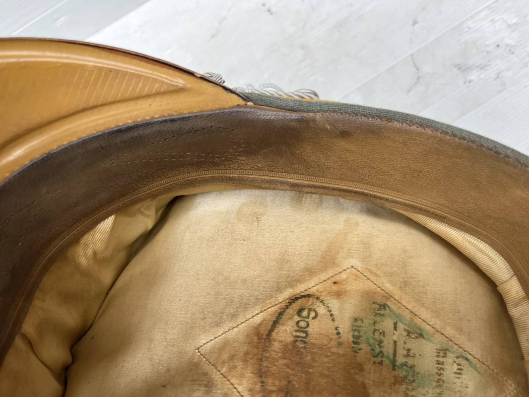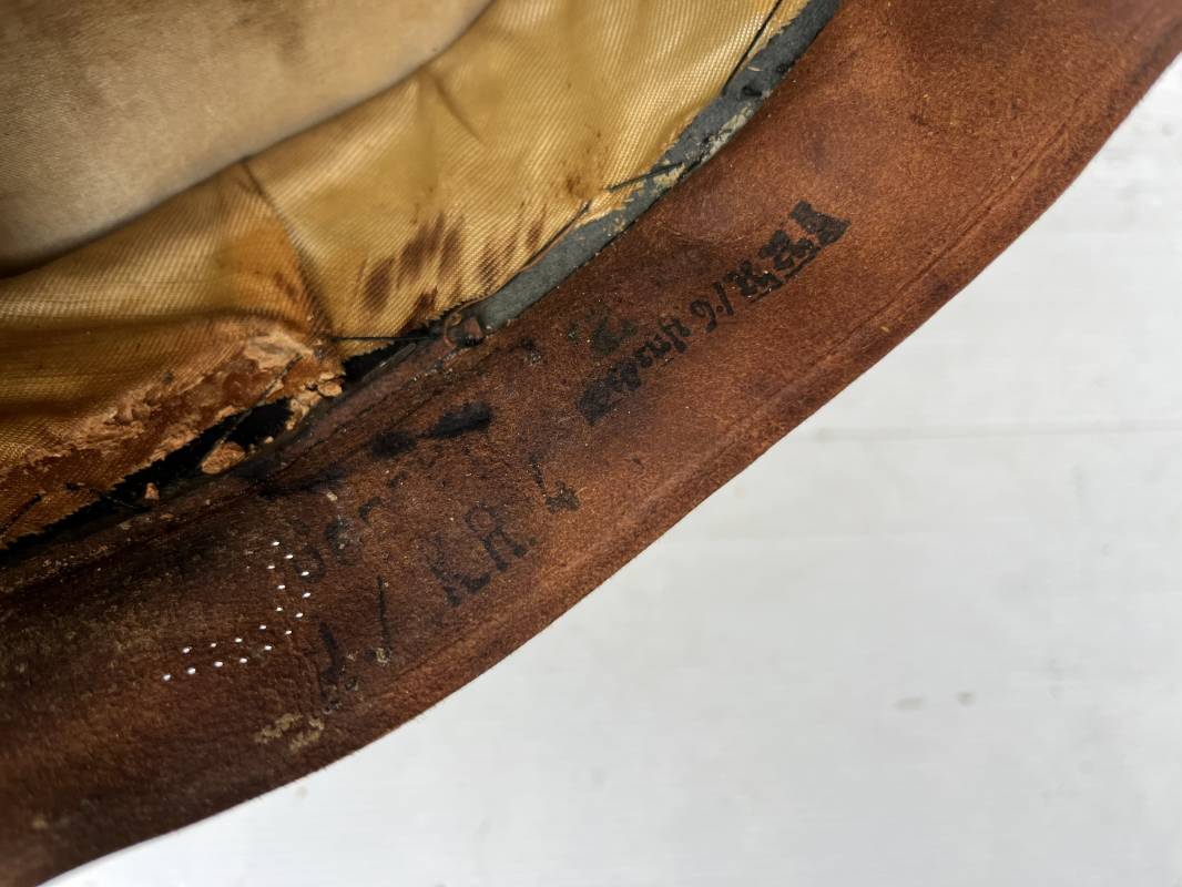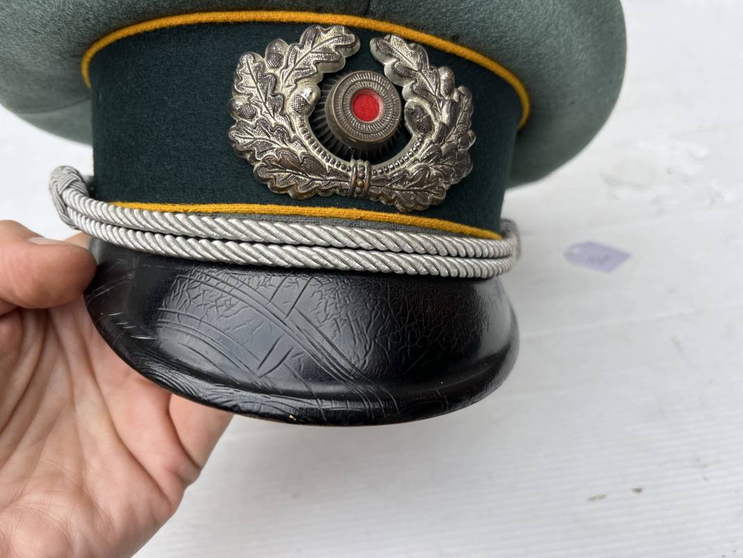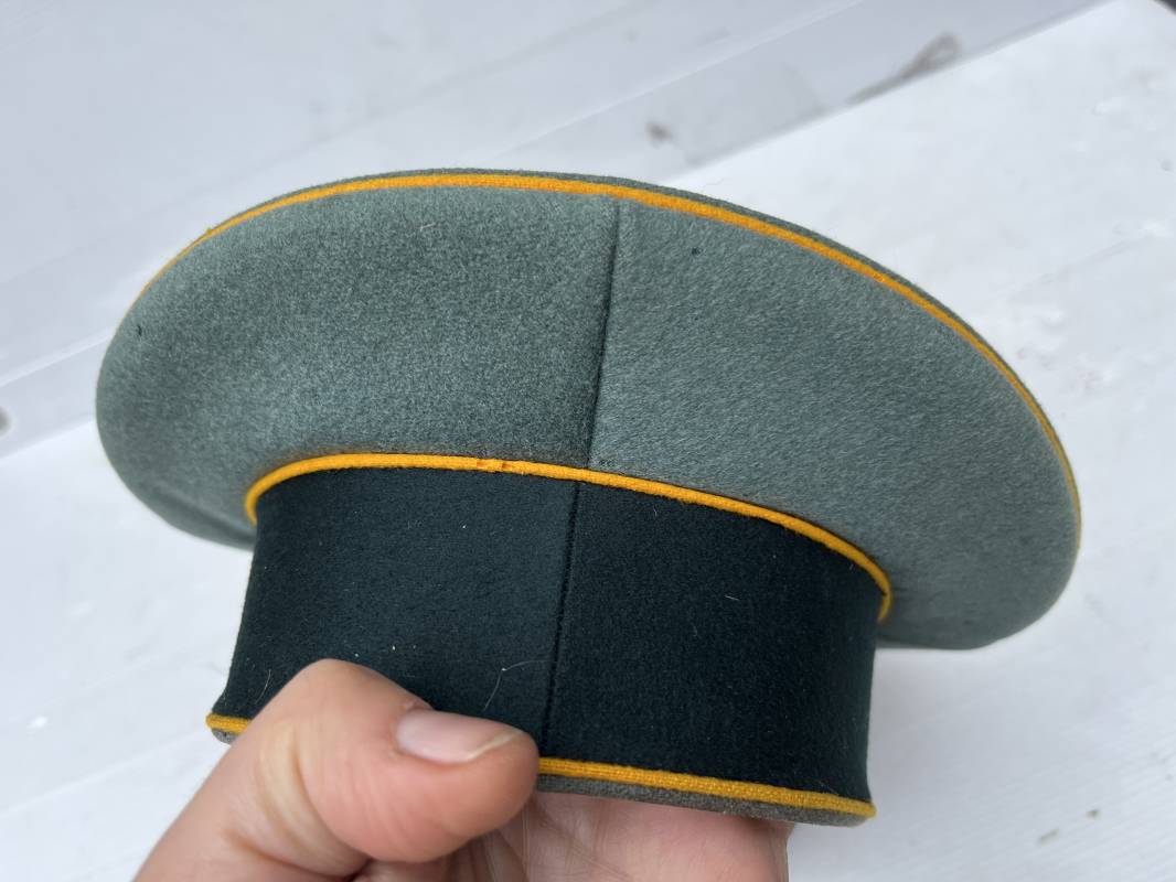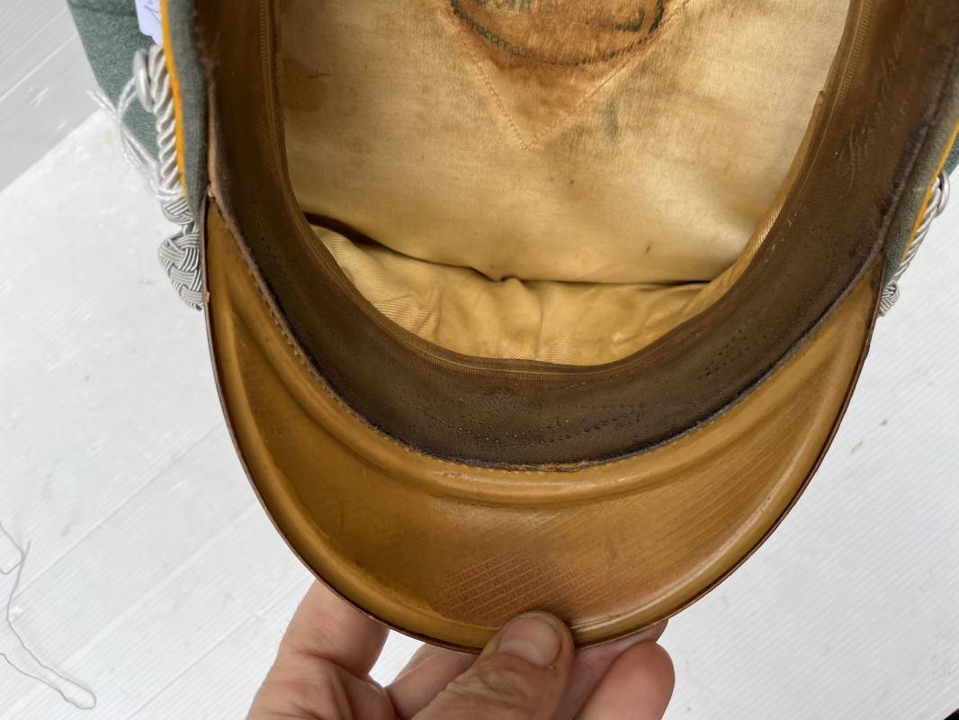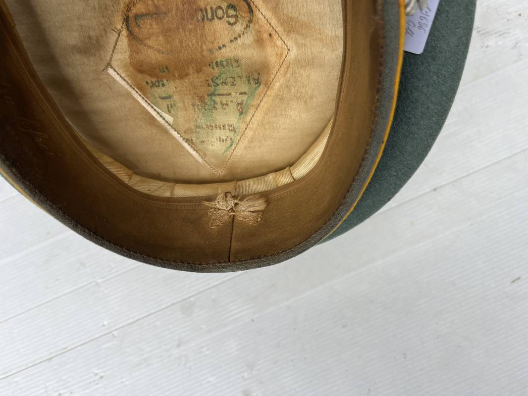 Rare casquette d'un officier de la Heer , liseré jaune d'or de la cavalerie ou unité de reconnaissance blindée Casquette en drap fin feldgrau , bandeau de coiffe en drap vert foncé , jugulaire d'officier , visière en fibre noire vulcanisée , revers guilloché brun .Rares Insignes métallique patine vieille argent aigle et cocarde . Belle forme ( sattel form ) . Inérieur doublé en satinette dorée, rhodoid manquant marquage fabricant en fond de coiffe ' SonderKlasse ' , bandeau de coiffe intérieur en cuir marron , marquage ' Stirndruckfrei DRGM' . Taille 561/2 Marquage d'affectation régimentaire sous le bandeau Geprutt 2/Kav Rgt 4 ( 2éme Escadron du 4éme régiment de cavalerie ) Casquette portée en bel état . Trés belle patine générale . Ref 19686