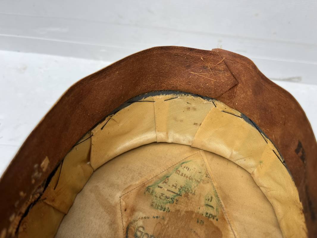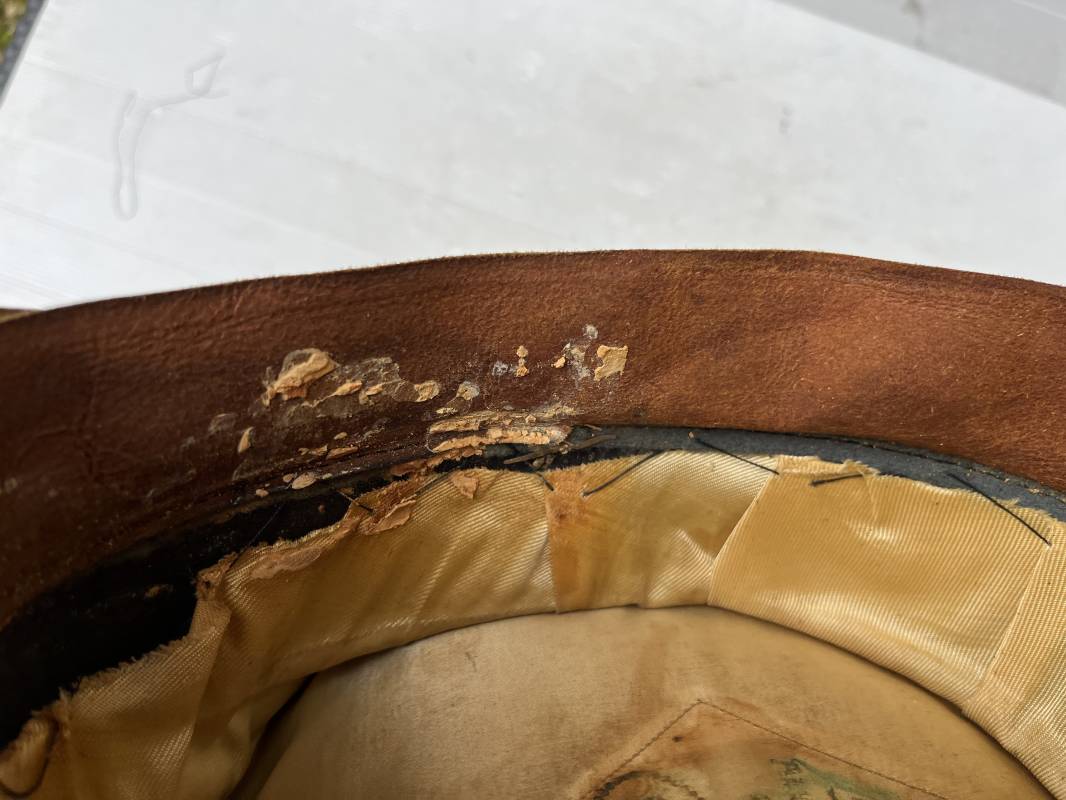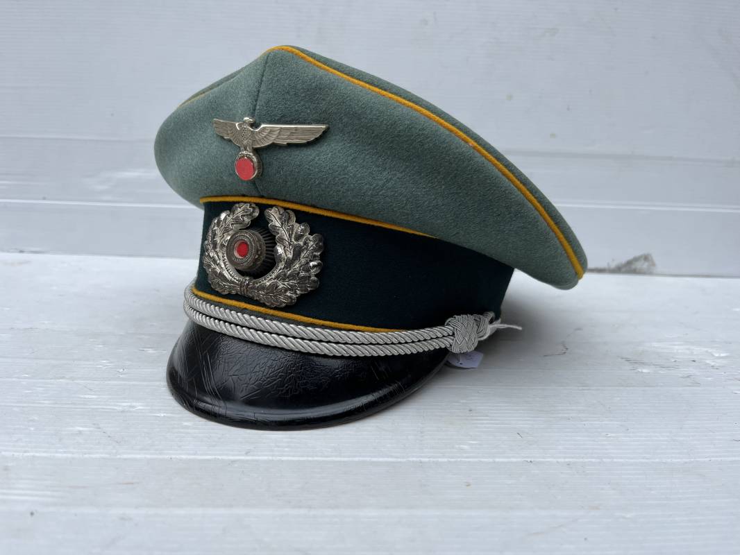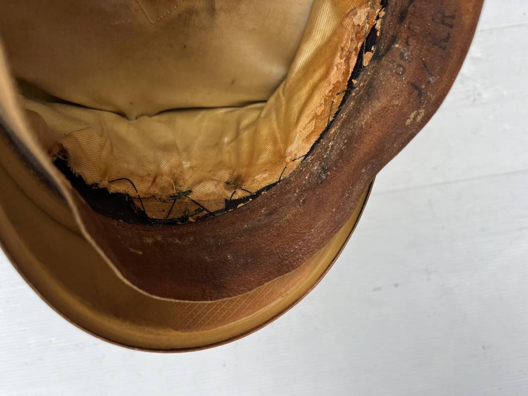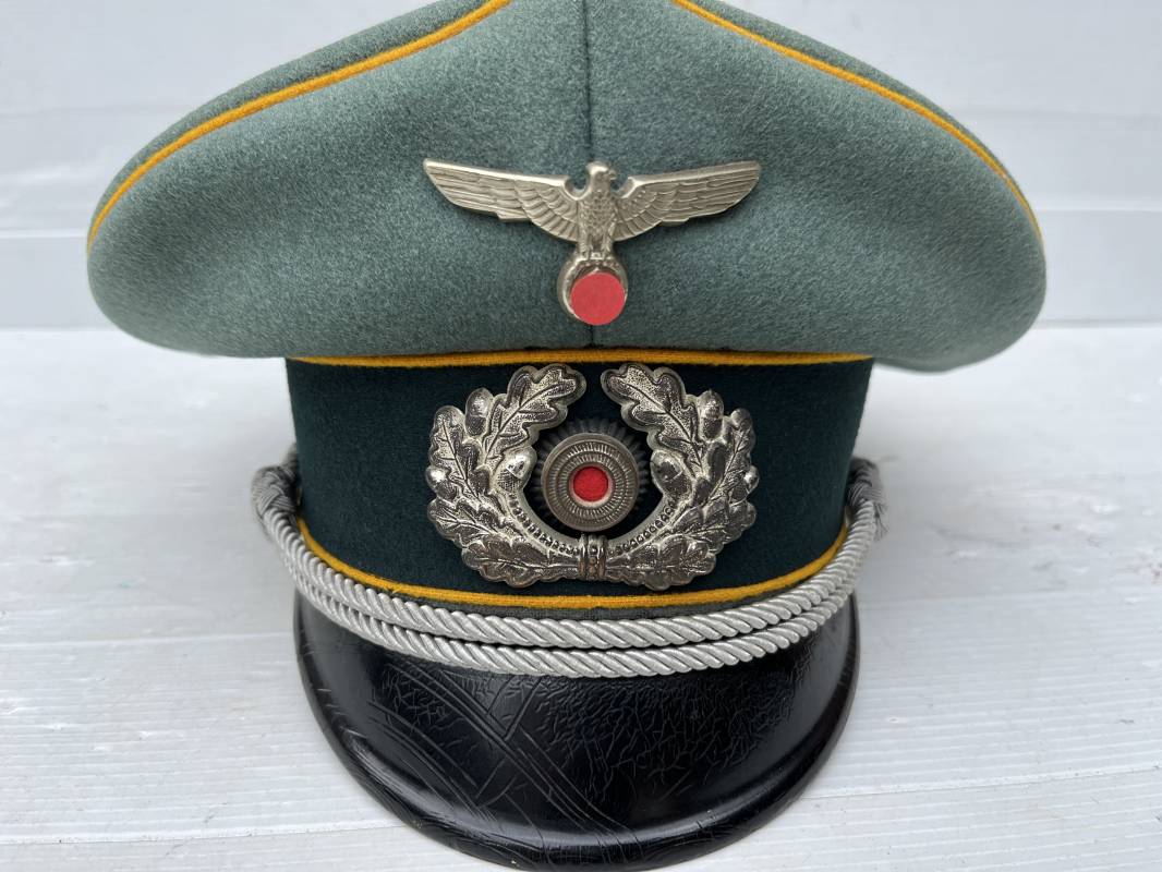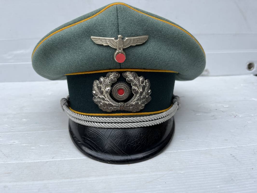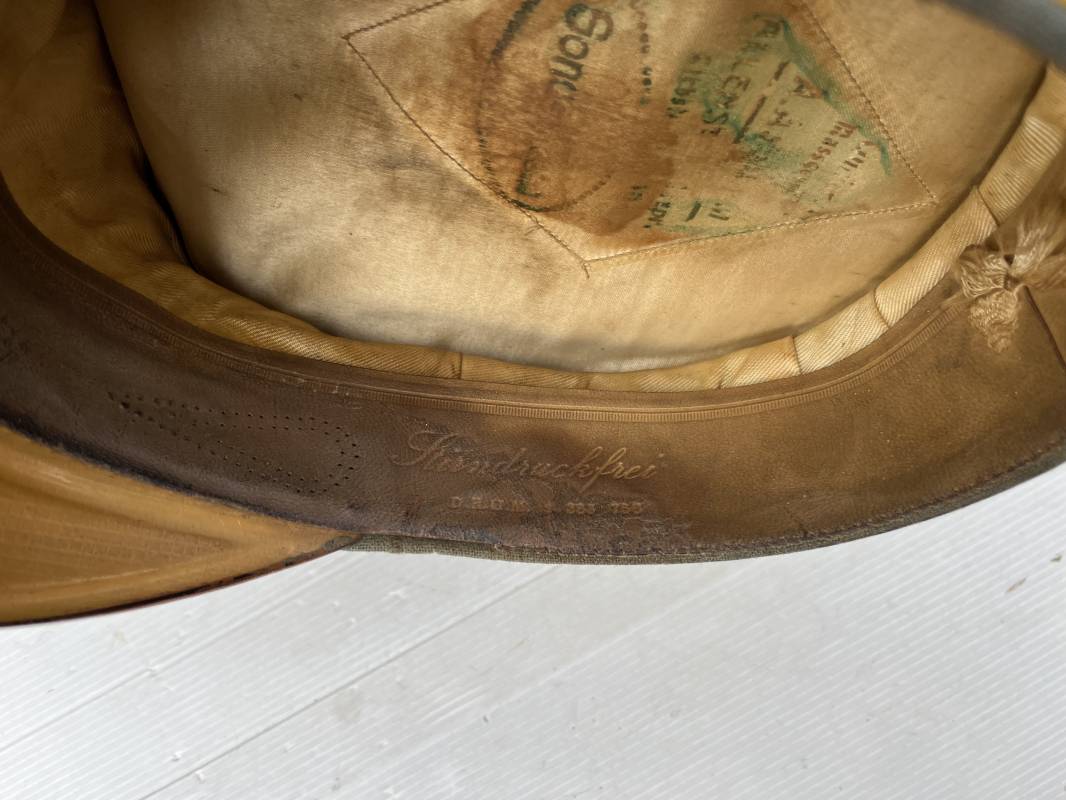 Rare casquette d'un officier de la Heer , liseré jaune d'or de la cavalerie ou unité de reconnaissance blindée Casquette en drap fin feldgrau , bandeau de coiffe en drap vert foncé , jugulaire d'officier , visière en fibre noire vulcanisée , revers guilloché brun .Rares Insignes métallique patine vieille argent aigle et cocarde . Belle forme ( sattel form ) . Inérieur doublé en satinette dorée, rhodoid manquant marquage fabricant en fond de coiffe ' SonderKlasse ' , bandeau de coiffe intérieur en cuir marron , marquage ' Stirndruckfrei DRGM' . Taille 561/2 Marquage d'affectation régimentaire sous le bandeau Geprutt 2/Kav Rgt 4 ( 2éme Escadron du 4éme régiment de cavalerie ) Casquette portée en bel état . Trés belle patine générale . Ref 19686