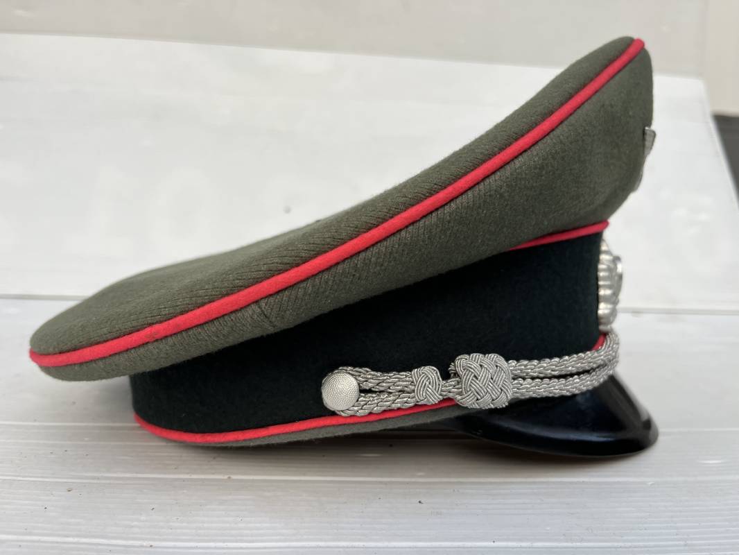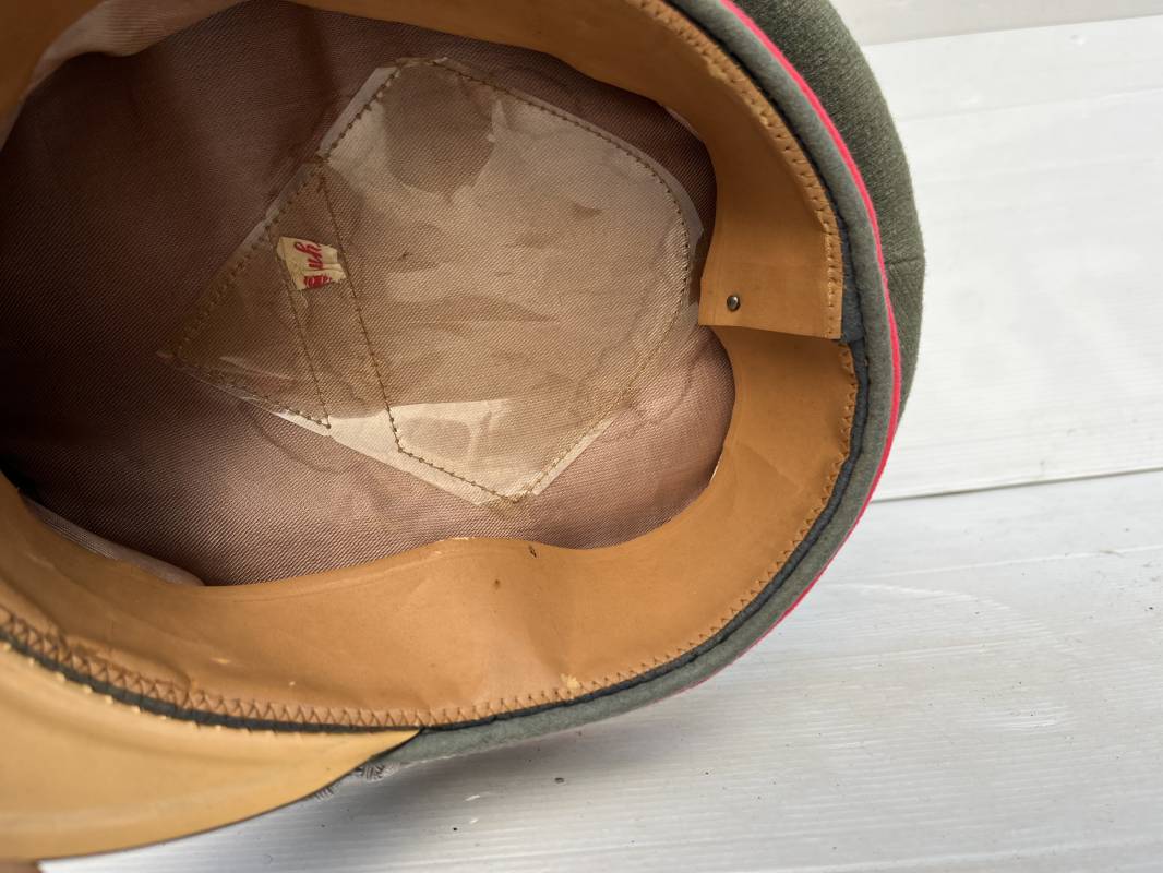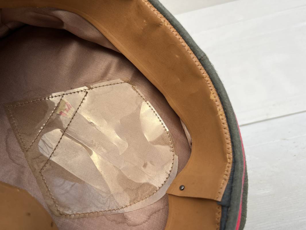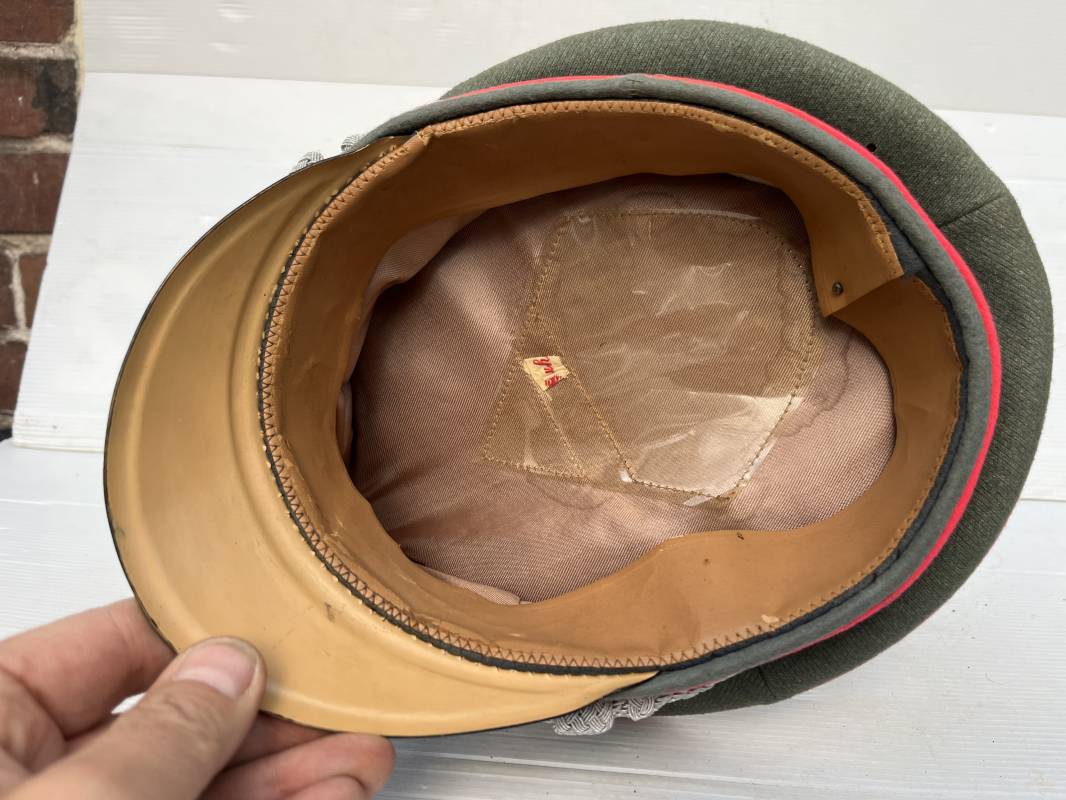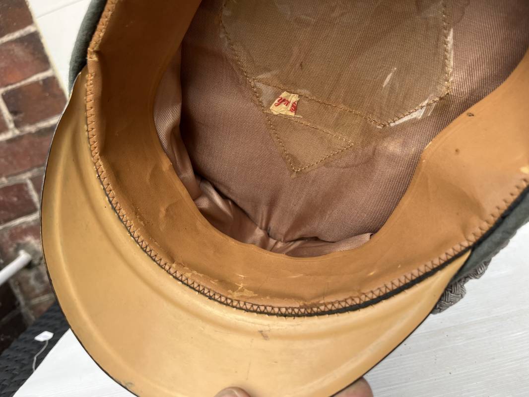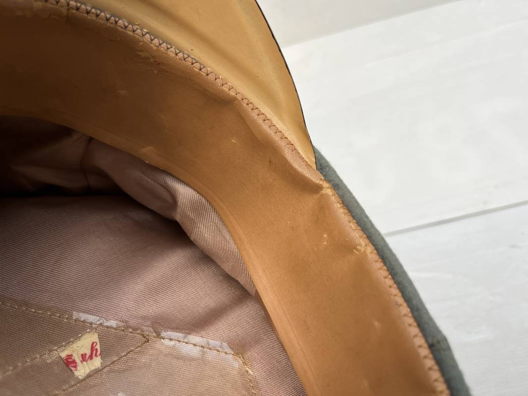 Trés belle casquette d'un officier des troupes blindées Panzer de la Heer . Casquette en tricotine feldgrau. Bandeau de coiffe en drap vert foncé. Insignes aigle et cocarde en alu . Liseré rose des panzer truppen . Jugulaire torsadée d'officier en canetille argent . Visière en fibre vulcanisée noire, revers guilloché crème . Belle forme ' Sattel Form' . Parfait état. Intèrieur doublé en satinette dorée. Rhodoid vierge sans marquage fabricant , nominette ' HUHN'.. Bandeau de coiffe intèrieur en toile enduite facon cuir de couleur crème . Taille 58 . Casquette d'un officier Panzer de la Heer en superbe état Casquette définitive en collection . Ref 21637