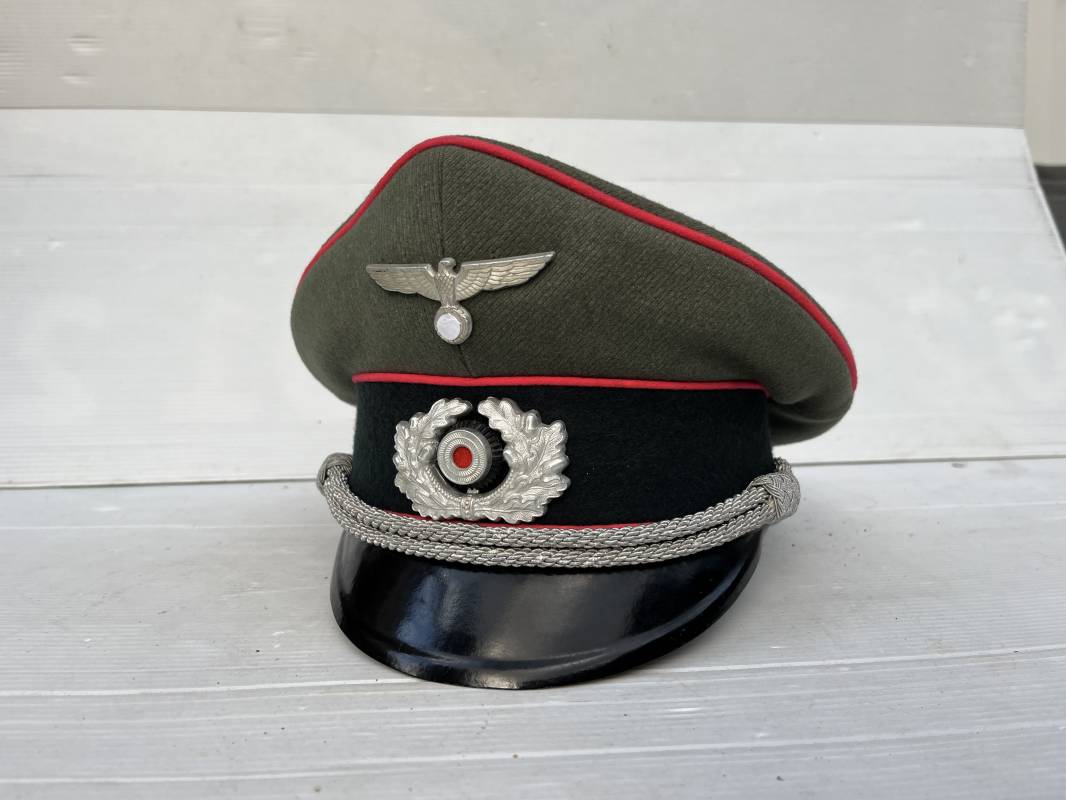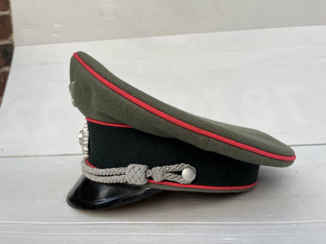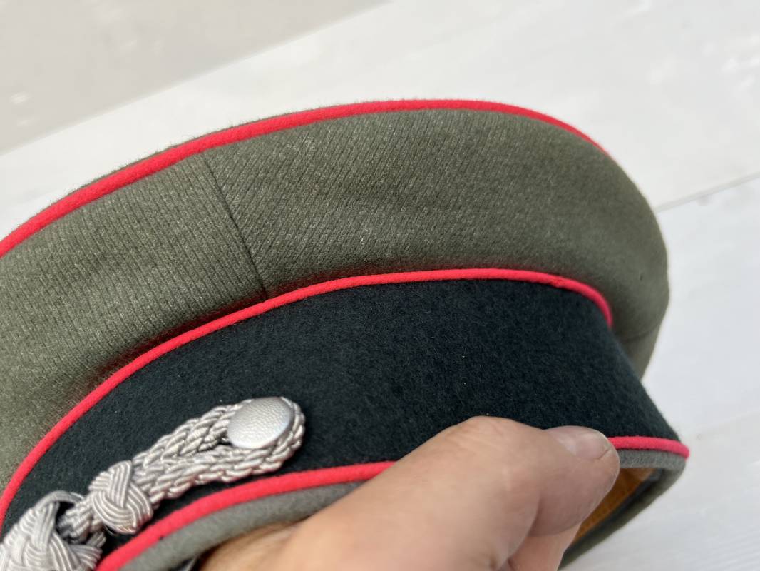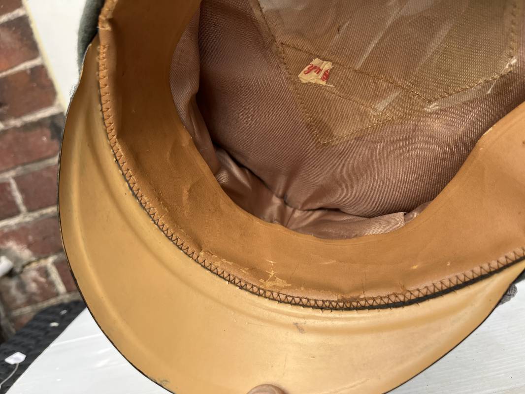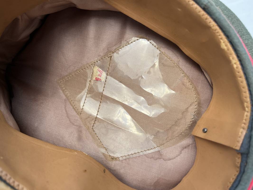 Trés belle casquette d'un officier des troupes blindées Panzer de la Heer . Casquette en tricotine feldgrau. Bandeau de coiffe en drap vert foncé. Insignes aigle et cocarde en alu . Liseré rose des panzer truppen . Jugulaire torsadée d'officier en canetille argent . Visière en fibre vulcanisée noire, revers guilloché crème . Belle forme ' Sattel Form' . Parfait état. Intèrieur doublé en satinette dorée. Rhodoid vierge sans marquage fabricant , nominette ' HUHN'.. Bandeau de coiffe intèrieur en toile enduite facon cuir de couleur crème . Taille 58 . Casquette d'un officier Panzer de la Heer en superbe état Casquette définitive en collection . Ref 21637