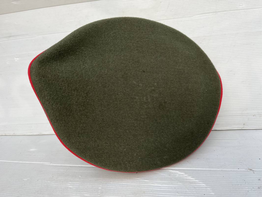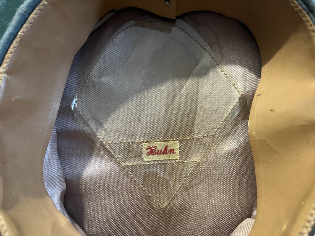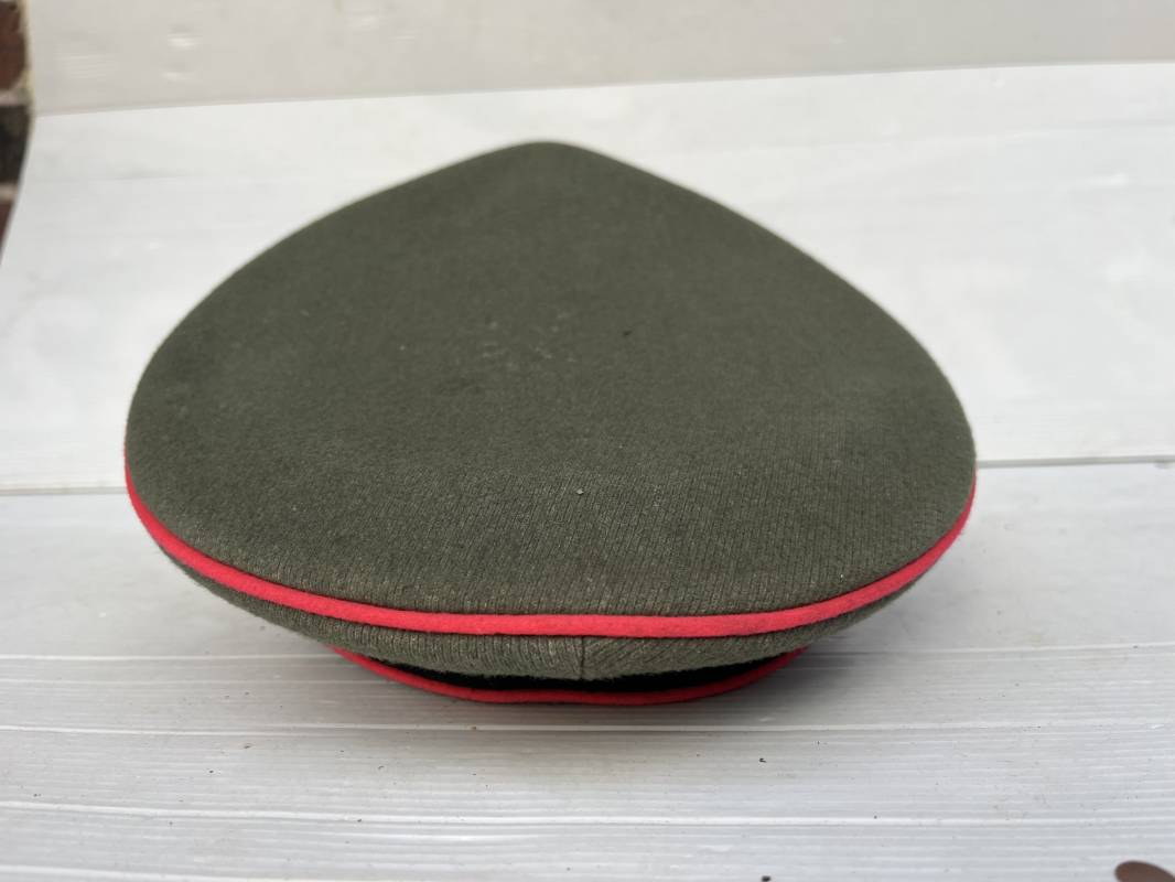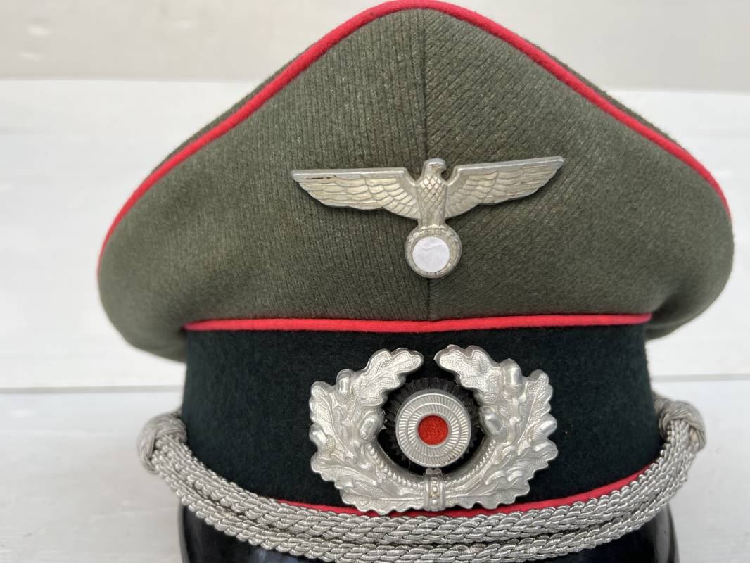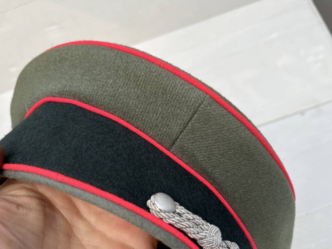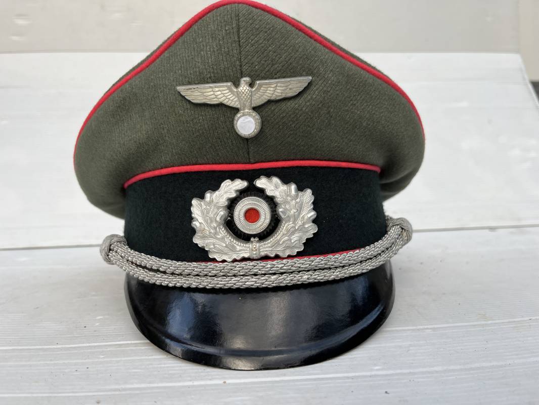 Trés belle casquette d'un officier des troupes blindées Panzer de la Heer . Casquette en tricotine feldgrau. Bandeau de coiffe en drap vert foncé. Insignes aigle et cocarde en alu . Liseré rose des panzer truppen . Jugulaire torsadée d'officier en canetille argent . Visière en fibre vulcanisée noire, revers guilloché crème . Belle forme ' Sattel Form' . Parfait état. Intèrieur doublé en satinette dorée. Rhodoid vierge sans marquage fabricant , nominette ' HUHN'.. Bandeau de coiffe intèrieur en toile enduite facon cuir de couleur crème . Taille 58 . Casquette d'un officier Panzer de la Heer en superbe état Casquette définitive en collection . Ref 21637