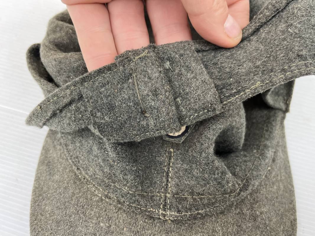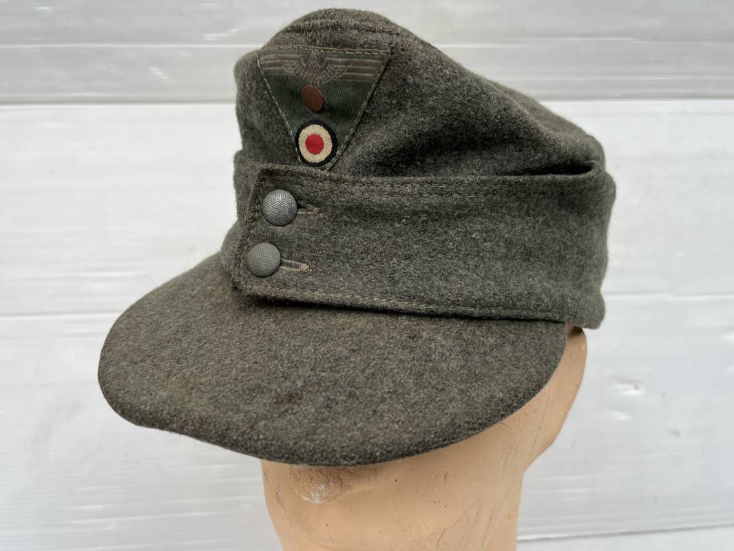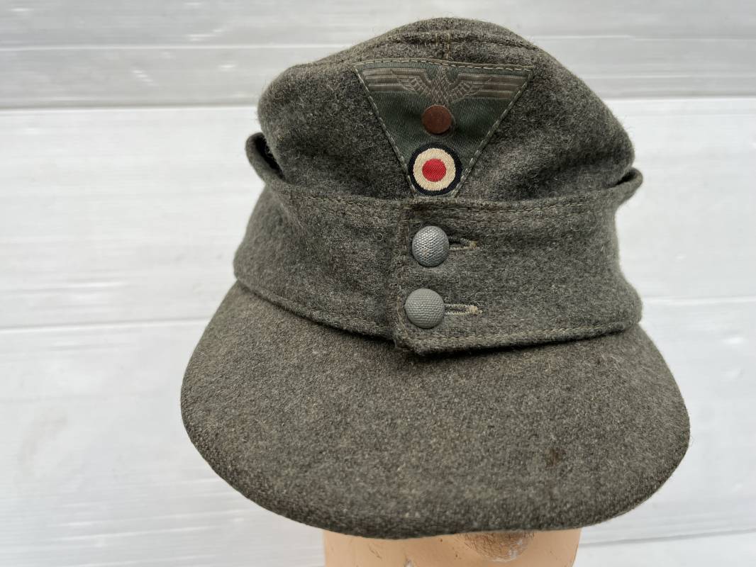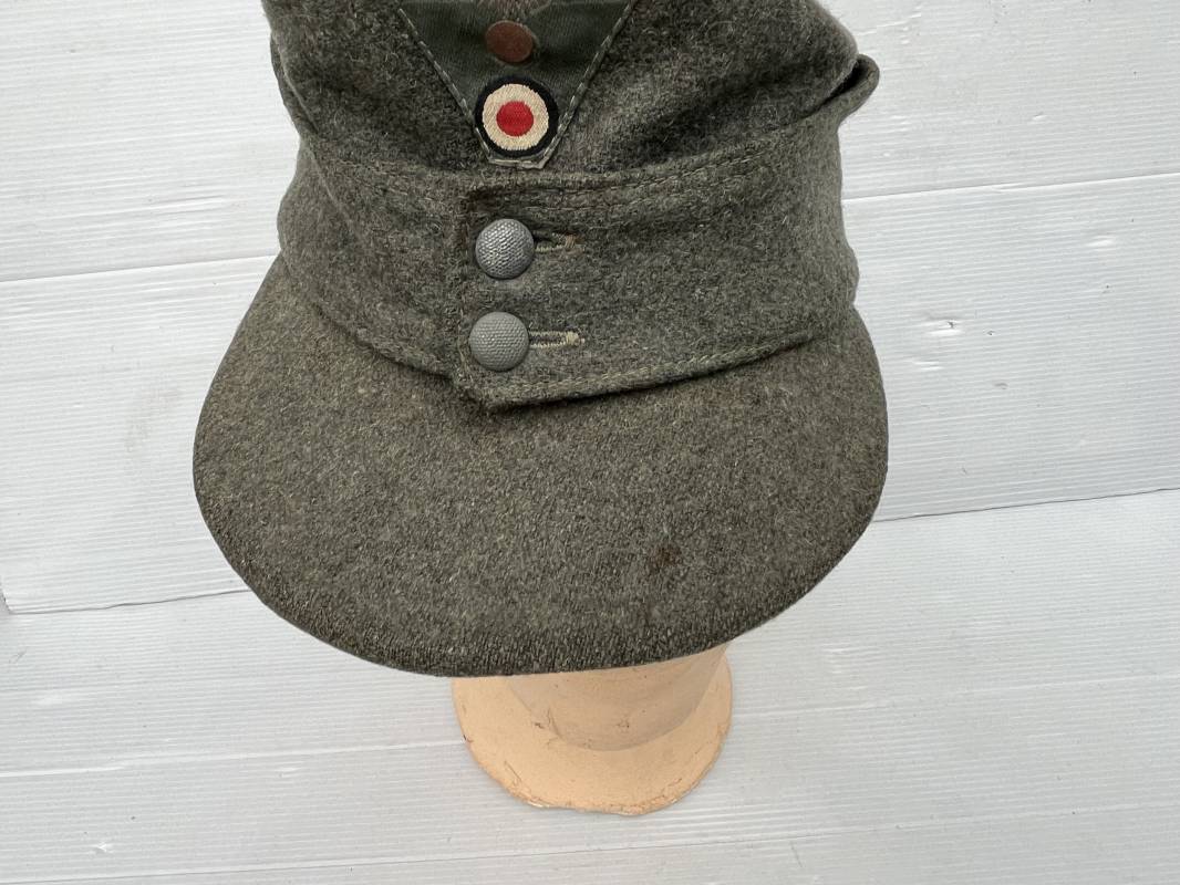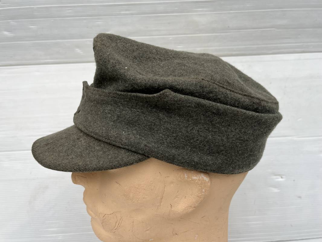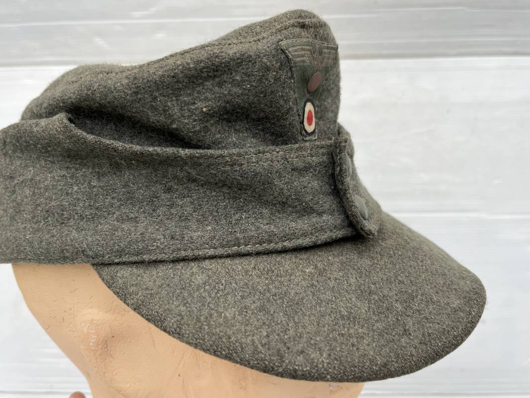 Trés belle casquette troupe modéle 1943 en drap feldgrau . Casquette avec insigne trapézoidal monté machine d 'origine . Casquette de dotation modéle 1943 avec visière en drap , rabats protége oreilles , deux passants satinettes pour protége oreilles , renforts sur le pourtour interieur en satinette grise . . Deux boutons greneles cousus sur le devant . Insigne trapéze modele 1943 tissé bevo aigle et cocarde . Intérieur de la casquette entièrement doublé en satinette grise . Taille 57 . Casquette légèrement portée en parfait état . Trés belle patine générale . Casquette trouvée a Saint Pierre sur Dives ( 14 ) il ya 40 ans . Casquete sans aucun défaut . Trés belle coiffure de la bataille de Normandie . 1943/45 Ref 21021