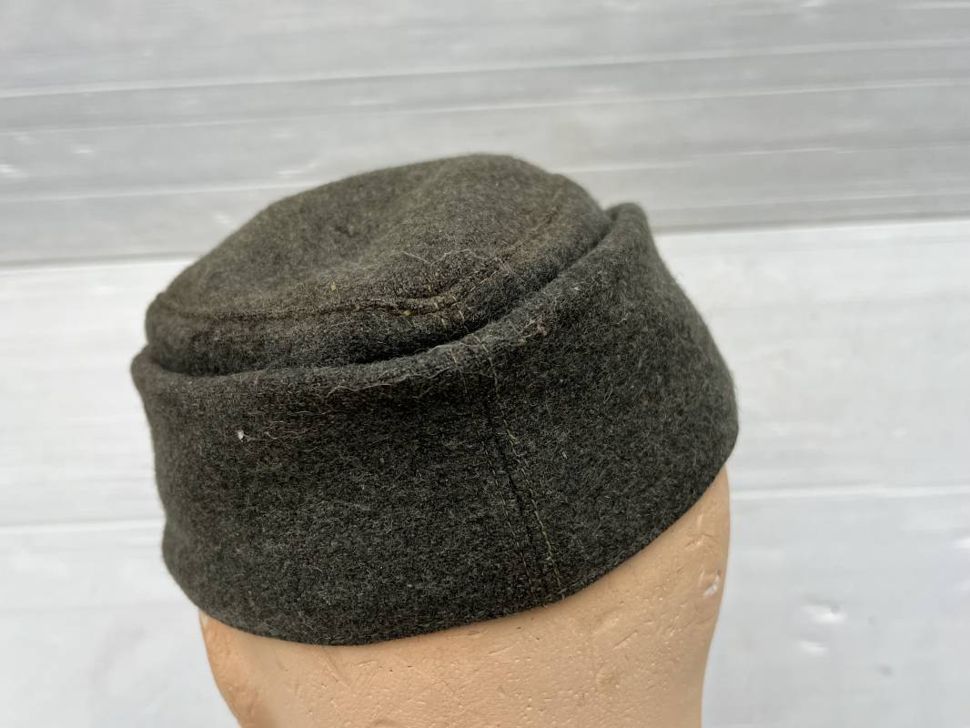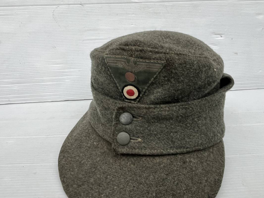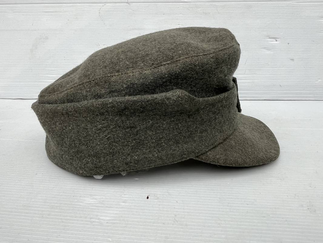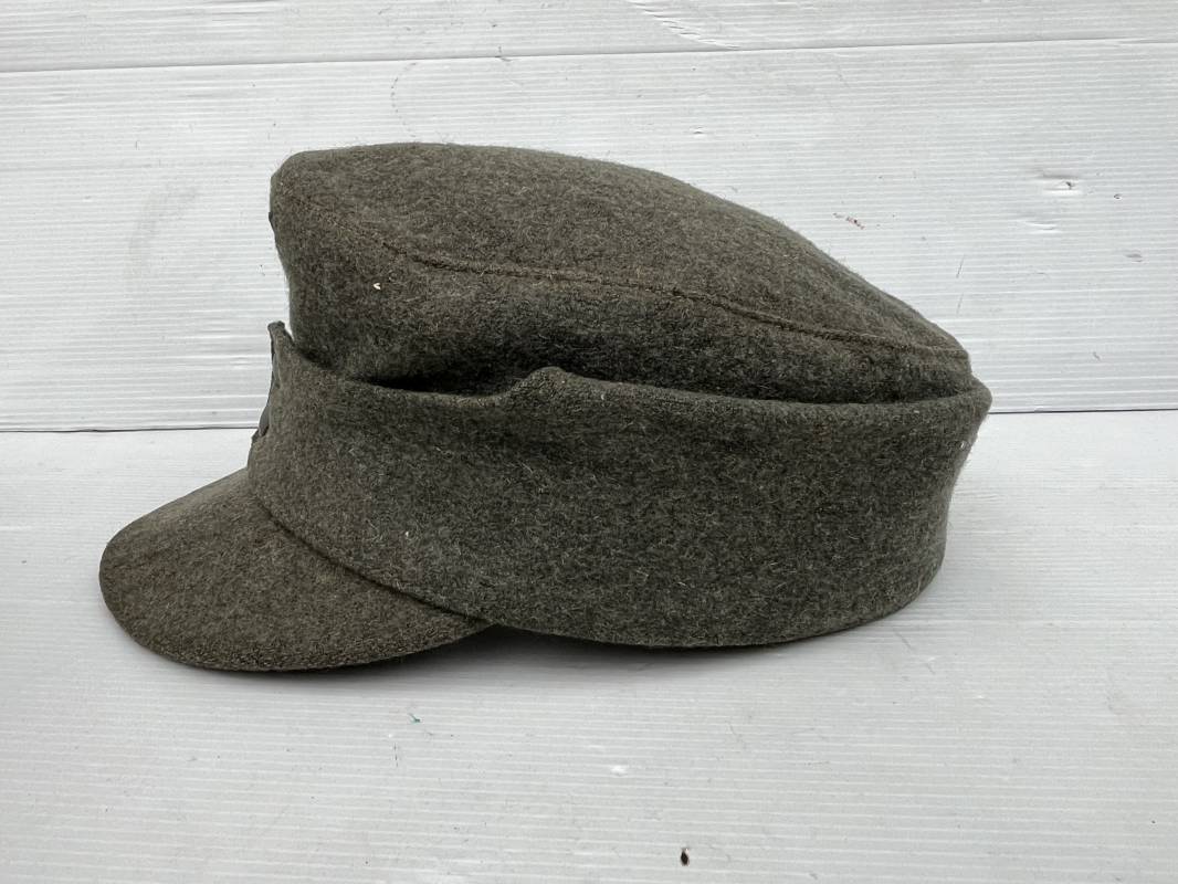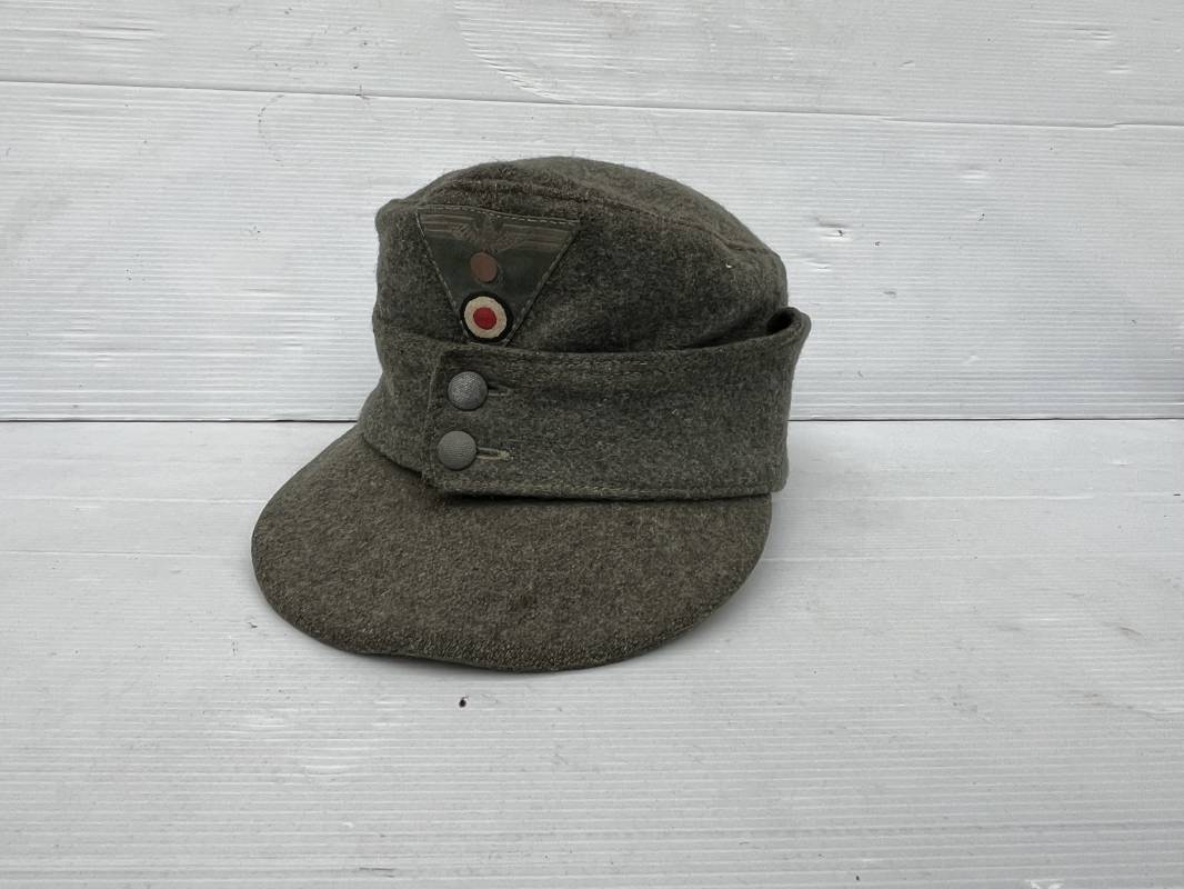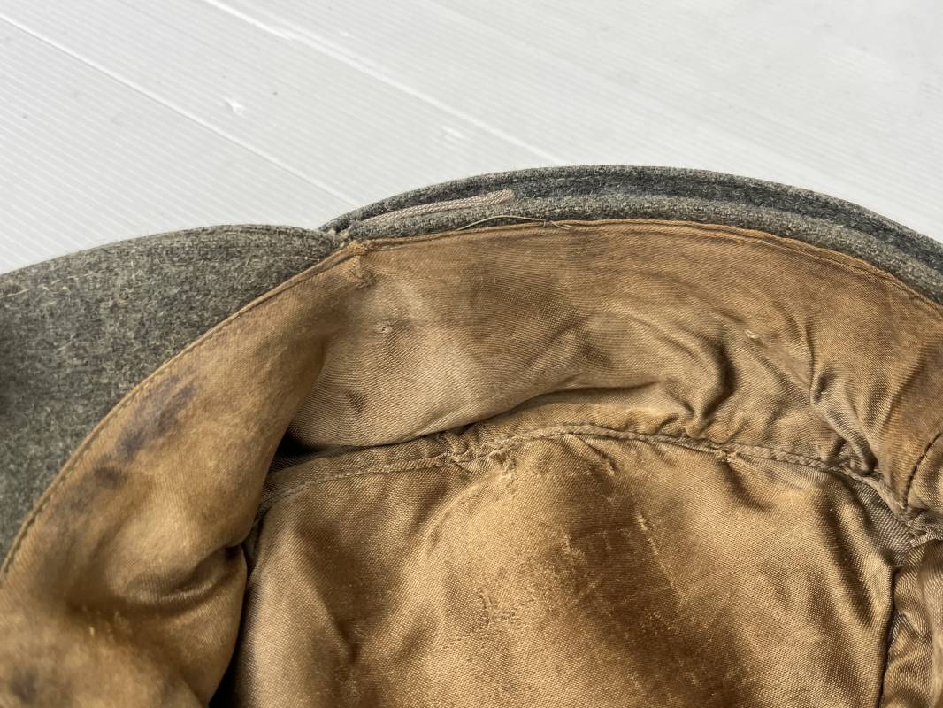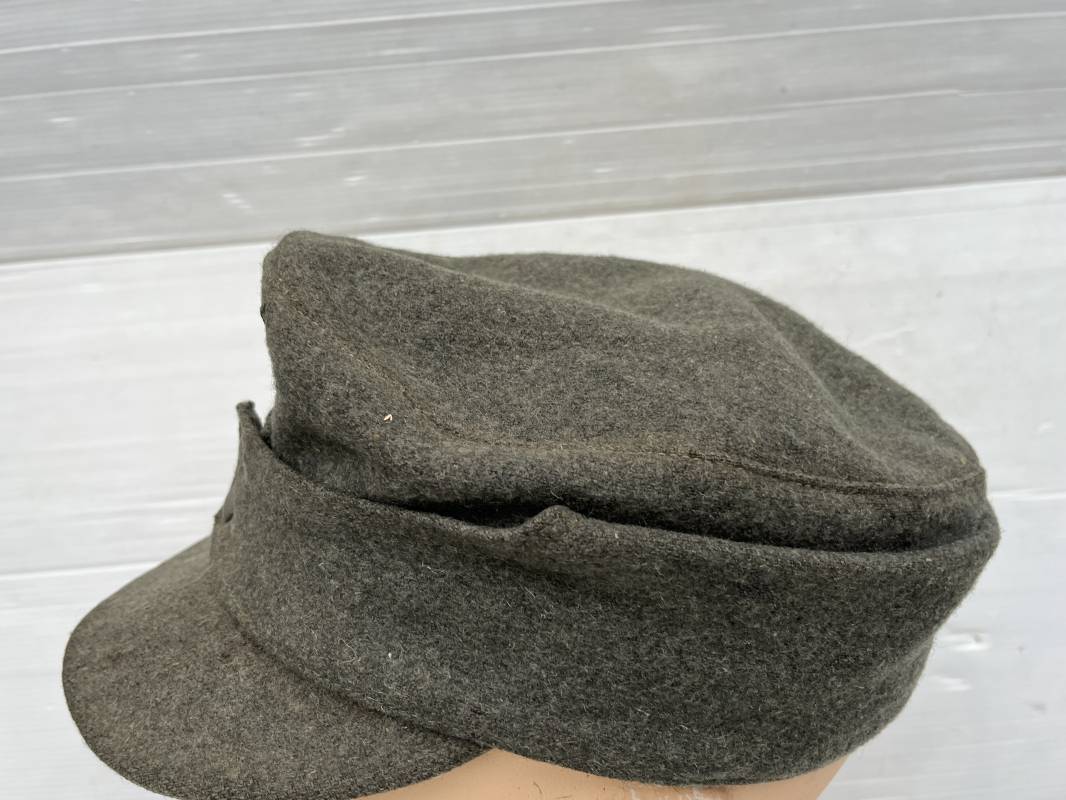 Trés belle casquette troupe modéle 1943 en drap feldgrau . Casquette avec insigne trapézoidal monté machine d 'origine . Casquette de dotation modéle 1943 avec visière en drap , rabats protége oreilles , deux passants satinettes pour protége oreilles , renforts sur le pourtour interieur en satinette grise . . Deux boutons greneles cousus sur le devant . Insigne trapéze modele 1943 tissé bevo aigle et cocarde . Intérieur de la casquette entièrement doublé en satinette grise . Taille 57 . Casquette légèrement portée en parfait état . Trés belle patine générale . Casquette trouvée a Saint Pierre sur Dives ( 14 ) il ya 40 ans . Casquete sans aucun défaut . Trés belle coiffure de la bataille de Normandie . 1943/45 Ref 21021