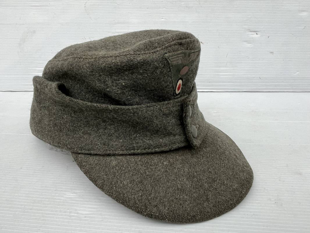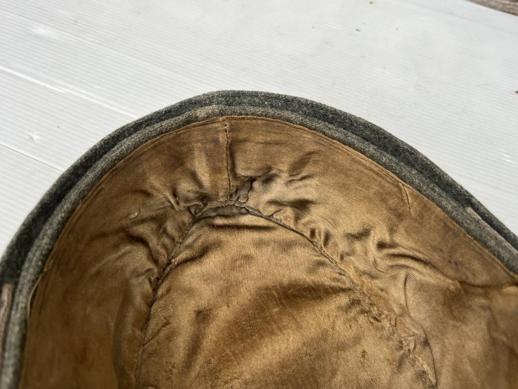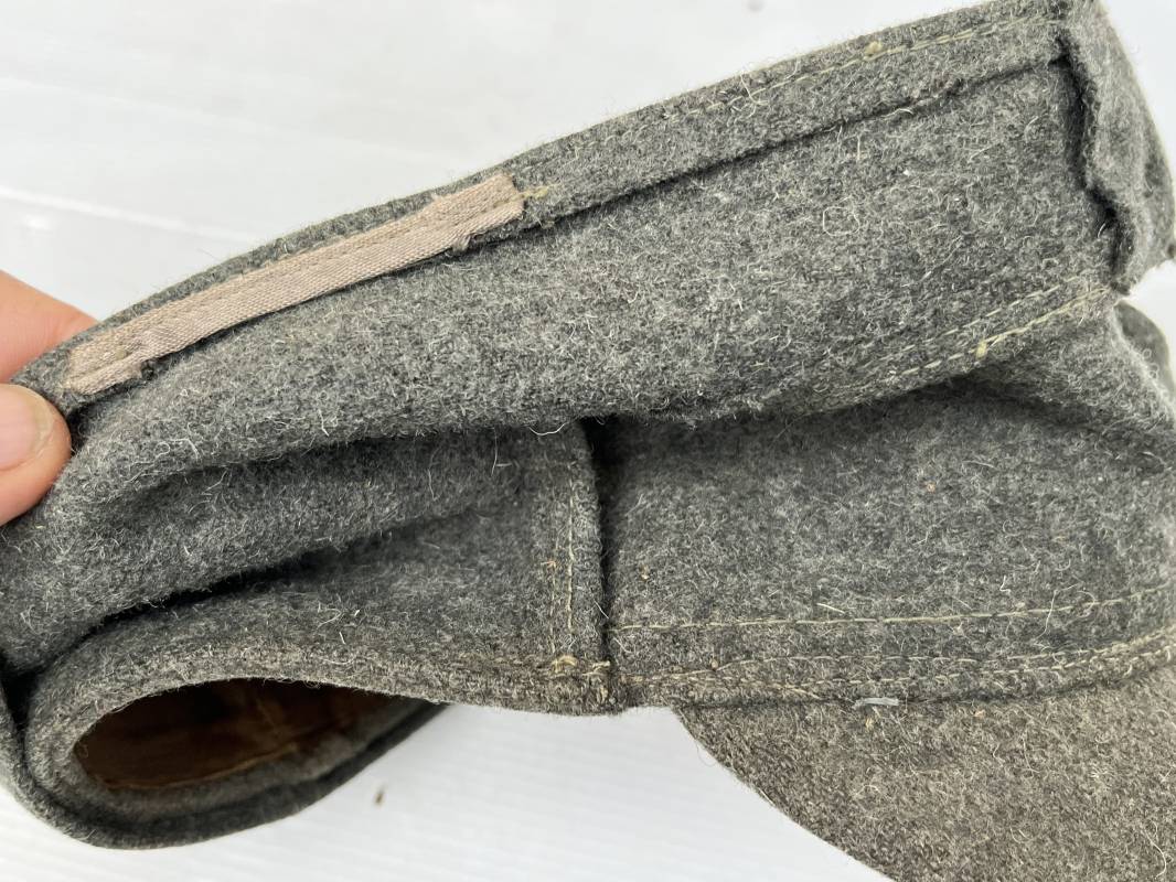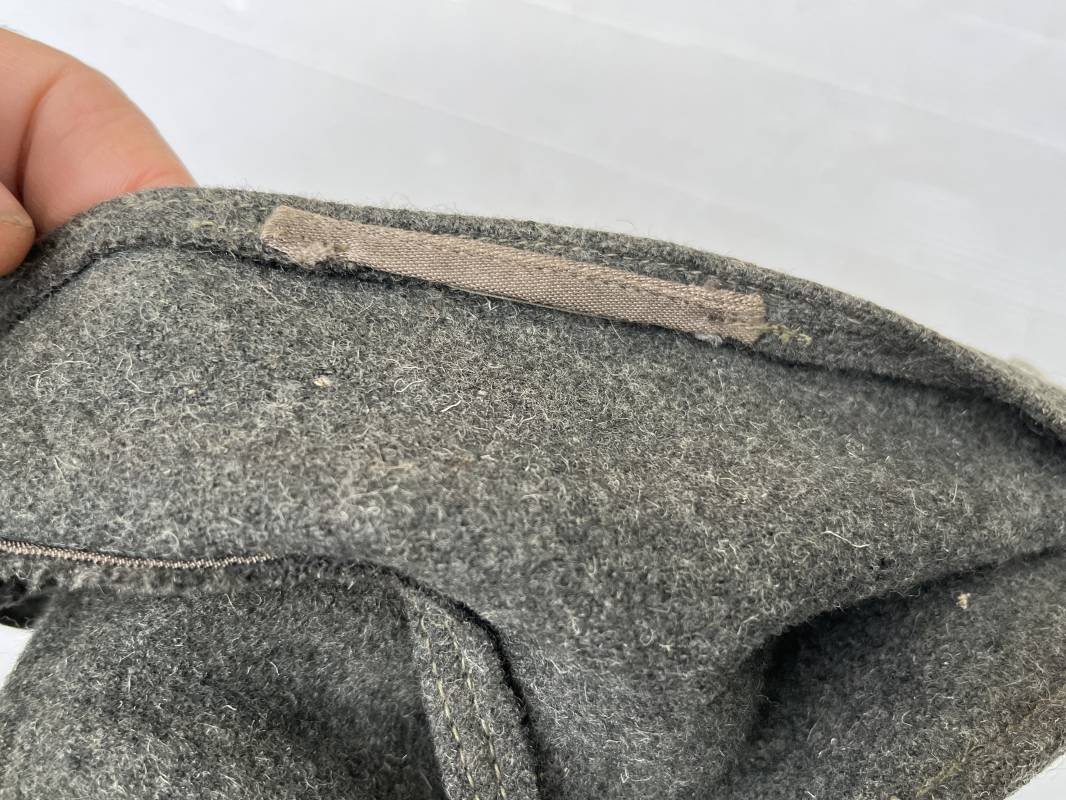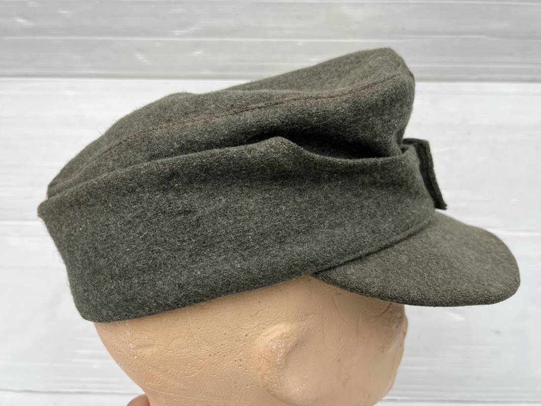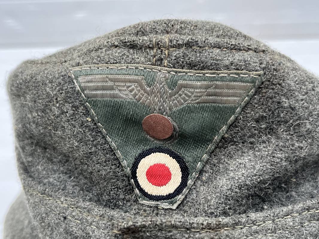 Trés belle casquette troupe modéle 1943 en drap feldgrau . Casquette avec insigne trapézoidal monté machine d 'origine . Casquette de dotation modéle 1943 avec visière en drap , rabats protége oreilles , deux passants satinettes pour protége oreilles , renforts sur le pourtour interieur en satinette grise . . Deux boutons greneles cousus sur le devant . Insigne trapéze modele 1943 tissé bevo aigle et cocarde . Intérieur de la casquette entièrement doublé en satinette grise . Taille 57 . Casquette légèrement portée en parfait état . Trés belle patine générale . Casquette trouvée a Saint Pierre sur Dives ( 14 ) il ya 40 ans . Casquete sans aucun défaut . Trés belle coiffure de la bataille de Normandie . 1943/45 Ref 21021
