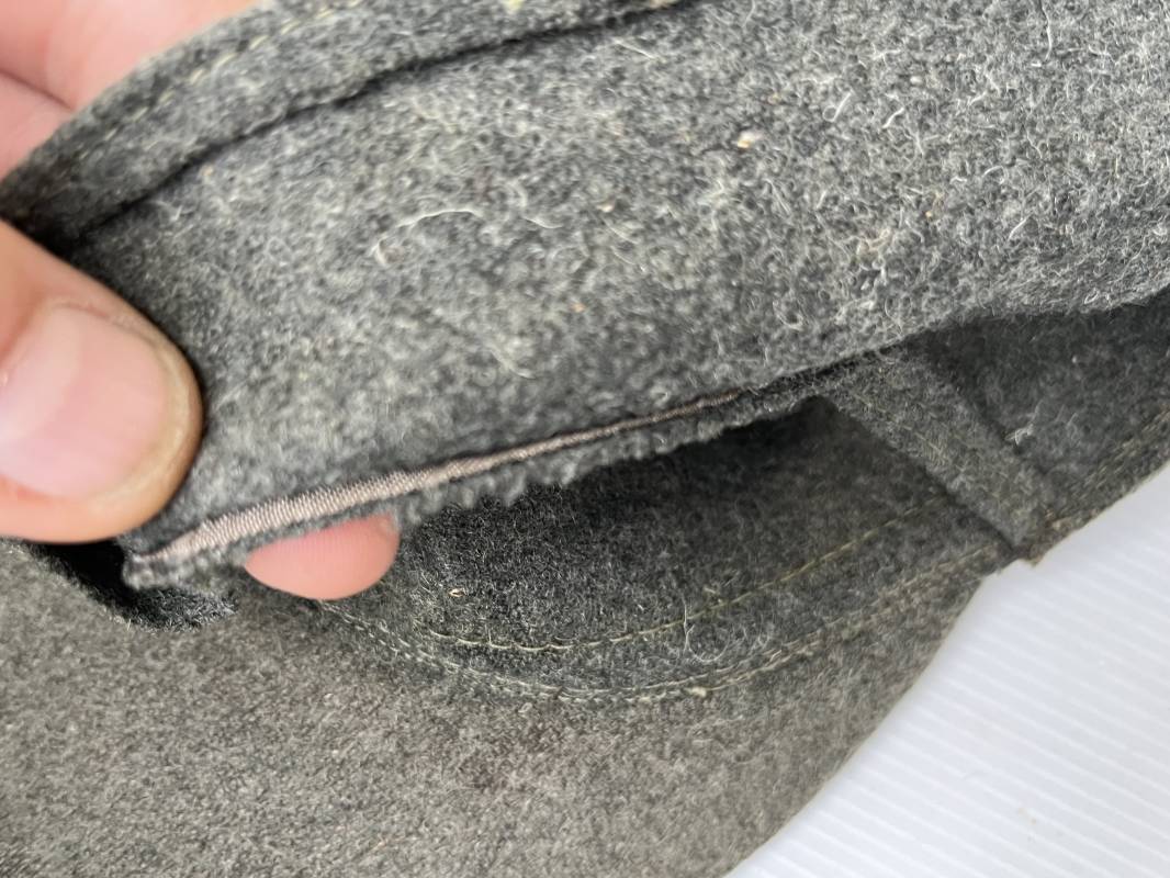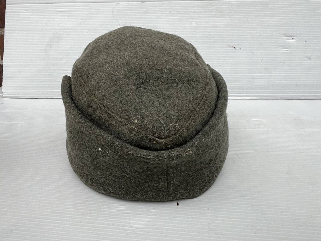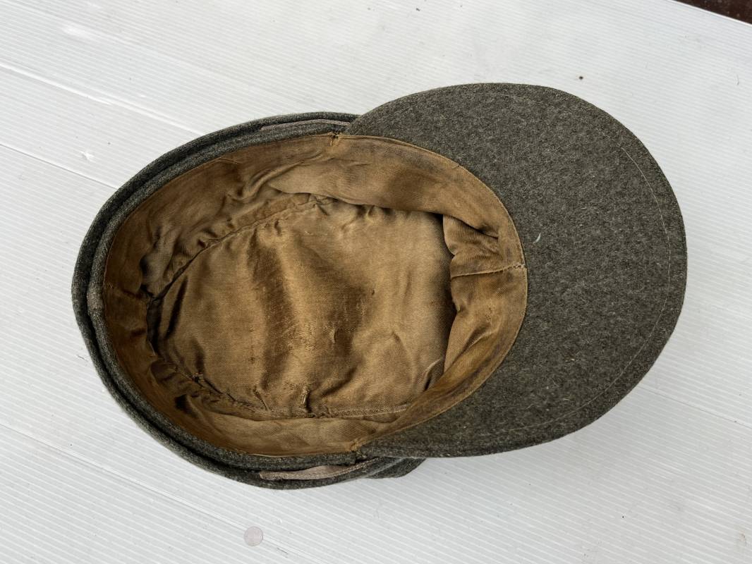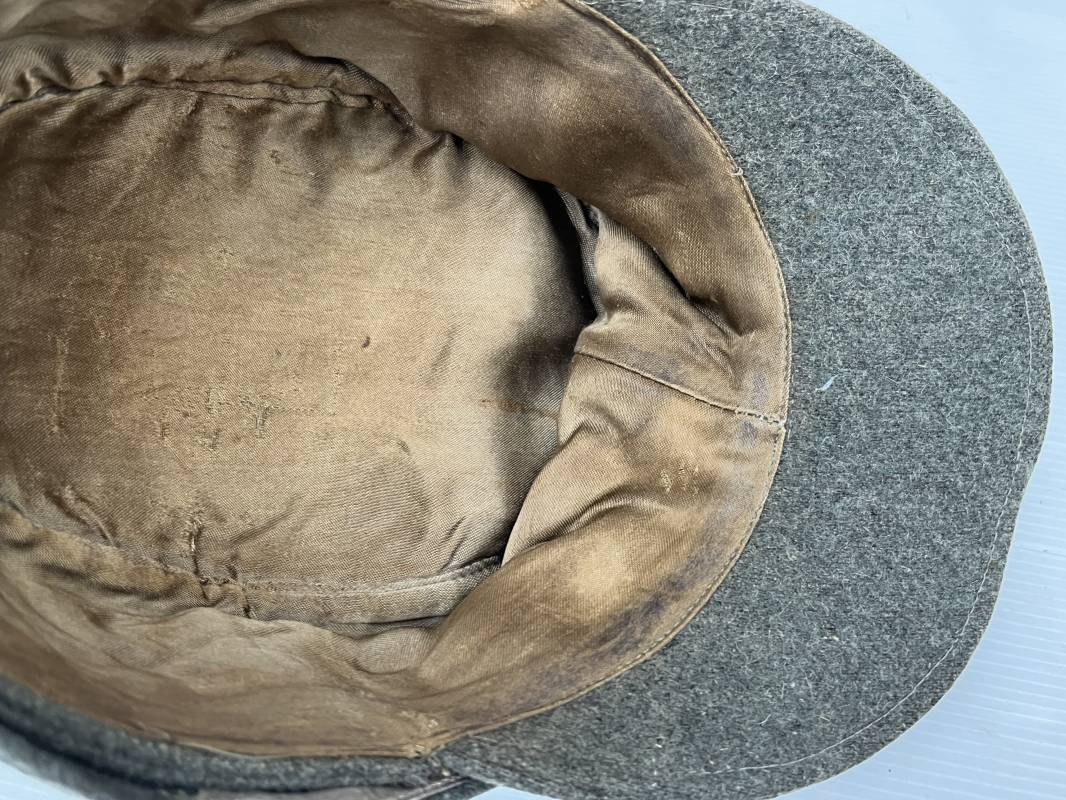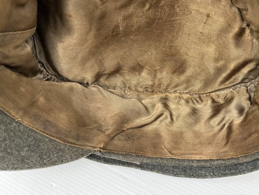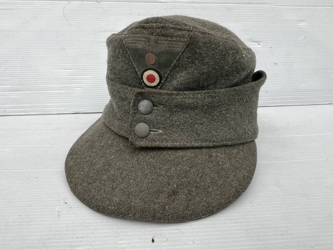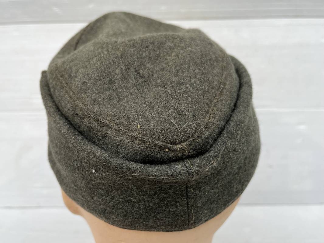 Trés belle casquette troupe modéle 1943 en drap feldgrau . Casquette avec insigne trapézoidal monté machine d 'origine . Casquette de dotation modéle 1943 avec visière en drap , rabats protége oreilles , deux passants satinettes pour protége oreilles , renforts sur le pourtour interieur en satinette grise . . Deux boutons greneles cousus sur le devant . Insigne trapéze modele 1943 tissé bevo aigle et cocarde . Intérieur de la casquette entièrement doublé en satinette grise . Taille 57 . Casquette légèrement portée en parfait état . Trés belle patine générale . Casquette trouvée a Saint Pierre sur Dives ( 14 ) il ya 40 ans . Casquete sans aucun défaut . Trés belle coiffure de la bataille de Normandie . 1943/45 Ref 21021