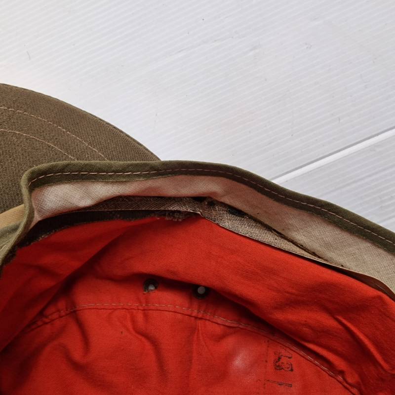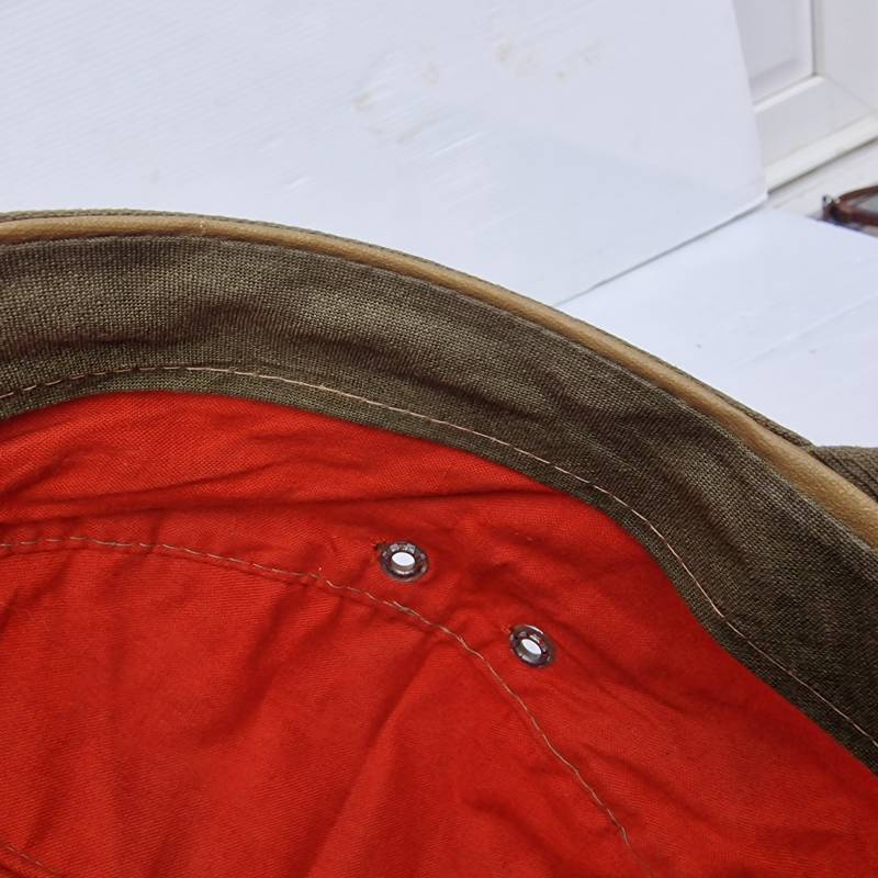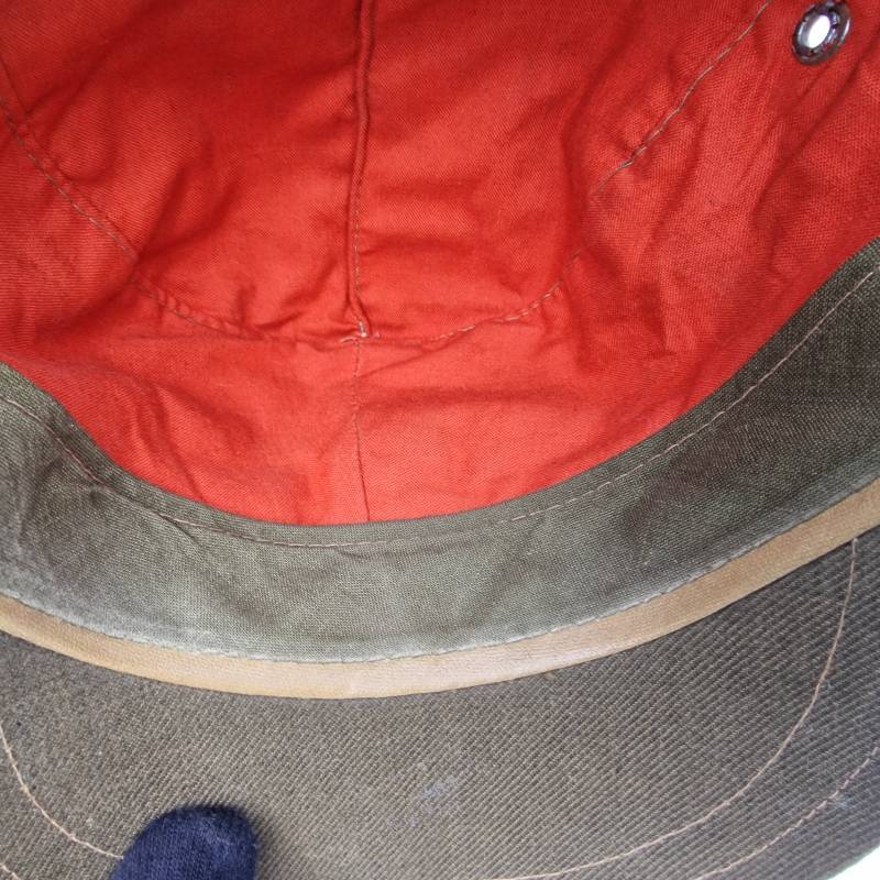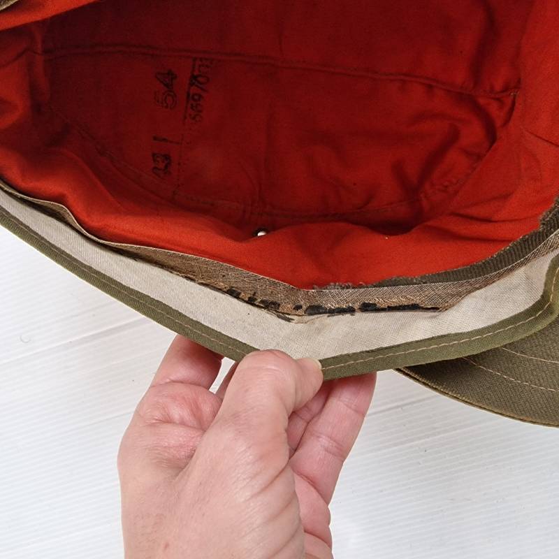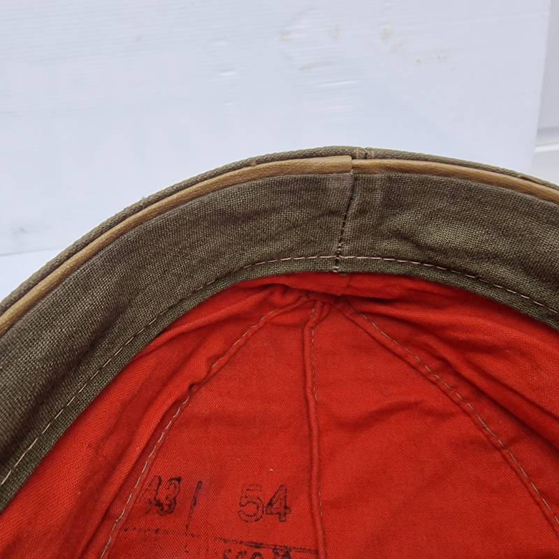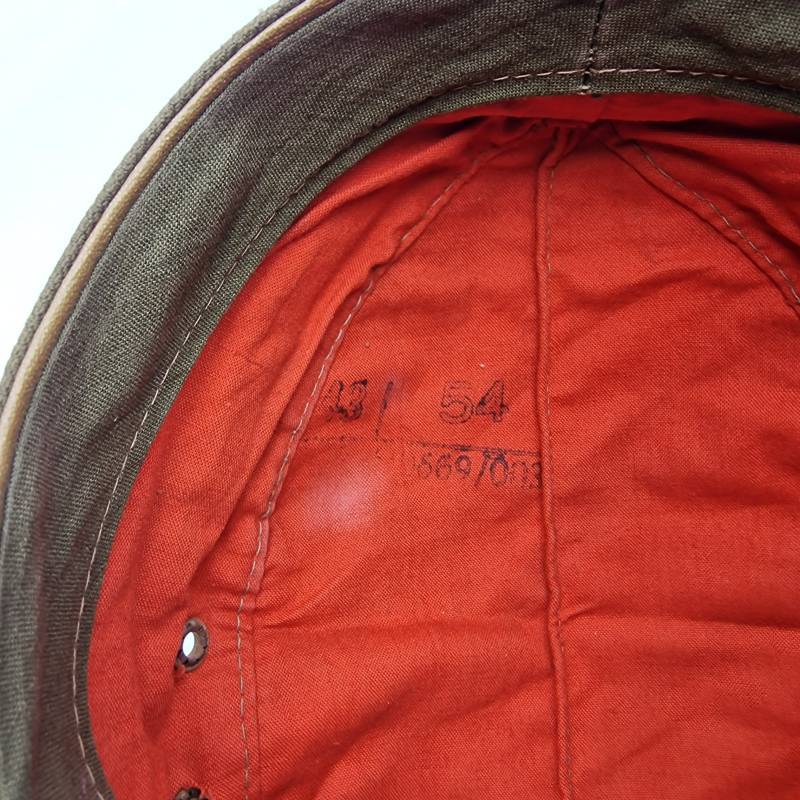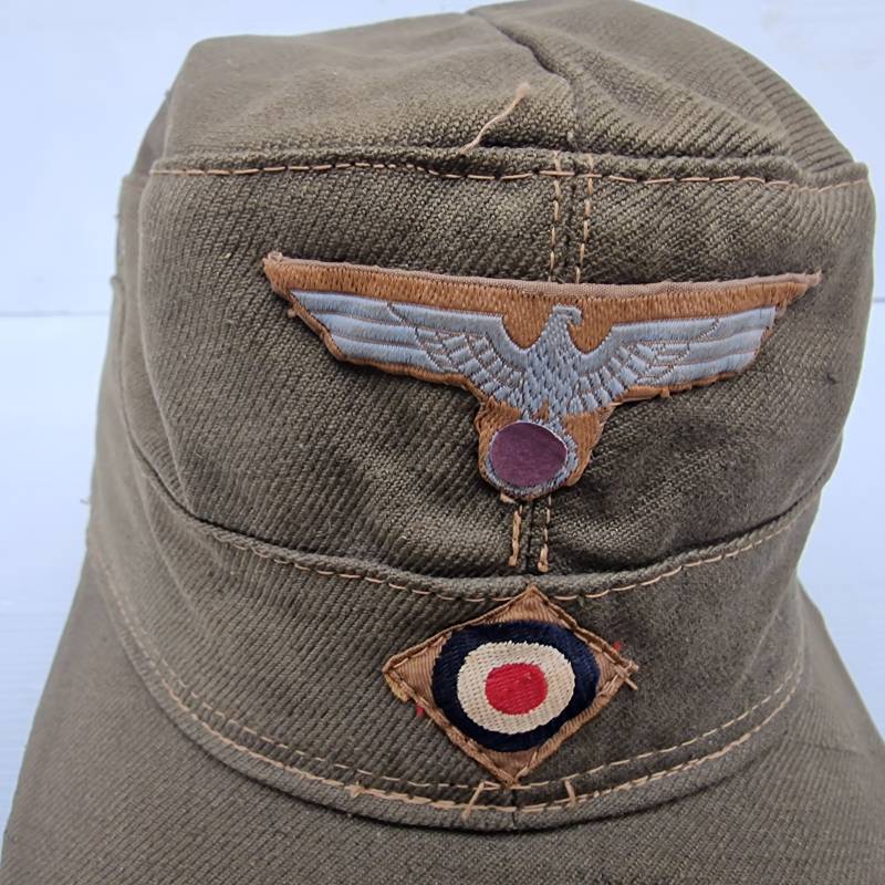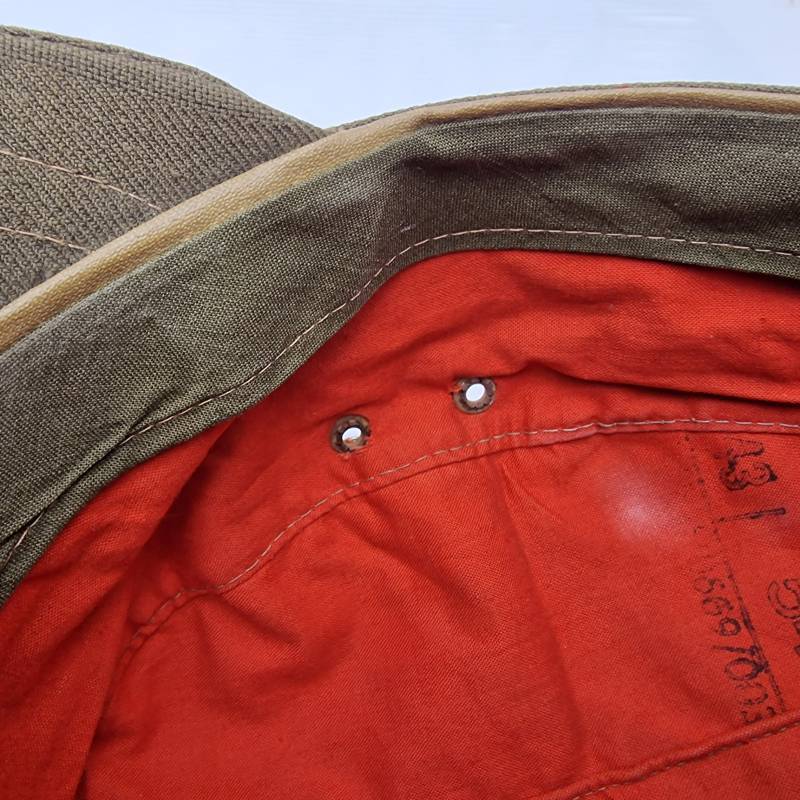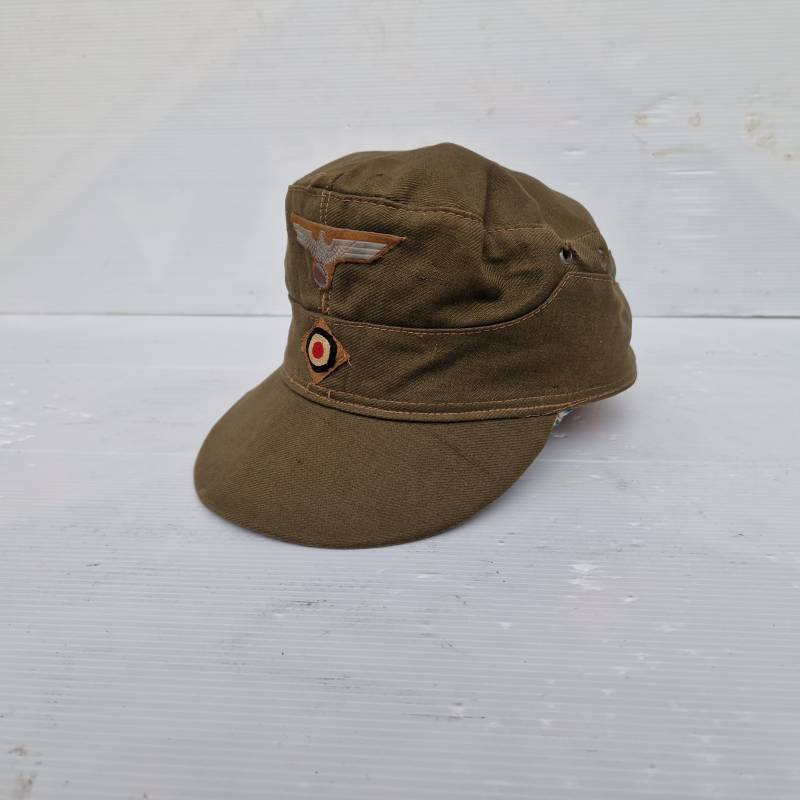 Rare casquette Tropicale modèle 1940 de la Heer. Casquette en toile vert olive dans un état de conservation exceptionnel . . Insignes aigle et cocarde tissés bévo montés d'origine . Quatre oeillets de ventilation en zinc . Visière recouverte en toile. Instèrieur doublé en toile de coton rouge. Marquage fabricant Code Rbnr 1943 taille 55. Bandeau de coiffe intèrieur en toile de coton vert et toile enduite jaune . Pourtour de coiffe en toile cirée. Casquette dans un état quasi neuf , 100% dans son jus. Casquette sans aucun défaut et définitive en collection . Rare coiffe de l'Afrika Korps 1941/43. Ref 19323