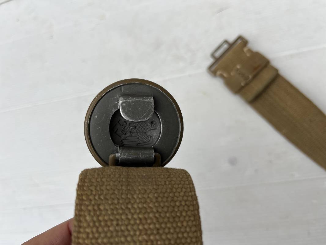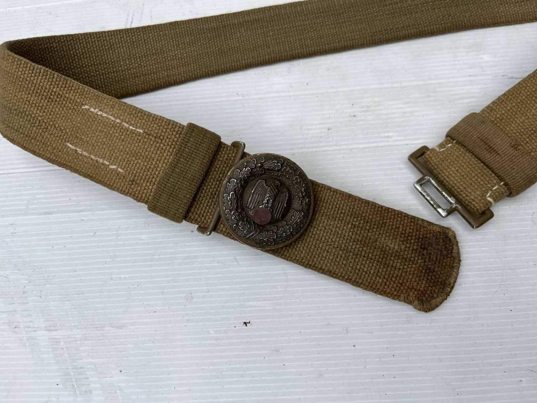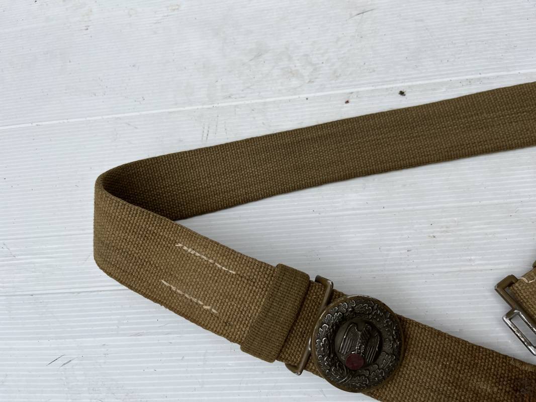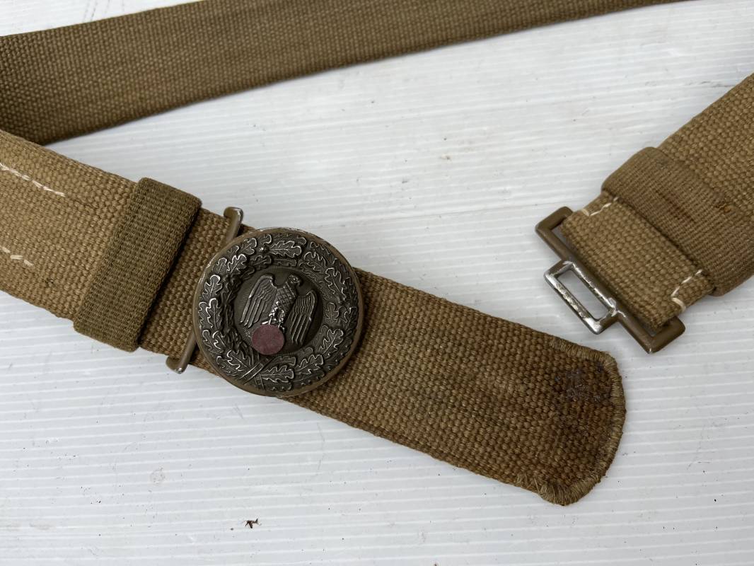 Rare ceinturon tropical d'un officier de la Heer . Boucle ronde ( Feldbinde ) en alu peint en jaune olive . Ceinturon en toile de coton filé jaune . Deux petits passants verticaux en toile . Passant en alu peint en vert olive . Languette intérieur en cuir noir . Longueur totale 98 cm . Ceinturon légèrement porté en bel état . Trés belle patine générale . Rare ceinturon d'un officier de la Heer de l'Afrika Korps 1941/43 Ref 19915