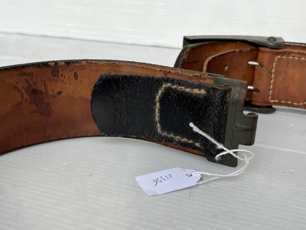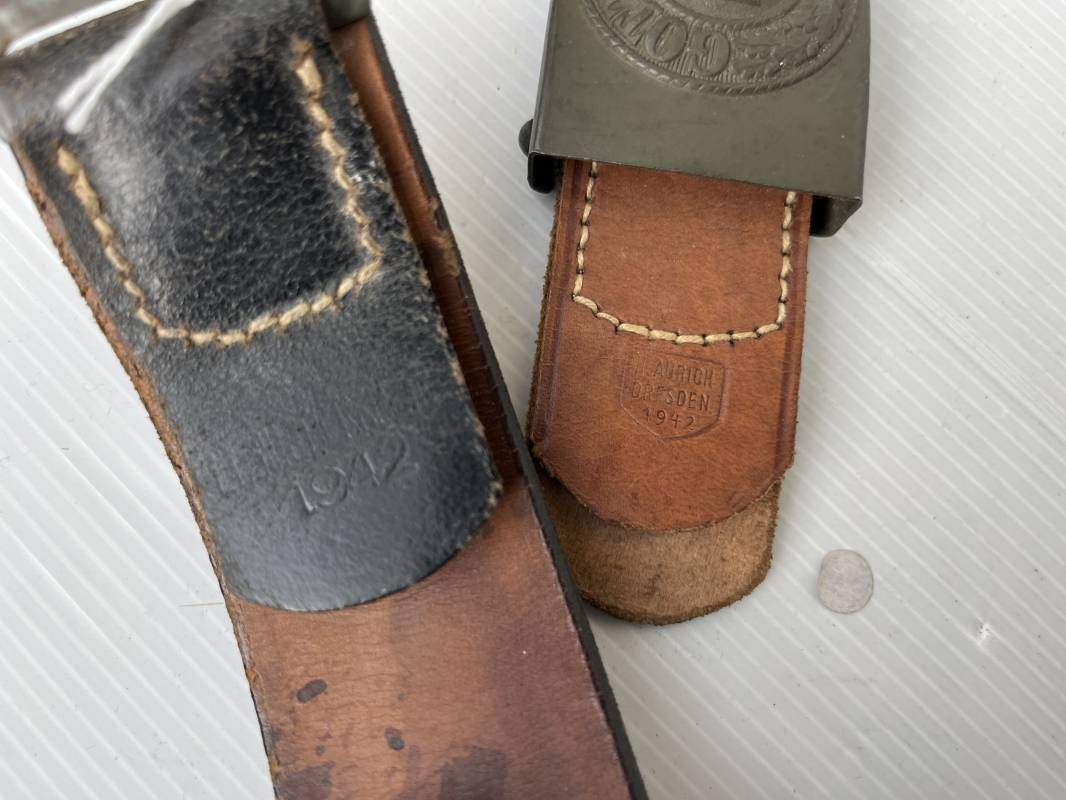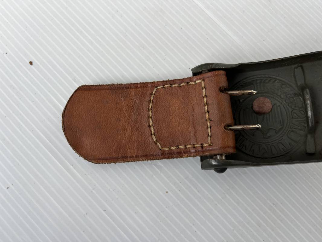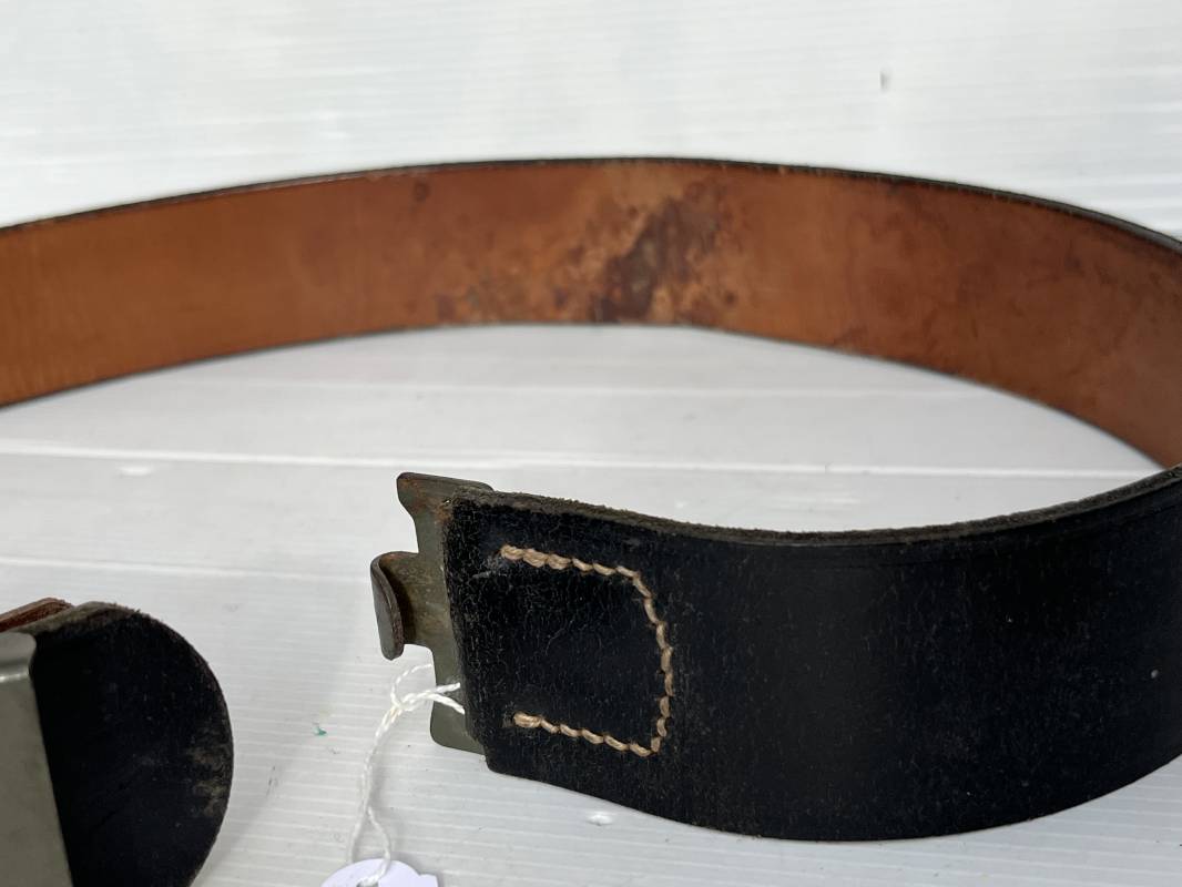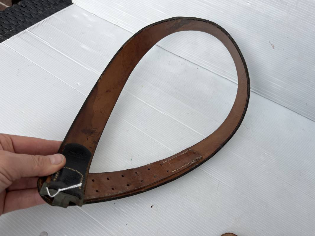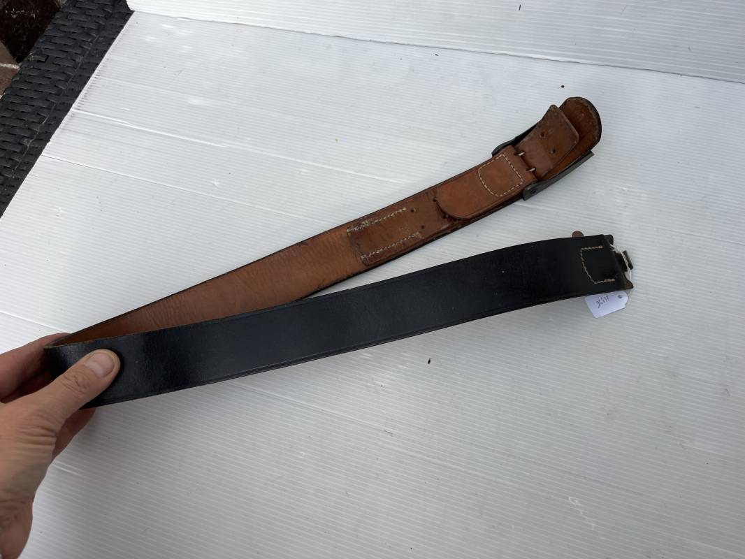 Très beau ceinturon Troupe de la Heer modéle 1940 . Boucle fer modèle 1940 , peinture feldgrau d'origine. Passant et crochet fer . Patelette cuir fauve avec marquage fabricant H Aurich Desden daté 1942 . Ceinturon troupe en cuir noir retourné. Marquage fabricant sur la languette daté 1942 . Crochet fer peint en vert . Languette intèrieure en cuir .Cuir souple,. longueur 90 cm. Trés bel ensemble trés peu porté et en superbe état . Ceinturon et boucles ont été trouvés ensemble en Allemagne . Totalement intouché . Superbe état ' quasi neuf ' . Ref 21396