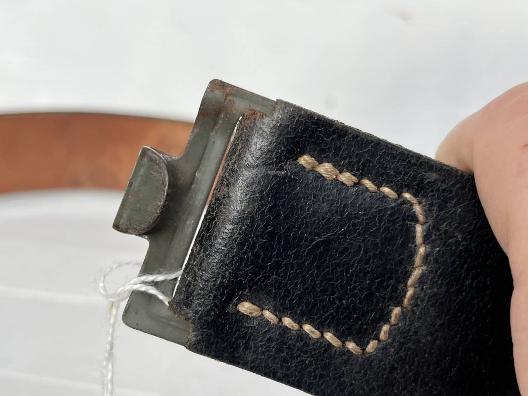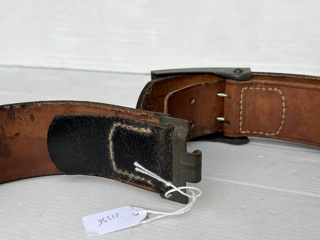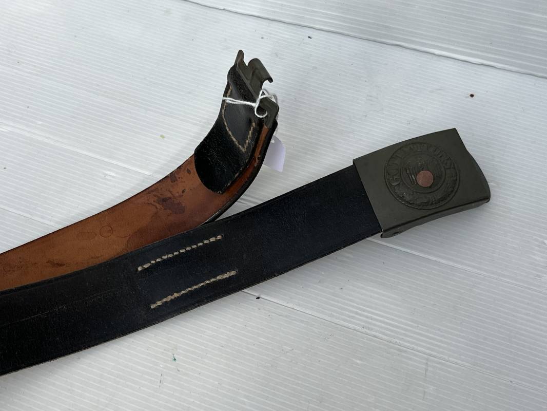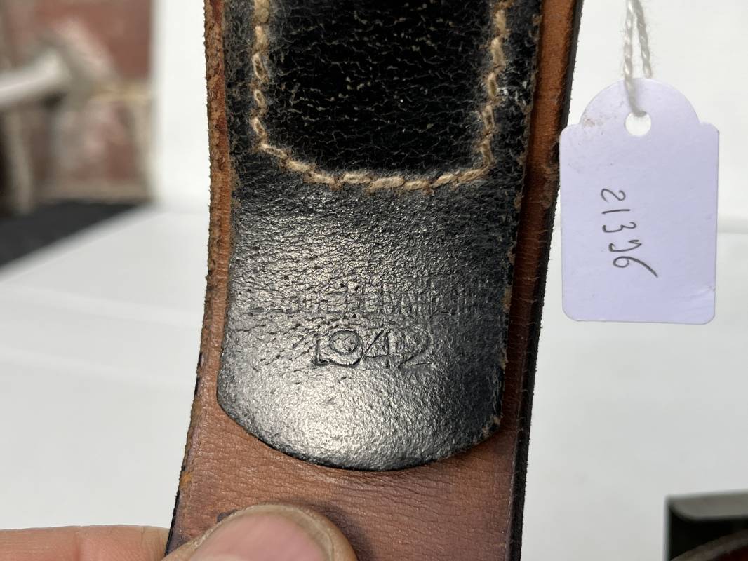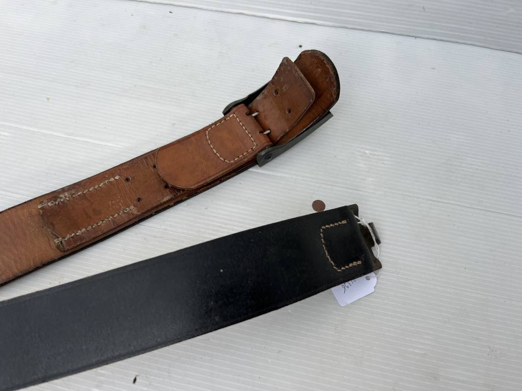 Très beau ceinturon Troupe de la Heer modéle 1940 . Boucle fer modèle 1940 , peinture feldgrau d'origine. Passant et crochet fer . Patelette cuir fauve avec marquage fabricant H Aurich Desden daté 1942 . Ceinturon troupe en cuir noir retourné. Marquage fabricant sur la languette daté 1942 . Crochet fer peint en vert . Languette intèrieure en cuir .Cuir souple,. longueur 90 cm. Trés bel ensemble trés peu porté et en superbe état . Ceinturon et boucles ont été trouvés ensemble en Allemagne . Totalement intouché . Superbe état ' quasi neuf ' . Ref 21396