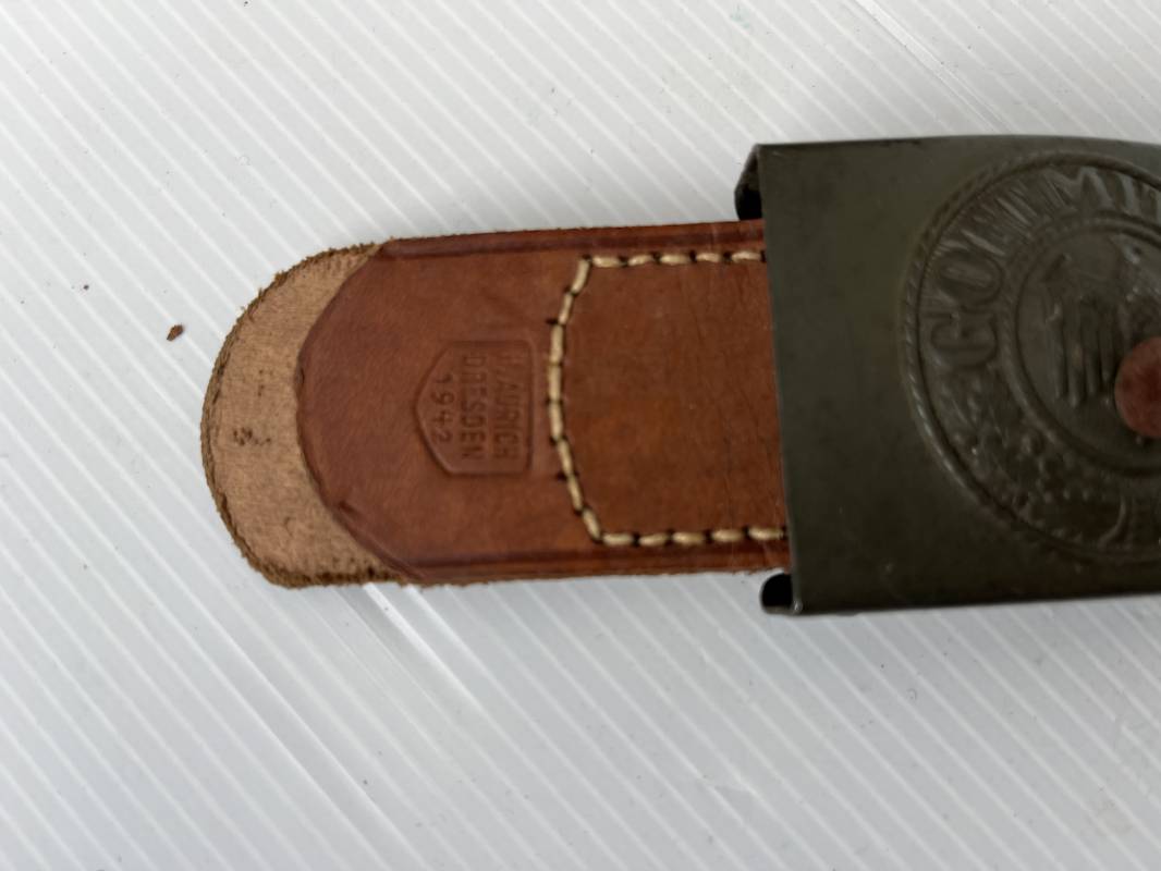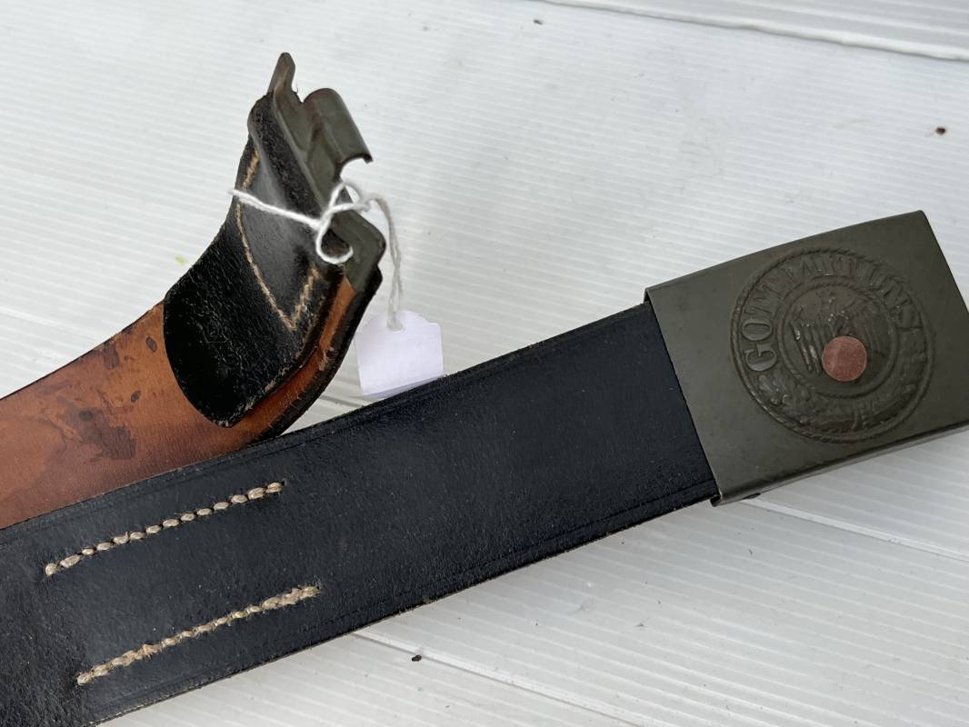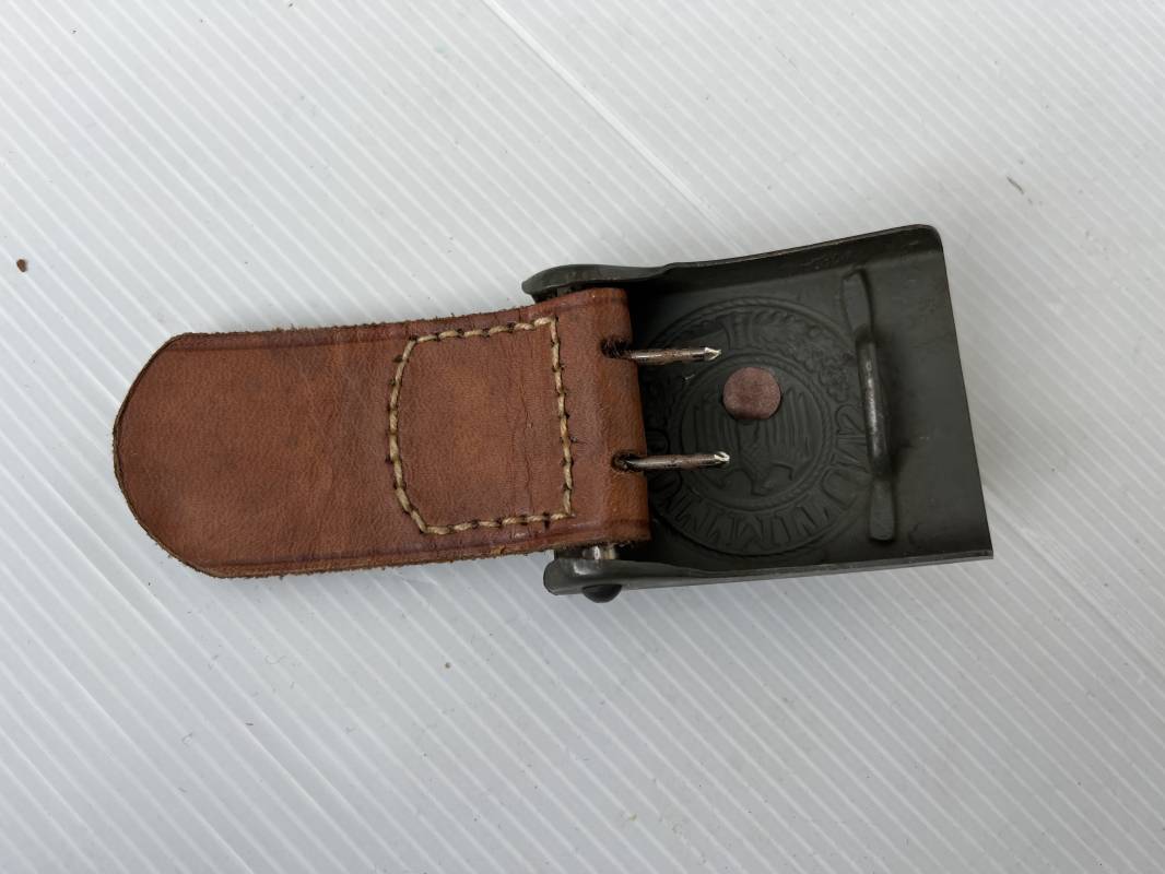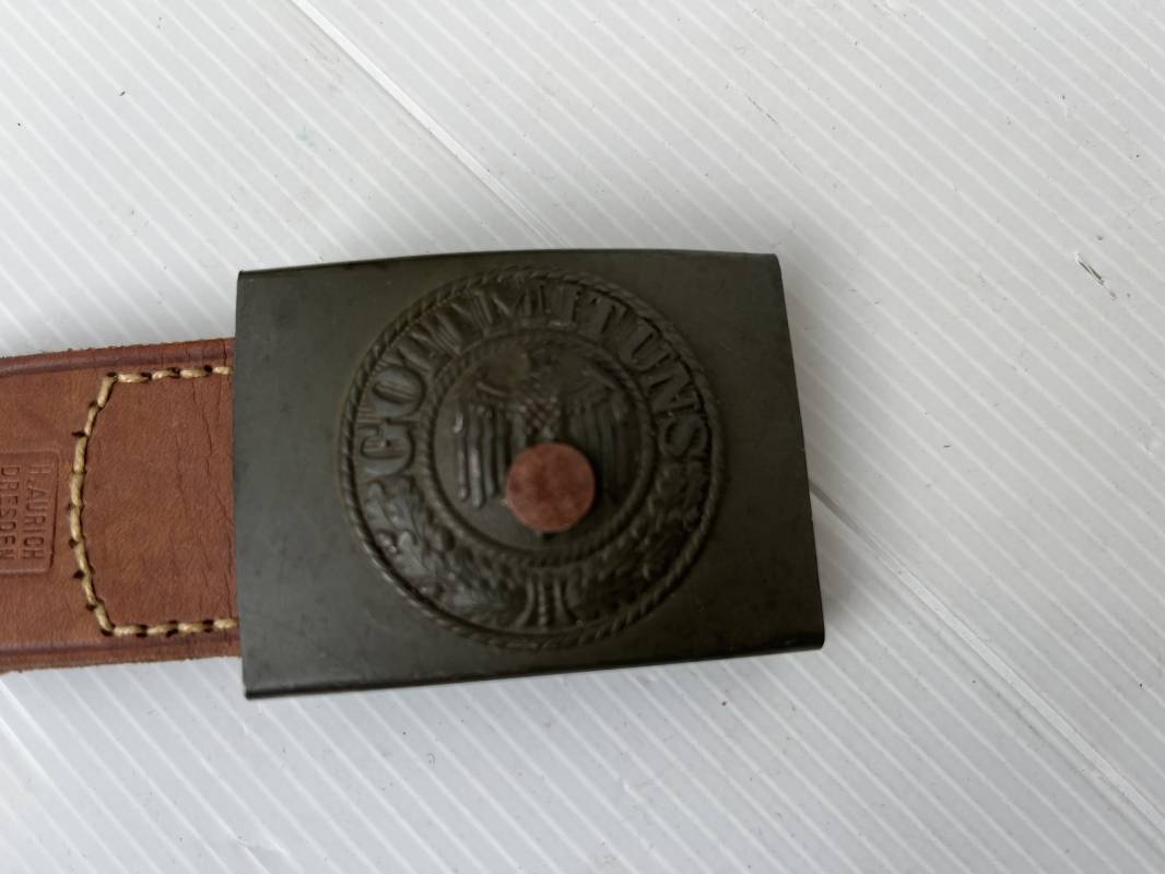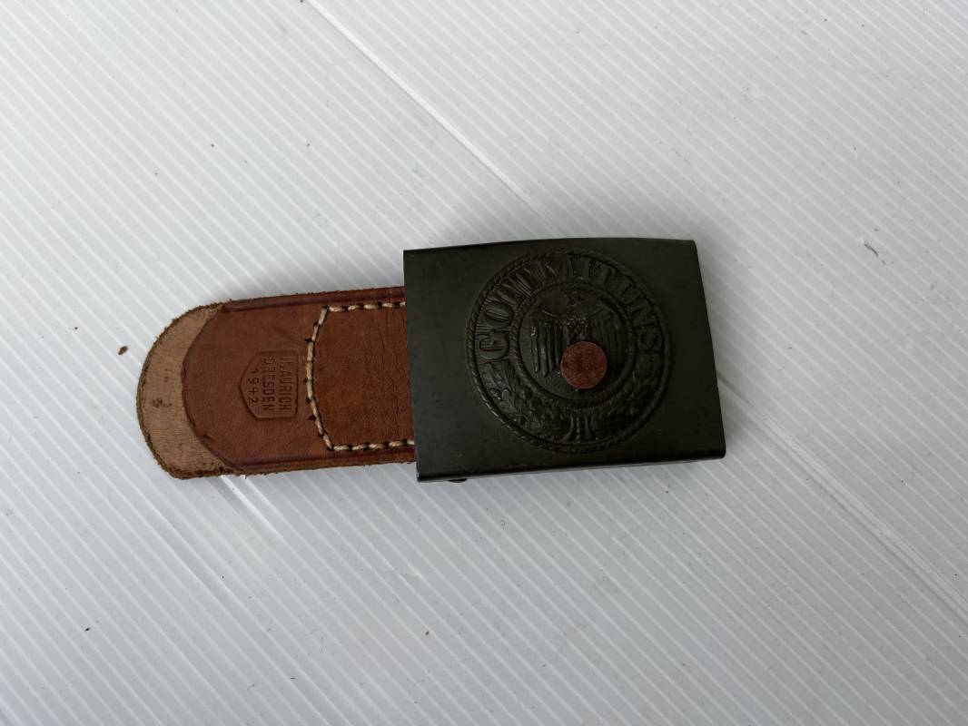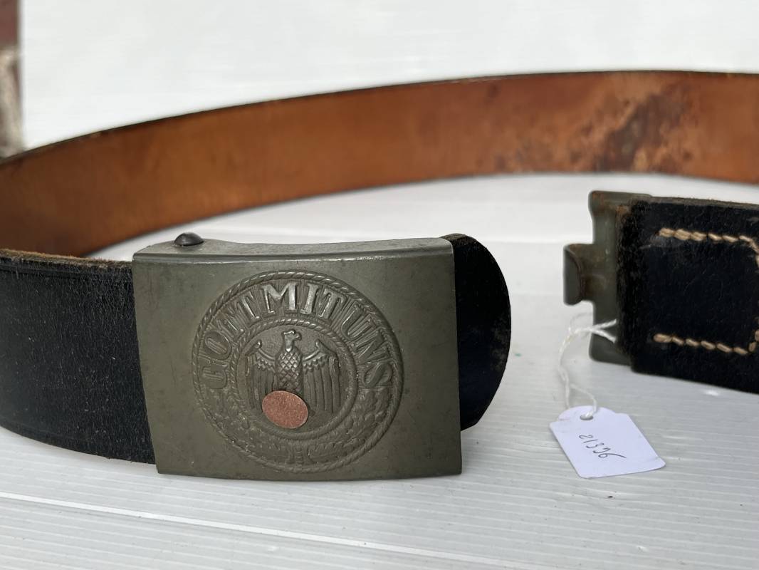 Très beau ceinturon Troupe de la Heer modéle 1940 . Boucle fer modèle 1940 , peinture feldgrau d'origine. Passant et crochet fer . Patelette cuir fauve avec marquage fabricant H Aurich Desden daté 1942 . Ceinturon troupe en cuir noir retourné. Marquage fabricant sur la languette daté 1942 . Crochet fer peint en vert . Languette intèrieure en cuir .Cuir souple,. longueur 90 cm. Trés bel ensemble trés peu porté et en superbe état . Ceinturon et boucles ont été trouvés ensemble en Allemagne . Totalement intouché . Superbe état ' quasi neuf ' . Ref 21396