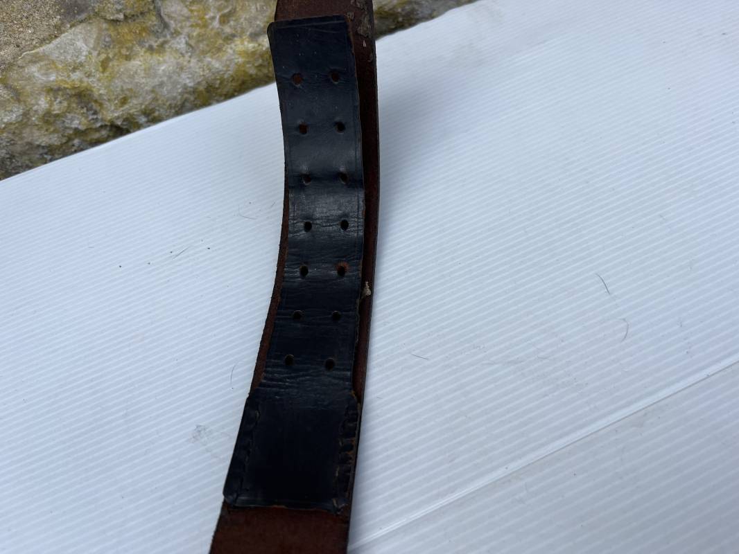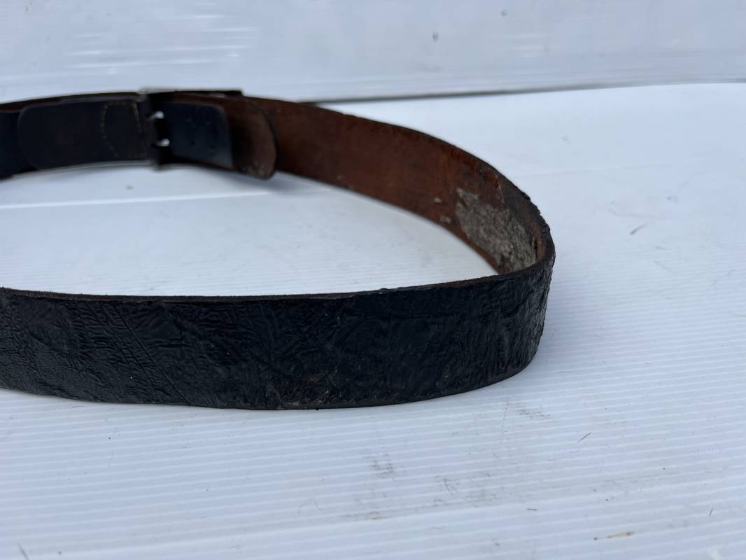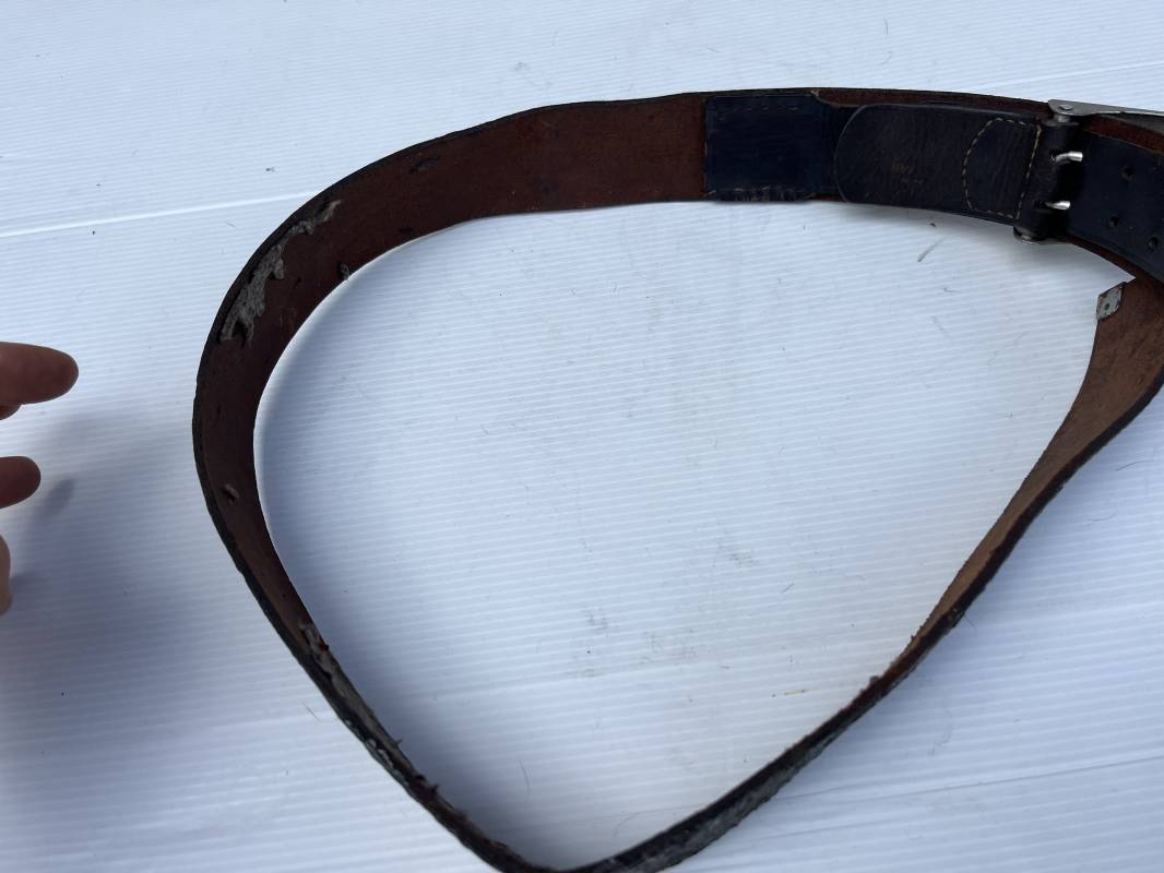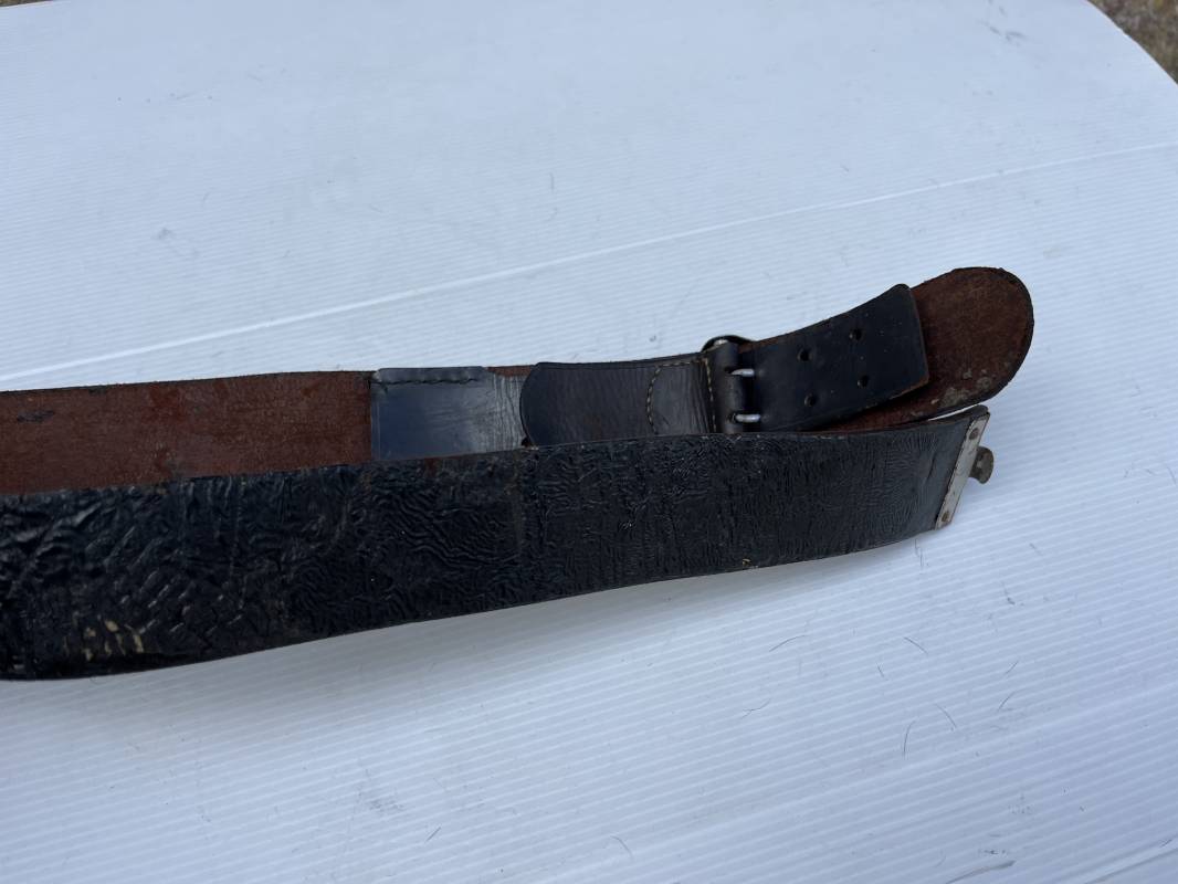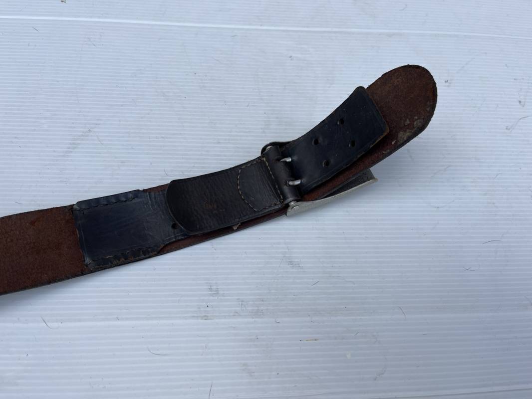 Beau ceinturon troupe de la Heer modéle 1936 , boucle alu du modéle léger pour tenue de sortie ou de defilé .Boucle en alu grenelé , en deux parties , fixation par 4 crochets sur l arrière . Passant de fixation . Patelette en cuir avec marquage oval fabricant illisible . Ceinturon en cuir verni noir du modele de sortie ou defilé . Crochet en fer nickelé . Passant cuir interne de reglage de taille . Longueur 95 cm . Bel ensemble homogéne trouvé en succession familiale a Paris 1935/45 Ref 19931