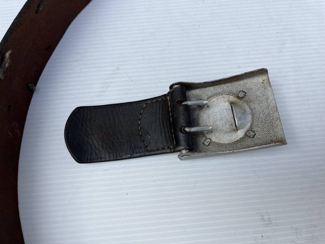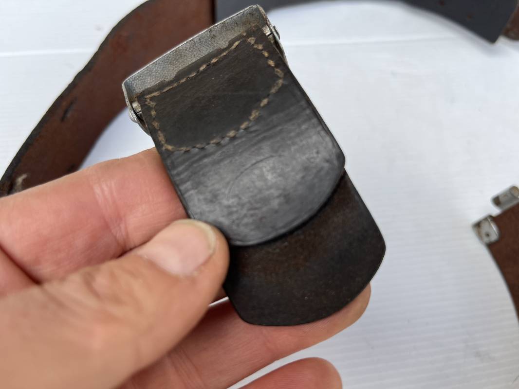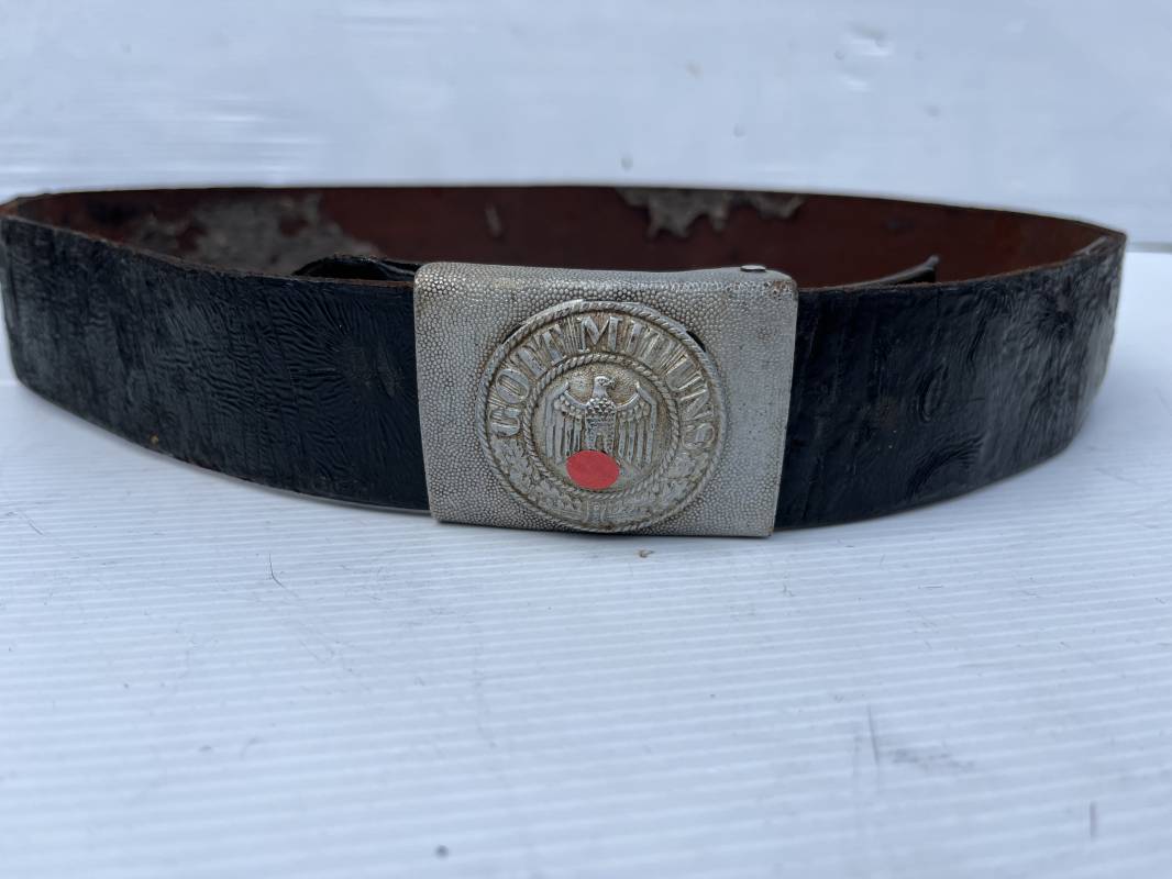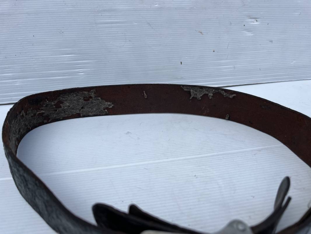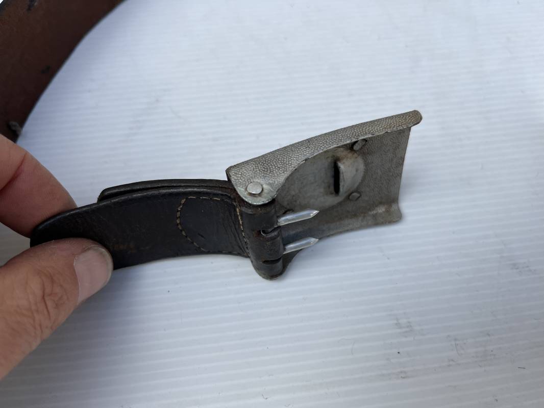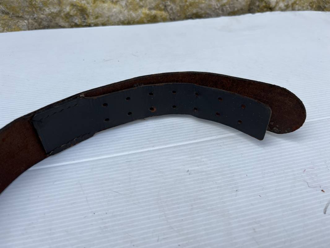 Beau ceinturon troupe de la Heer modéle 1936 , boucle alu du modéle léger pour tenue de sortie ou de defilé .Boucle en alu grenelé , en deux parties , fixation par 4 crochets sur l arrière . Passant de fixation . Patelette en cuir avec marquage oval fabricant illisible . Ceinturon en cuir verni noir du modele de sortie ou defilé . Crochet en fer nickelé . Passant cuir interne de reglage de taille . Longueur 95 cm . Bel ensemble homogéne trouvé en succession familiale a Paris 1935/45 Ref 19931