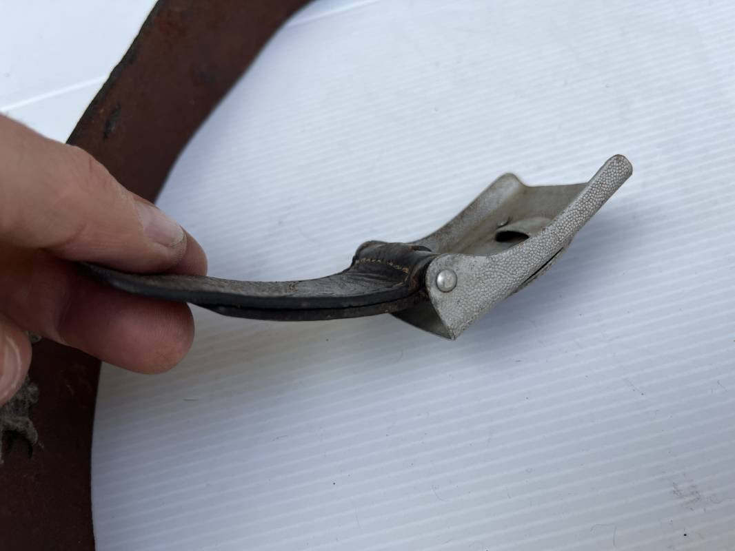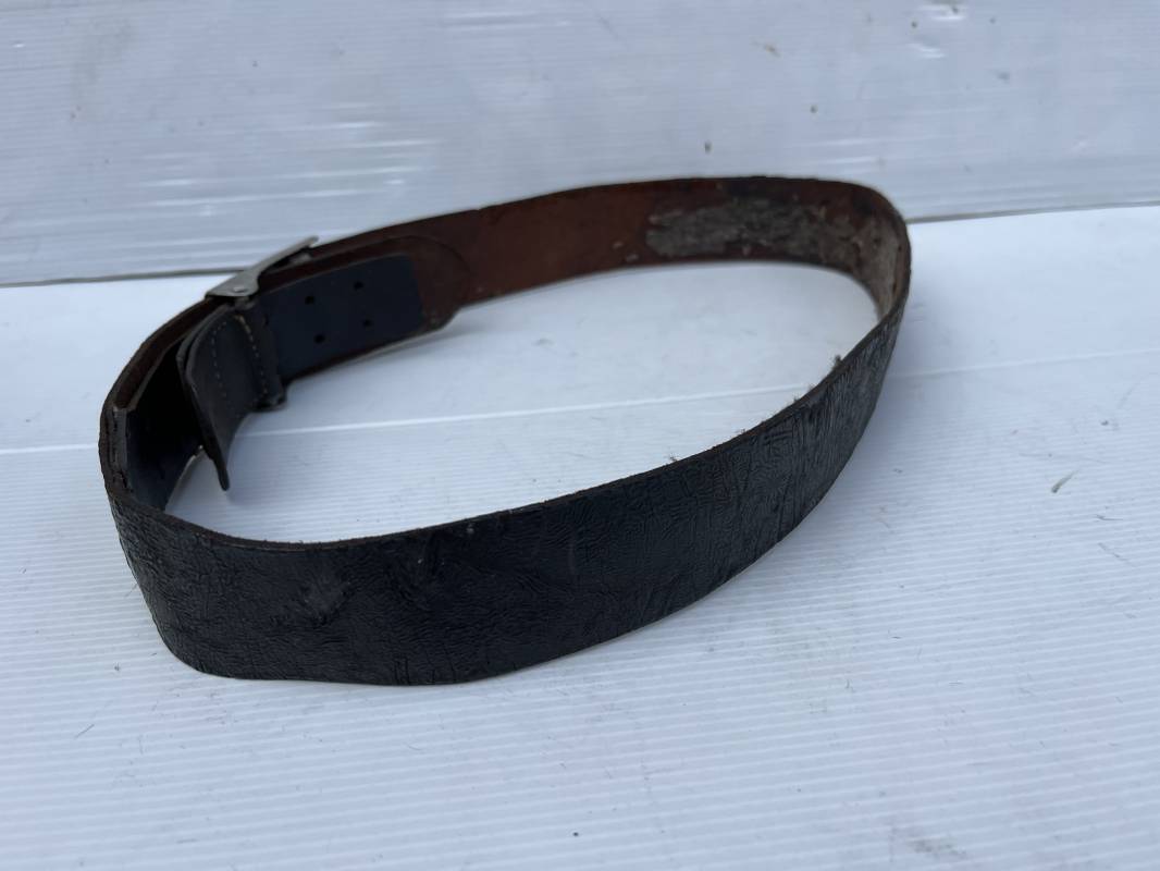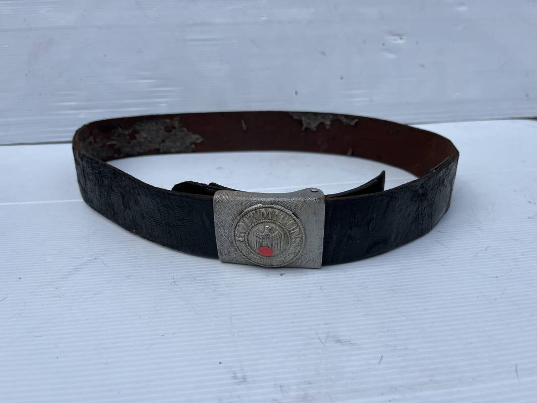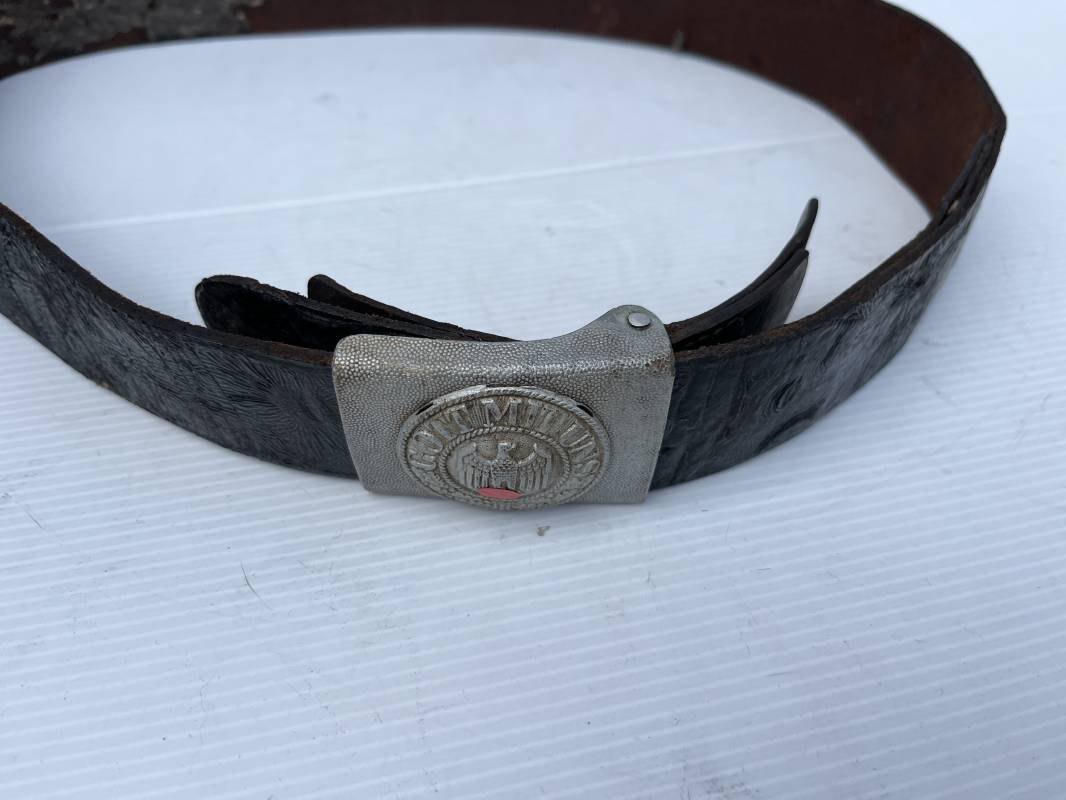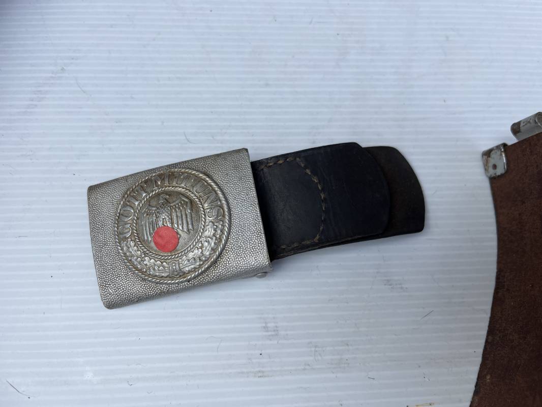 Beau ceinturon troupe de la Heer modéle 1936 , boucle alu du modéle léger pour tenue de sortie ou de defilé .Boucle en alu grenelé , en deux parties , fixation par 4 crochets sur l arrière . Passant de fixation . Patelette en cuir avec marquage oval fabricant illisible . Ceinturon en cuir verni noir du modele de sortie ou defilé . Crochet en fer nickelé . Passant cuir interne de reglage de taille . Longueur 95 cm . Bel ensemble homogéne trouvé en succession familiale a Paris 1935/45 Ref 19931