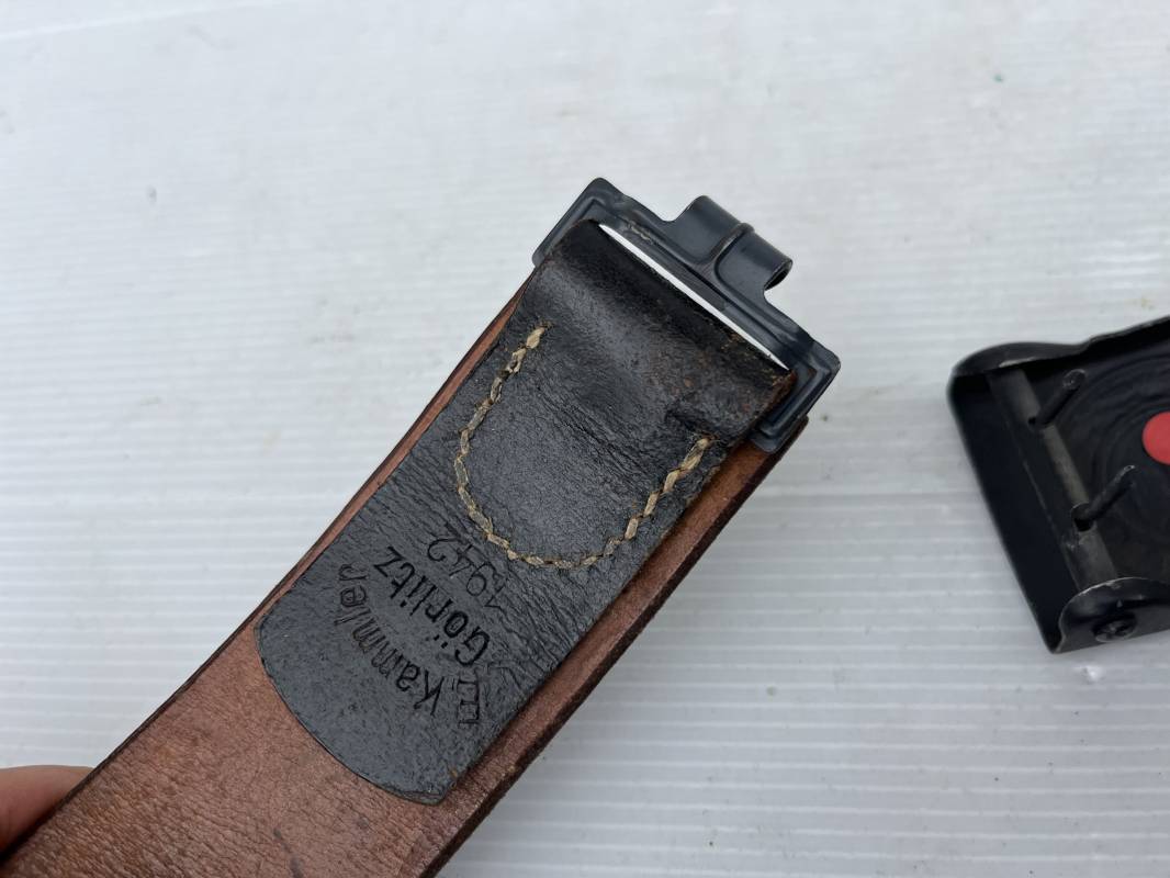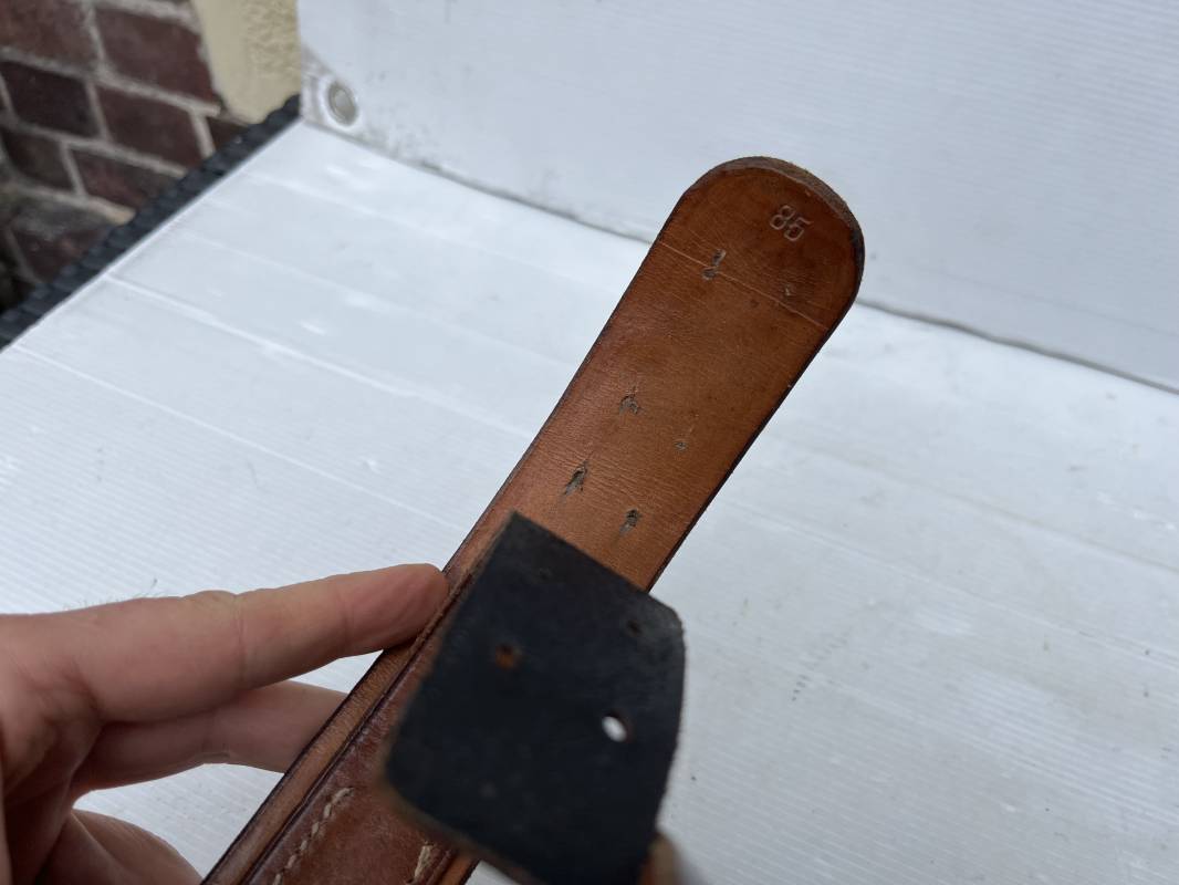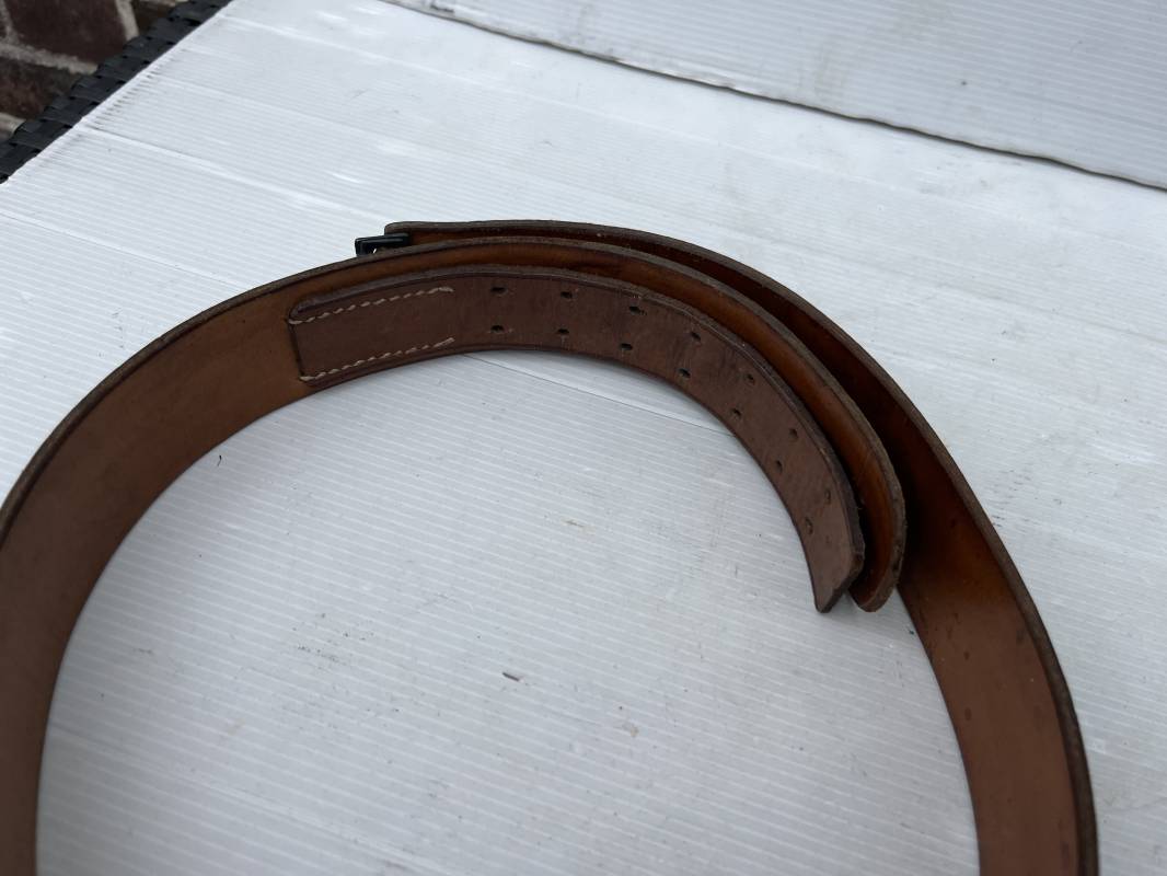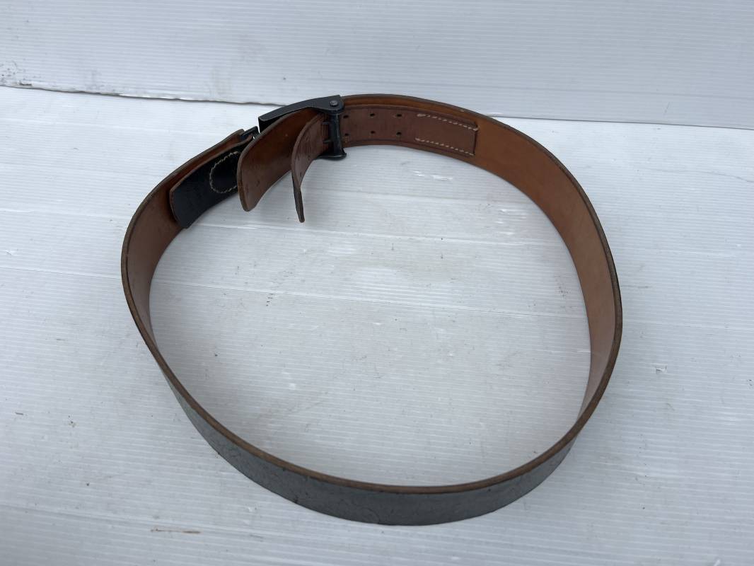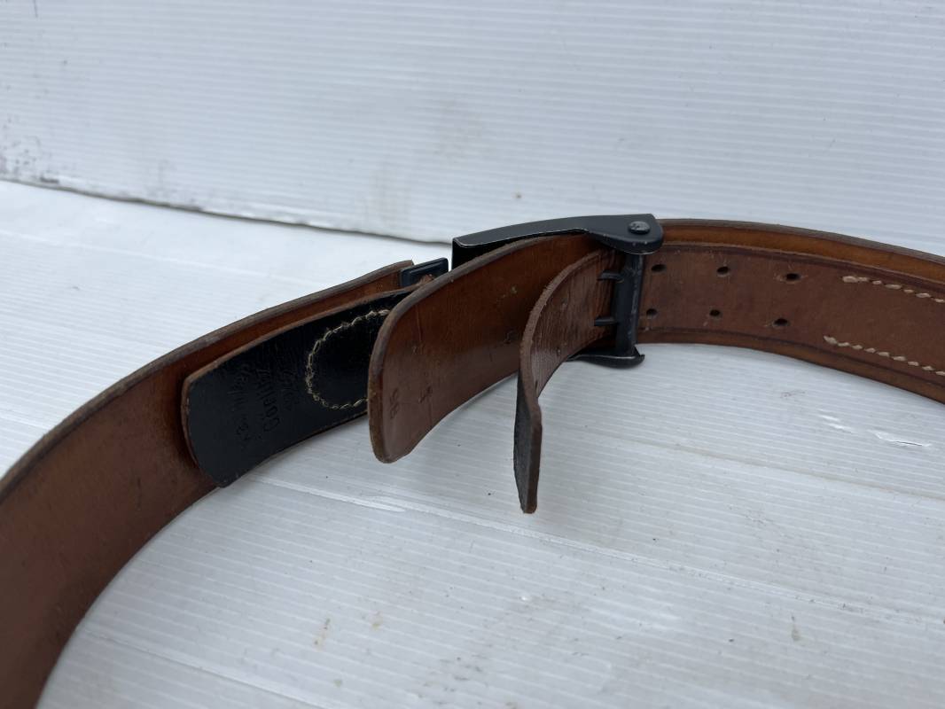 Très beau ceinturon Troupe de la Heer modéle 1943 . Boucle fer modèle 1943 , peinture grise d'origine et sans patelette cuir ( type 43) . Passant et crochet fer . Marquage fabricant au dos Berg und Nolte 1943 . Ceinturon troupe en cuir noir retourné. Marquage fabricant sur la languette daté 1942 . Crochet fer peint en gris . Languette intèrieure en cuir .Cuir souple,. longueur 94 cm. Trés bel ensemble trés peu porté et en superbe état . Ceinturon et boucles ont été trouvés ensemble en Normandie dans le secteur de Pont l eveque ( 14) . Totalement intouché . Superbe état ' quasi neuf ' . Ref 21931