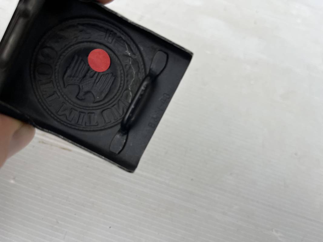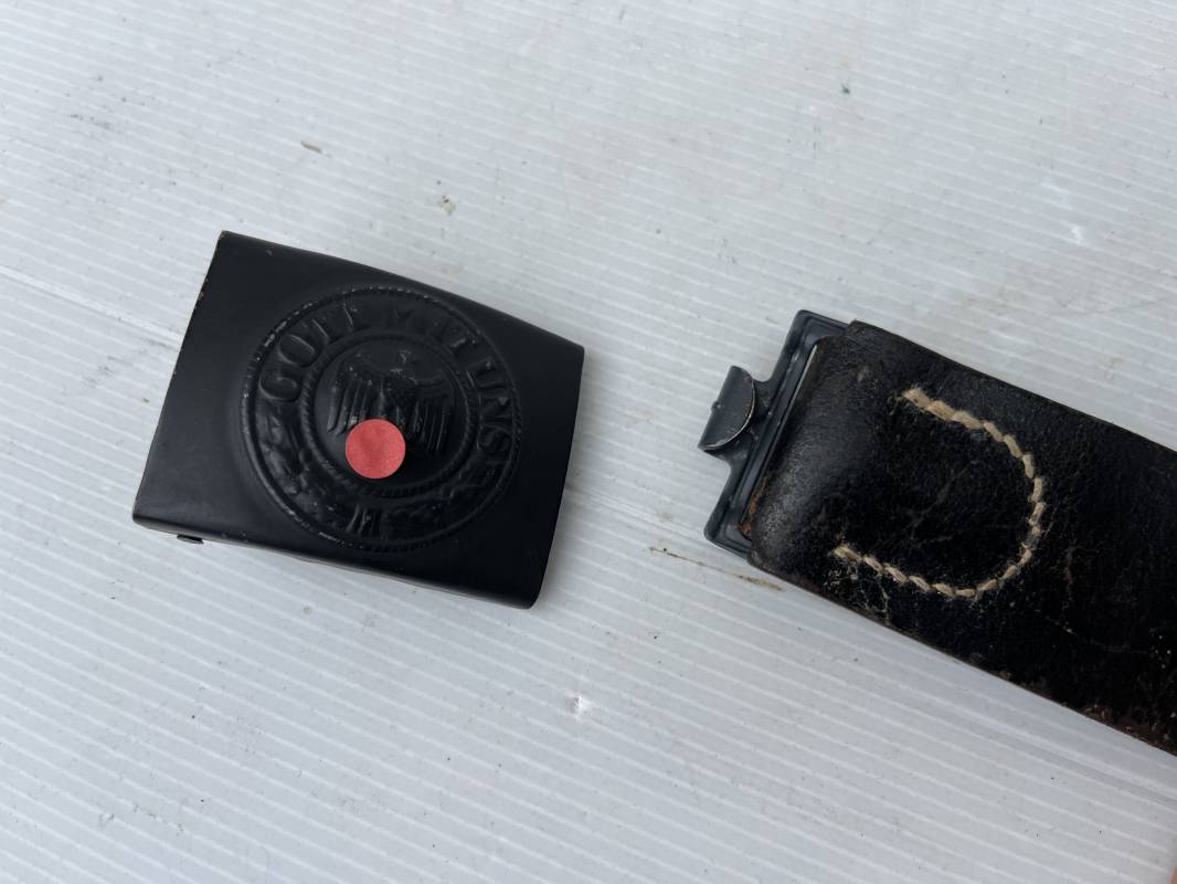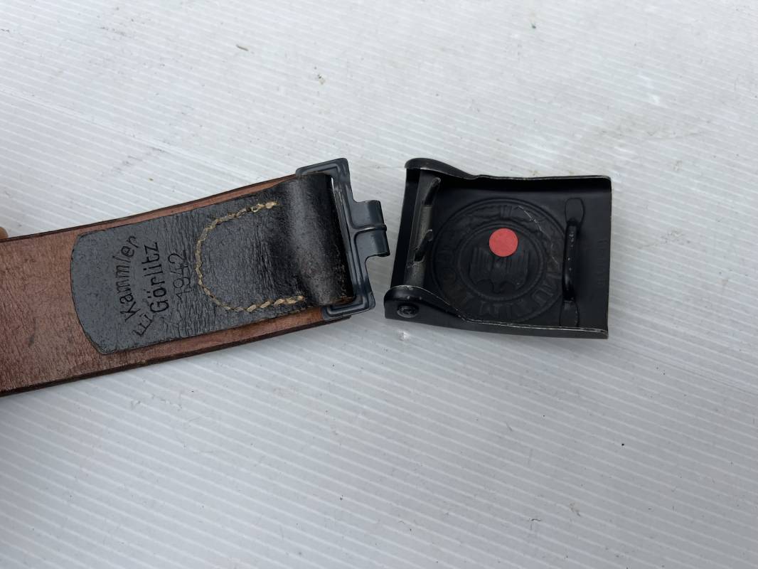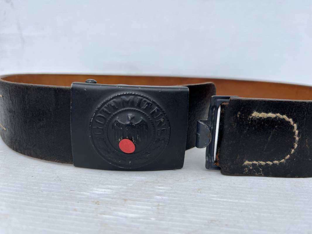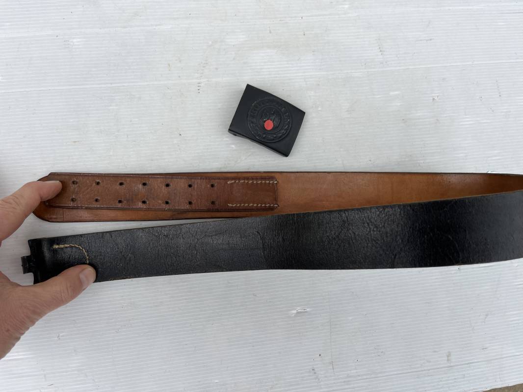 Très beau ceinturon Troupe de la Heer modéle 1943 . Boucle fer modèle 1943 , peinture grise d'origine et sans patelette cuir ( type 43) . Passant et crochet fer . Marquage fabricant au dos Berg und Nolte 1943 . Ceinturon troupe en cuir noir retourné. Marquage fabricant sur la languette daté 1942 . Crochet fer peint en gris . Languette intèrieure en cuir .Cuir souple,. longueur 94 cm. Trés bel ensemble trés peu porté et en superbe état . Ceinturon et boucles ont été trouvés ensemble en Normandie dans le secteur de Pont l eveque ( 14) . Totalement intouché . Superbe état ' quasi neuf ' . Ref 21931