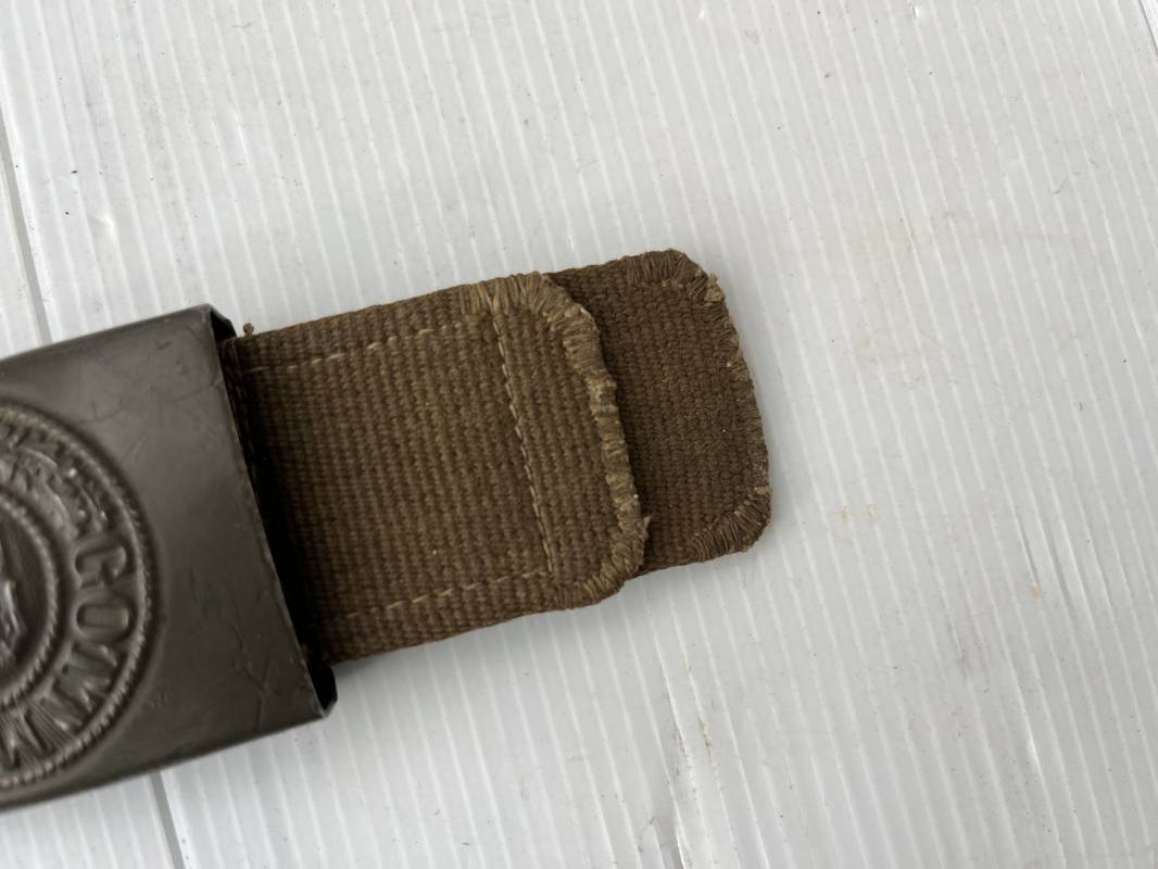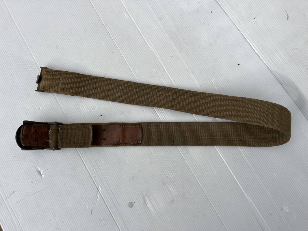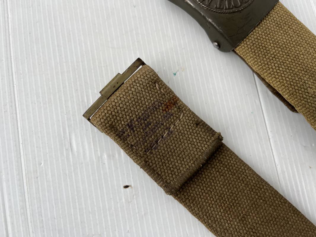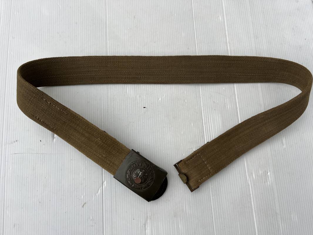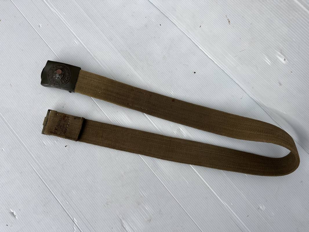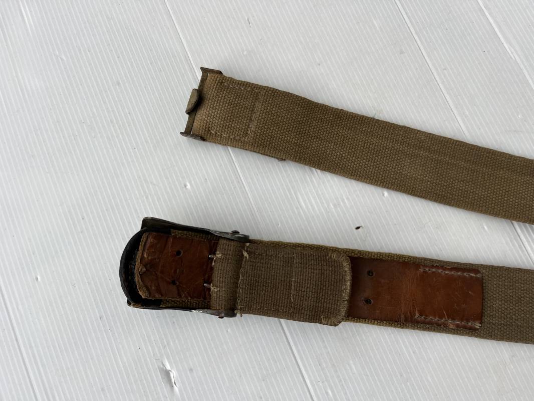 Rare ceinturon troupe de la Heer du modéle tropical . Boucle fer modéle 1940 du modéle tropical avec peinture vert olive d'origine , patelette en toile vert olive du modéle tropical . Passant et crochet metalliques , marquage fabricant sur boucle et daté 1941 . Ceinturon du modéle tropical en toile vert olive . Crochet métallique peint en vert olive . Patelette intérieure en cuir lisse . Longueur 95 cm . Marquage du fabricant à l encre violacée . 100 % nature et totalement intouché . Piéce definitive en collection Rare ceinturon troupe de l Afrika Korps 1941/43 Ref 21929