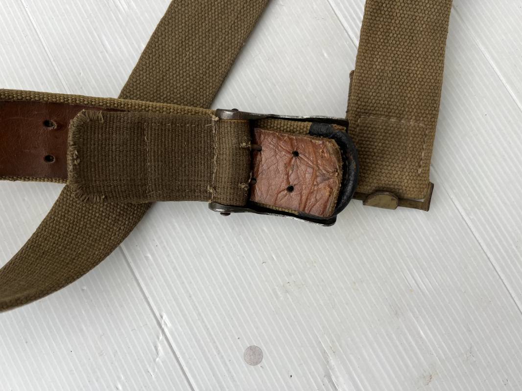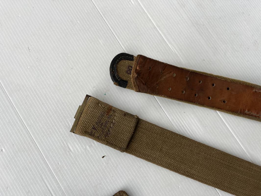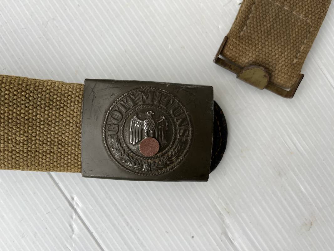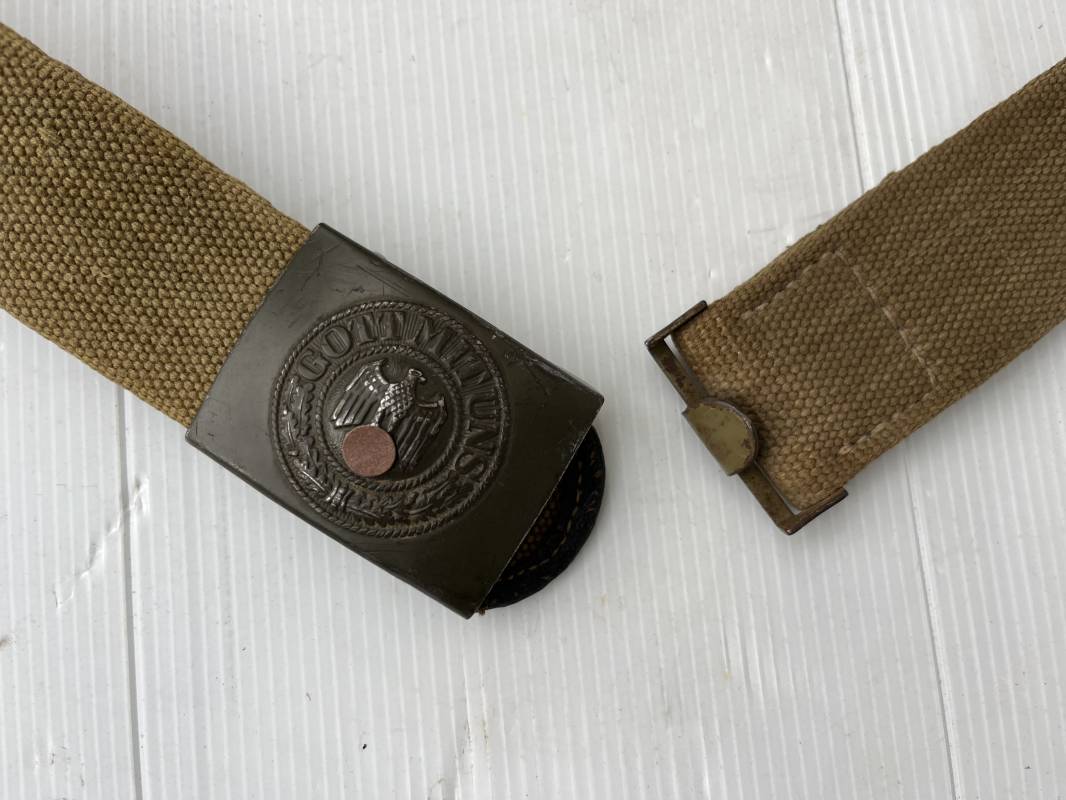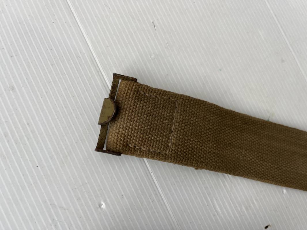 Rare ceinturon troupe de la Heer du modéle tropical . Boucle fer modéle 1940 du modéle tropical avec peinture vert olive d'origine , patelette en toile vert olive du modéle tropical . Passant et crochet metalliques , marquage fabricant sur boucle et daté 1941 . Ceinturon du modéle tropical en toile vert olive . Crochet métallique peint en vert olive . Patelette intérieure en cuir lisse . Longueur 95 cm . Marquage du fabricant à l encre violacée . 100 % nature et totalement intouché . Piéce definitive en collection Rare ceinturon troupe de l Afrika Korps 1941/43 Ref 21929