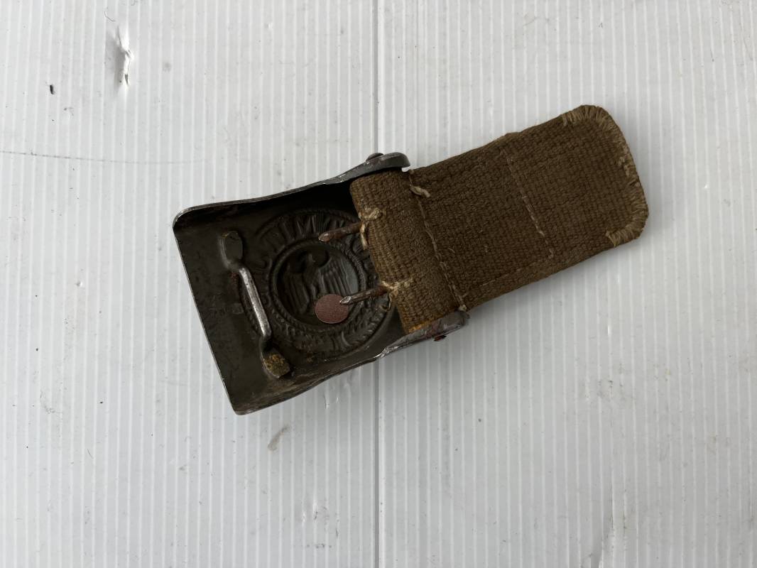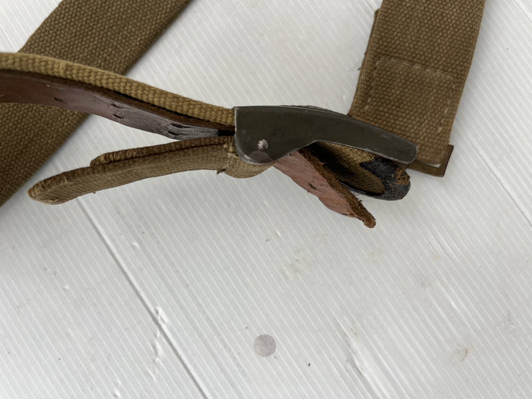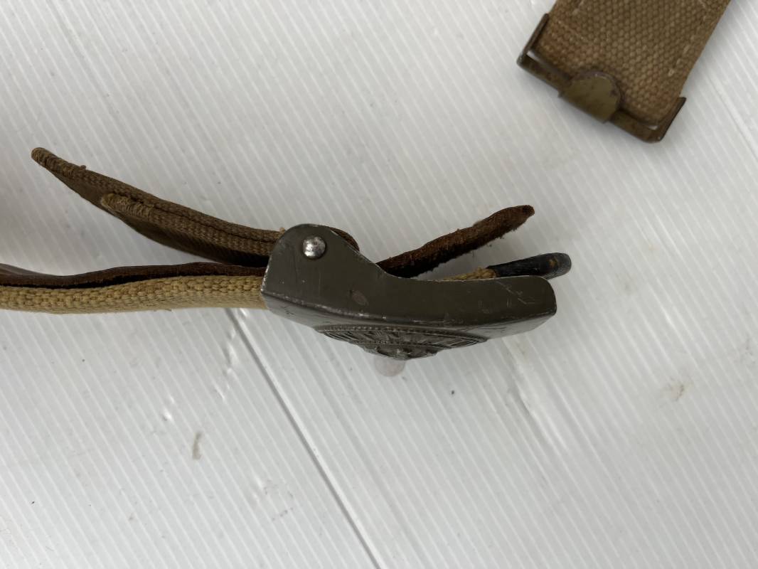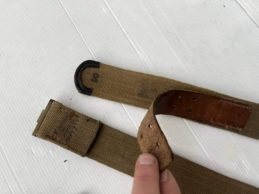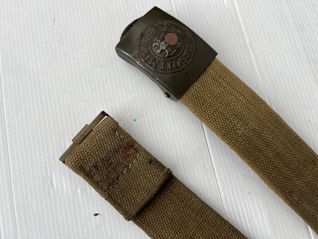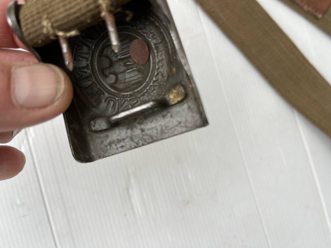 Rare ceinturon troupe de la Heer du modéle tropical . Boucle fer modéle 1940 du modéle tropical avec peinture vert olive d'origine , patelette en toile vert olive du modéle tropical . Passant et crochet metalliques , marquage fabricant sur boucle et daté 1941 . Ceinturon du modéle tropical en toile vert olive . Crochet métallique peint en vert olive . Patelette intérieure en cuir lisse . Longueur 95 cm . Marquage du fabricant à l encre violacée . 100 % nature et totalement intouché . Piéce definitive en collection Rare ceinturon troupe de l Afrika Korps 1941/43 Ref 21929